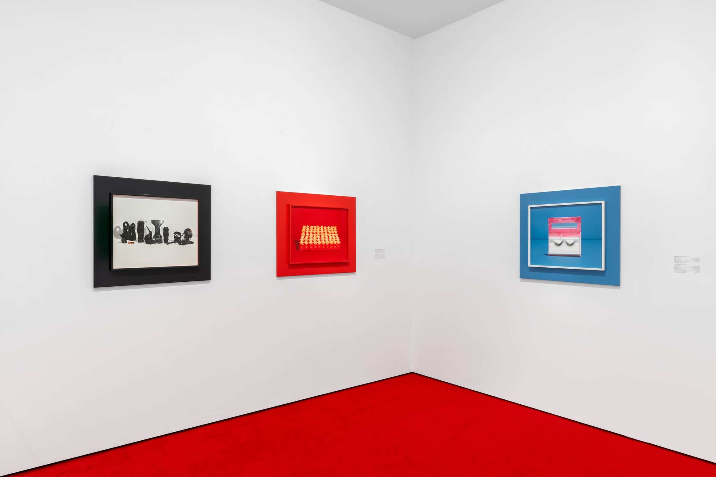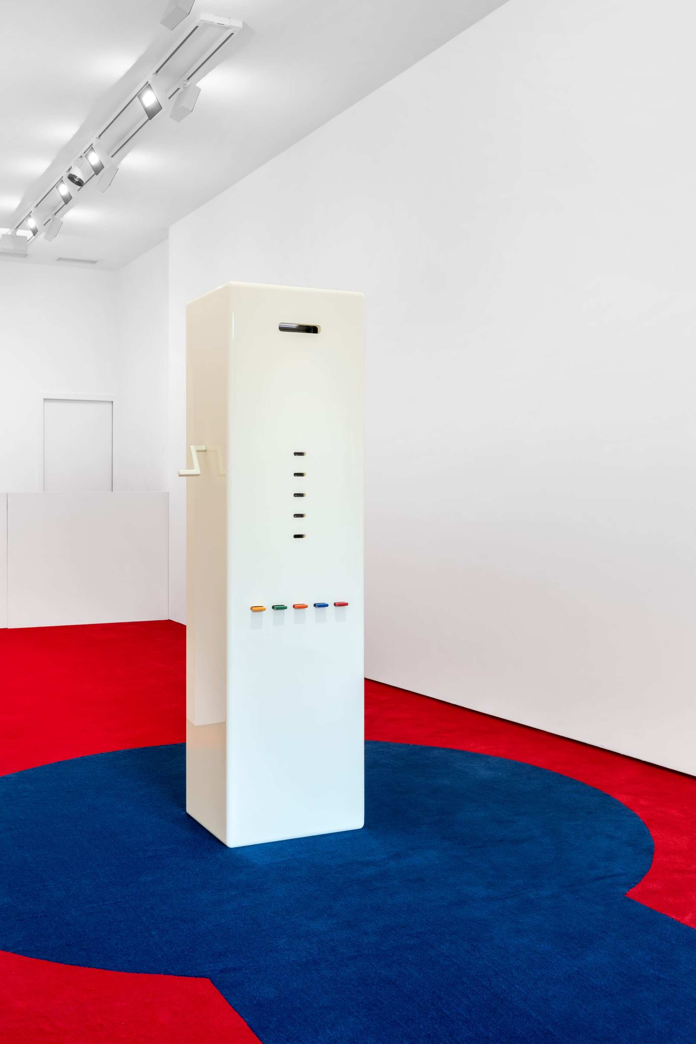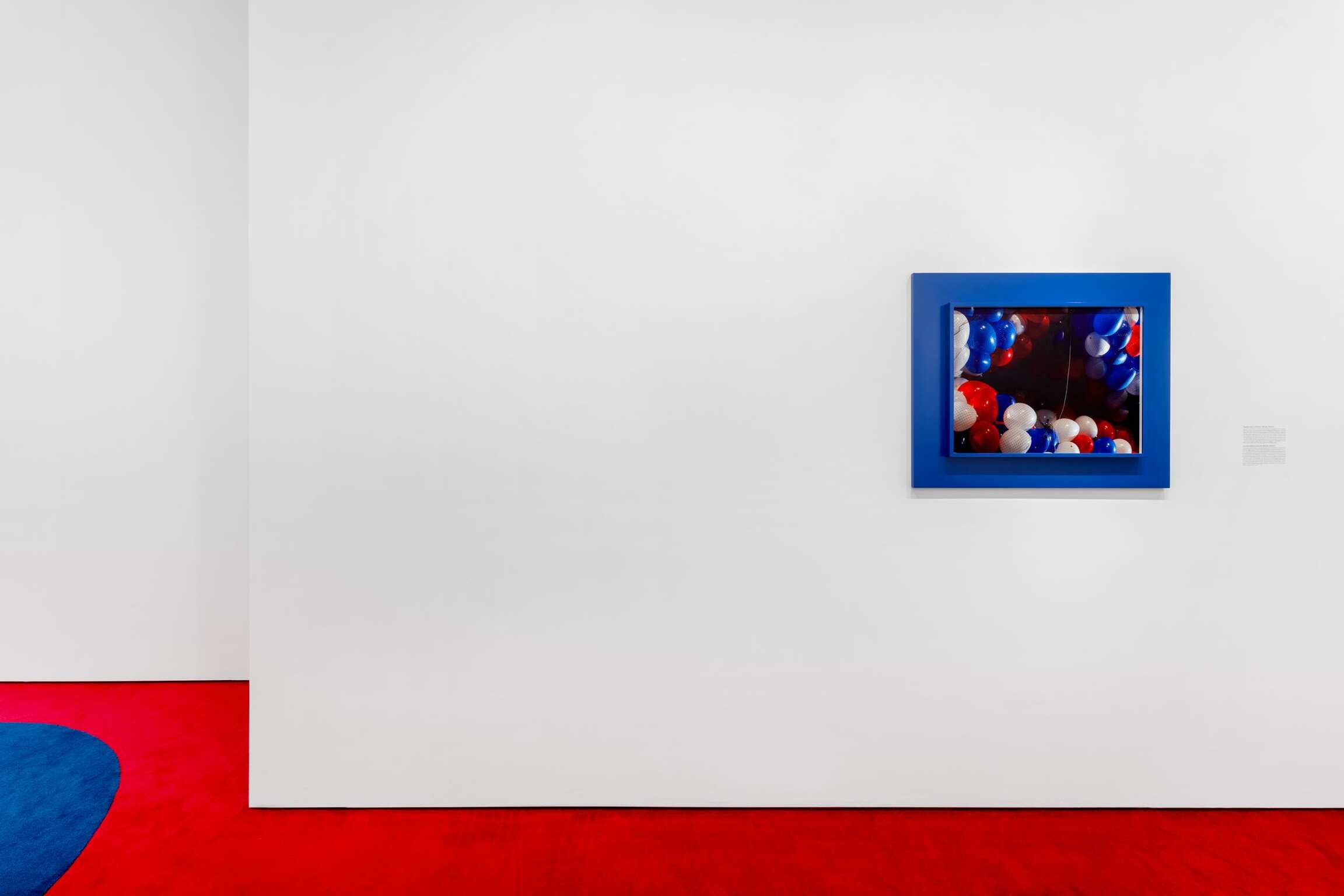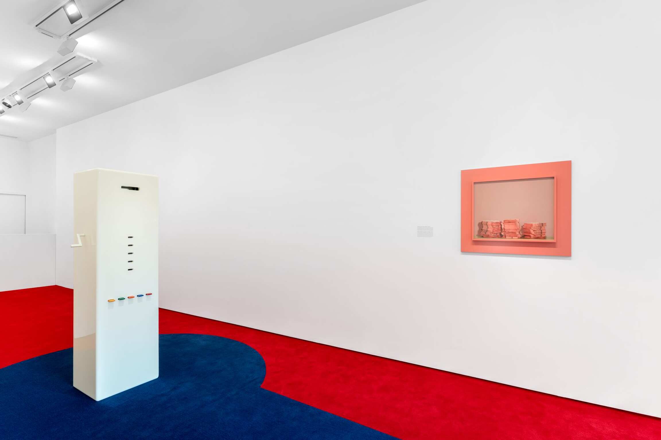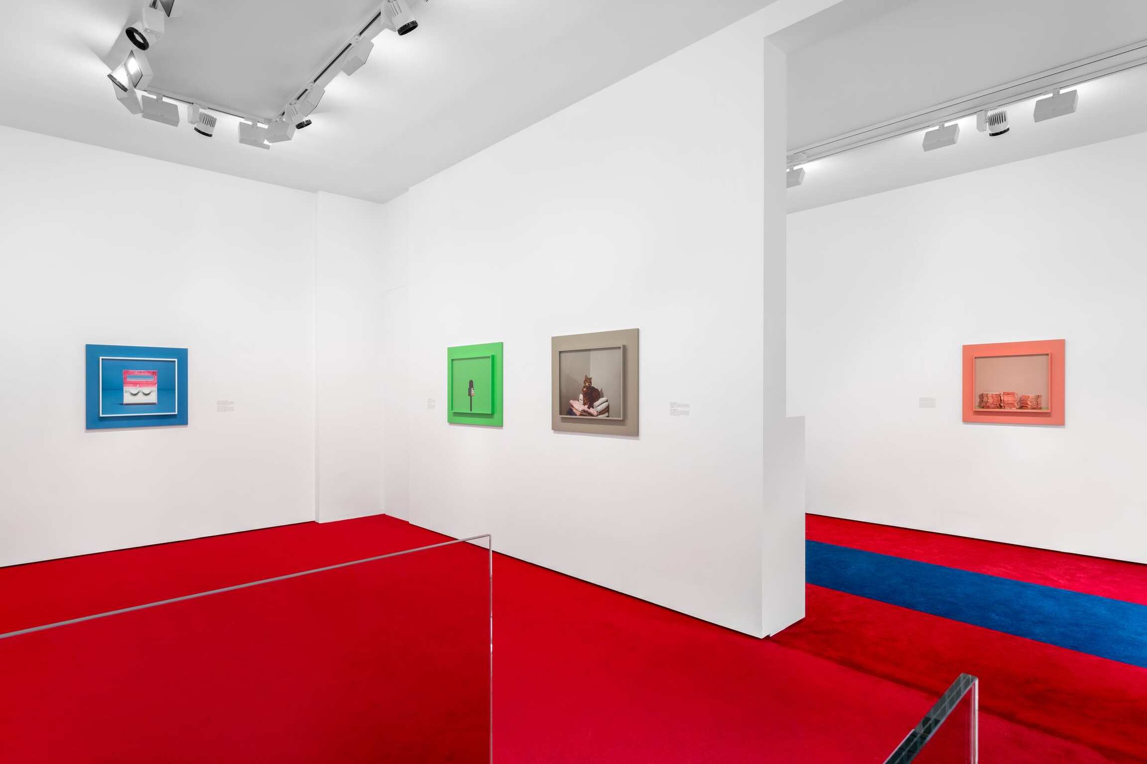 This same sense of play is transposed into the gallery space. The red carpet stretched across the floor evokes, perhaps, the surface of a billiard table. In this visually codified universe, where color seems to dynamically activate perception, the exhibition takes on the scale of a life-size game.