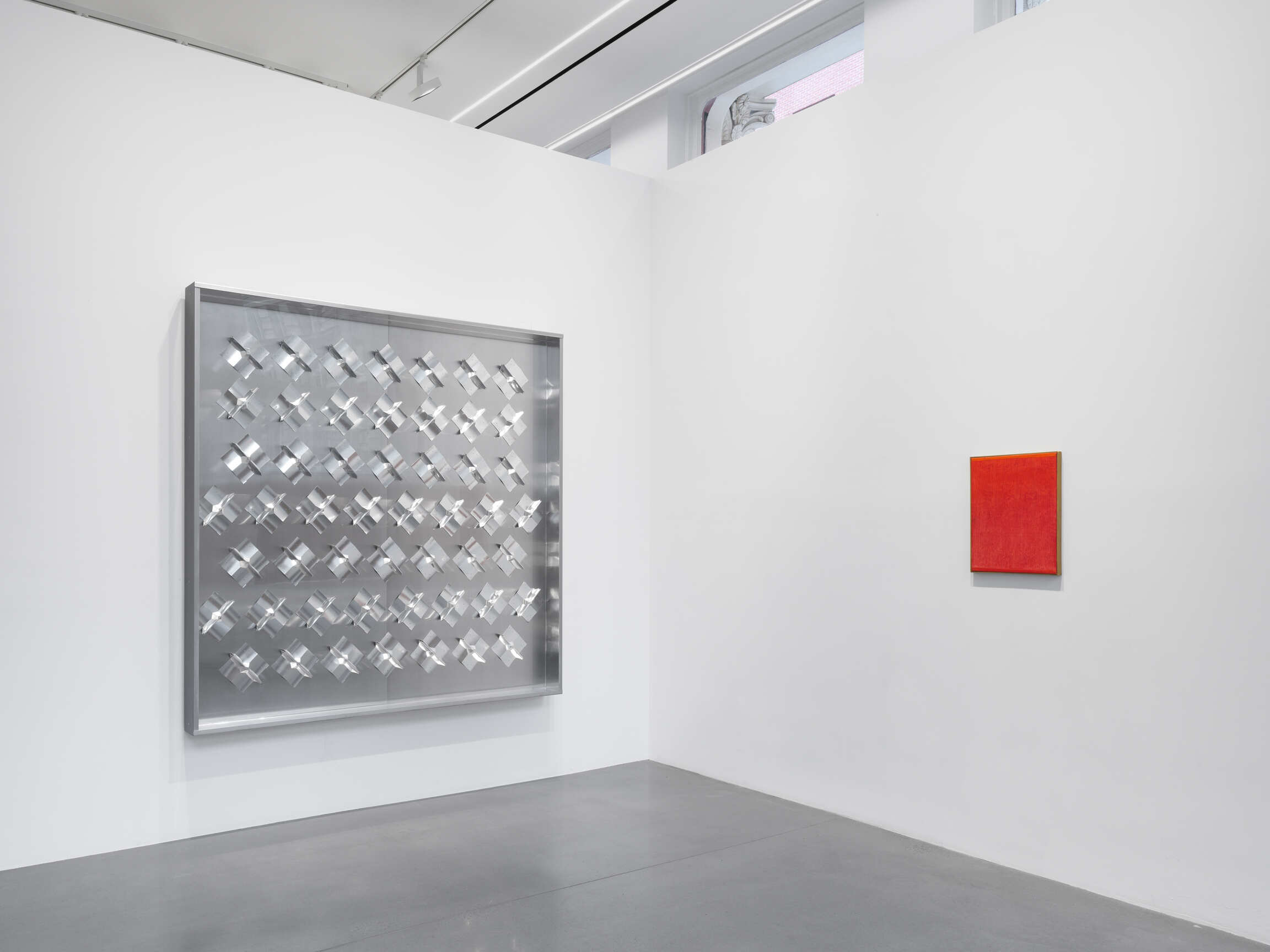Embracing the numinous qualities of light, Mack introduced metallics into his practice, such as the silver resin used to create the choppy surface of Vibration der Schatten (1958). Mack followed his friend Yves Klein, who called himself the painter of blue, by fashioning himself the painter of silver. This inevitably suggested to Mack that he could work with actual metals, as in Vibration (1959), where the artist hand embossed an aluminum panel. These reliefs encourage even further the play of light introduced in the dynamic structures, as it radiates off Mack’s worked metallic surfaces. From there, Mack progressed into fully three-dimensional works, which occupy the space shared with the viewer, as in the free-standing aluminum folding screen Ohne Titel (1972). Mack did not feel limited to only pursuing one idea at a time, or that he had to retire a particular way of working. As such, he would periodically return to certain formats, such as the metal reliefs, a recent example of which is Ohne Titel (2022), which uses an “x” motif to animate an aluminum surface, differing from, but operating similarly to, the textured fan-like composition found in the 1972 screen.