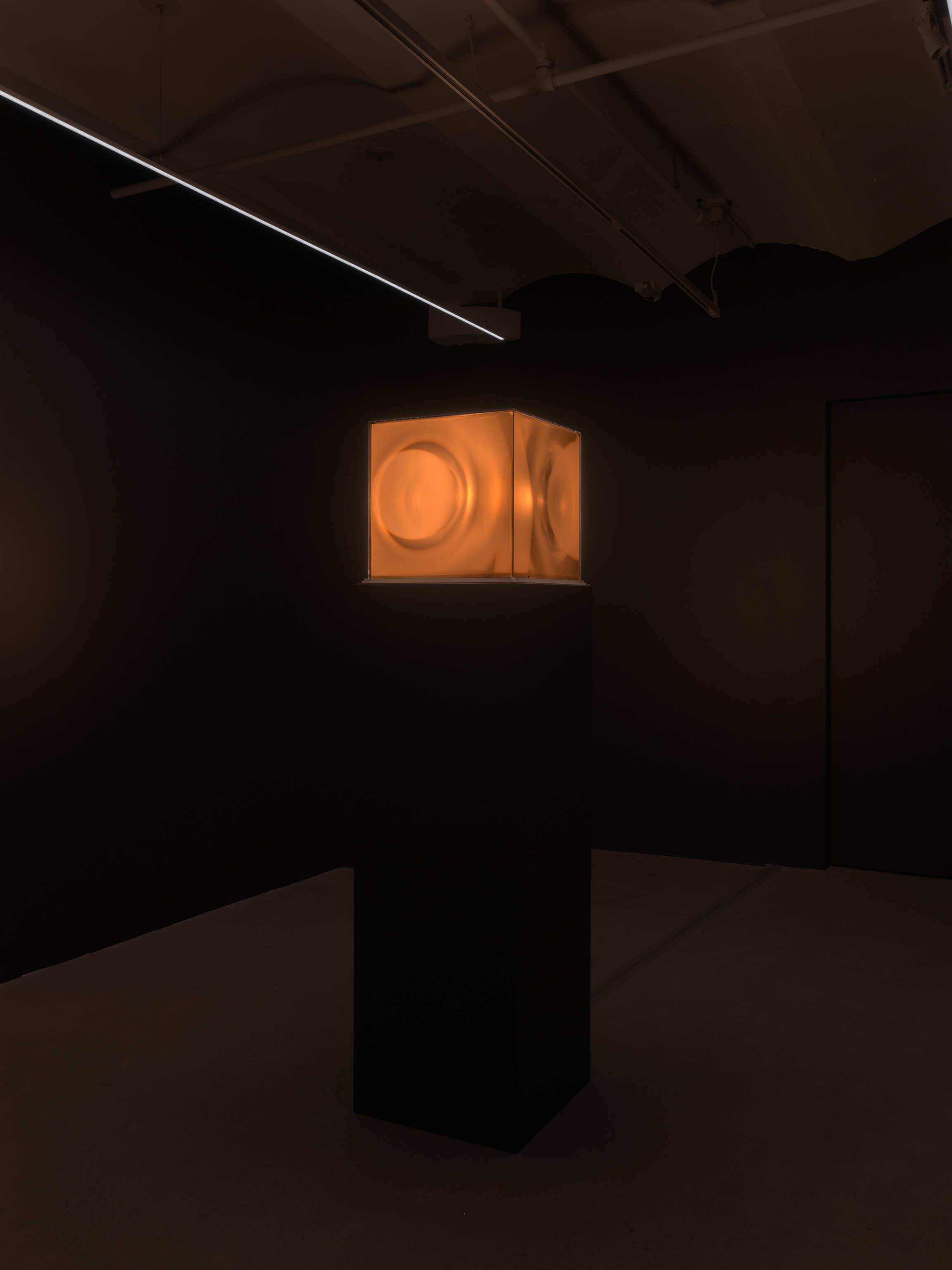 Another development was into kinetic work, such as Japanische Trias (1970), which Mack made during the year he was a guest professor at Osaka University in Japan. Here Mack transposed his signature textured surfaces onto rotating discs, which further activate a changeable dance of luminous effects. This ballet of light is extended in a recent kinetic sculpture, Immaterial Erscheinung (2022), which presents the ghostlike play of a glowing transparent sphere floating in front of a cube.
