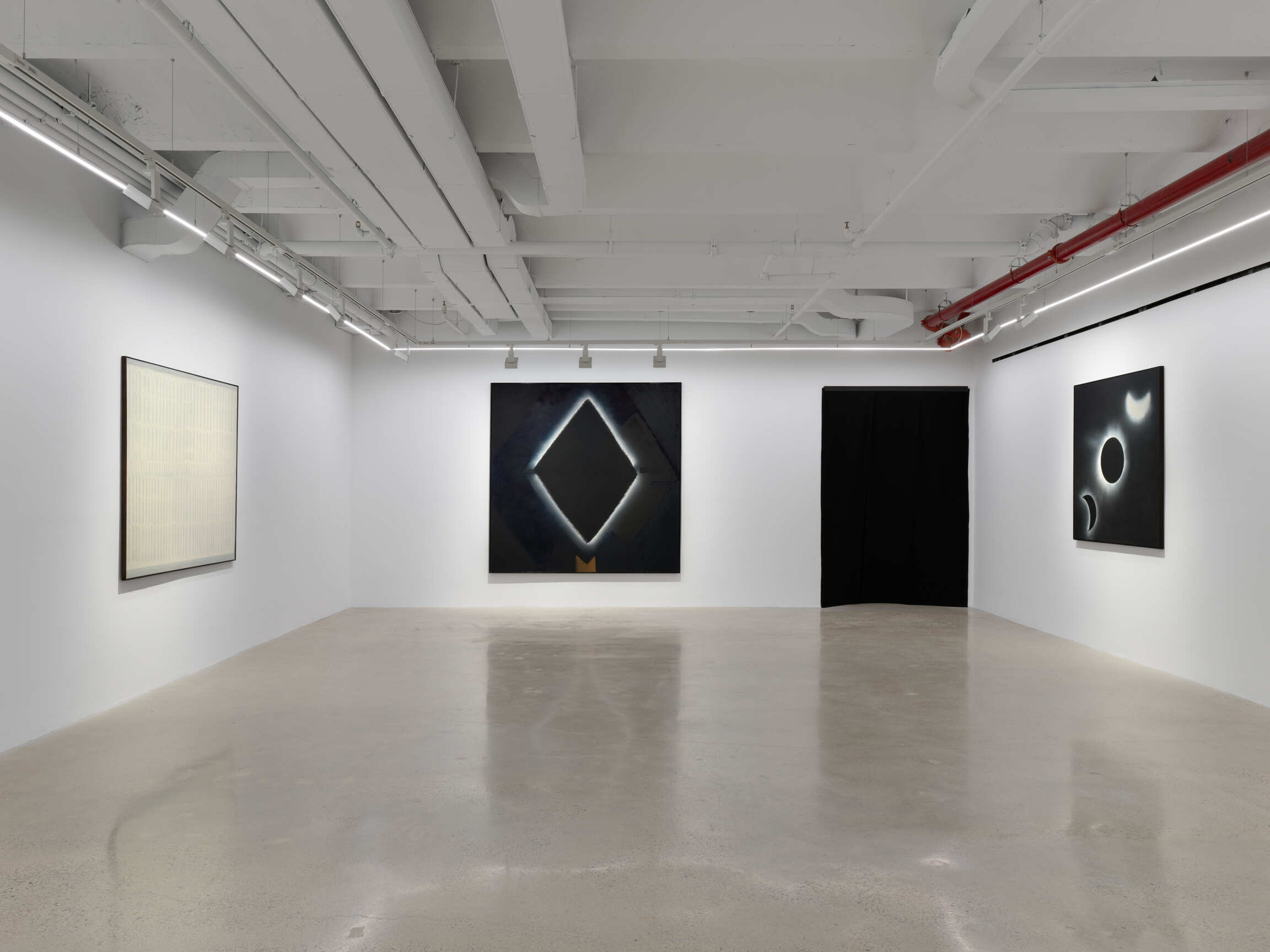 Other recent work demonstrates Mack’s ongoing interest in environmental works, where the viewer occupies the dramatic space of a darkened room saturated with light effects. These are also conveyed in paintings, like Night View (2005) where phases reminiscent of a lunar eclipse are captured on a canvas surface. Fully dimensional sculptures such as Netz-Stele (2004) bring metallized light effects fully into the round.
