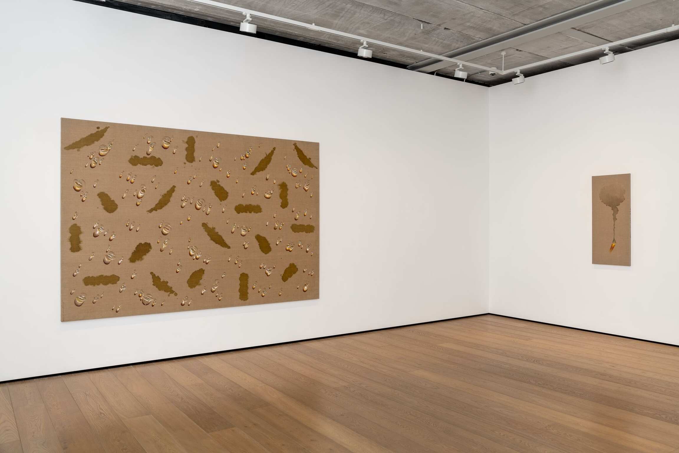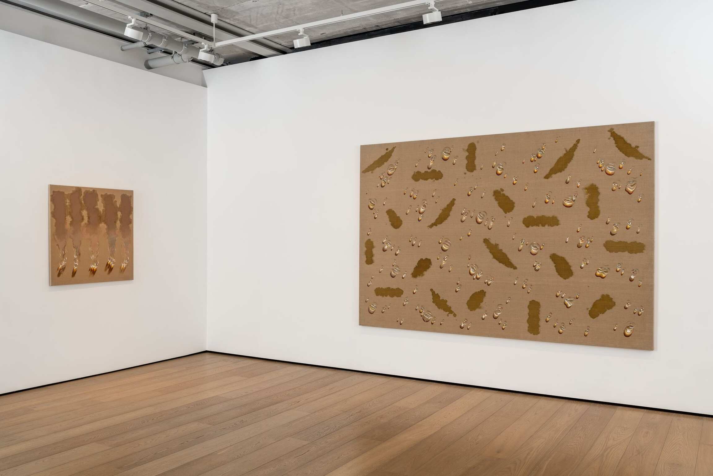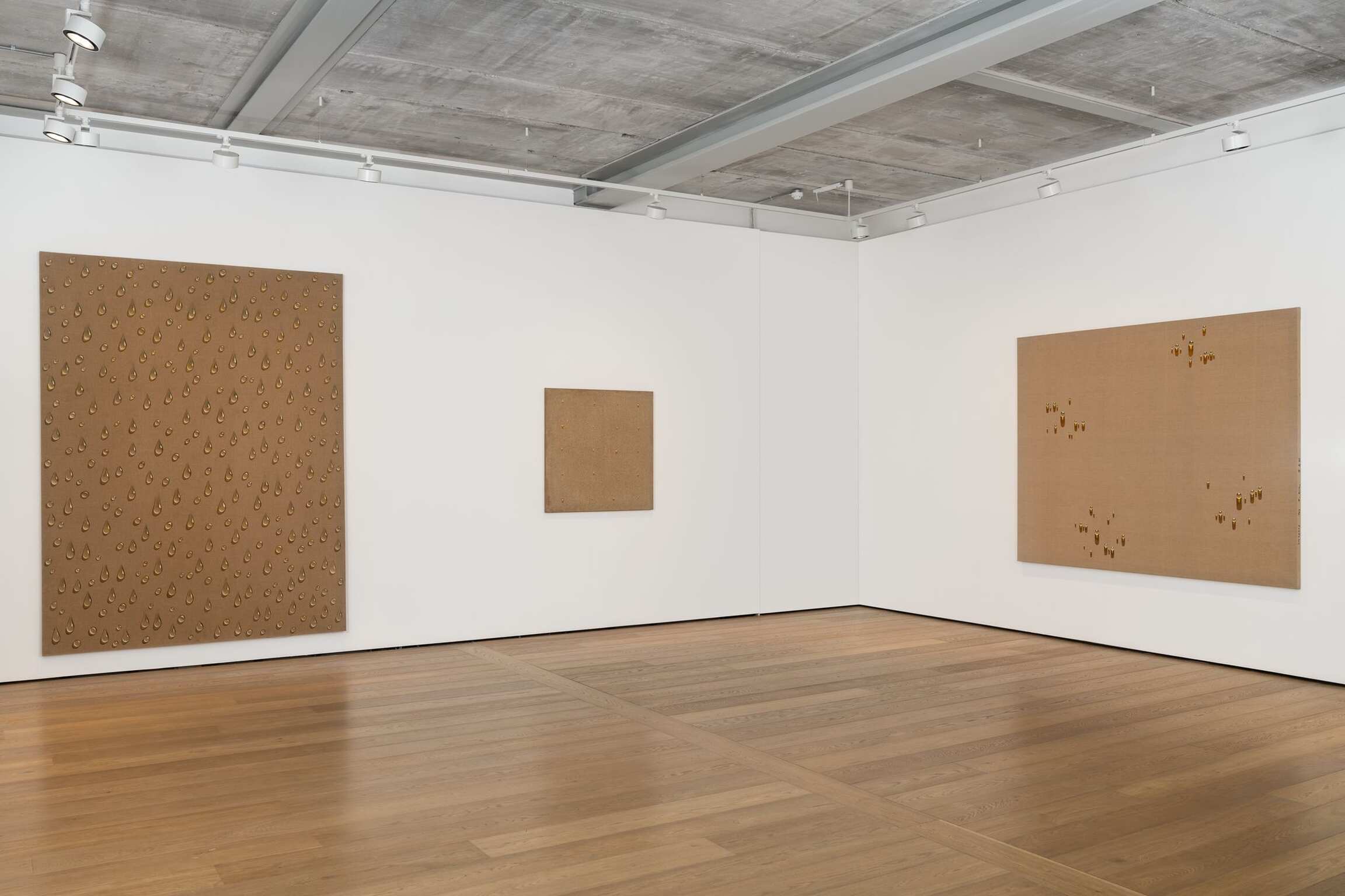 The painterly journey taken to make these drops was a vehicle for Kim’s reclamation of internal peace. He has said that he arrived at a ‘state of release as with Zen Buddhism.’ Each of the works in Water Drops is part of a fastidious observational process. Sponges are soaked and dripped onto canvas, and water is splashed on surfaces, to achieve translucent pellets. At the beginning, these experiments were photographed and scrutinised. Kim dwelt upon the resultant studies, and from them has created a catalogue of cardboard waterdrops. These mockups are the material with which he deliberated. There was always potential that they may be shuffled about, placed according to the Renaissance Golden Section principles, or organised in a grid before his composition was resolved. And then it is on to paint. Kim’s early adoption of an airbrush gradually gave way to brush painting. Watery pigment is the base, and added to it are flourishes of gold and white.