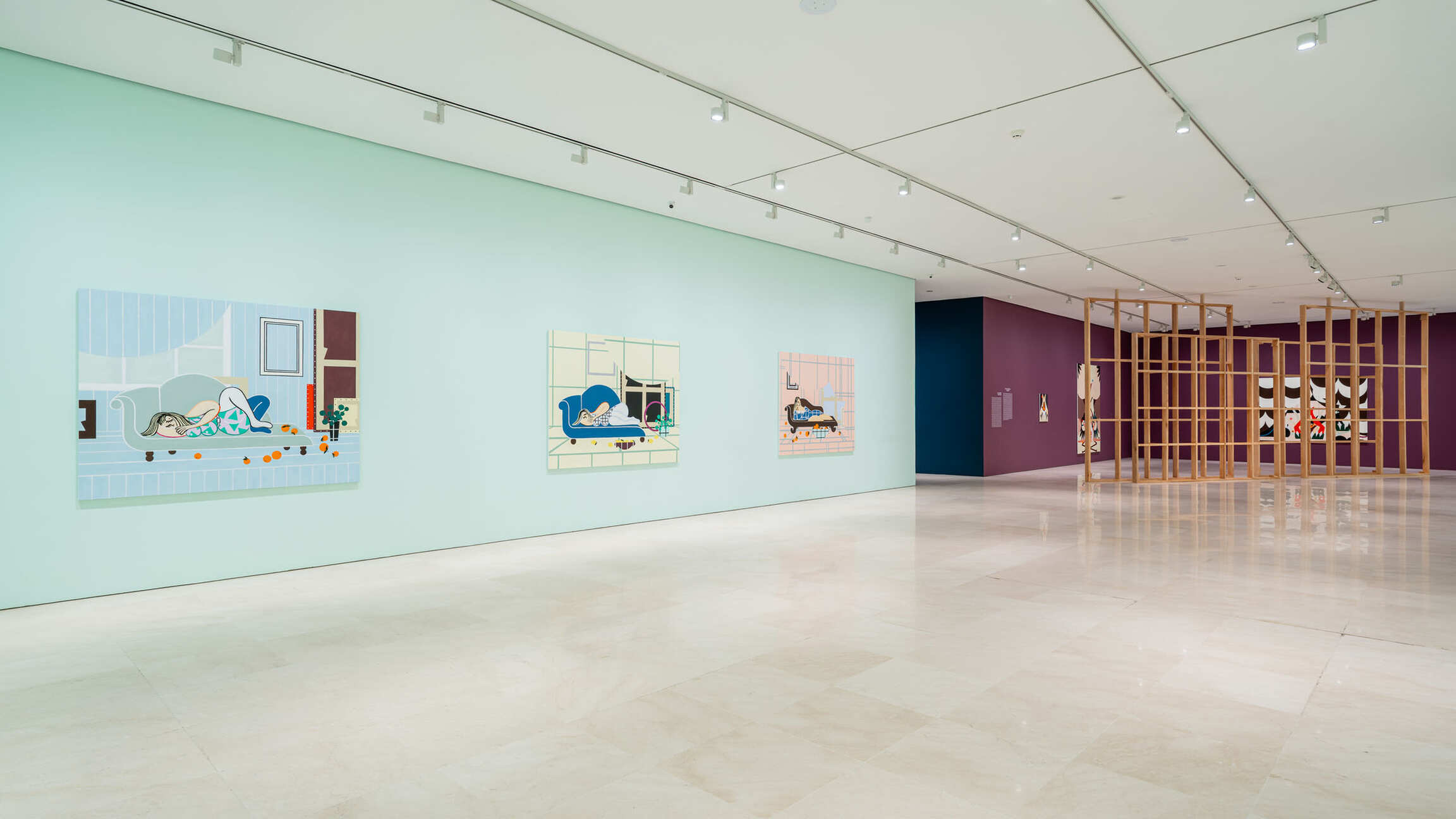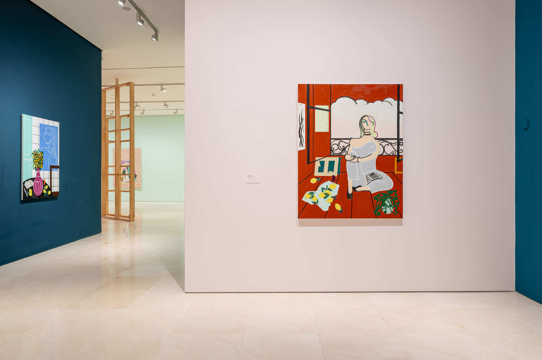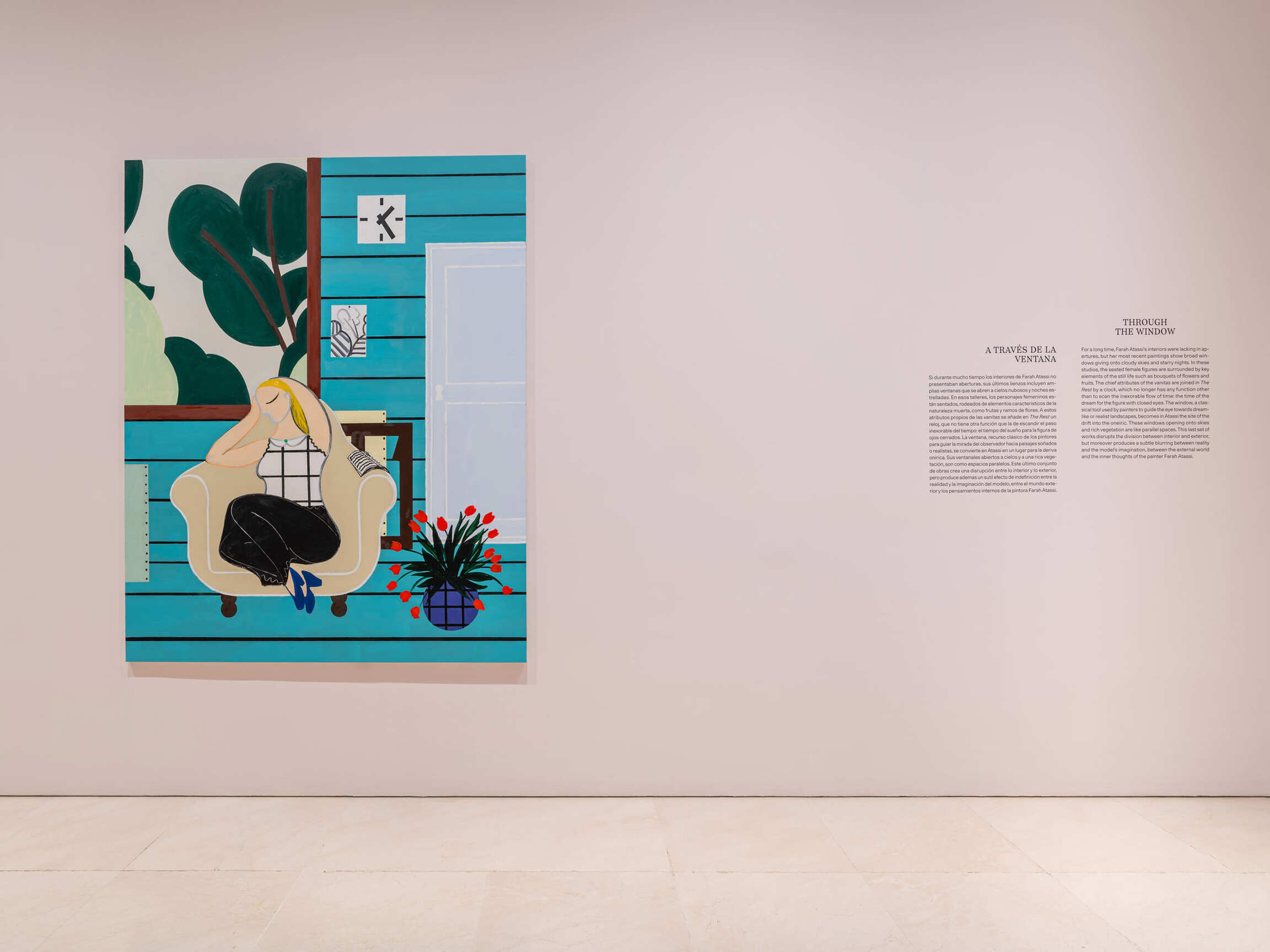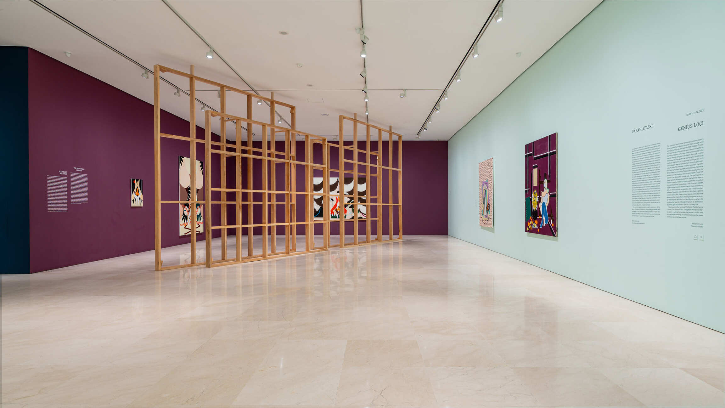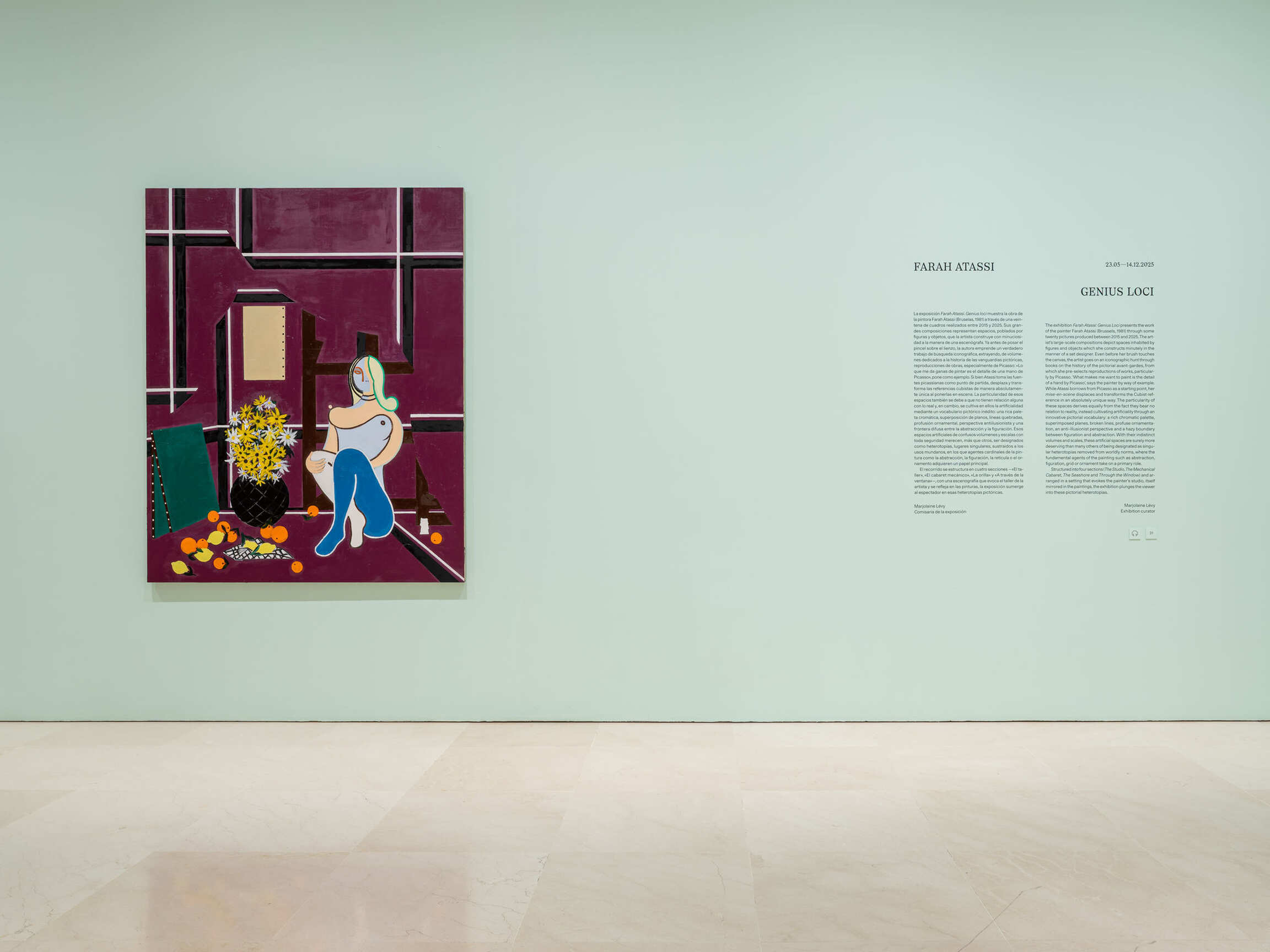 The exhibition is divided into four sections. It starts in The studio, a theme chosen by the artist as a reflective space in relation to the conventions of painting. Female models are seen resting alongside empty stretchers and unpainted canvases in works that feature the characteristic grid with which Atassi balances many of her canvases. The works in The mechanical cabaret depict female bodies in motion in a synchronised choreography of legs, hoops and balls. The section The shore includes exterior scenes of bathers sunbathing on a beach represented by solid horizontal colours evoking blue sky, turquoise sea and beige sand. Finally, in Through the window the canvases show the female figures surrounded by flowers and fruit next to windows looking onto cloudy skies and starry nights. The works present in Genius Loci, which often seem to be constructed in the manner of an architectural form, are not seeking a faithful reproduction of reality: the precise lines and the objects represented seem to belong to a parallel world where time has stopped, arousing a sense of mystery in the viewer.