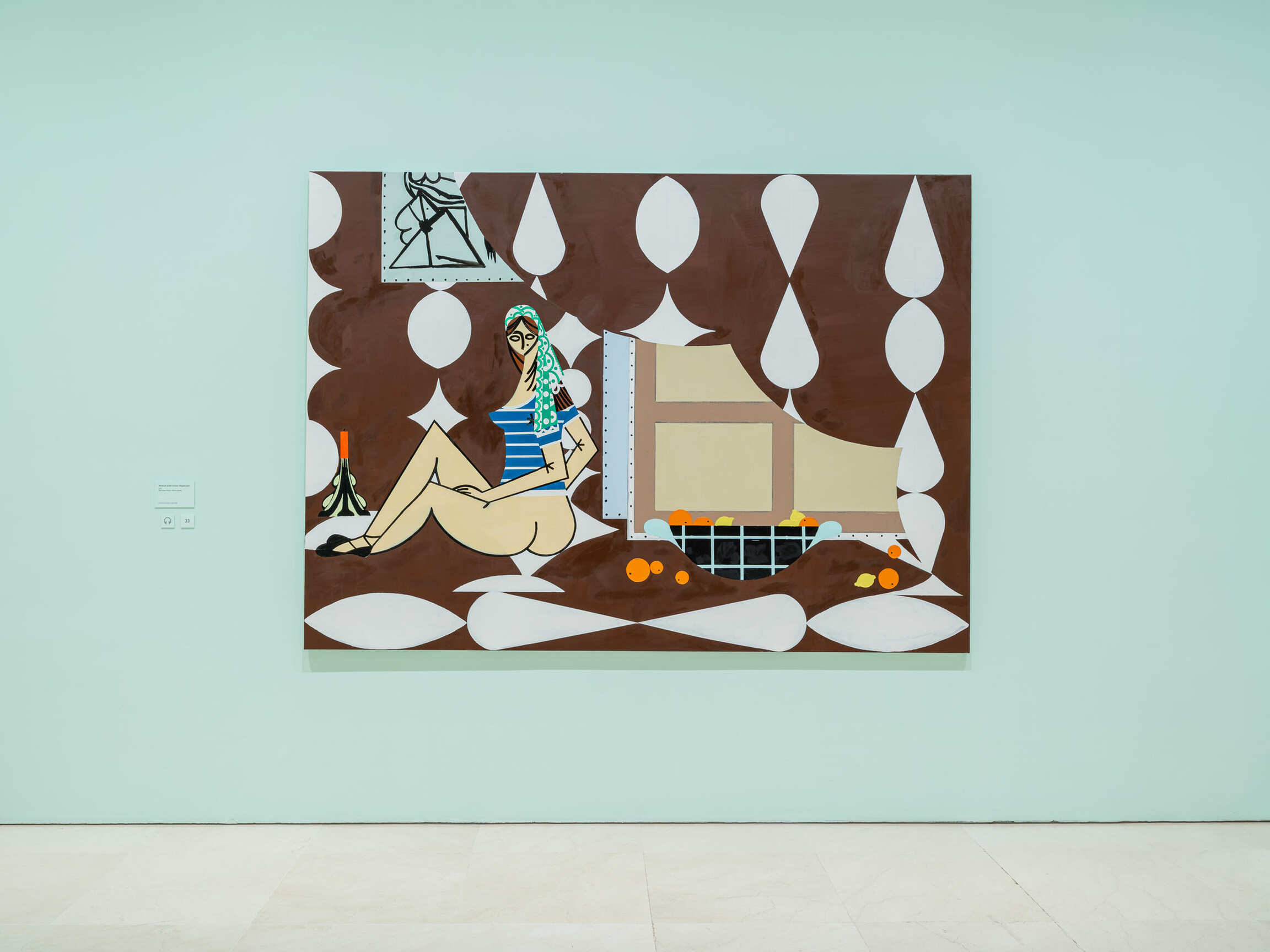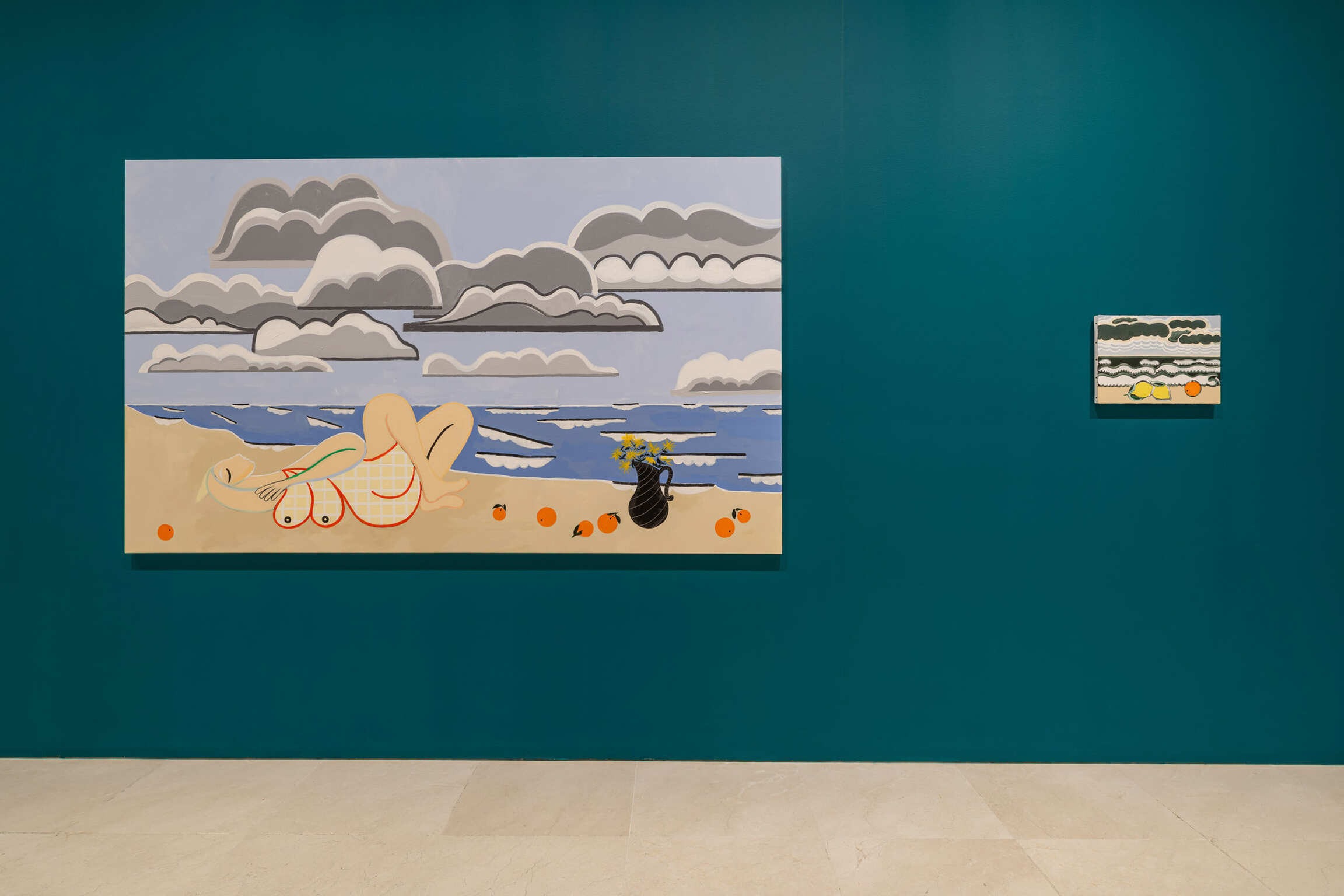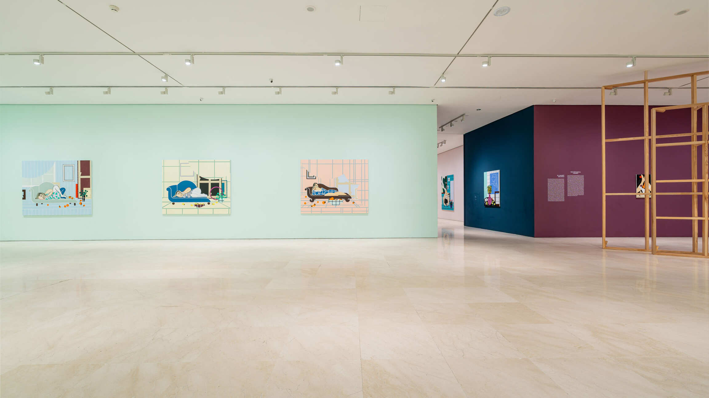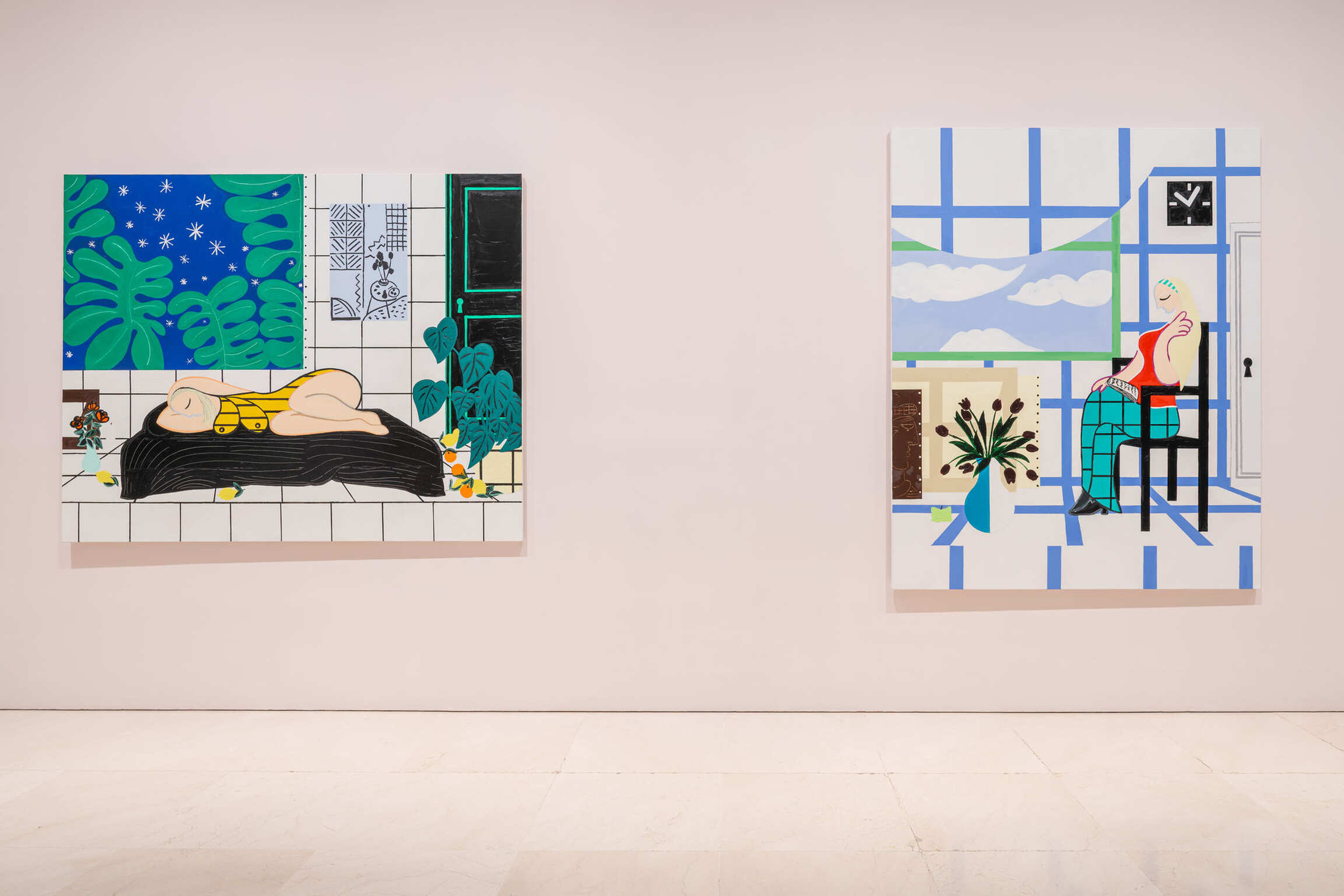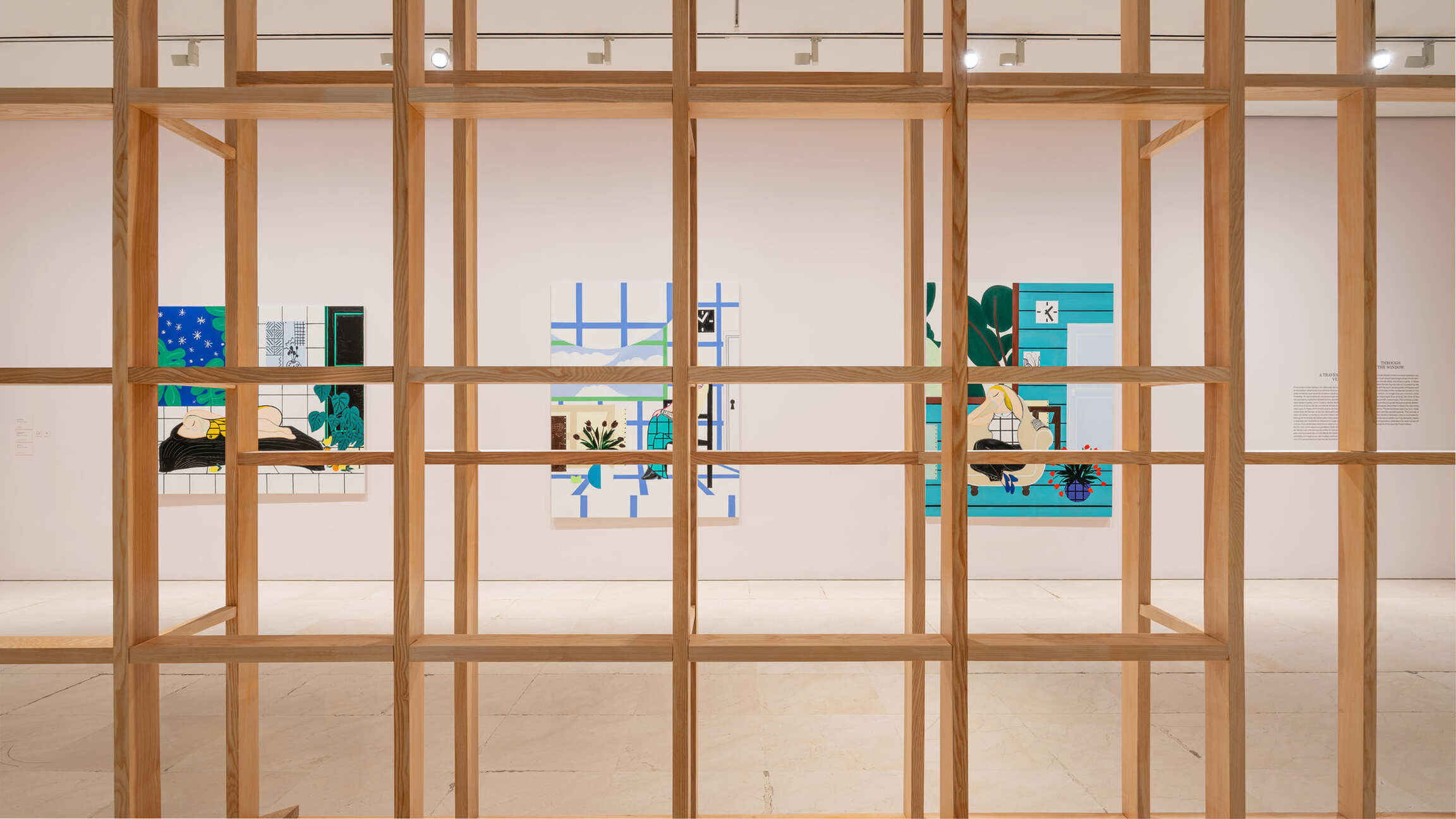 The exhibition is divided into four sections. It starts in The studio, a theme chosen by the artist as a reflective space in relation to the conventions of painting. Female models are seen resting alongside empty stretchers and unpainted canvases in works that feature the characteristic grid with which Atassi balances many of her canvases. The works in The mechanical cabaret depict female bodies in motion in a synchronised choreography of legs, hoops and balls. The section The shore includes exterior scenes of bathers sunbathing on a beach represented by solid horizontal colours evoking blue sky, turquoise sea and beige sand. Finally, in Through the window the canvases show the female figures surrounded by flowers and fruit next to windows looking onto cloudy skies and starry nights. The works present in Genius Loci, which often seem to be constructed in the manner of an architectural form, are not seeking a faithful reproduction of reality: the precise lines and the objects represented seem to belong to a parallel world where time has stopped, arousing a sense of mystery in the viewer.