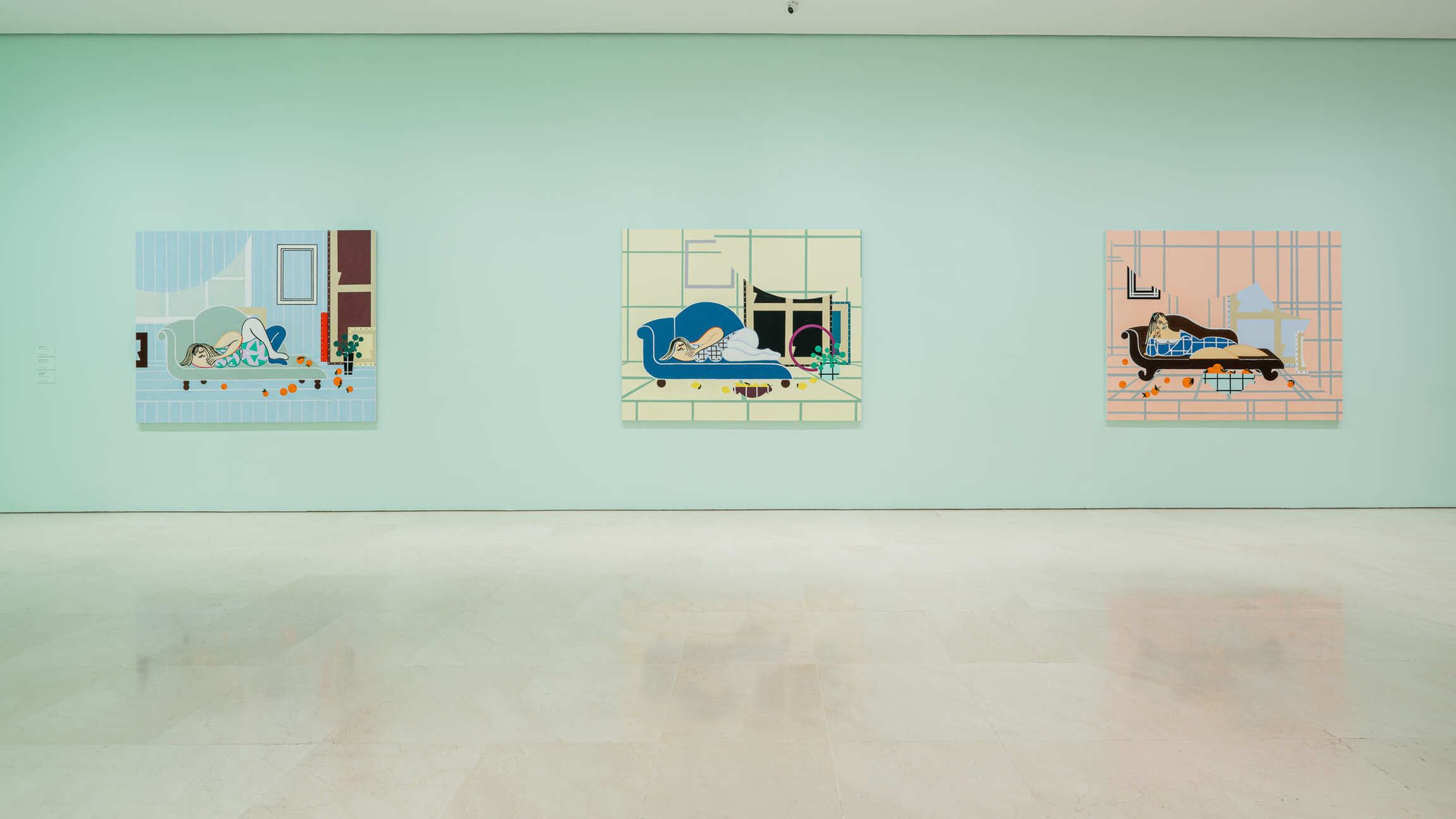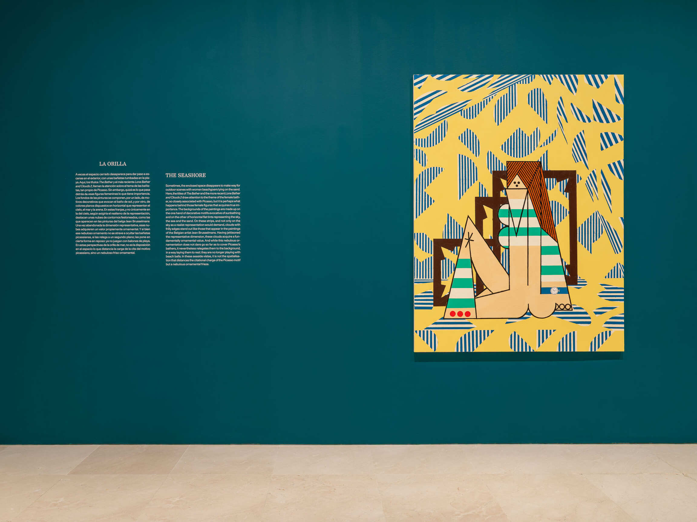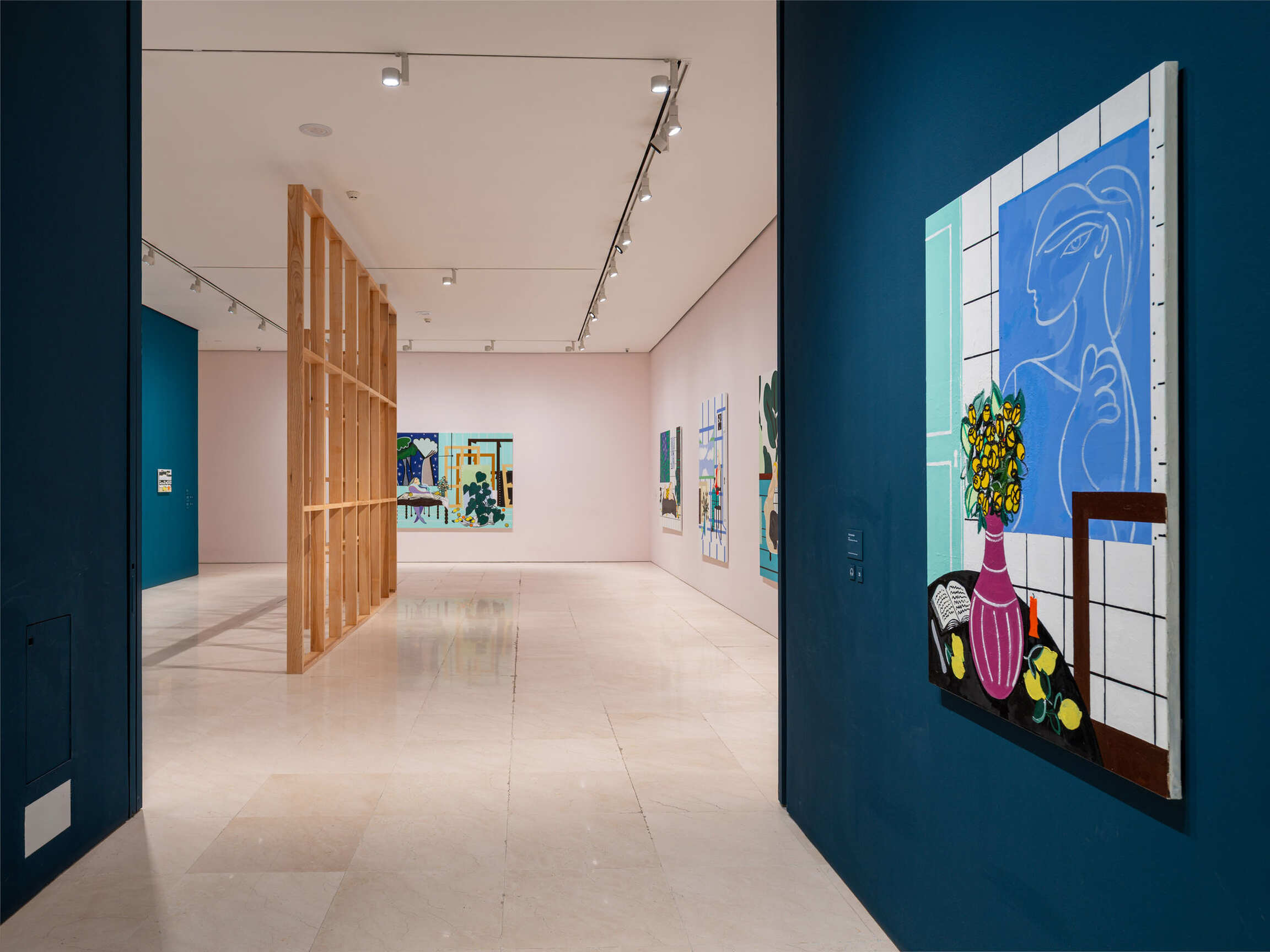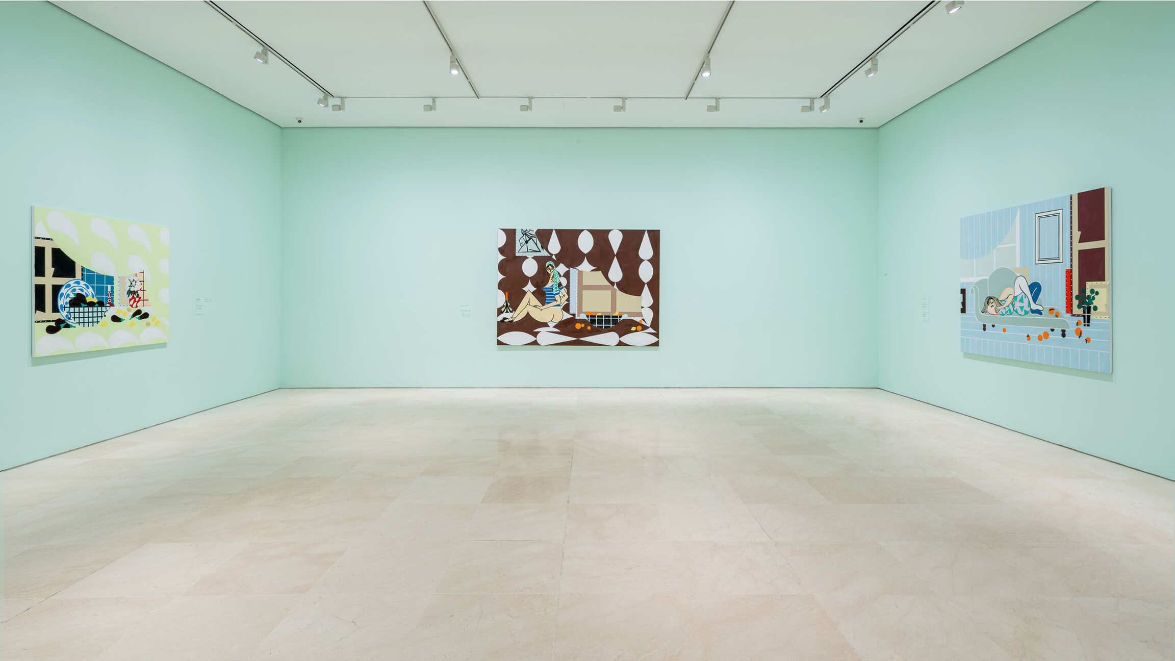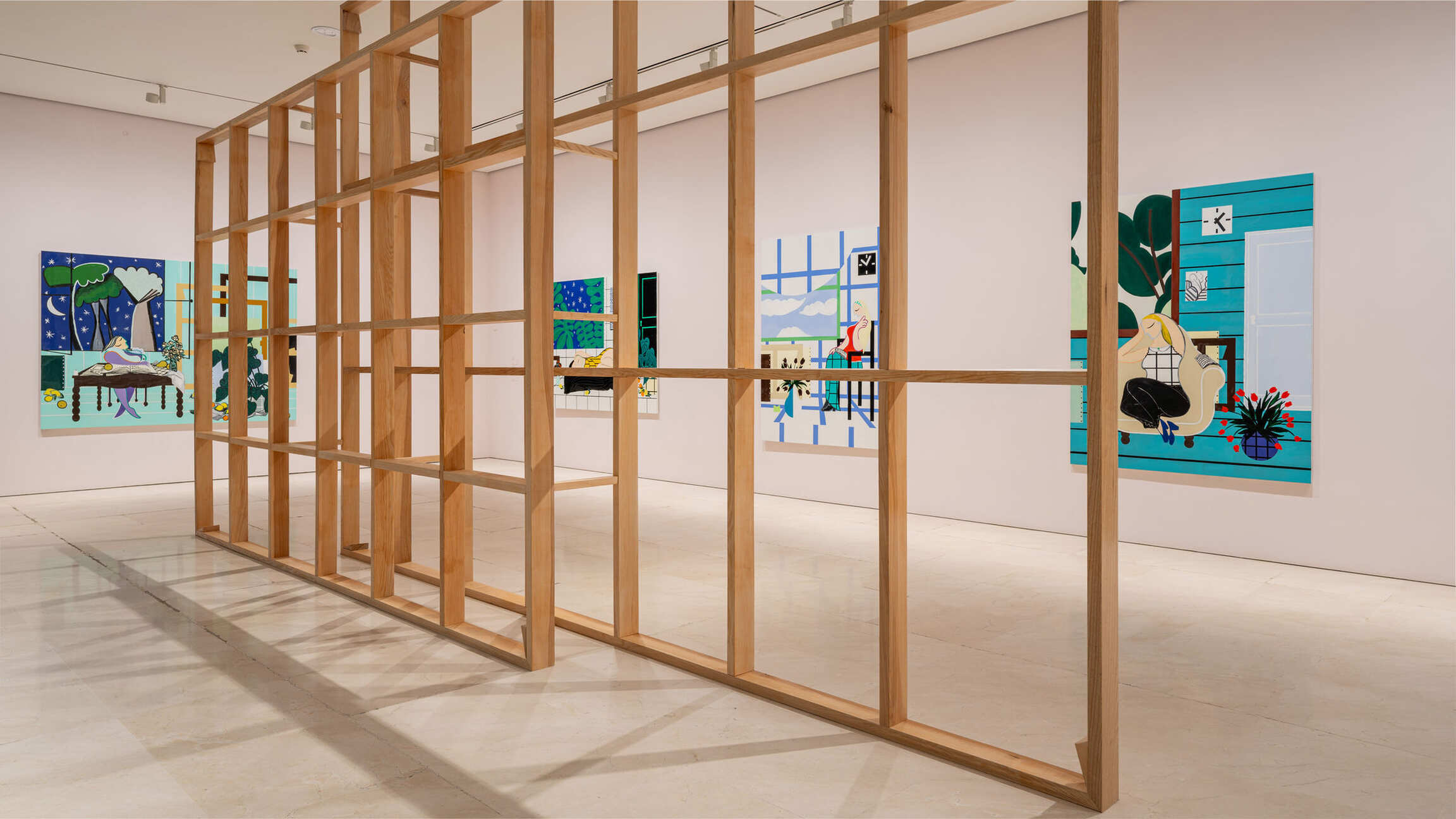 The exhibition is divided into four sections. It starts in The studio, a theme chosen by the artist as a reflective space in relation to the conventions of painting. Female models are seen resting alongside empty stretchers and unpainted canvases in works that feature the characteristic grid with which Atassi balances many of her canvases. The works in The mechanical cabaret depict female bodies in motion in a synchronised choreography of legs, hoops and balls. The section The shore includes exterior scenes of bathers sunbathing on a beach represented by solid horizontal colours evoking blue sky, turquoise sea and beige sand. Finally, in Through the window the canvases show the female figures surrounded by flowers and fruit next to windows looking onto cloudy skies and starry nights. The works present in Genius Loci, which often seem to be constructed in the manner of an architectural form, are not seeking a faithful reproduction of reality: the precise lines and the objects represented seem to belong to a parallel world where time has stopped, arousing a sense of mystery in the viewer.