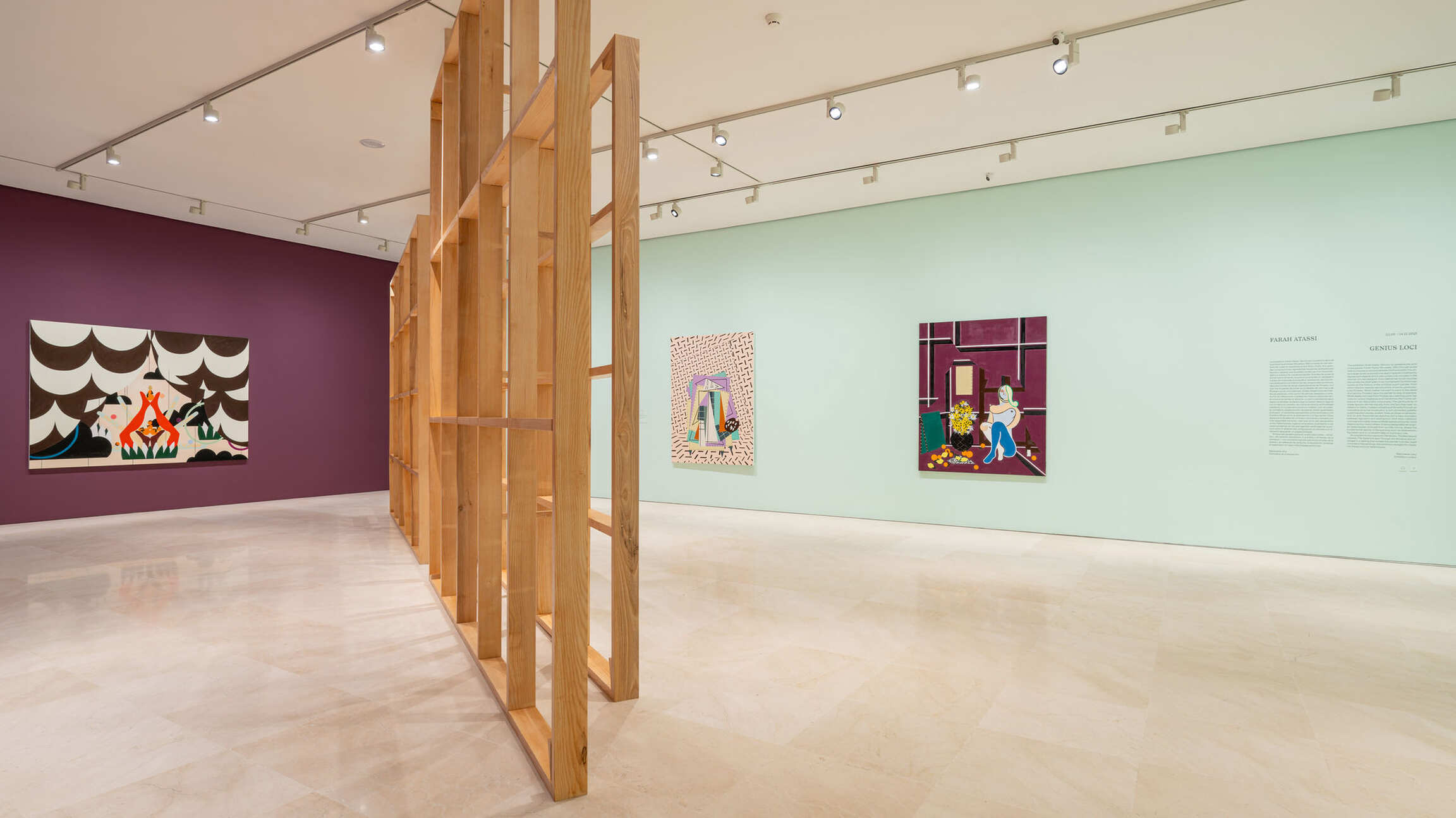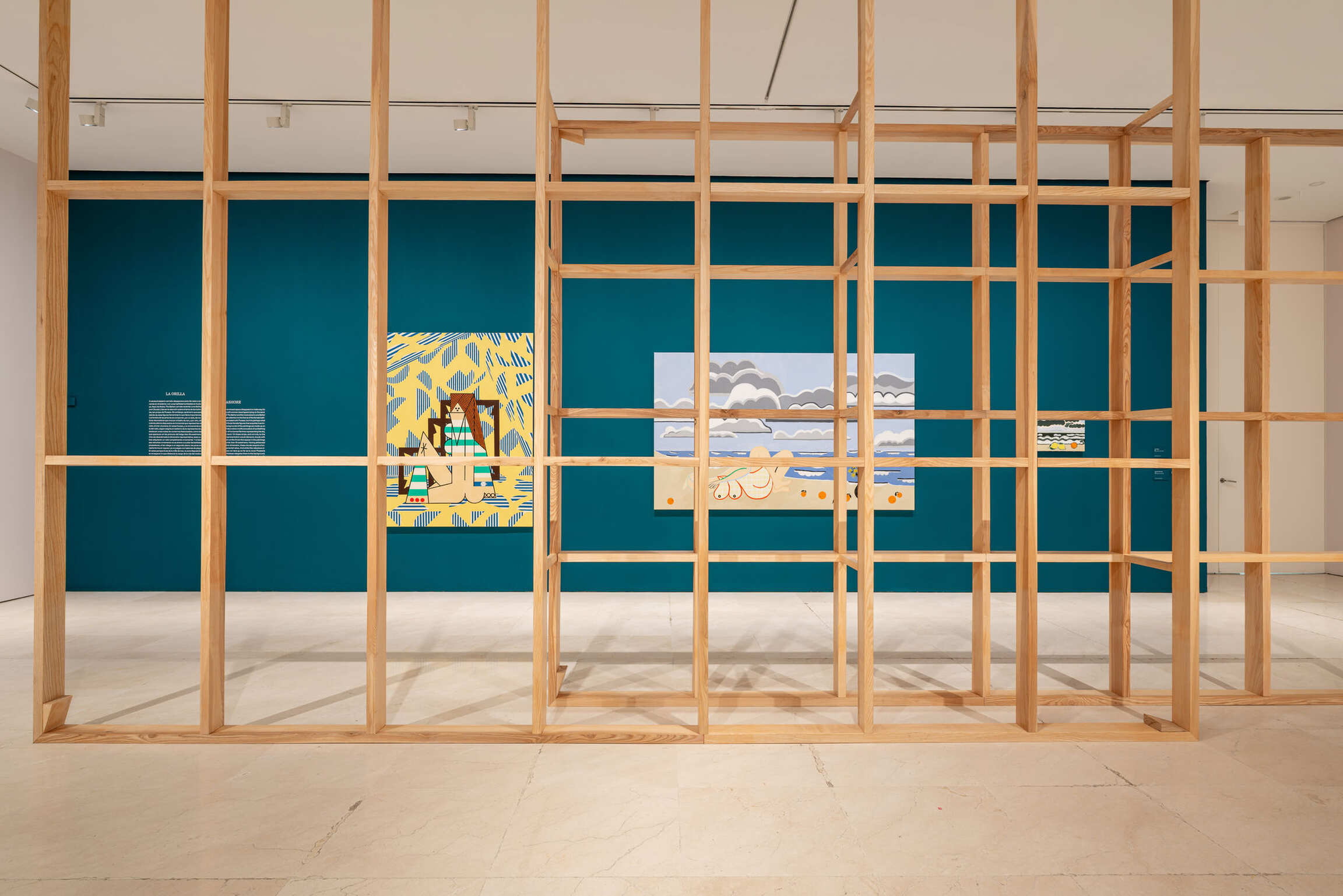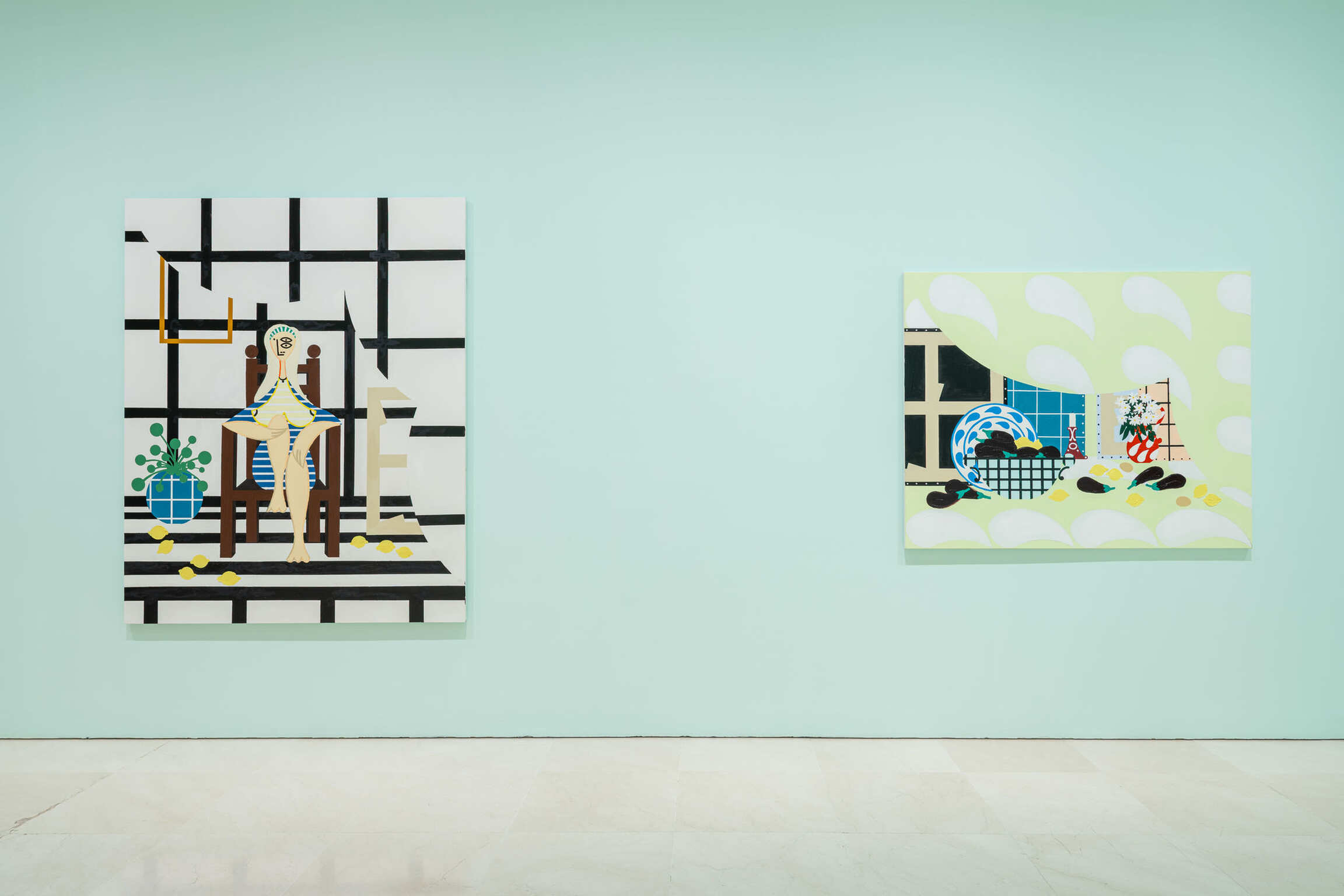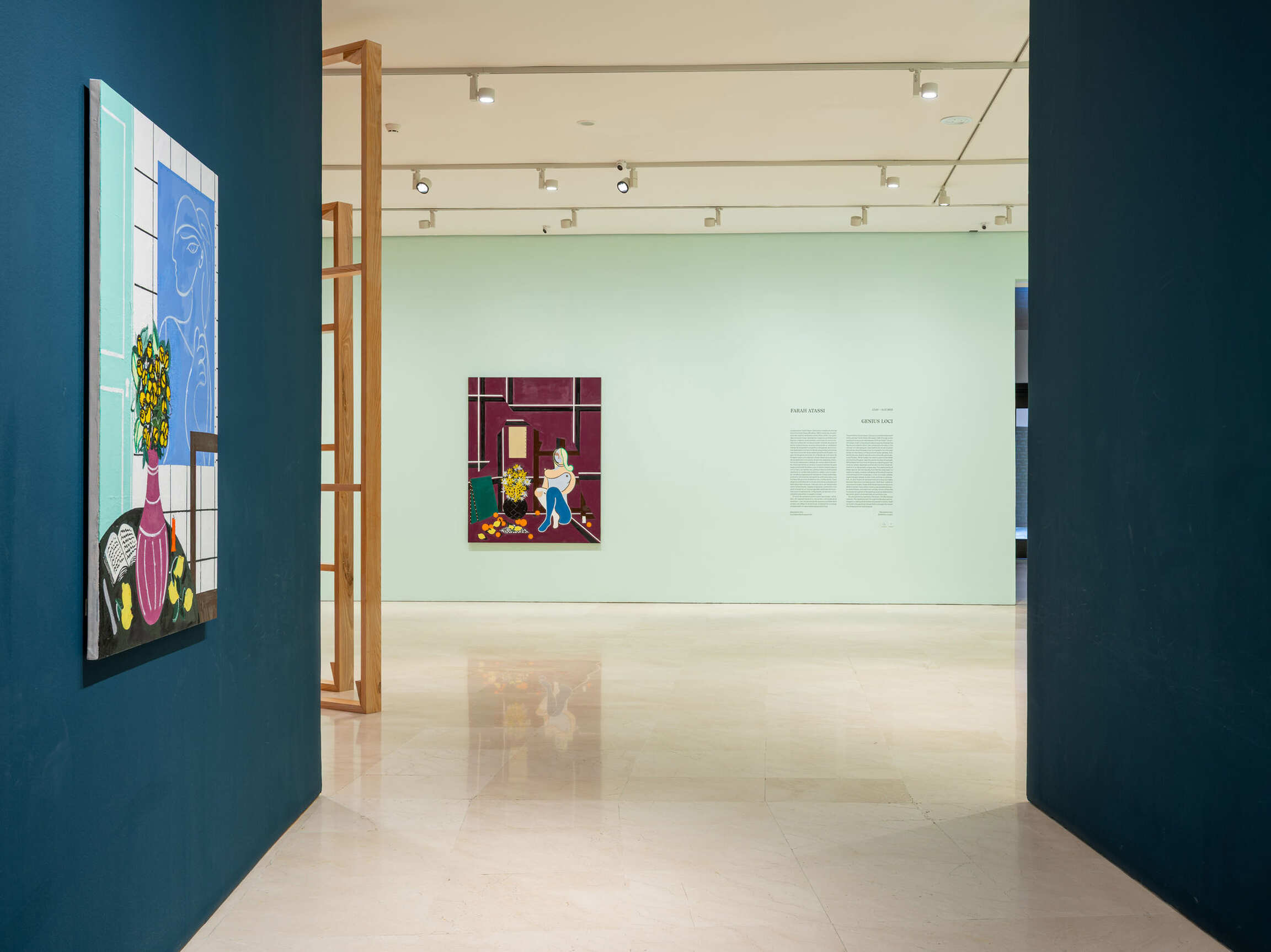 The exhibition is divided into four sections. It starts in The studio, a theme chosen by the artist as a reflective space in relation to the conventions of painting. Female models are seen resting alongside empty stretchers and unpainted canvases in works that feature the characteristic grid with which Atassi balances many of her canvases. The works in The mechanical cabaret depict female bodies in motion in a synchronised choreography of legs, hoops and balls. The section The shore includes exterior scenes of bathers sunbathing on a beach represented by solid horizontal colours evoking blue sky, turquoise sea and beige sand. Finally, in Through the window the canvases show the female figures surrounded by flowers and fruit next to windows looking onto cloudy skies and starry nights. The works present in Genius Loci, which often seem to be constructed in the manner of an architectural form, are not seeking a faithful reproduction of reality: the precise lines and the objects represented seem to belong to a parallel world where time has stopped, arousing a sense of mystery in the viewer.