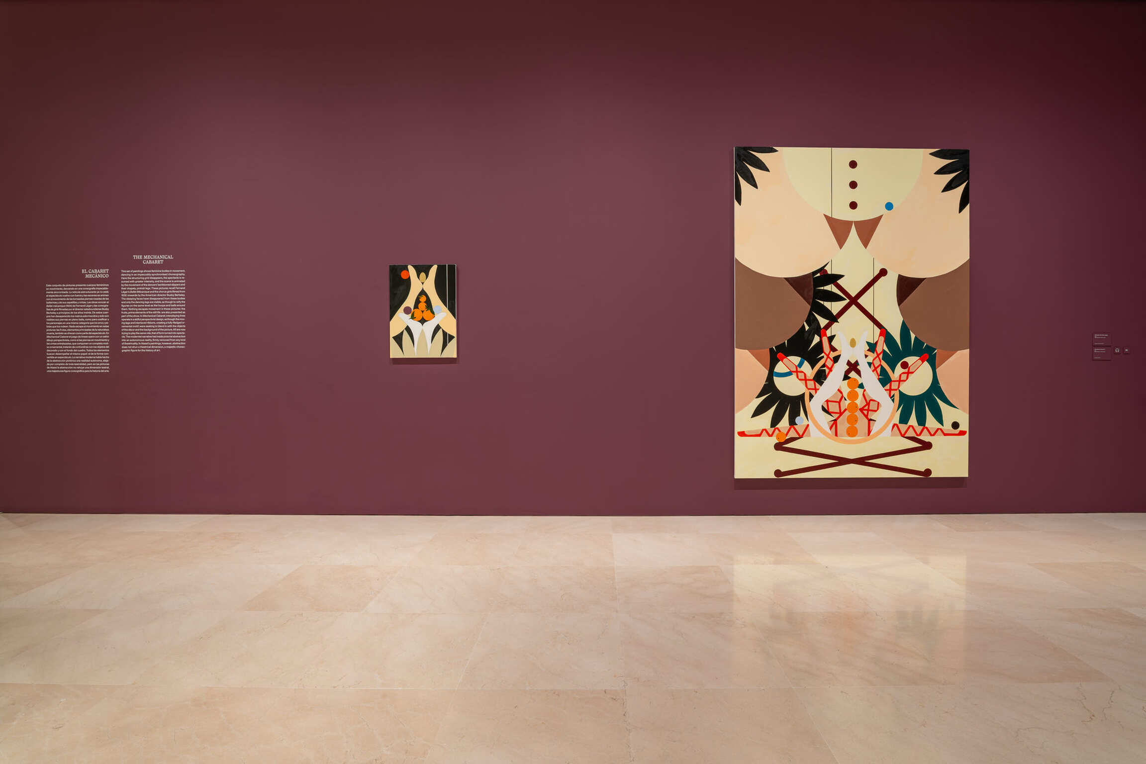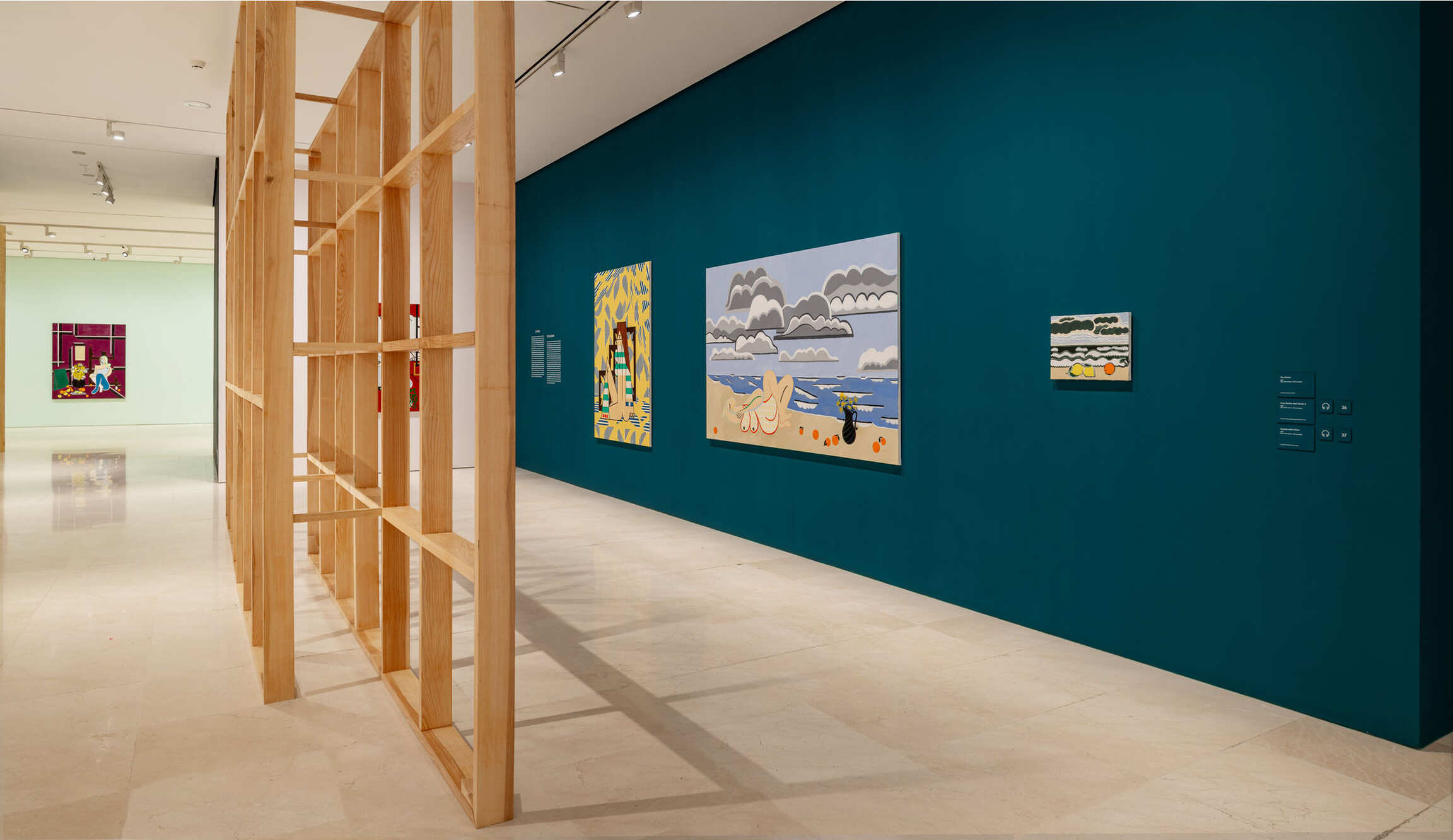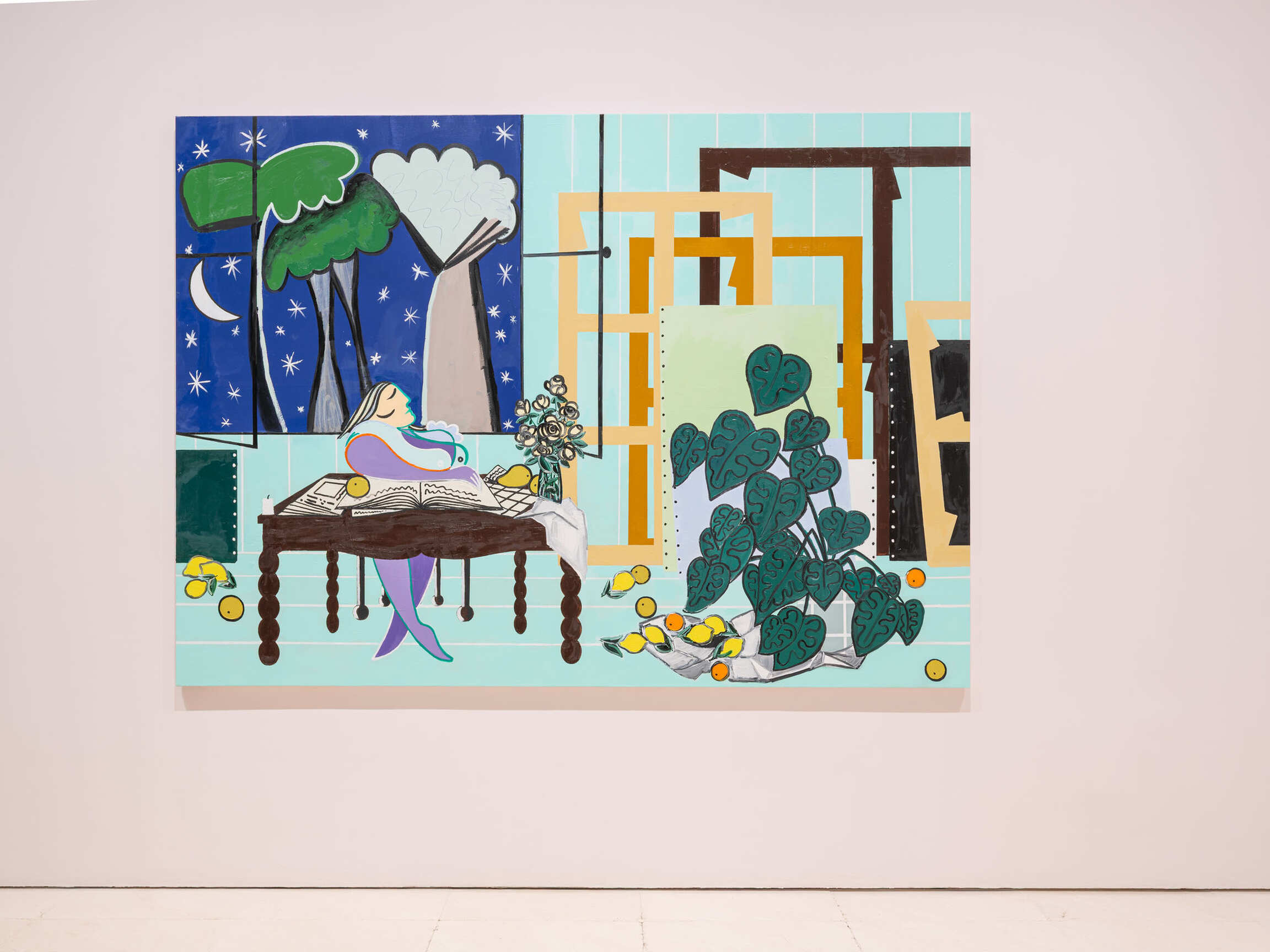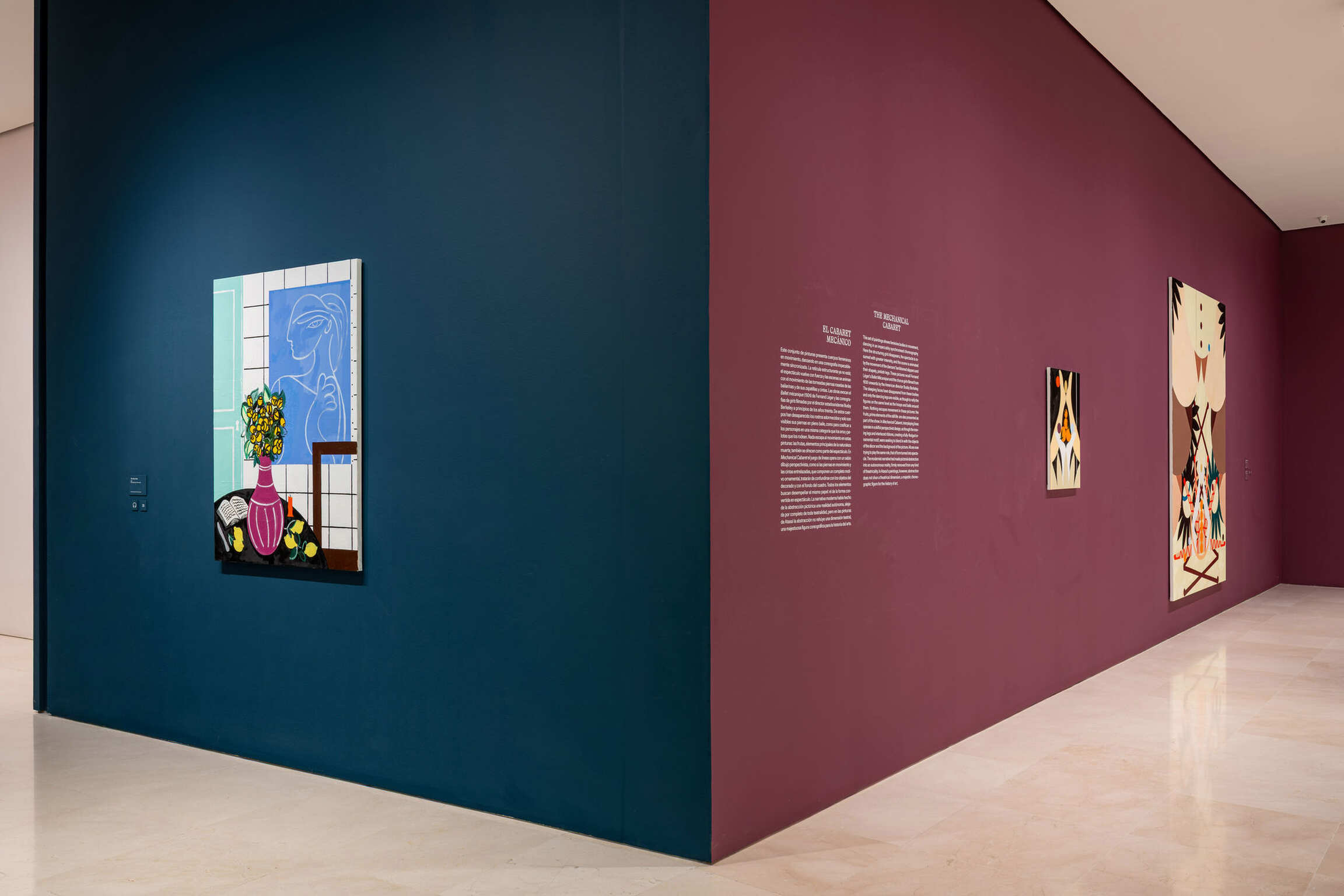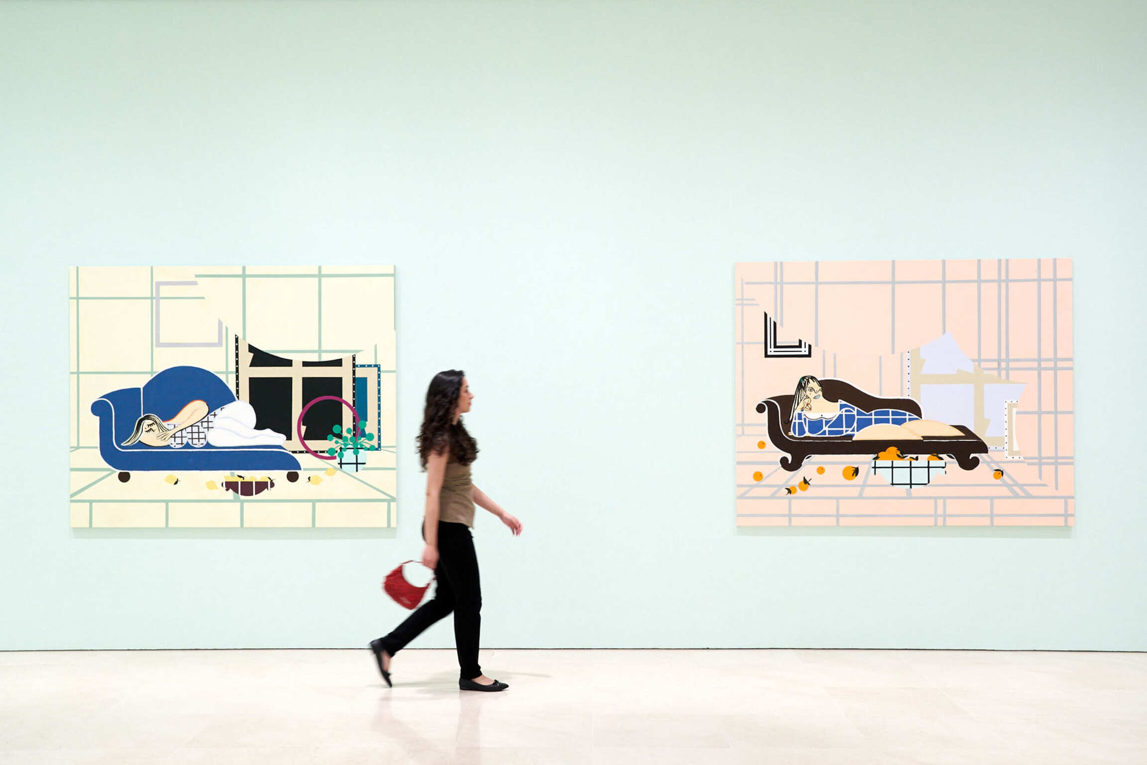 The exhibition is divided into four sections. It starts in The studio, a theme chosen by the artist as a reflective space in relation to the conventions of painting. Female models are seen resting alongside empty stretchers and unpainted canvases in works that feature the characteristic grid with which Atassi balances many of her canvases. The works in The mechanical cabaret depict female bodies in motion in a synchronised choreography of legs, hoops and balls. The section The shore includes exterior scenes of bathers sunbathing on a beach represented by solid horizontal colours evoking blue sky, turquoise sea and beige sand. Finally, in Through the window the canvases show the female figures surrounded by flowers and fruit next to windows looking onto cloudy skies and starry nights. The works present in Genius Loci, which often seem to be constructed in the manner of an architectural form, are not seeking a faithful reproduction of reality: the precise lines and the objects represented seem to belong to a parallel world where time has stopped, arousing a sense of mystery in the viewer.
