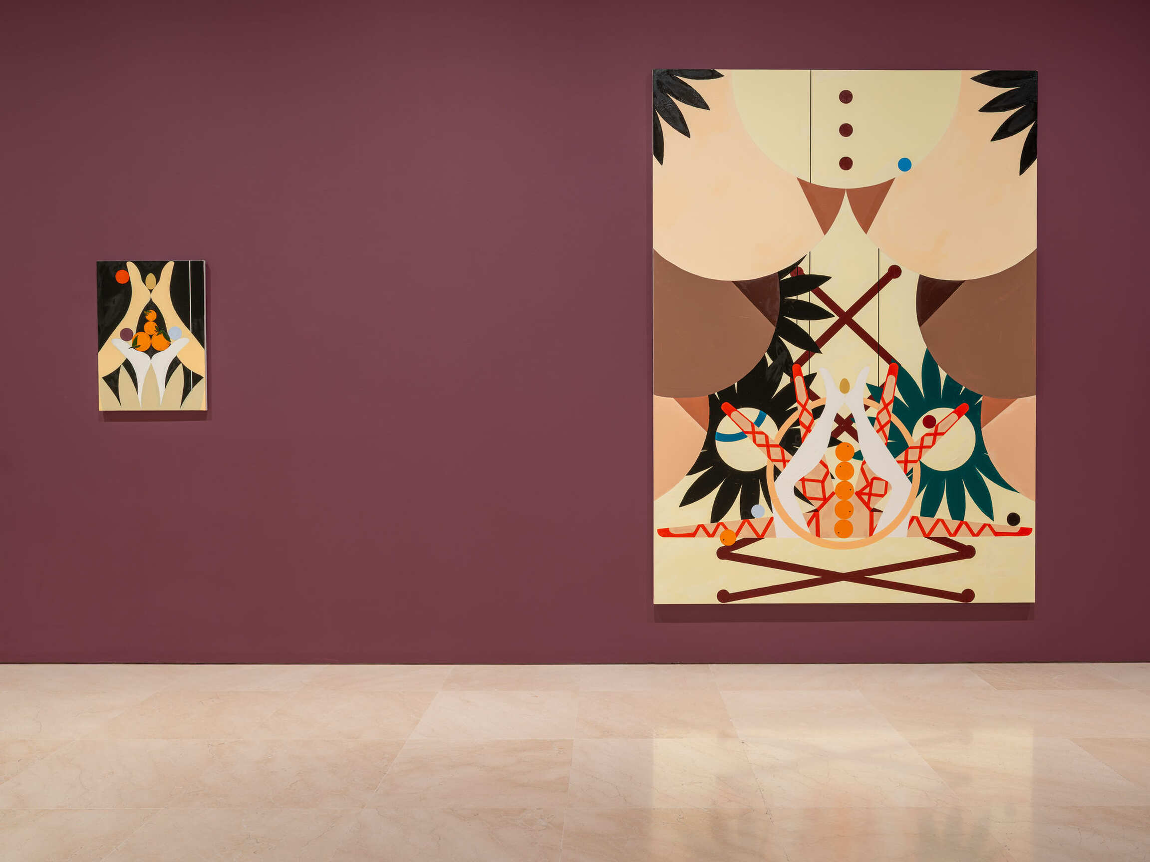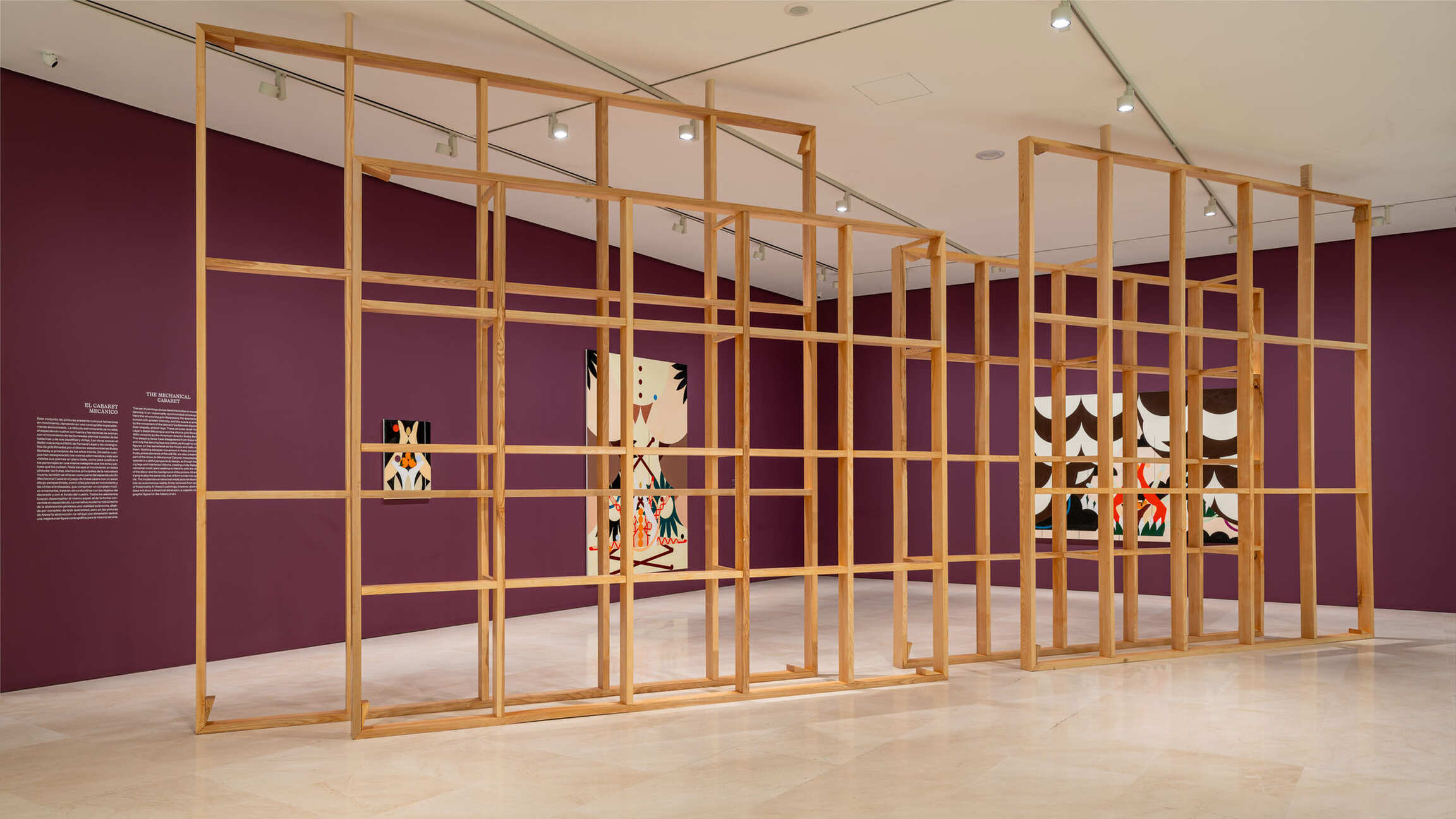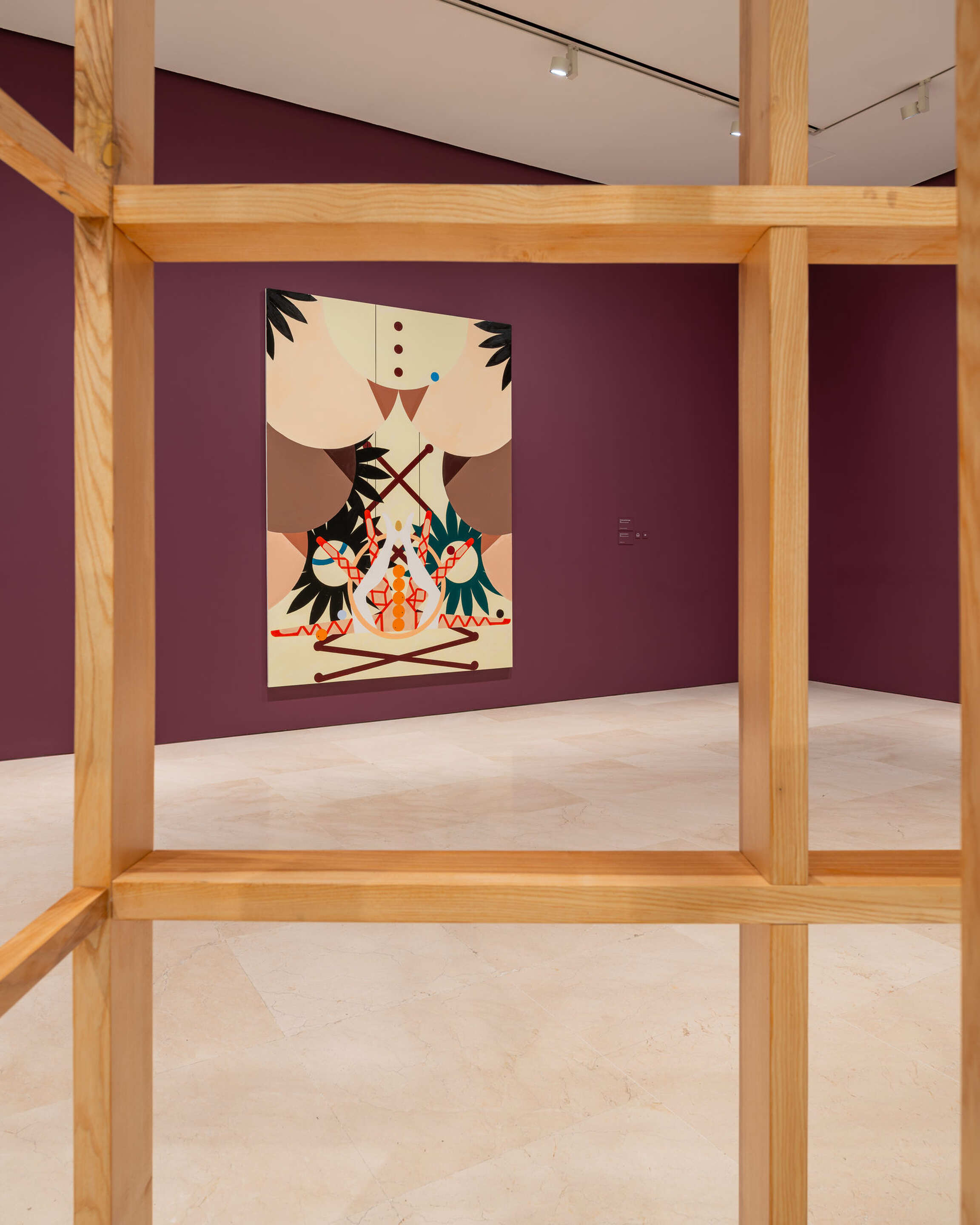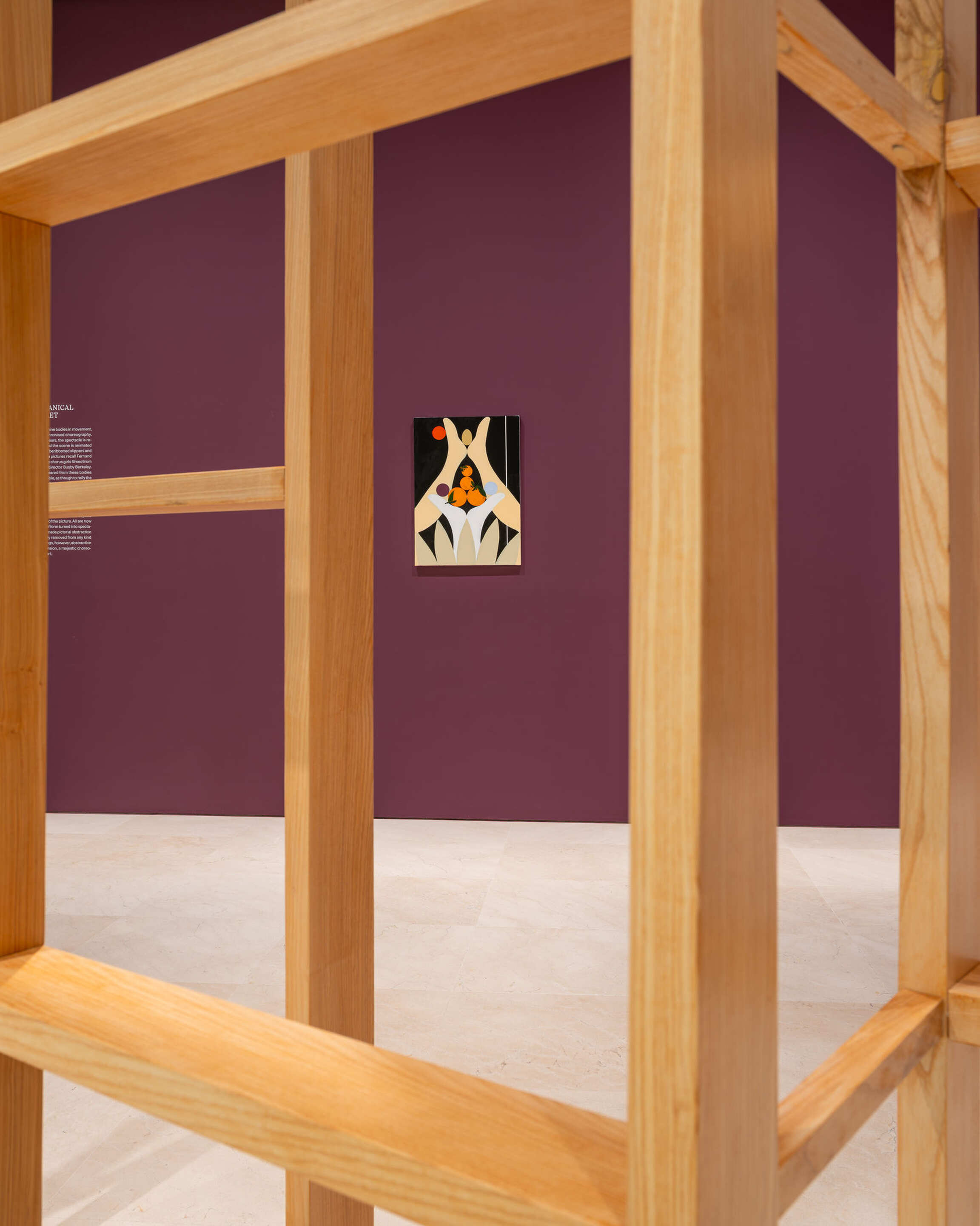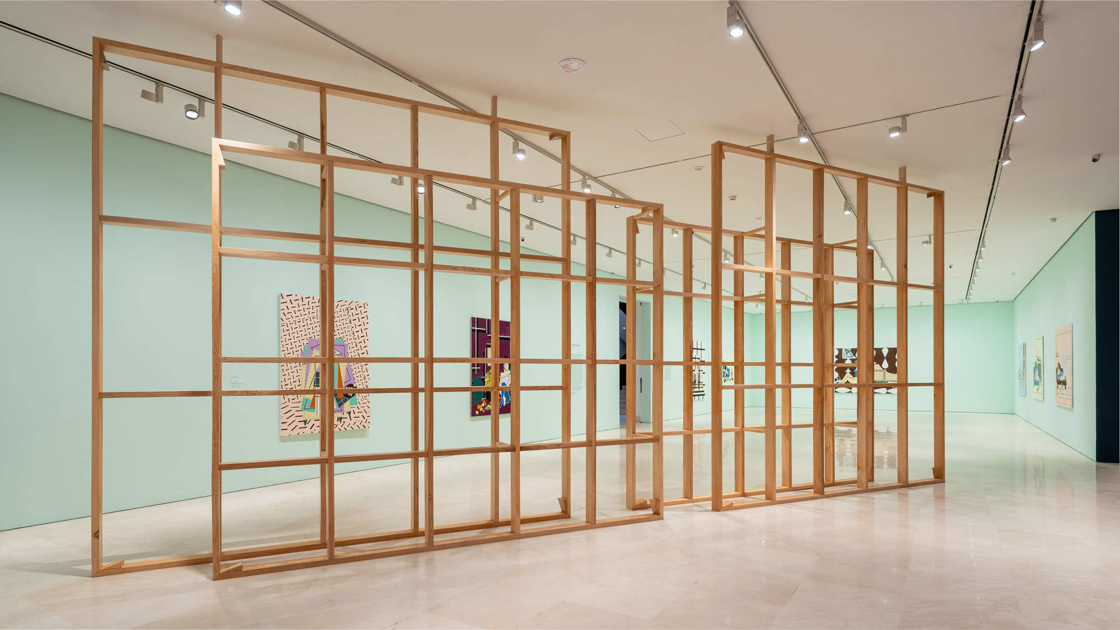 The exhibition is divided into four sections. It starts in The studio, a theme chosen by the artist as a reflective space in relation to the conventions of painting. Female models are seen resting alongside empty stretchers and unpainted canvases in works that feature the characteristic grid with which Atassi balances many of her canvases. The works in The mechanical cabaret depict female bodies in motion in a synchronised choreography of legs, hoops and balls. The section The shore includes exterior scenes of bathers sunbathing on a beach represented by solid horizontal colours evoking blue sky, turquoise sea and beige sand. Finally, in Through the window the canvases show the female figures surrounded by flowers and fruit next to windows looking onto cloudy skies and starry nights. The works present in Genius Loci, which often seem to be constructed in the manner of an architectural form, are not seeking a faithful reproduction of reality: the precise lines and the objects represented seem to belong to a parallel world where time has stopped, arousing a sense of mystery in the viewer.