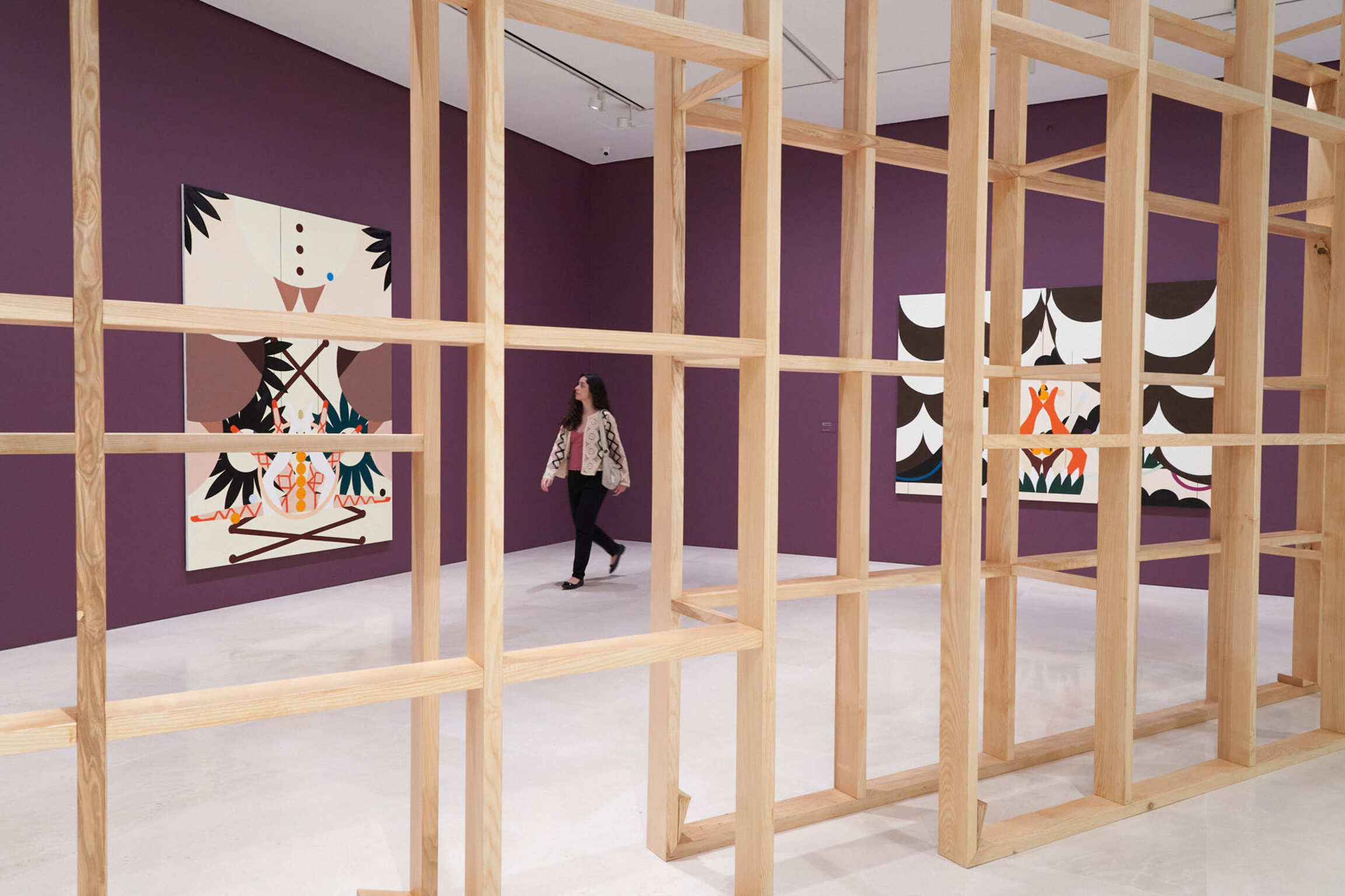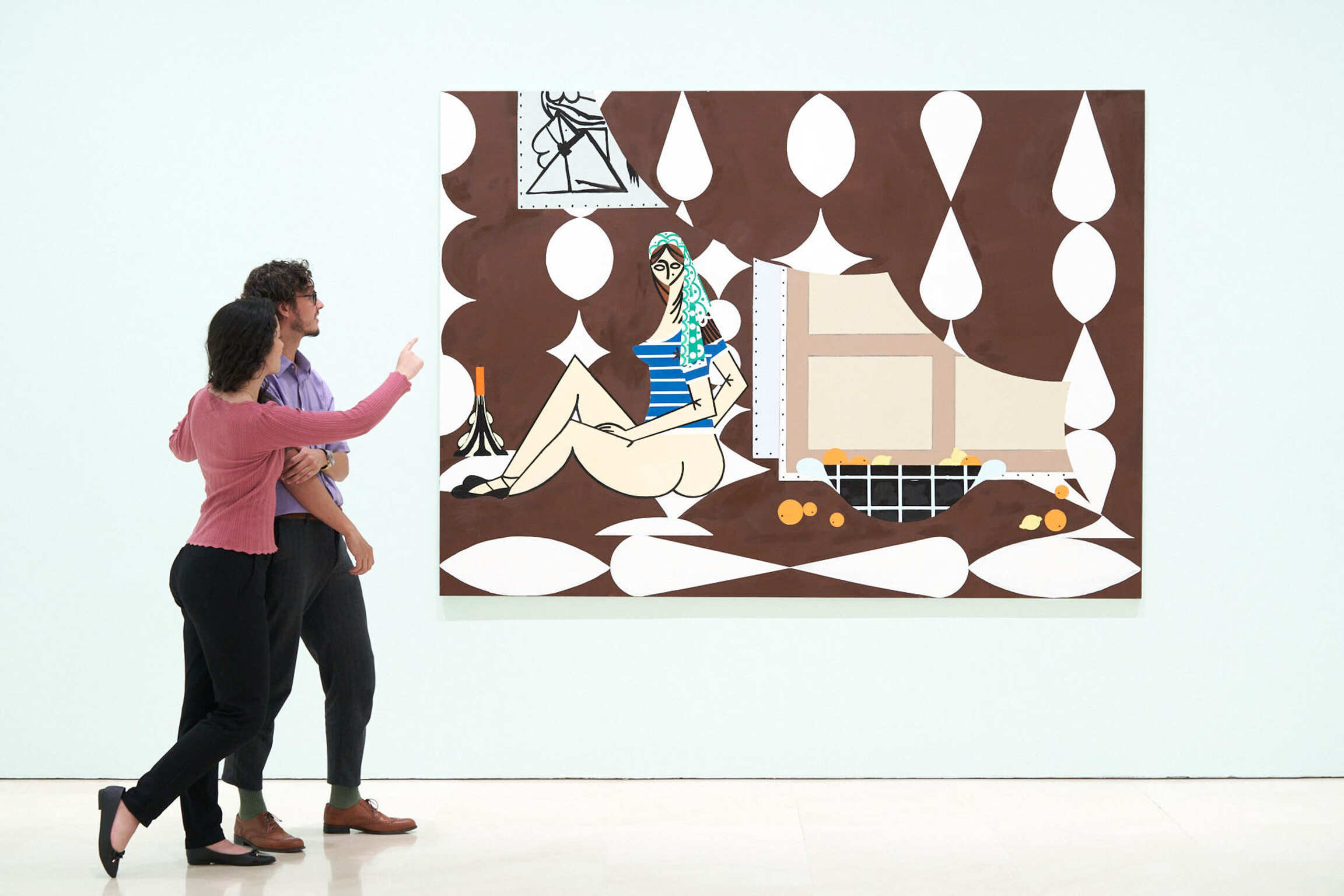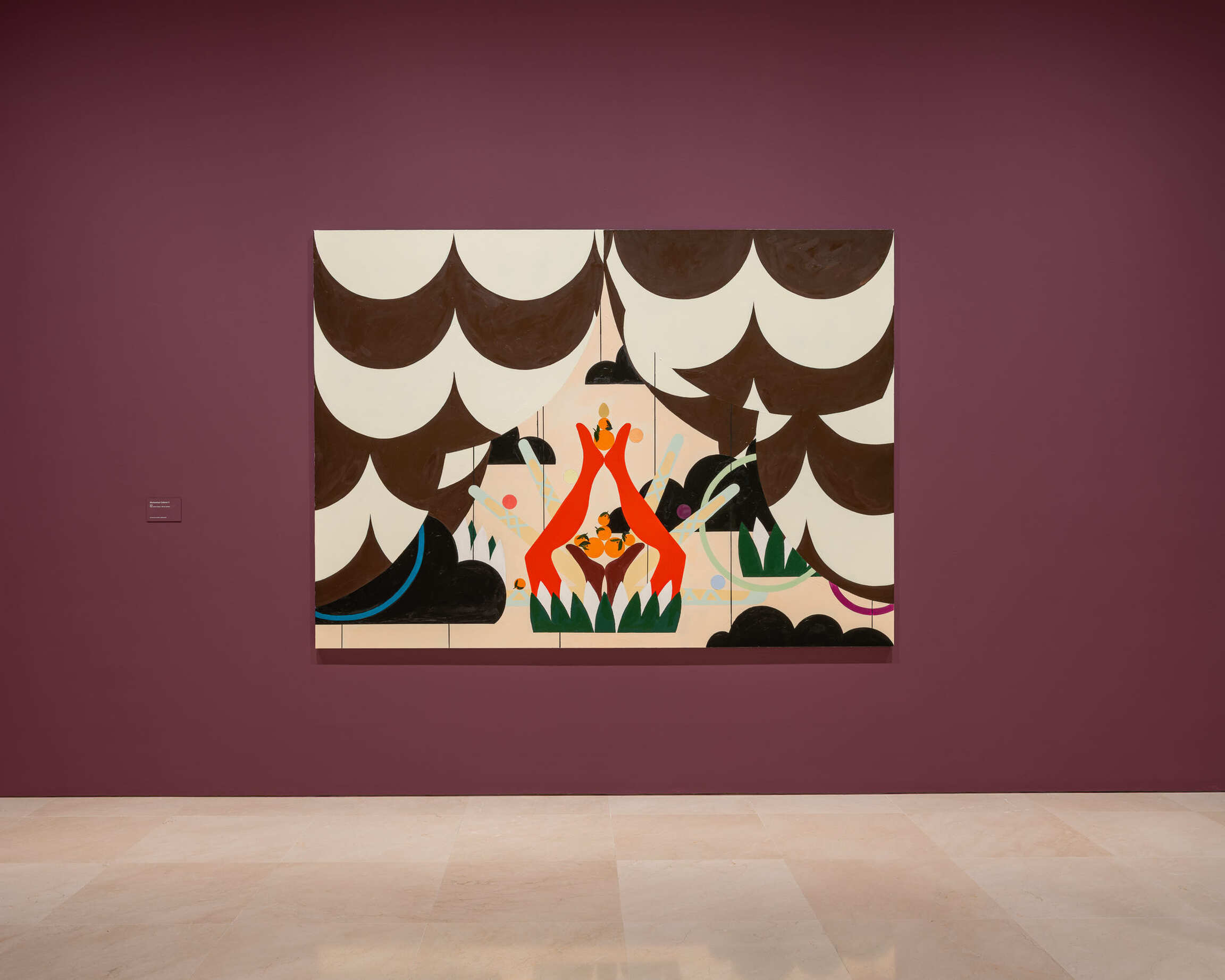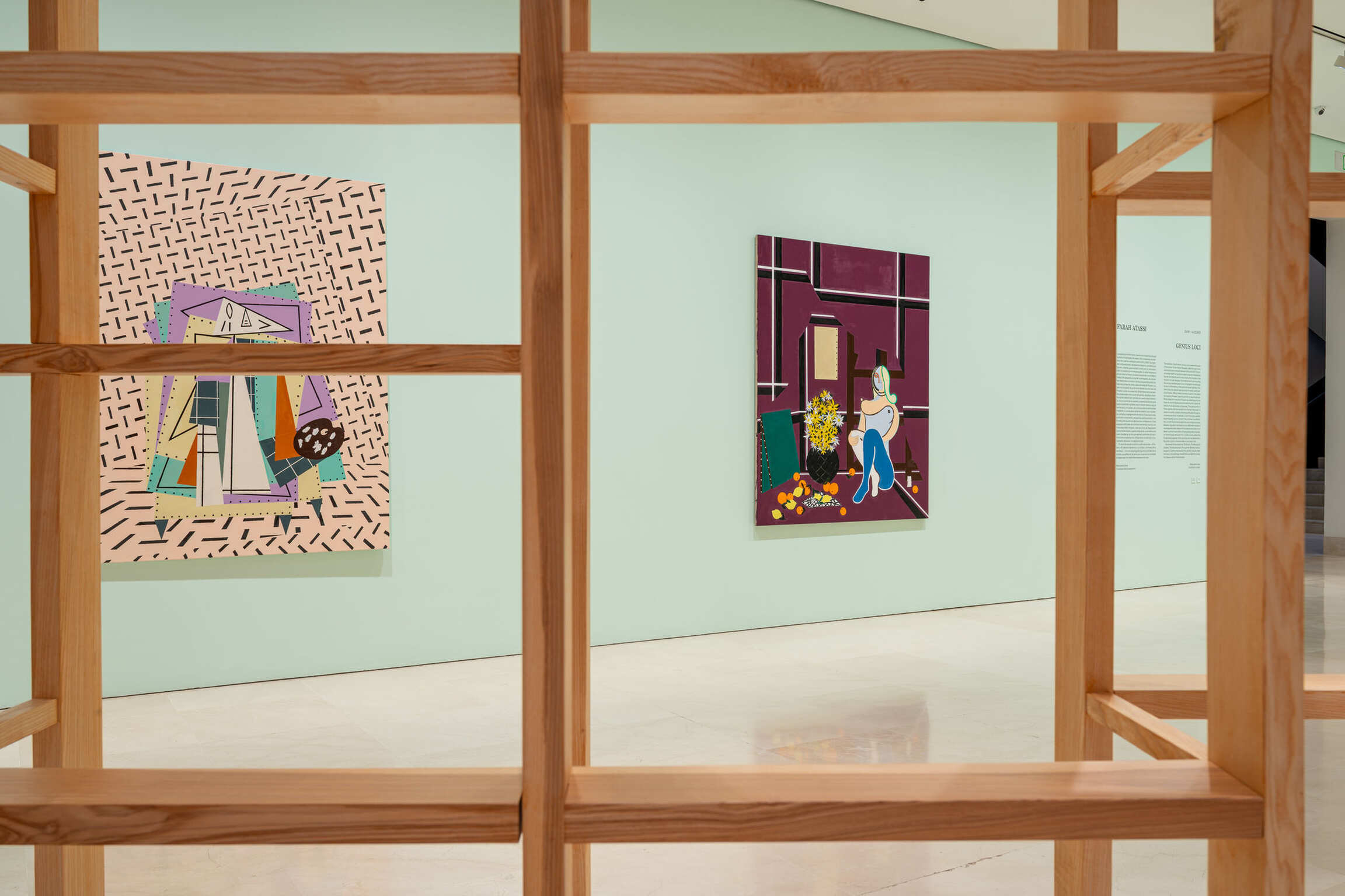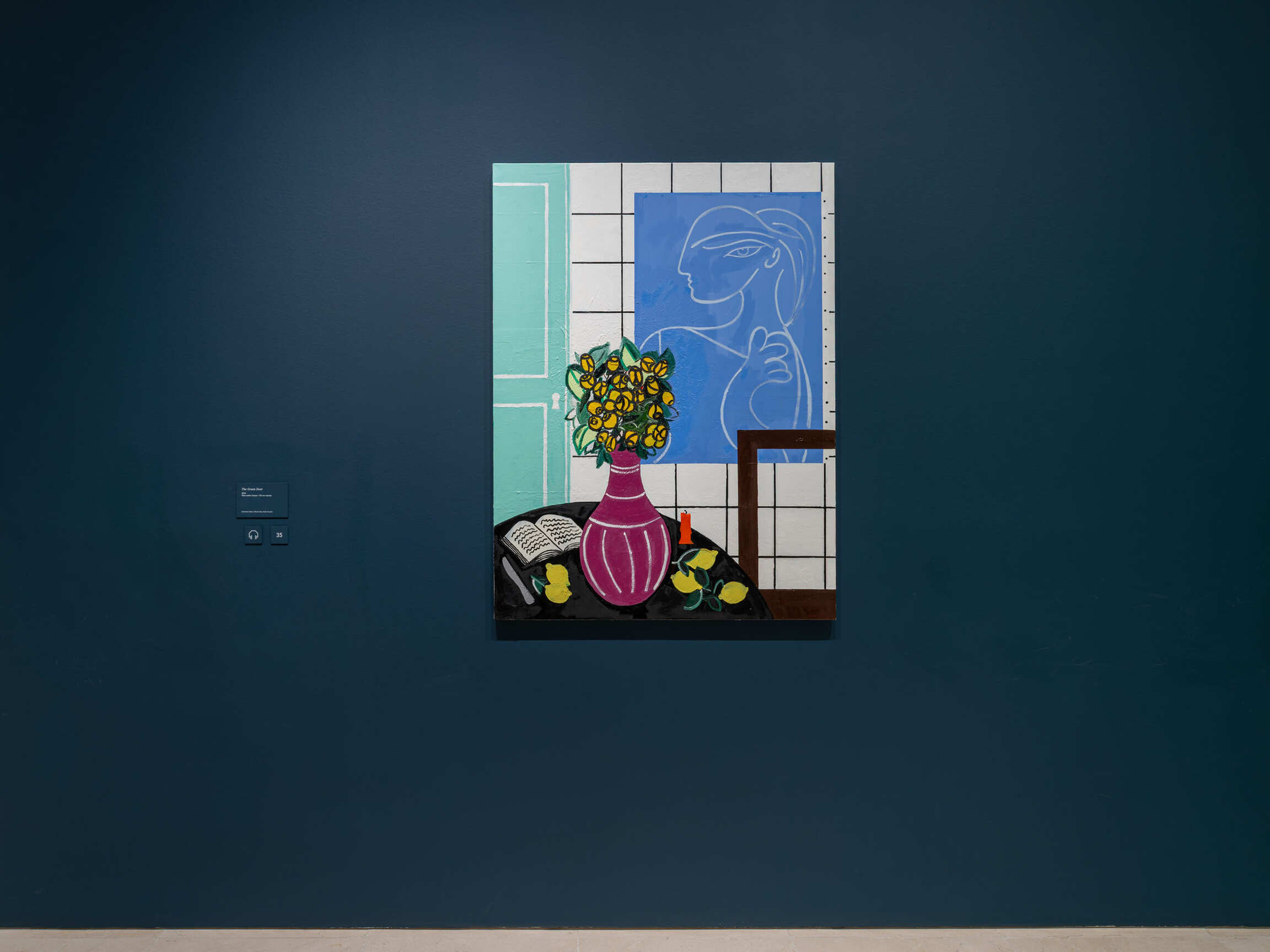 The exhibition is divided into four sections. It starts in The studio, a theme chosen by the artist as a reflective space in relation to the conventions of painting. Female models are seen resting alongside empty stretchers and unpainted canvases in works that feature the characteristic grid with which Atassi balances many of her canvases. The works in The mechanical cabaret depict female bodies in motion in a synchronised choreography of legs, hoops and balls. The section The shore includes exterior scenes of bathers sunbathing on a beach represented by solid horizontal colours evoking blue sky, turquoise sea and beige sand. Finally, in Through the window the canvases show the female figures surrounded by flowers and fruit next to windows looking onto cloudy skies and starry nights. The works present in Genius Loci, which often seem to be constructed in the manner of an architectural form, are not seeking a faithful reproduction of reality: the precise lines and the objects represented seem to belong to a parallel world where time has stopped, arousing a sense of mystery in the viewer.