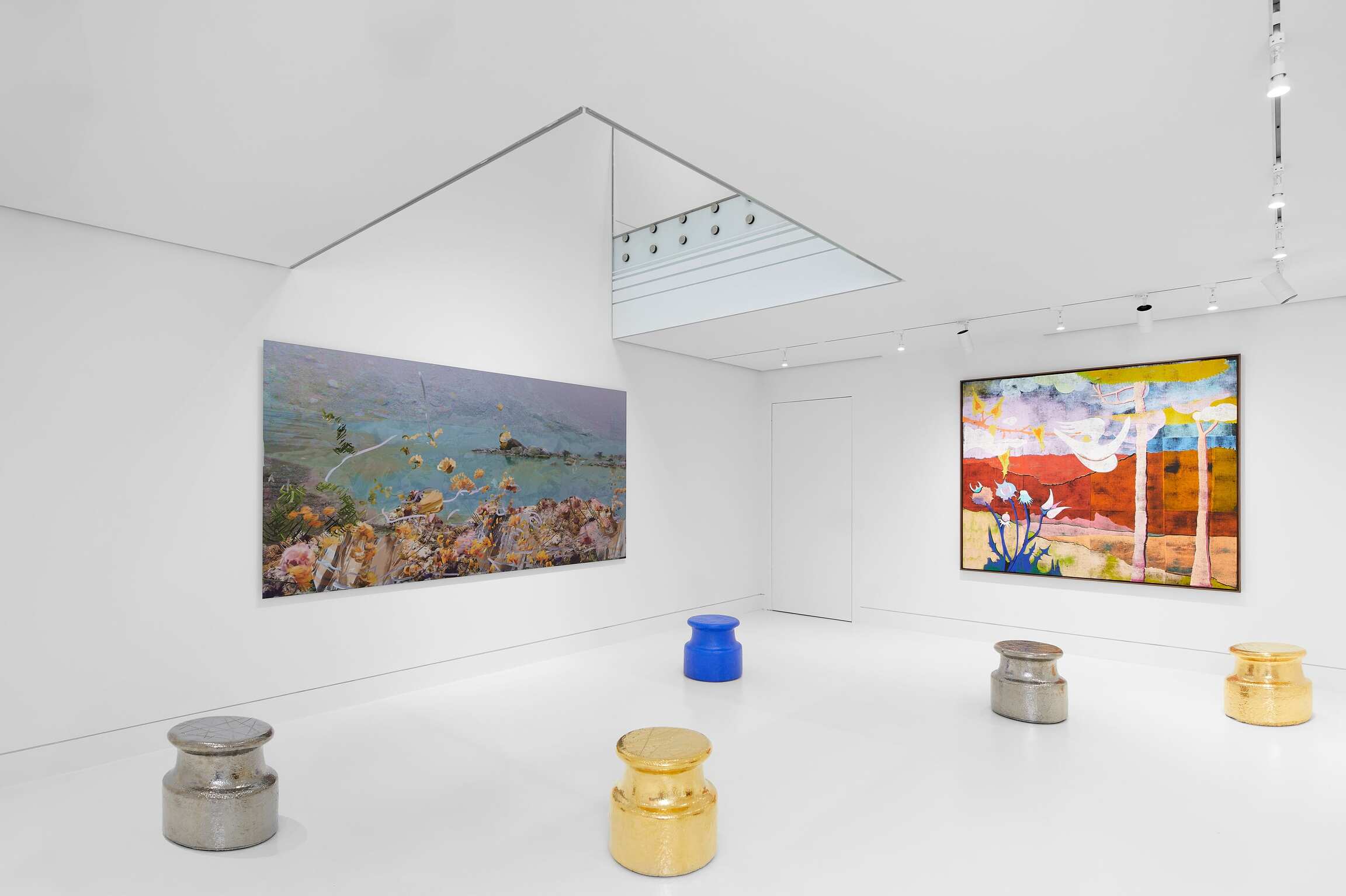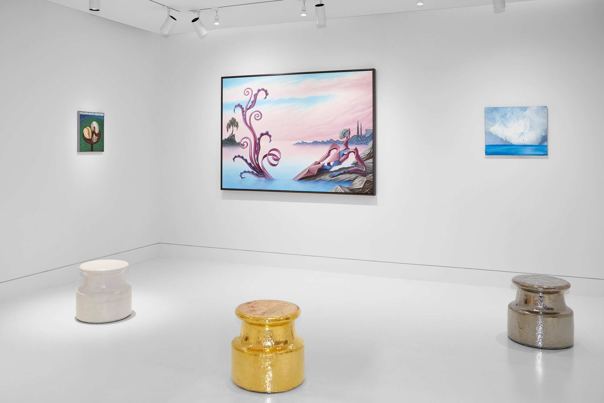 Chez Genieve Figgis, la référence historique est omniprésente. Reprenant à son compte les compositions de peintures de cour du XVIIIe siècle qui visent à célébrer le pouvoir de la noblesse et des souverains européens, elle en renverse le propos grâce à la générosité de sa matière picturale. Les tourbillons et les coulures, la schématisation des formes, l’hébétude carnavalesque des personnages concourent à souligner la mascarade grotesque du pouvoir, tout en replaçant le décor naturel au niveau des personnages. La place laissée au hasard dans la pratique de Figgis ouvre la porte à une interrogation des mystères de la matière, de l’existence humaine et des relations sociales. Ce dernier enjeu traverse également la série des Points d’observation de Johan Creten : à mi-chemin entre le socle et le tabouret, ils invitent le spectateur à se placer dans la double posture d’oeuvre et de regardeur. Disséminés à travers l’exposition, ils créent des réseaux relationnels, explorent les dynamiques sociales et nous poussent à interroger nos manières de voir.5