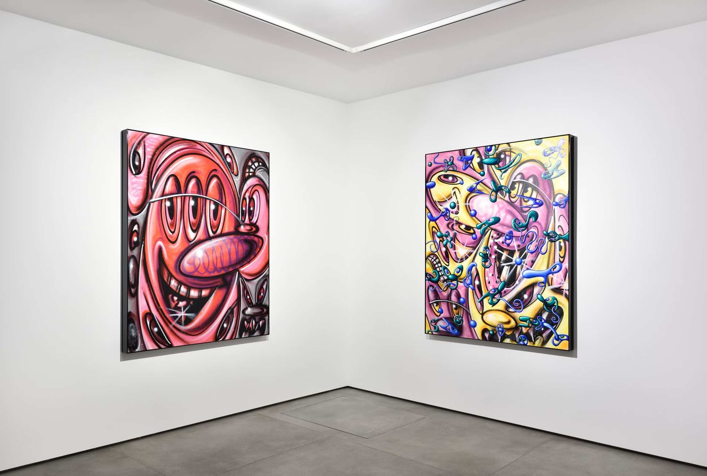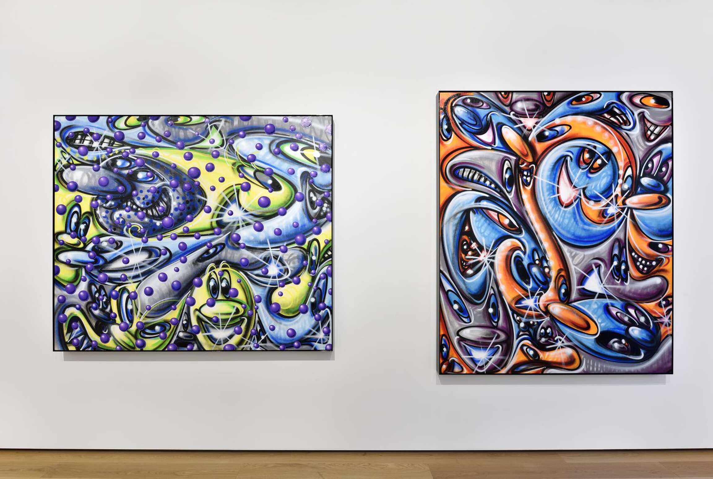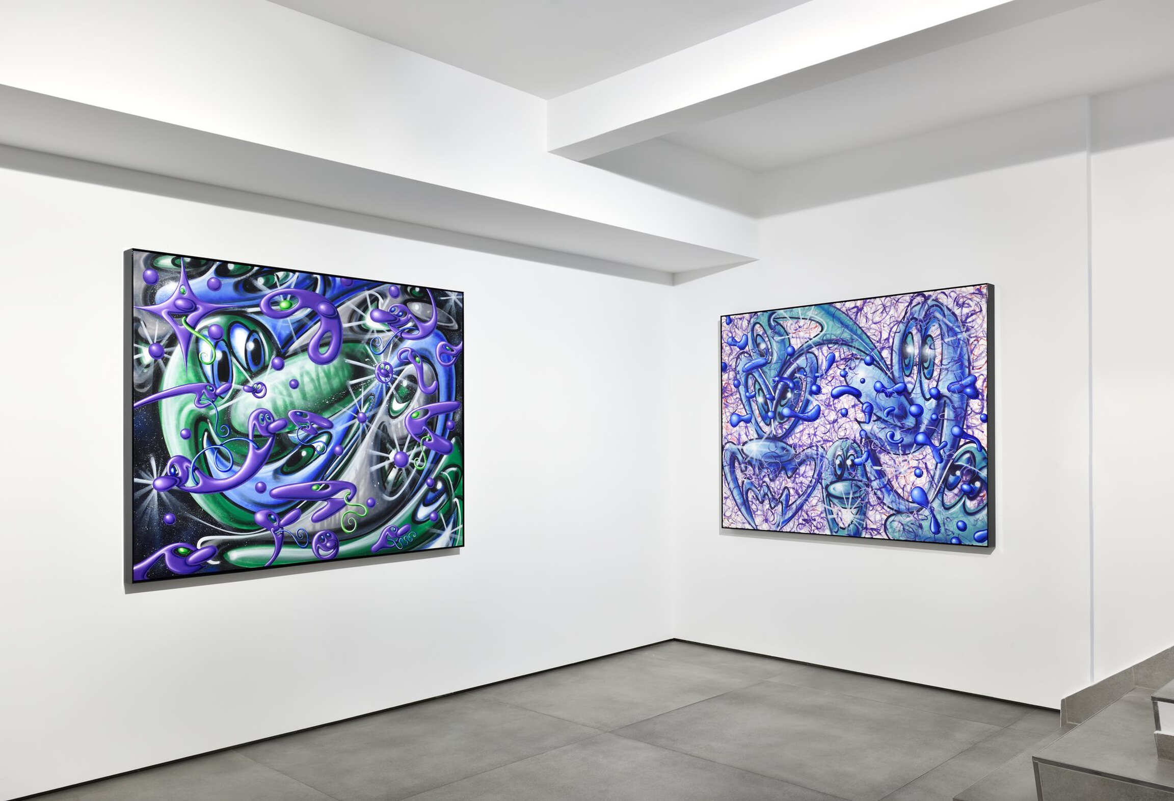 Dû au contexte sanitaire mondial, Kenny Scharf ne verra pas son deuxième solo-show à la Galerie Almine Rech. Pour autant, tandis qu’il continue à produire des pièces dans son atelier de Los Angeles au cœur du mois de décembre, il se réjouit de la primeur qui se dégagera de ses peintures. « C’est toujours très excitant pour moi de montrer un travail si récent, débute-t-il, et malgré mon absence, les visiteurs seront témoin de cette nouveauté. » Depuis le début des années 1980, Kenny Scharf produit beaucoup et adore ce temps passé face à son œuvre où, sans songer à des sujets préalables ou des narrations resserrées, il développe un vocabulaire dans lequel se marie l’influence des comics des années 1960 - notamment les Pierrafeu ou les Jetsons – à des formes, parfois psychédéliques, qui peuvent être assimilées à des cellules, bactéries, voire virus. Une interprétation dotée d’une nouvelle acuité dans notre époque particulière. Lors de sa première présentation à la Galerie Almine Rech, qui eut lieu à New York en septembre et octobre 2020, la critique d’art Linda Yablonsky avait fait le parallèle entre les années Covid et les années Sida. À l'époque, Kenny Scharf partageait avec Keith Haring un appartement dans lequel Jean-Michel Basquiat les rejoignait souvent. Il s'en souvient comme d’un lieu de rassemblement des énergies, d’un jeu de ping-pong d'idées, avant la perte de ses amis... Face aux tragédies, il décide qu’il montrera de la vie principalement le côté virevoltant, enrichi de couleurs vives. Qu’elles soient cathartiques, une prolongation des moments d’extase ou de temps plus maussades, les toiles reçoivent ses humeurs.