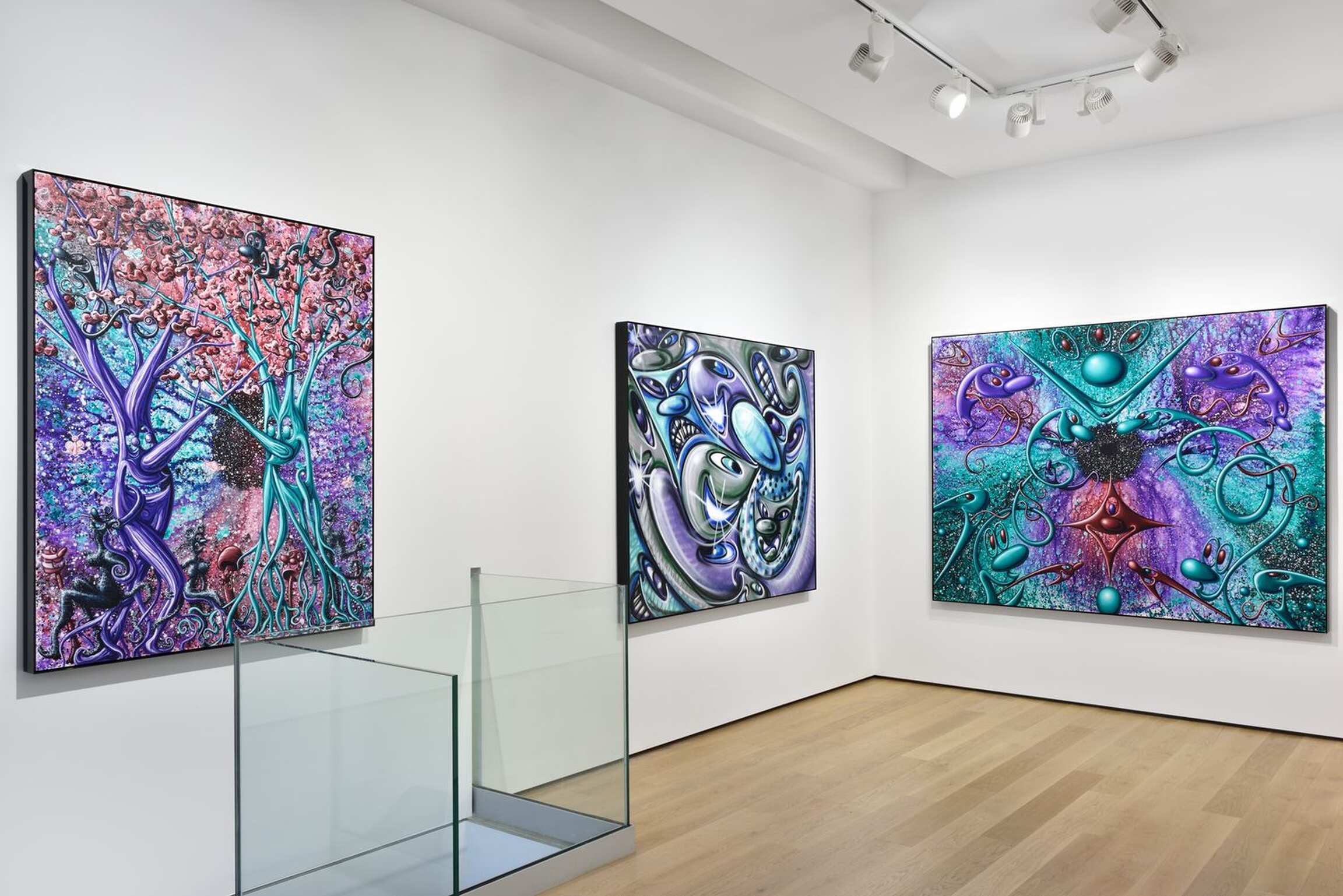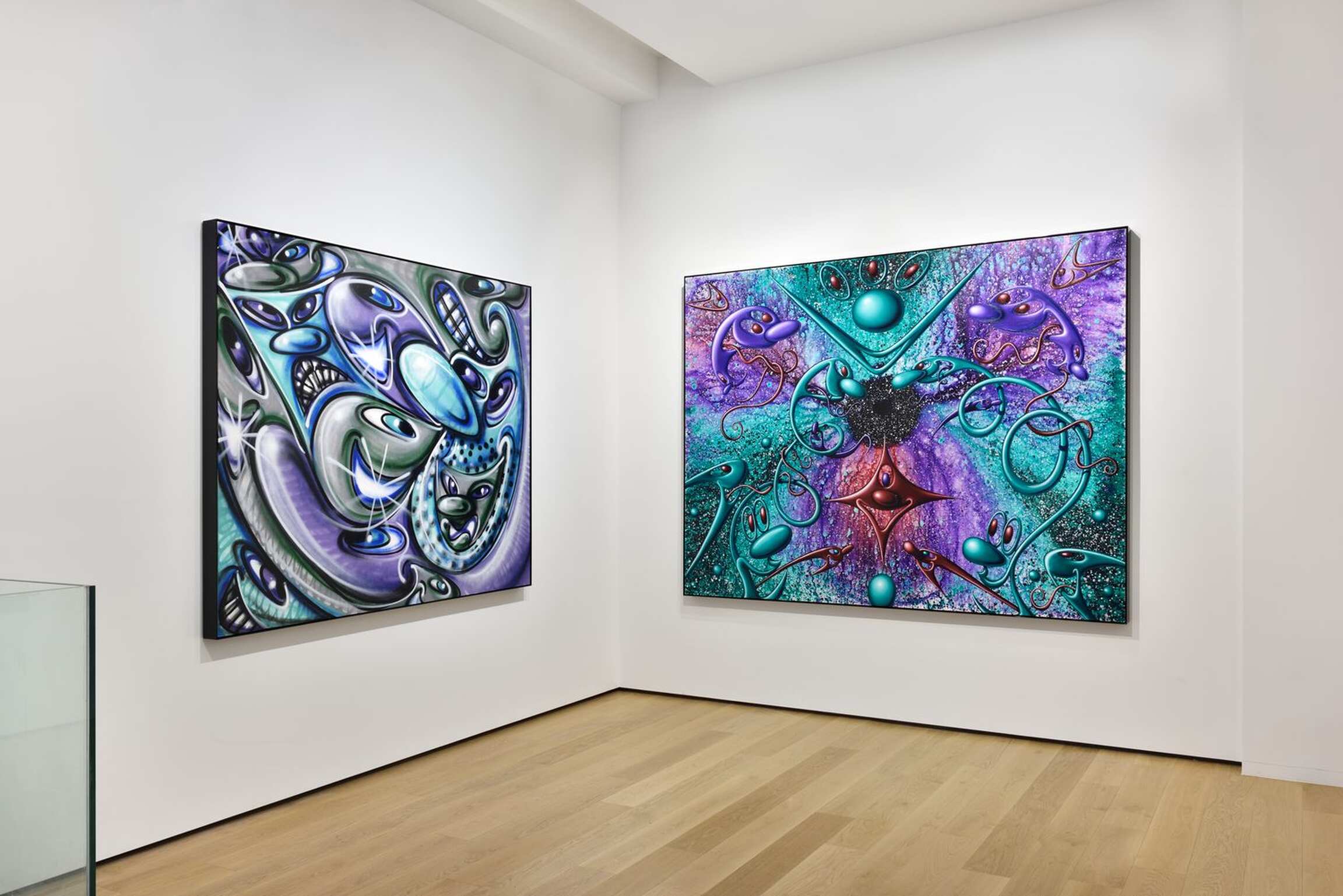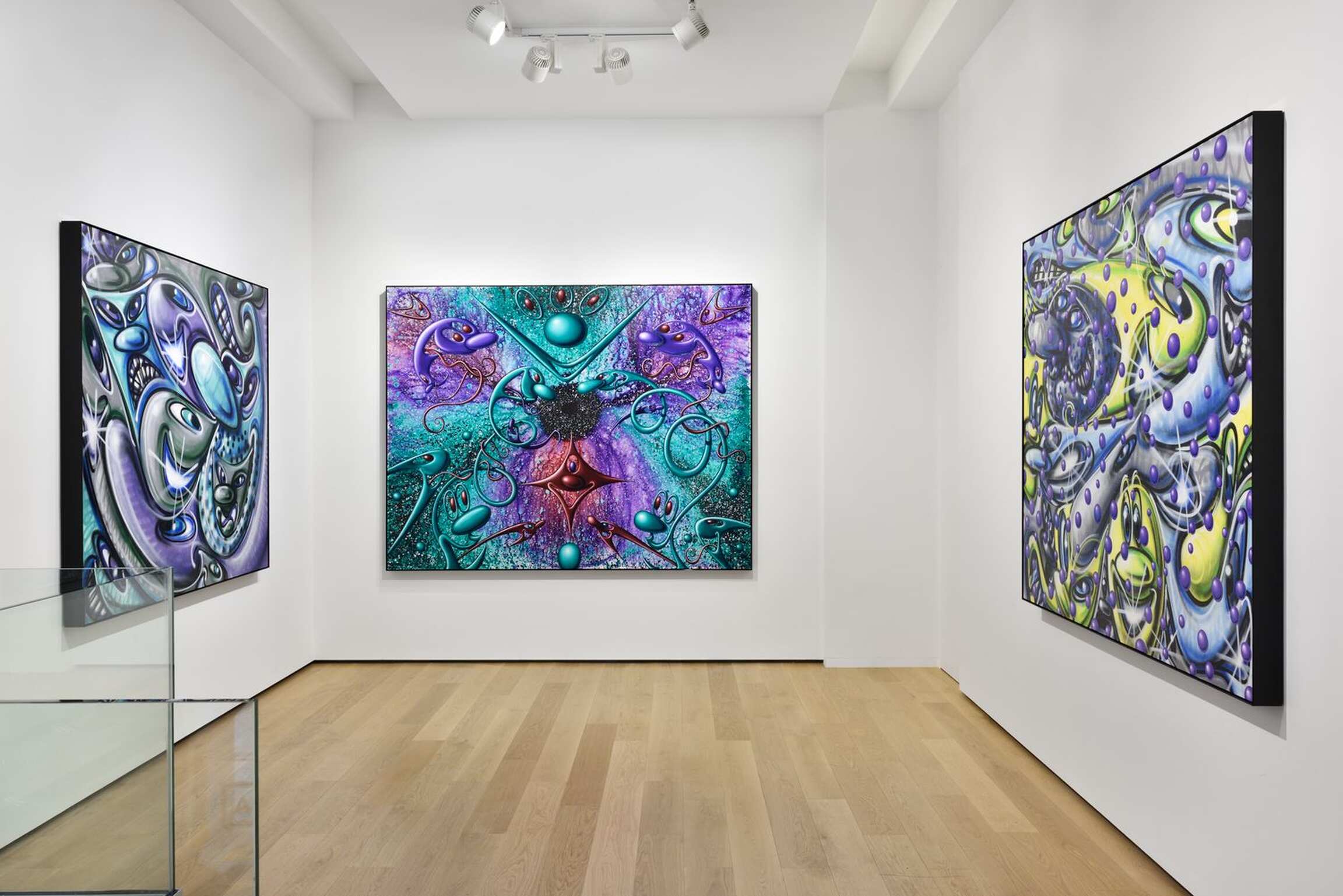 Dû au contexte sanitaire mondial, Kenny Scharf ne verra pas son deuxième solo-show à la Galerie Almine Rech. Pour autant, tandis qu’il continue à produire des pièces dans son atelier de Los Angeles au cœur du mois de décembre, il se réjouit de la primeur qui se dégagera de ses peintures. « C’est toujours très excitant pour moi de montrer un travail si récent, débute-t-il, et malgré mon absence, les visiteurs seront témoin de cette nouveauté. » Depuis le début des années 1980, Kenny Scharf produit beaucoup et adore ce temps passé face à son œuvre où, sans songer à des sujets préalables ou des narrations resserrées, il développe un vocabulaire dans lequel se marie l’influence des comics des années 1960 - notamment les Pierrafeu ou les Jetsons – à des formes, parfois psychédéliques, qui peuvent être assimilées à des cellules, bactéries, voire virus. Une interprétation dotée d’une nouvelle acuité dans notre époque particulière. Lors de sa première présentation à la Galerie Almine Rech, qui eut lieu à New York en septembre et octobre 2020, la critique d’art Linda Yablonsky avait fait le parallèle entre les années Covid et les années Sida. À l'époque, Kenny Scharf partageait avec Keith Haring un appartement dans lequel Jean-Michel Basquiat les rejoignait souvent. Il s'en souvient comme d’un lieu de rassemblement des énergies, d’un jeu de ping-pong d'idées, avant la perte de ses amis... Face aux tragédies, il décide qu’il montrera de la vie principalement le côté virevoltant, enrichi de couleurs vives. Qu’elles soient cathartiques, une prolongation des moments d’extase ou de temps plus maussades, les toiles reçoivent ses humeurs.