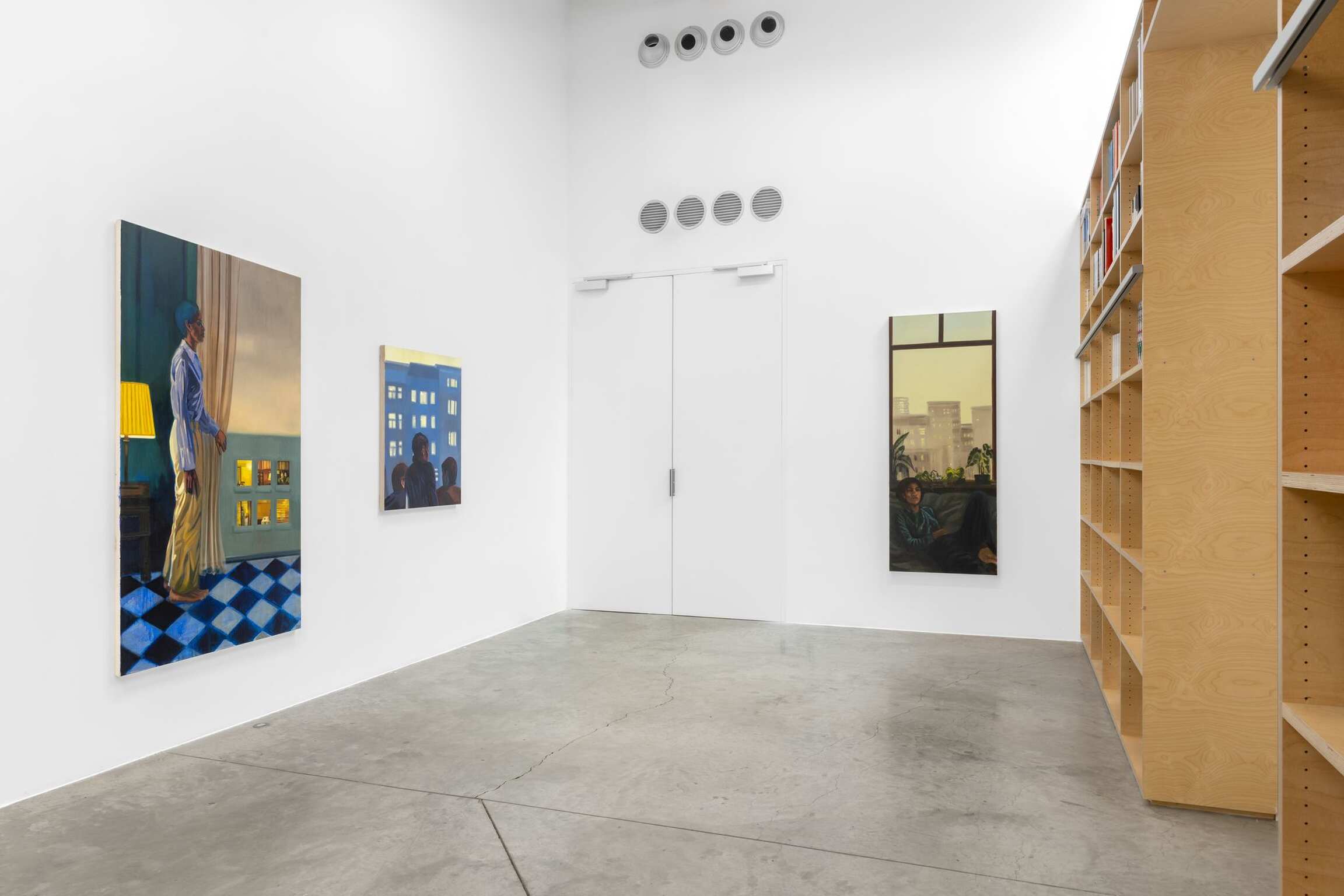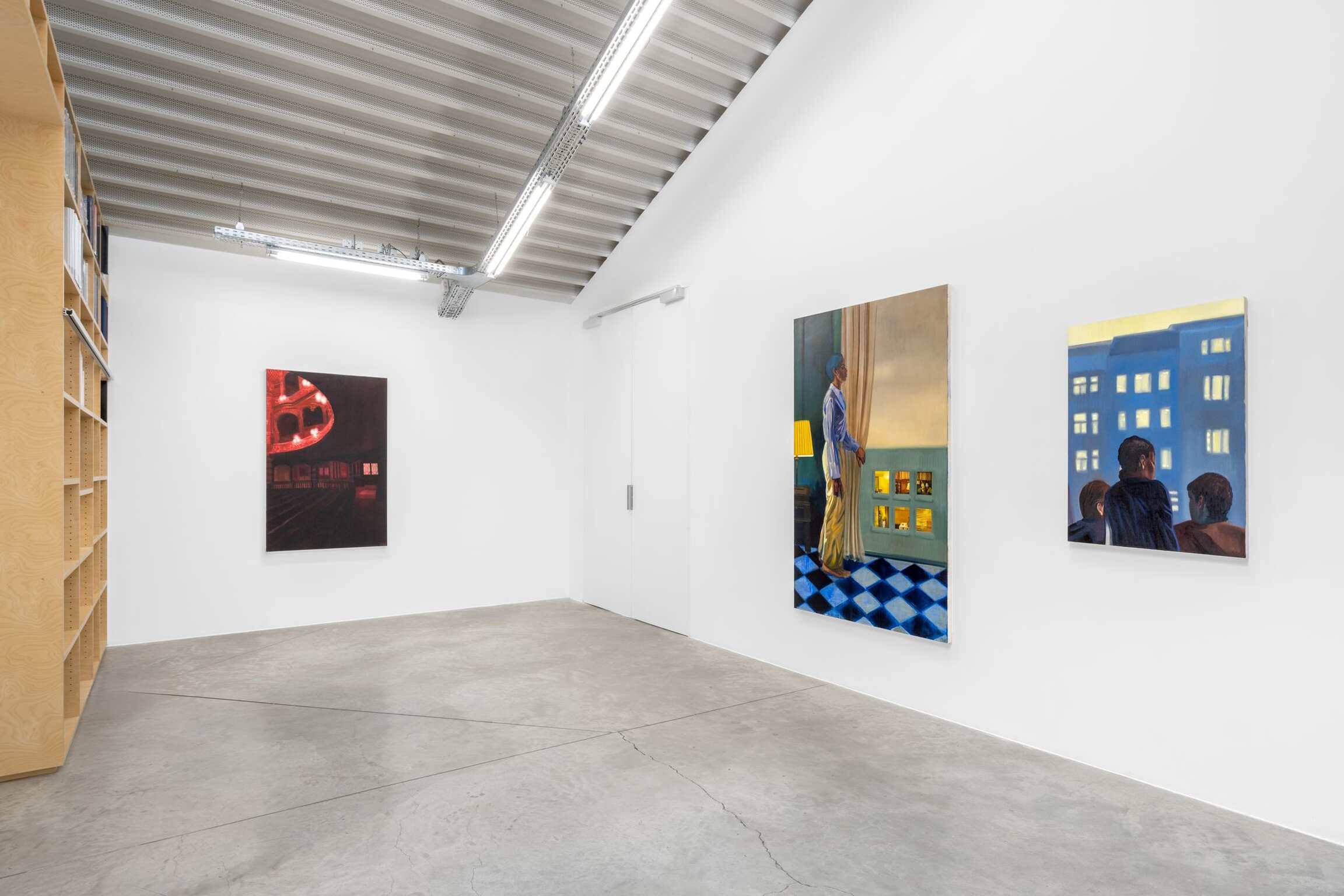 Above all, these works explore solitude, whether chosen or imposed. Nourishing Loneliness taps into the intrigue of the everyday. A figure pulls back a curtain, theatrically revealing six small vignettes of life, inviting us to be voyeurs. Featuring windows within windows, the painting is a Russian doll, demanding long contemplation. The artist uses her palette to inform the emotional content of the scene, as well as a juxtaposition of natural and artificial light. In The Balcony we are once again looking out into an anonymous city, wondering what could be happening behind each glimmering window. Are the three figures looking into the windows, or at each other? The artist does not see these paintings as portraits, Philips eschews the purely representational, reaching for composite figures she arranges like characters acting out a scene.