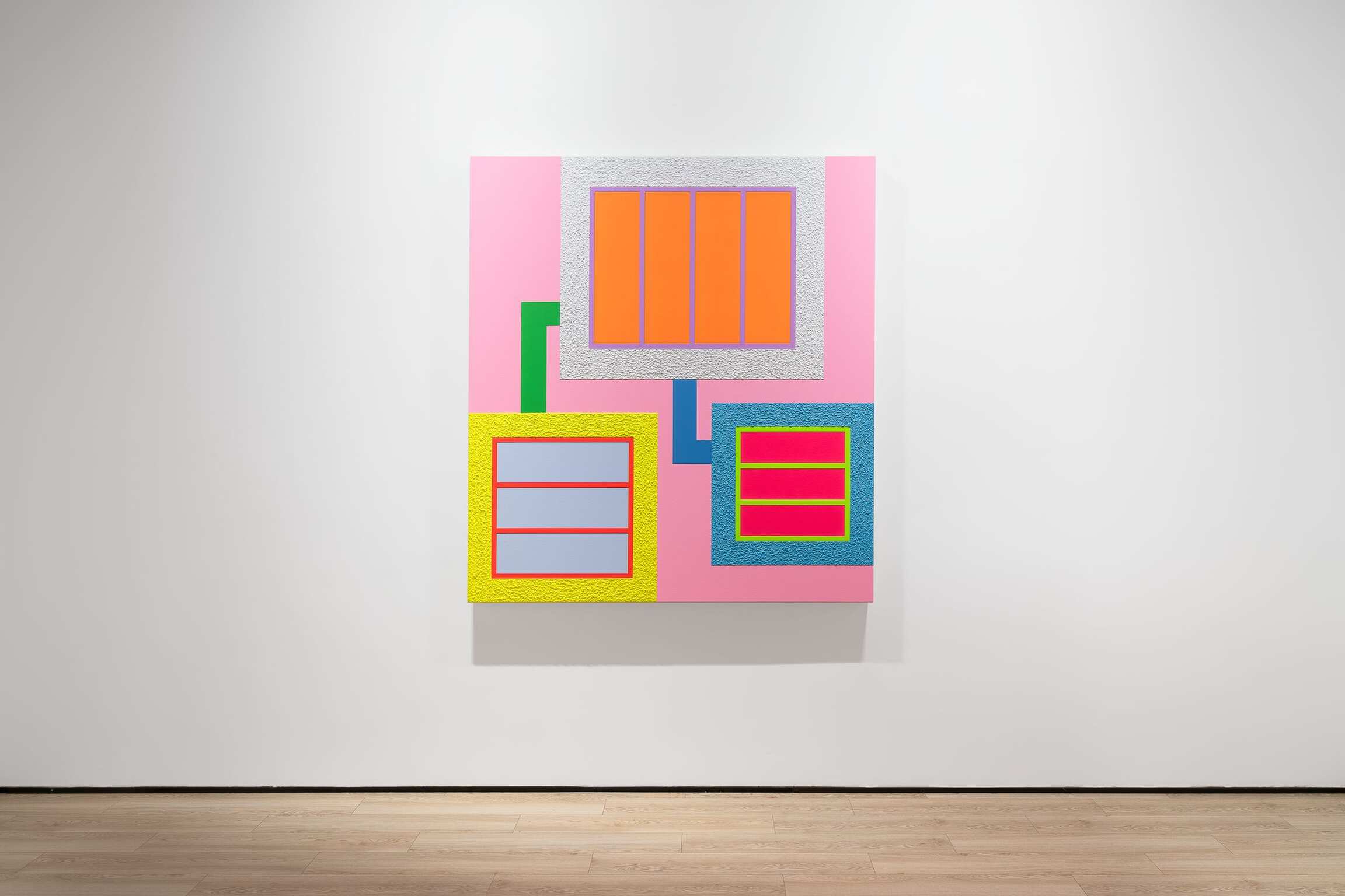 Overturning the dematerialization of conceptualism, “new conceptualism” reiterates the cycle of commodity fetishism found in institutional critique through re-materialization and popification -- what Krauss calls the “aesthetic object”, at the same time endowing the theory with connotations and symbolisms of religion and mythology, in the attempt to escape such a cycle. However, Halley isn’t as concerned with how to reproduce and escape this cyclical mechanism, as with asking, how could life remain life in a world that is increasingly formalized and structured, imbuing even more profound meaning into these three paintings created during the pandemic. They are telling us the neon pink and purple found in the paintings’ backgrounds, along with the neon red, yellow, blue, and green in the details, are no longer the features of a lustful city, but a declaration of love: only love can motivate life to be liberated from imperceptible imprisonment and isolation, allowing snippets of it to be connected together, and also conjure up the potentiality of life to become life again. As such, the titles of the three paintings -- Rushed, Law of Attraction, and Loveland -- in themselves serve as the best annotations.