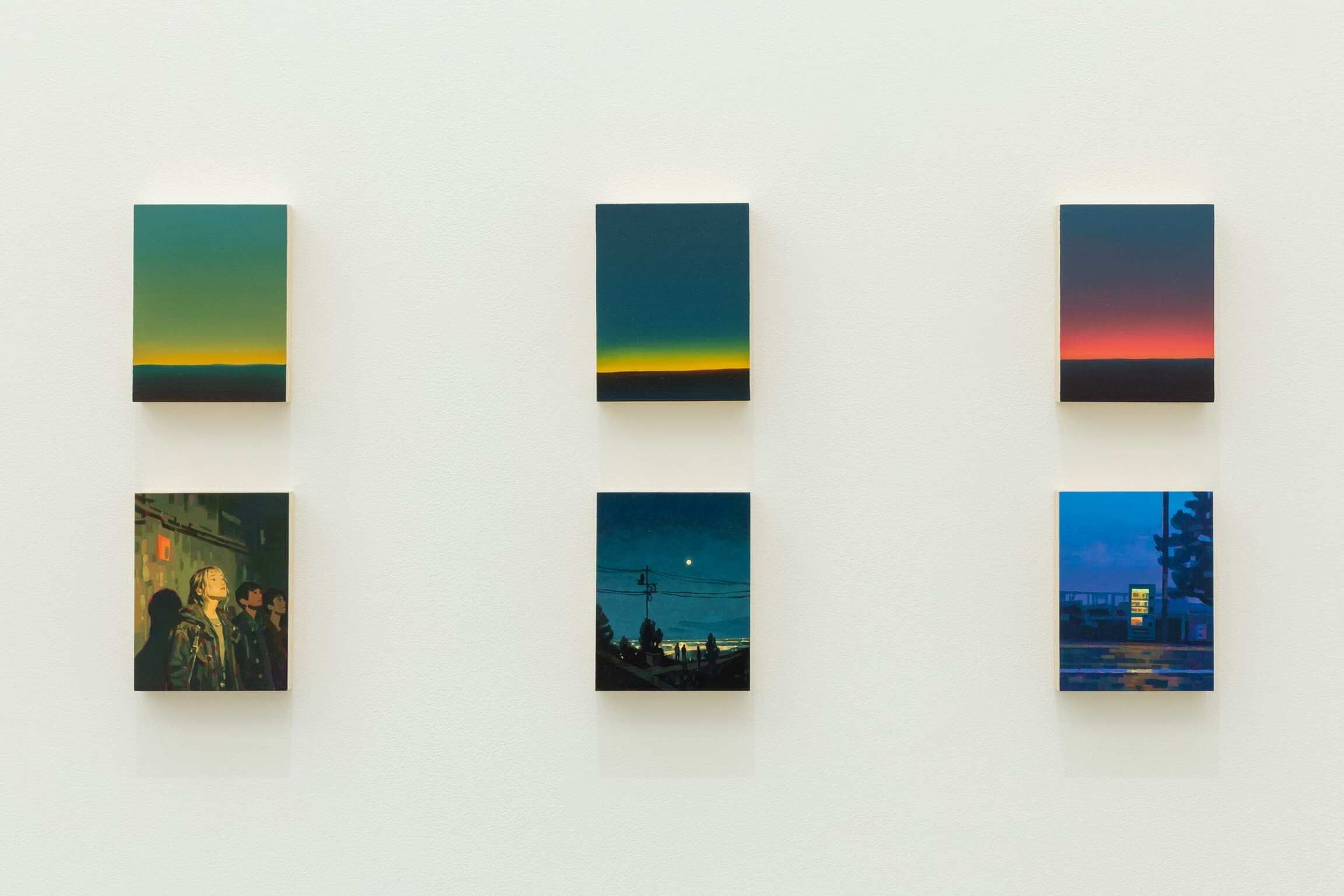 The motifs of Morimoto’s works are created from actual cityscapes he has shot and collages of people he has extracted from photos he has taken of people he knows. According to the artist, he seeks to incorporate a degree of randomness into this selection process. The resulting landscapes depict the loneliness of contemporary youth and reveal scenes of places that seem to be everywhere, but are in fact nowhere to be found.