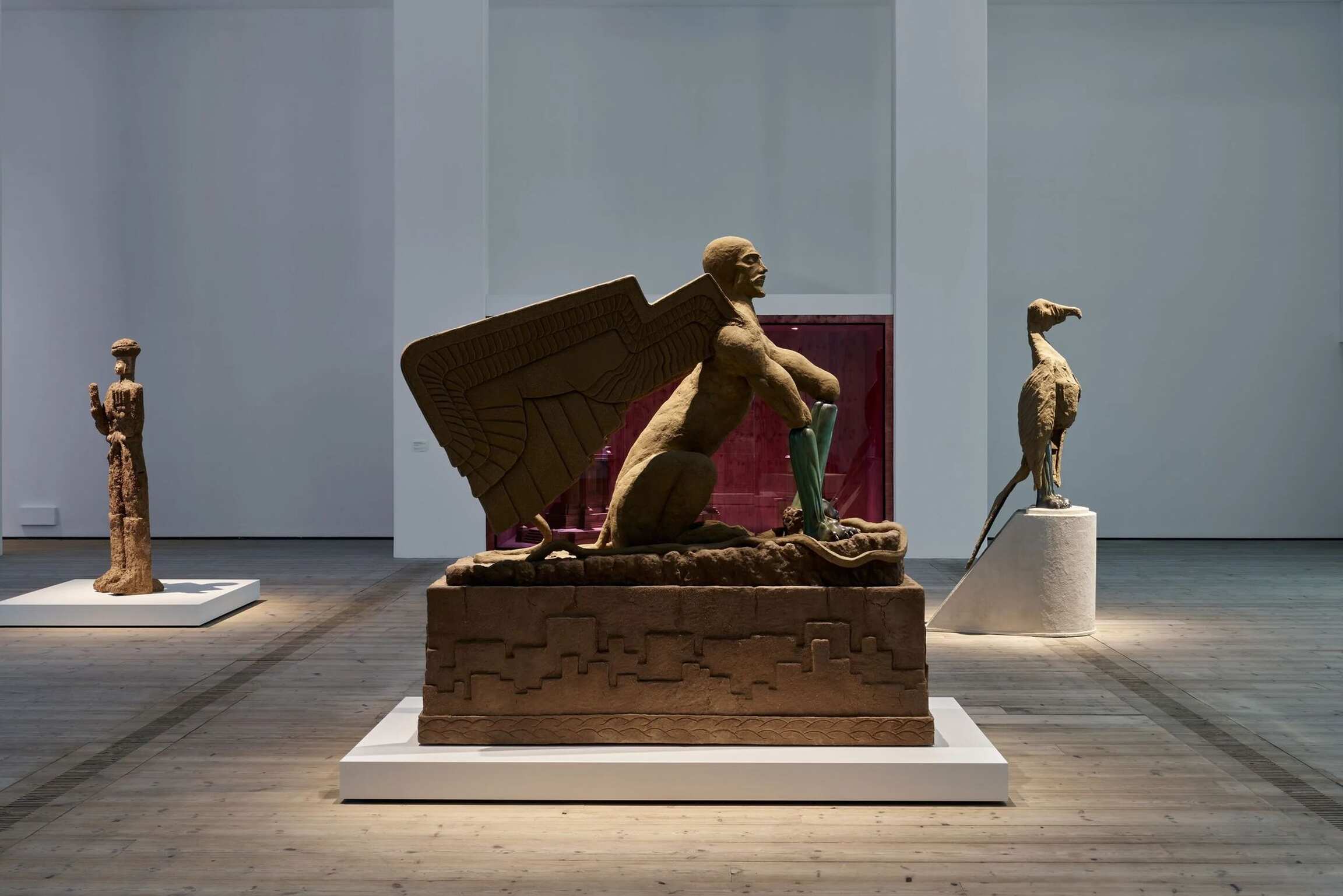 'How I Am Monument' showcases the artist's interests in process and materiality, looking at history and the ancient world through a material lens. The exhibition will present newly commissioned works including Sphinx (2024), a hybrid sculpture created from mud and bronze. Evoking Assyrian and Egyptian statues, a winged human/animal creature sits on its haunches, with exaggerated musculature and a serpent curling around its legs. However, unlike the monumental sculptures of ancient civilisations that exude permanence and strength, its body and plinth are made from mud - a humble and fragile material that Cherri frequently employs in his work - and its front limbs are balanced precariously on two bronze prostheses.