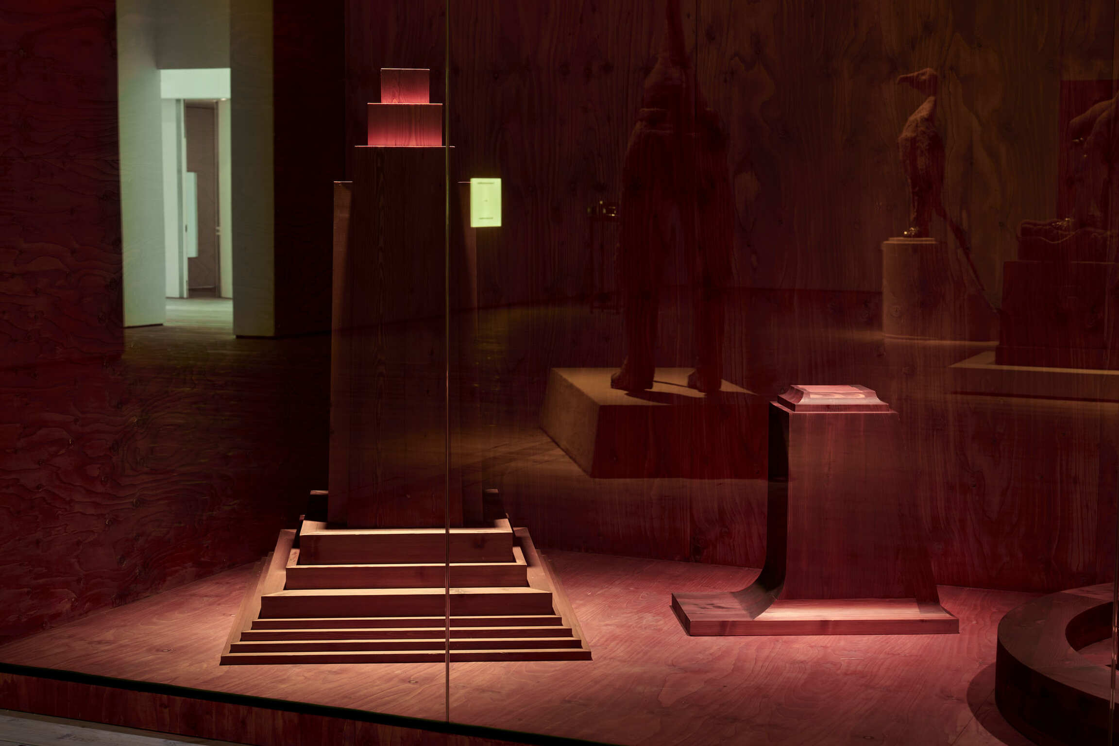 In the new work Toppled Monuments 1-6 (2024), wooden sculptures represent the empty plinths of monuments of deposed leaders or controversial historical figures. Displayed in large vitrines reminiscent of archaeological museums, the works reference statues of figures removed or damaged during the post-Soviet era, the Arab Spring, and the Black Lives Matter movement. The blank spaces left on the plinths invite us to imagine a better future.