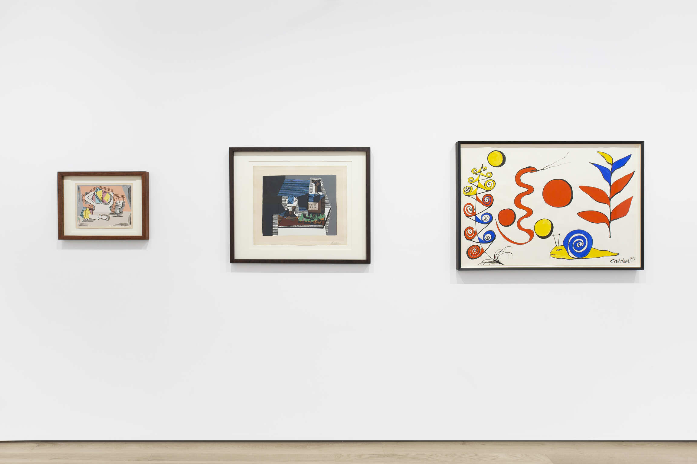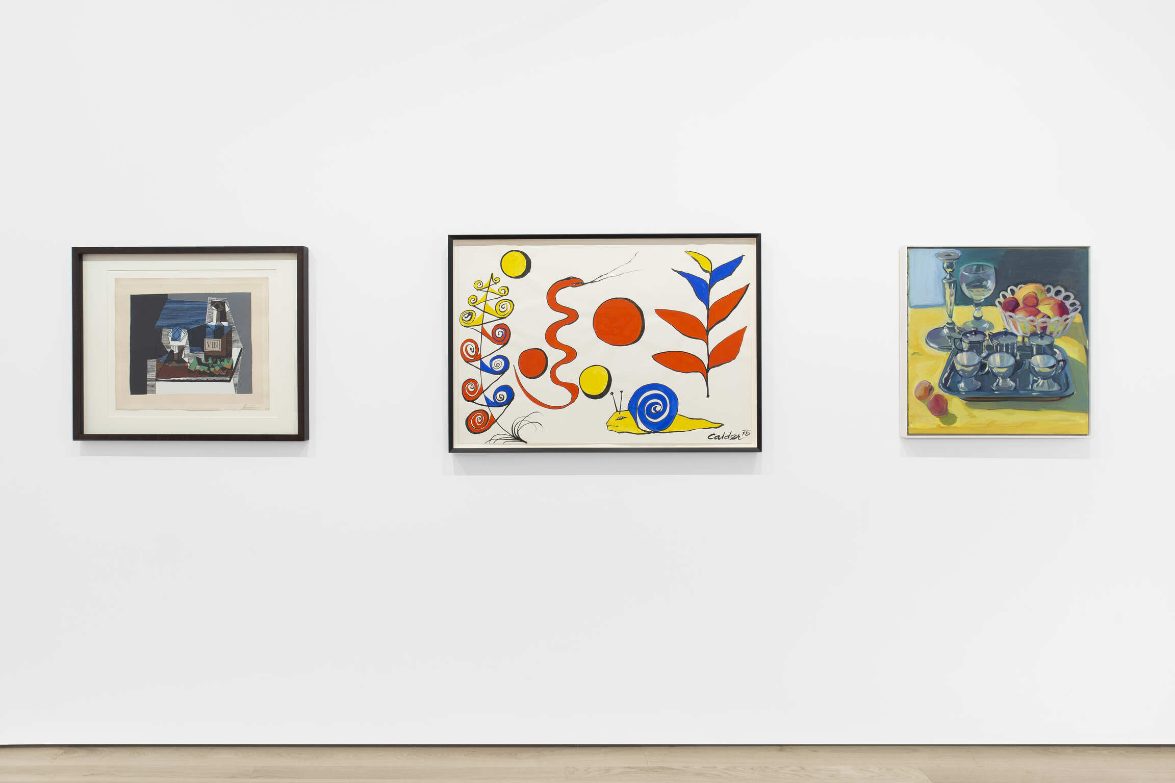 In an Untitled gouache from 1975, Alexander Calder does away with the convention of representing inanimate objects altogether, composing a nature morte that in fact teems with life. In his signature, bold, primary color scheme, Calder depicts and undulating snake and a wizened snail, framed on either side by wild flora. Gone too is the grounding influence of a table, upon which a still life’s objects are usually settled. Here, the flora and fauna hover in a liminal space. Spheres of red and yellow float amidst them, a suggestion of celestial bodies that tether the amorphous arrangement with their gravitational pull.