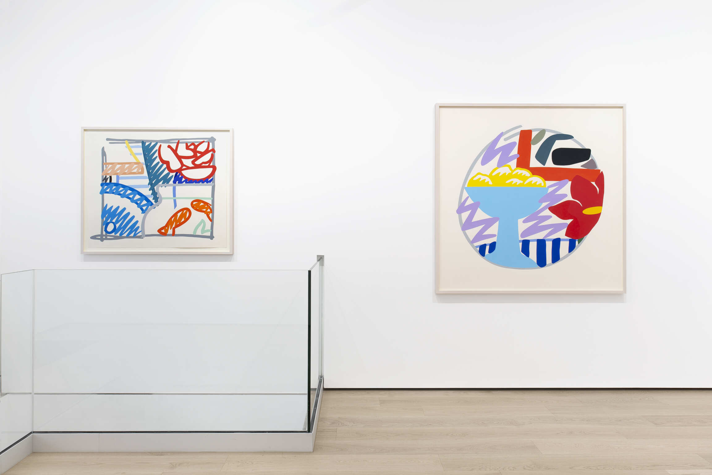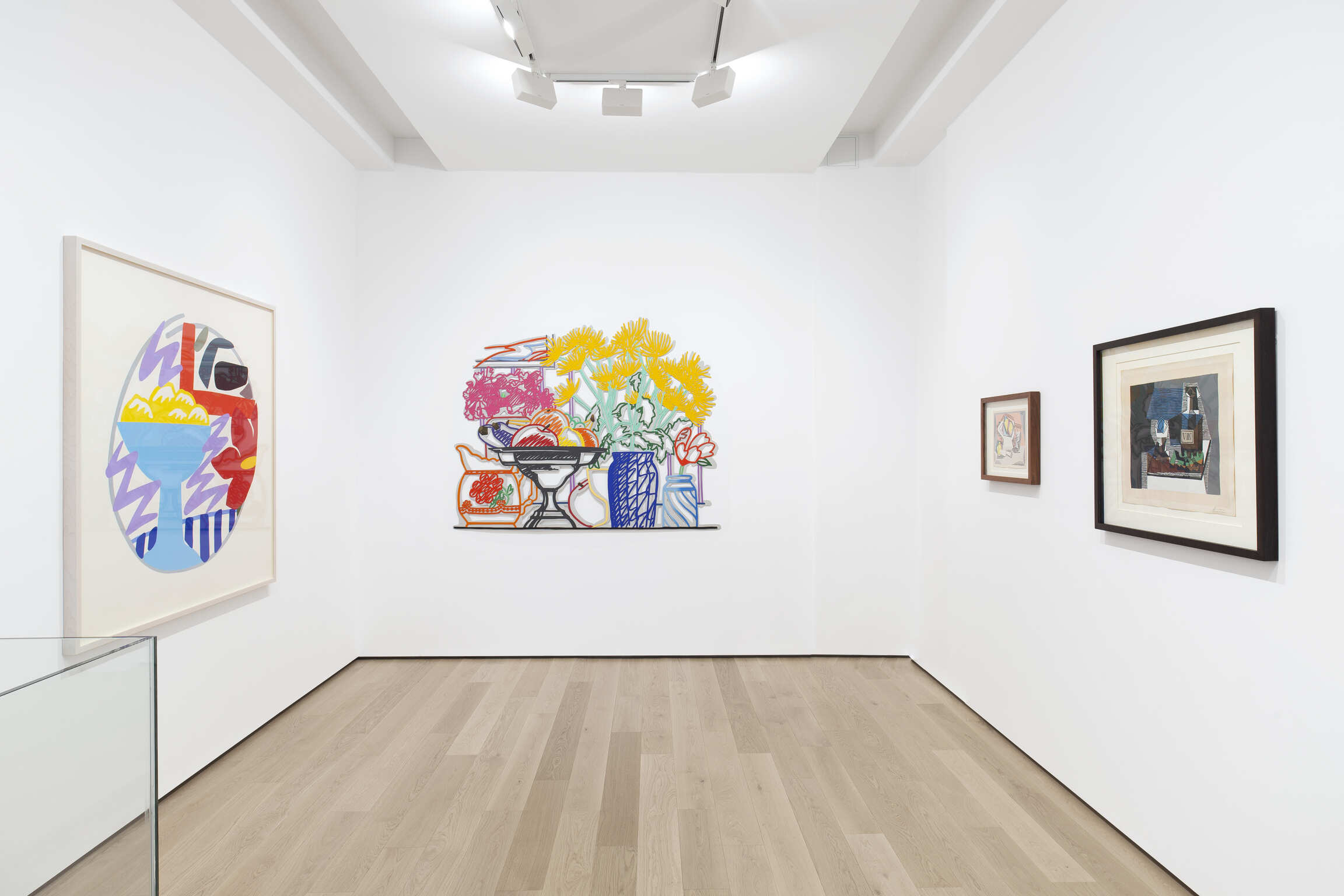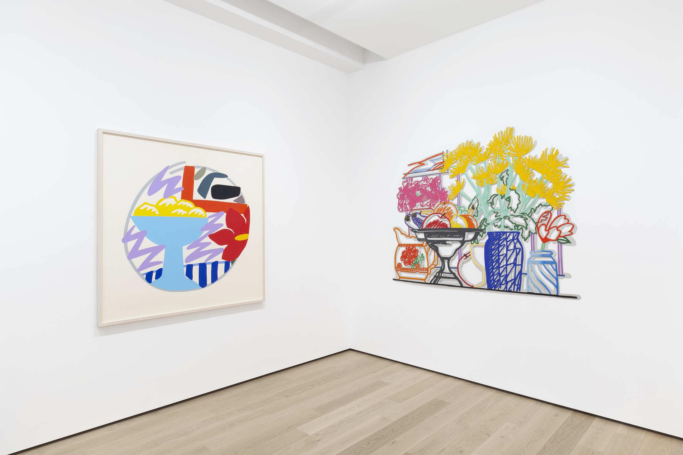 In three works from the 1980s, Tom Wesselmann lends his still life work his signature Pop sensibility. The concentrated arrangement of objects in Wesselmann’s Still Life with Fuji Chrysanthemums (Double Layer) (1985/92) indicates a psychological tension that is only underscored by the liquid brilliance of the artist’s materials. Using Alkyd paint, revered for its saturated colors, Wesselmann has painted onto cut steel, imbuing the work with an effect like neon lights. His two paintings on Bristol board, Still Life with Goldfish and Rose (1984) and Fast Sketch Still Life with Lemons (1988) embody a more open composition. In these two paintings, his choice of subject matter—both lemons and goldfish—nod to Henri Matisse, who included these items in many of his own still life paintings. In alluding to Matisse, the most prominent Post-Impressionist to subvert the genre a century before, Wesselmann’s work opens and expands the still life into even further possibilities.
