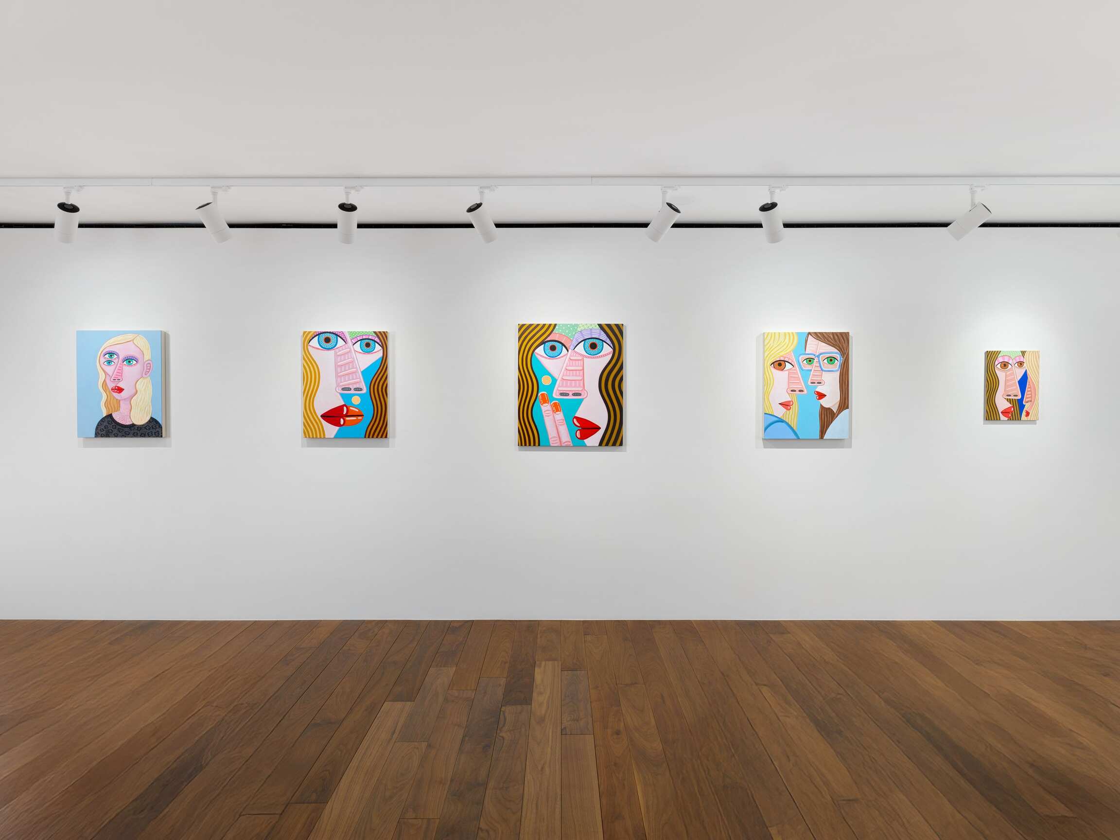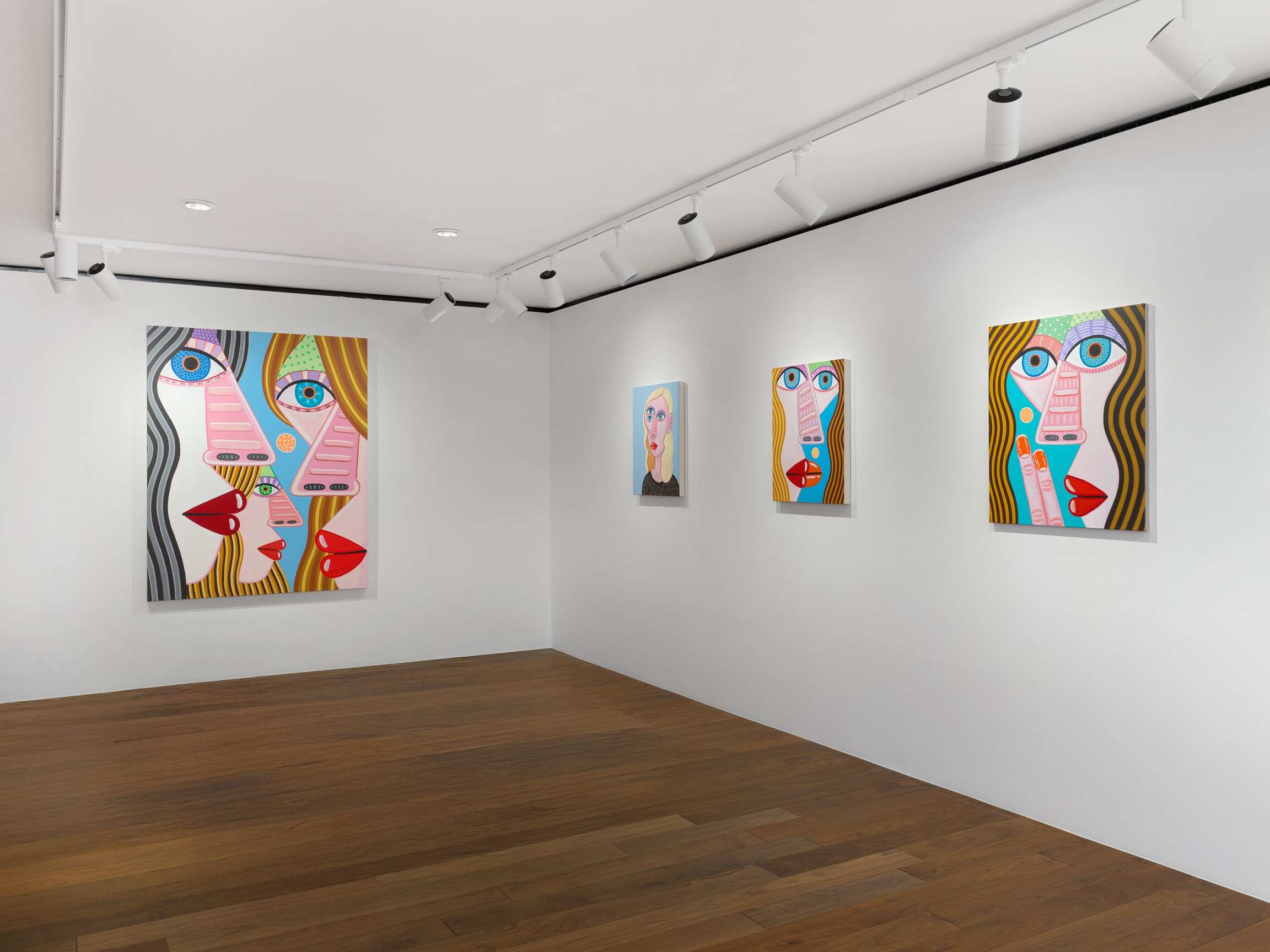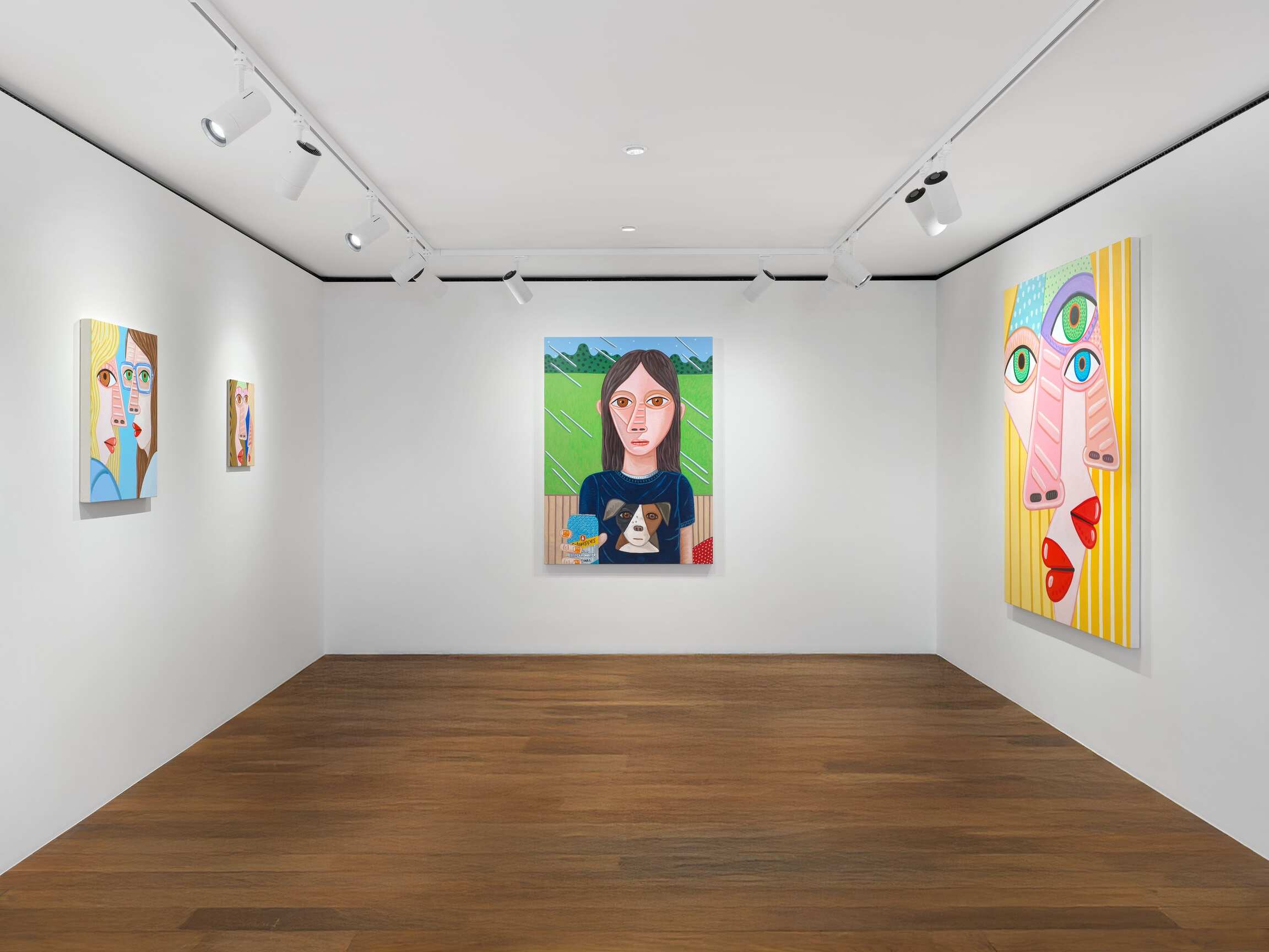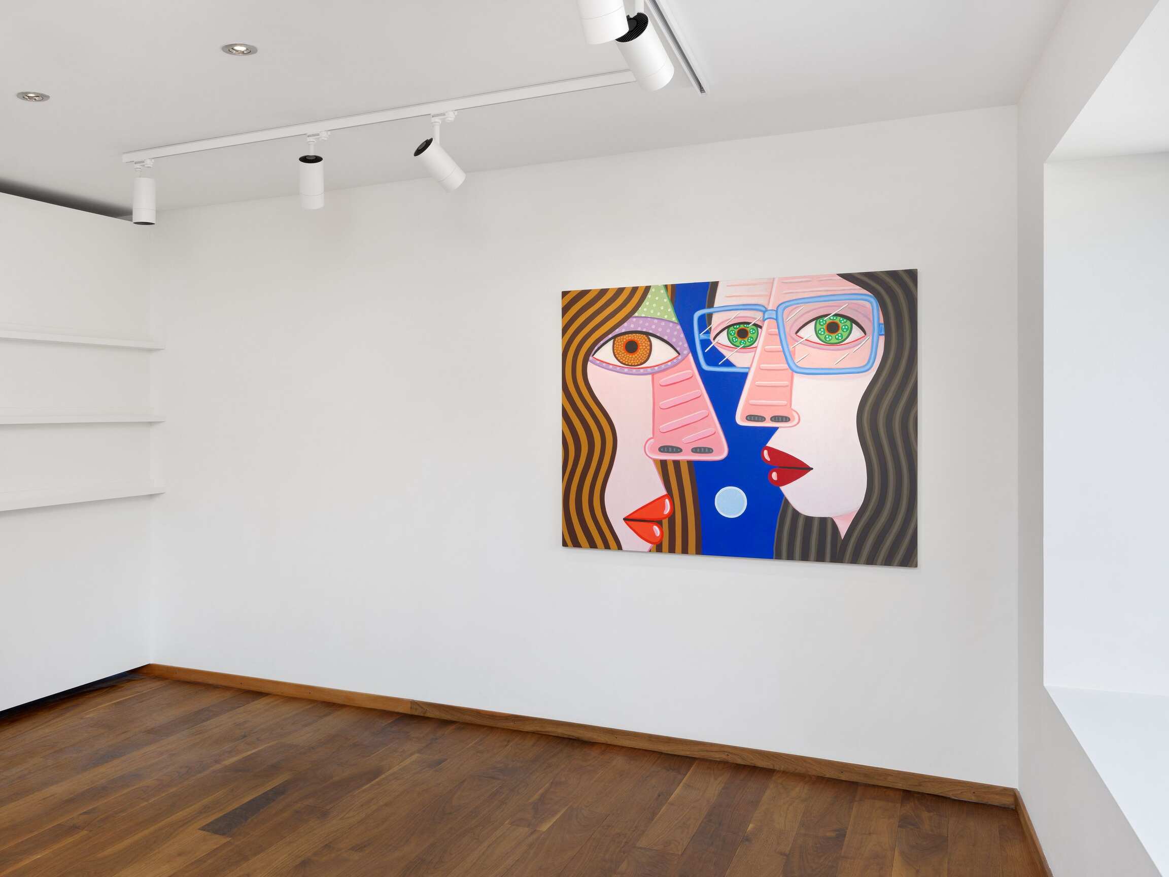 If we can say that this painting has to do with "calculation," it is because the effect produced by the paintings is primarily the result of an internal exploration of the medium. This is reflected in the creation of visual relationships between colours and shapes that determine the compositions (and in some respects, Brian Calvin works as if he were an abstract painter). In the changing balance between the archetypal dimension of faces, which, let us recall, belong to imaginary figures, and their very specific presence in space, when they seem to follow you with their gaze. The painter's genre play is part of the same medium-specific reflection. In the tradition of synthetic cubism à la Picasso, which he has been revisiting for some years now, faces merge with their environment. Groups of heads transform into animated genre scenes. The landscape makes a discreet entrance in the form of a rain-swept forest horizon (unless these are reflections on a window?). A few paintings, oscillating between the scale of the body and that of the cosmos, reveal their background: here a clear sky, there a darker one. Are the coloured dots beauty spots, stars, planets?