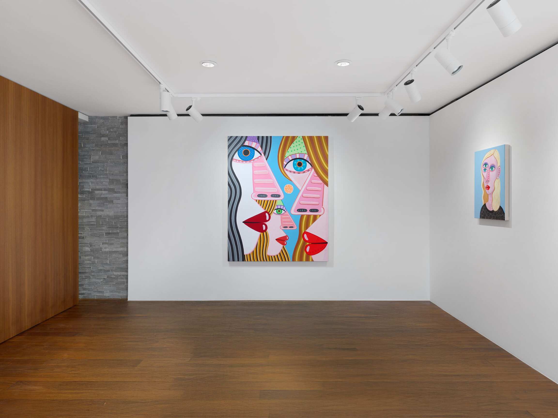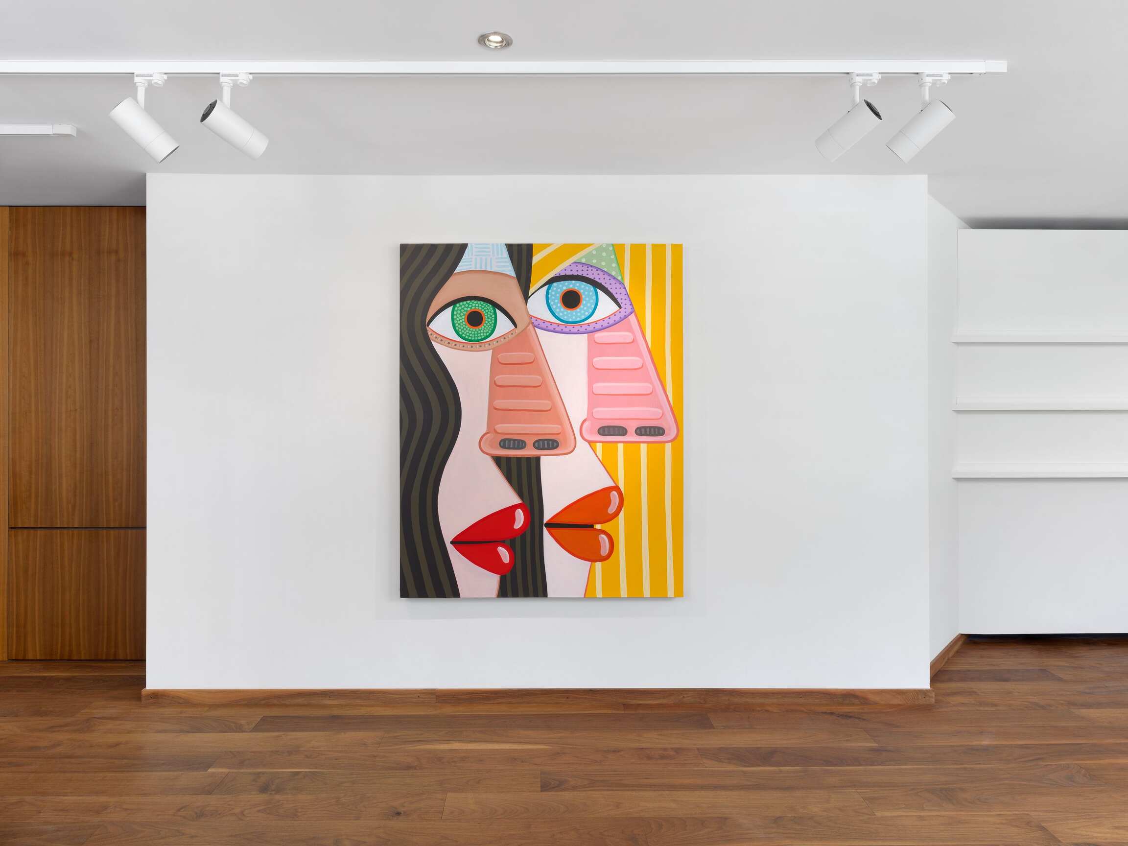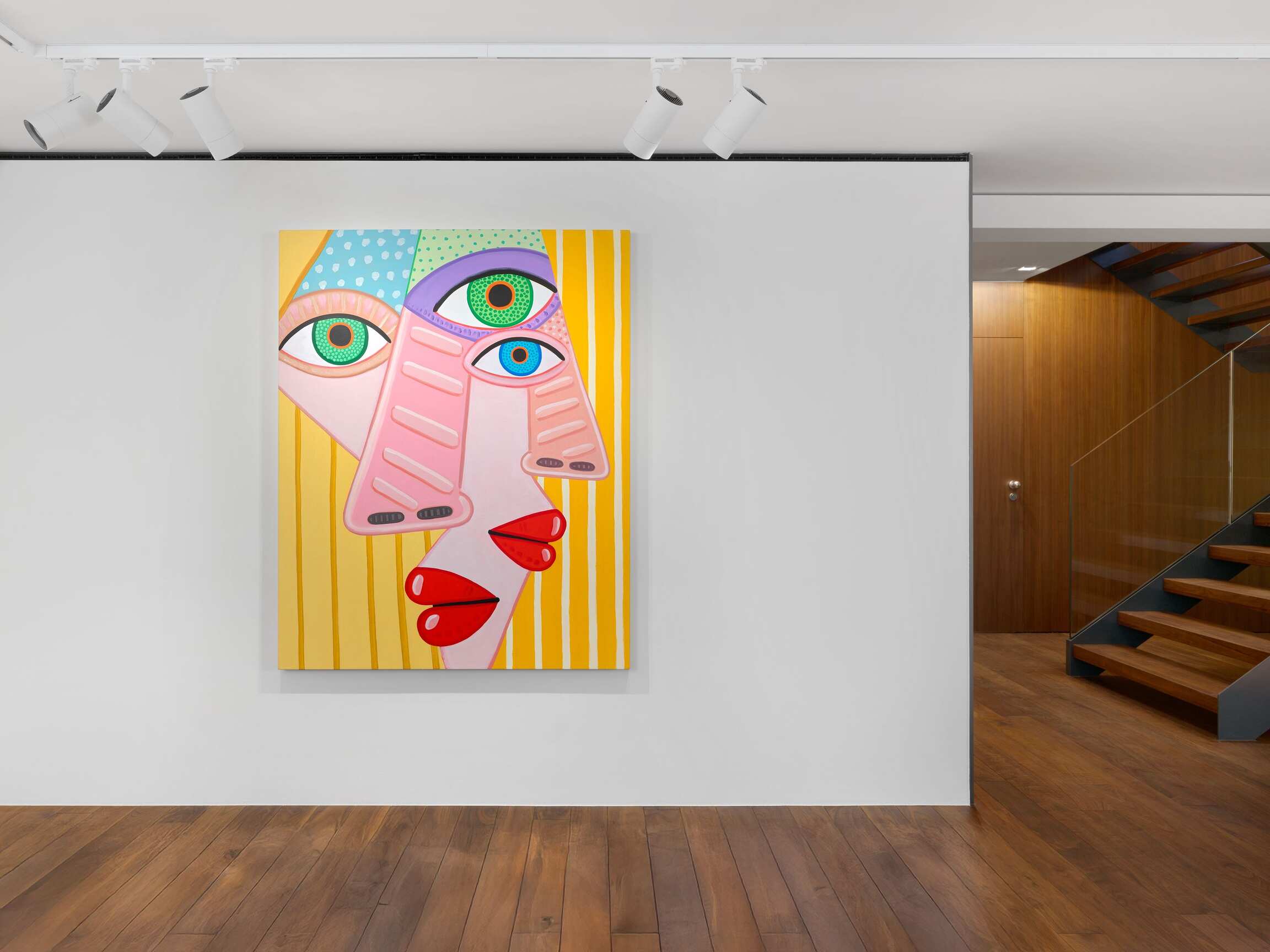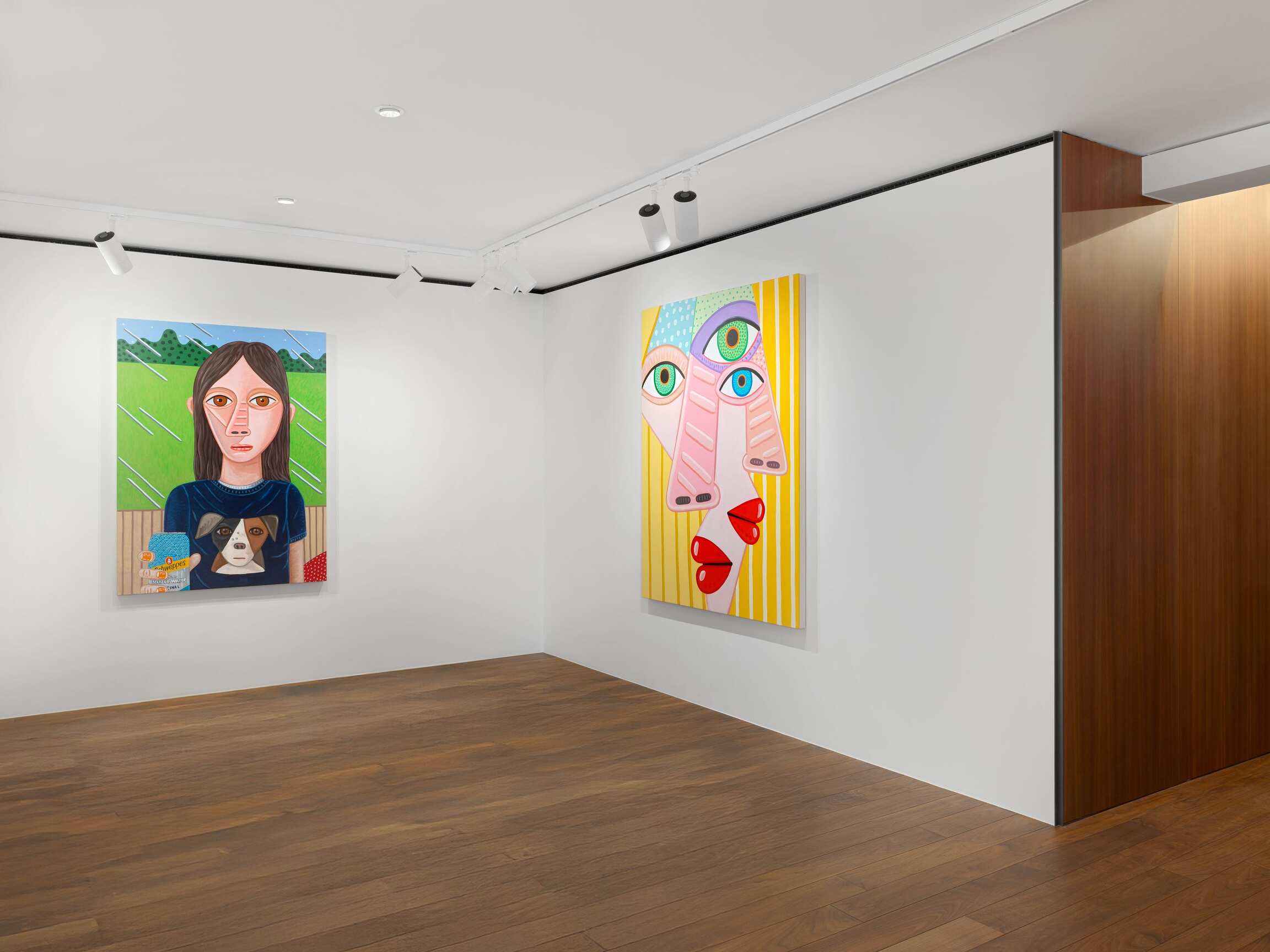 If we can say that this painting has to do with "calculation," it is because the effect produced by the paintings is primarily the result of an internal exploration of the medium. This is reflected in the creation of visual relationships between colours and shapes that determine the compositions (and in some respects, Brian Calvin works as if he were an abstract painter). In the changing balance between the archetypal dimension of faces, which, let us recall, belong to imaginary figures, and their very specific presence in space, when they seem to follow you with their gaze. The painter's genre play is part of the same medium-specific reflection. In the tradition of synthetic cubism à la Picasso, which he has been revisiting for some years now, faces merge with their environment. Groups of heads transform into animated genre scenes. The landscape makes a discreet entrance in the form of a rain-swept forest horizon (unless these are reflections on a window?). A few paintings, oscillating between the scale of the body and that of the cosmos, reveal their background: here a clear sky, there a darker one. Are the coloured dots beauty spots, stars, planets?