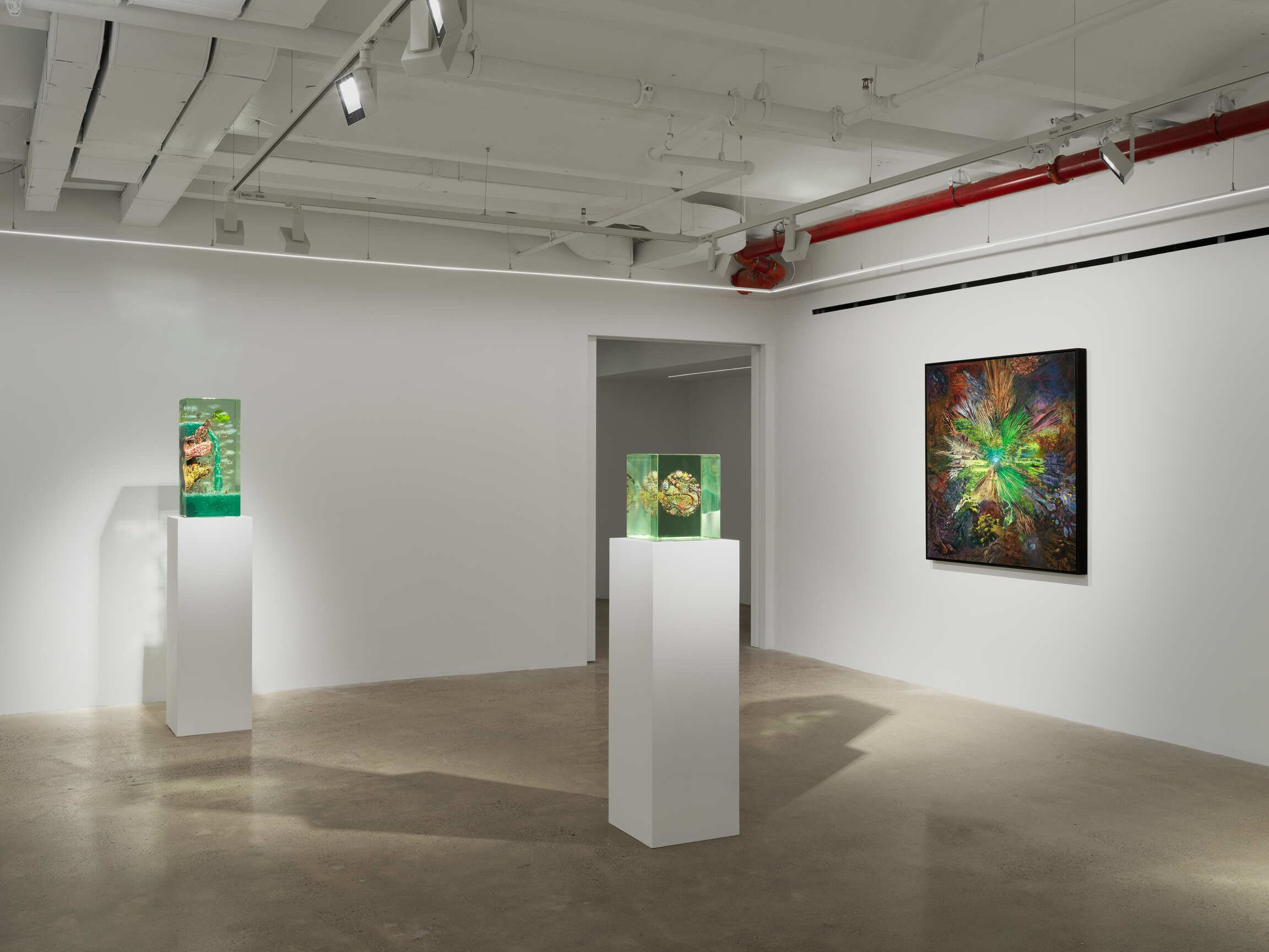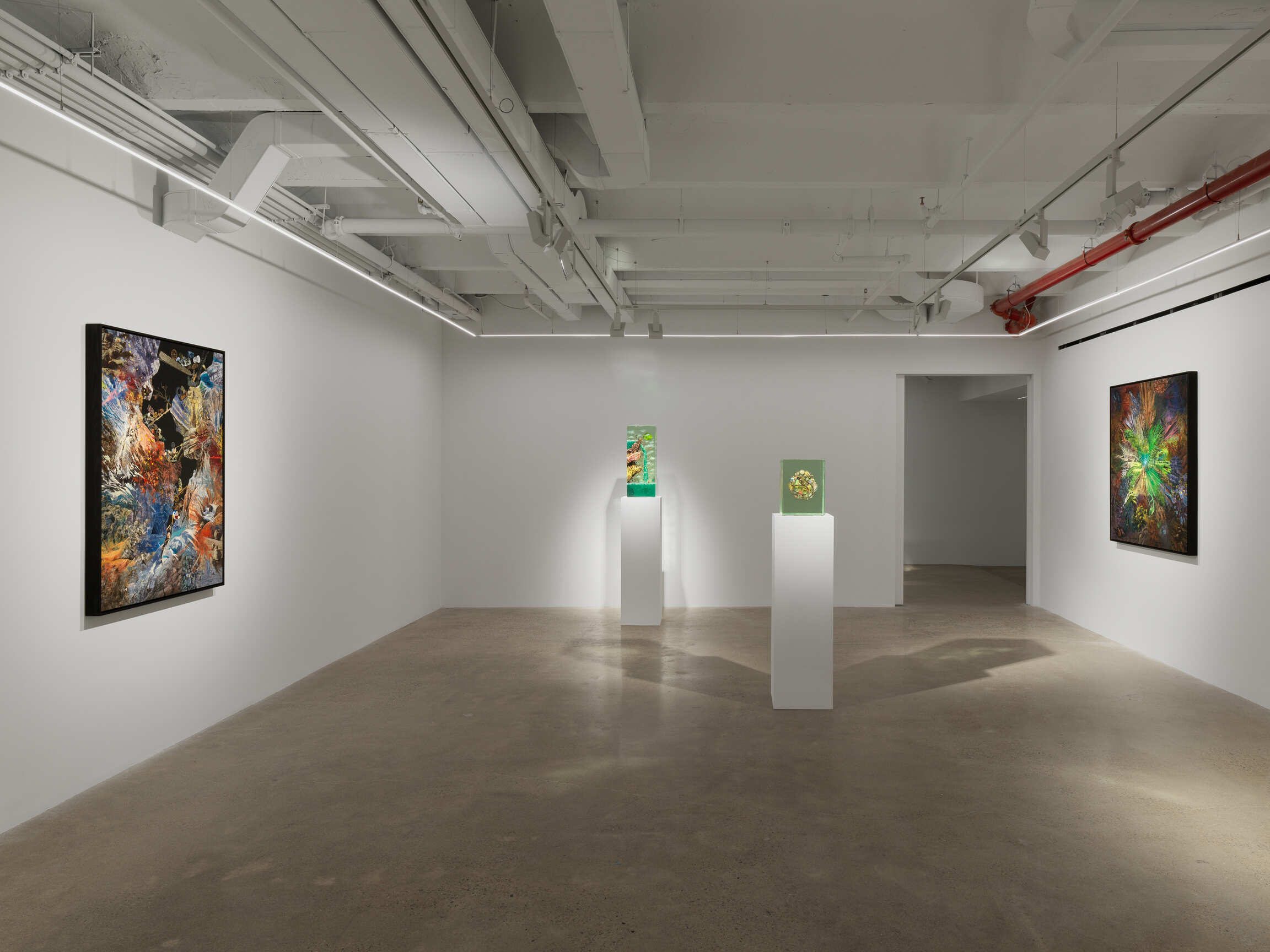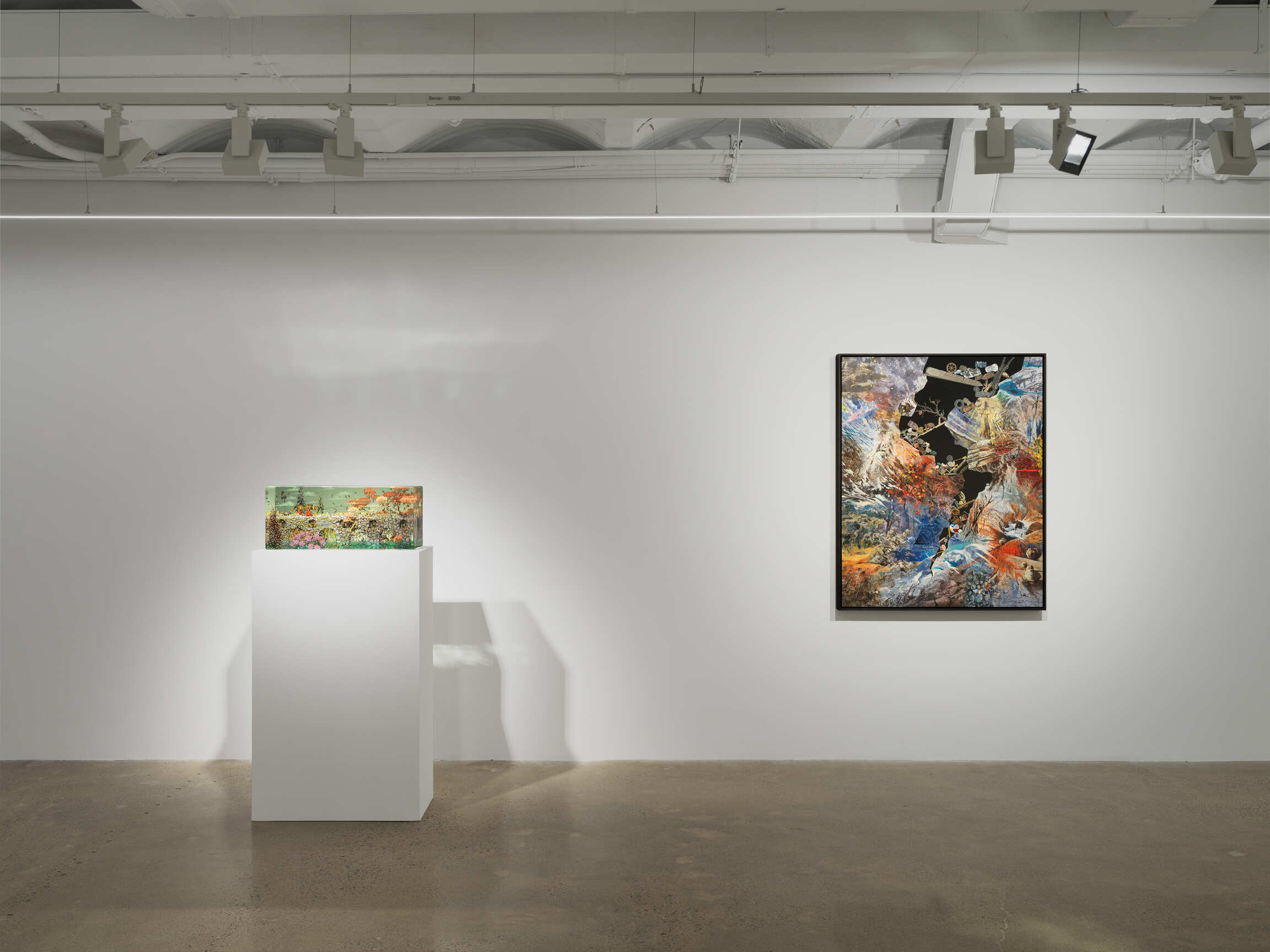 This exhibition marks more than a return to the gallery; it signals a conceptual shift, or perhaps a rebalancing. At its core are five new glass-layered sculptures that build on Yellin’s foundational practice of compressing time, memory, and myth into vertical compositions. Yellin also presents a suite of three luminous, hallucinatory paintings—signaling his re-engagement with the medium after nearly twenty years—that vacillate between extraterrestrial geological forms and dreamlike mountain ranges, rendered in ecstatic, fluorescent hues. These imagined terrains are not so much landscapes as temporal palimpsests—portals into what geologists and theorists call deep time: the vast, incomprehensible expanse of Earth’s existence, theorized by James Hutton and popularized by John McPhee, that renders human chronology a flicker in the planet’s long memory.