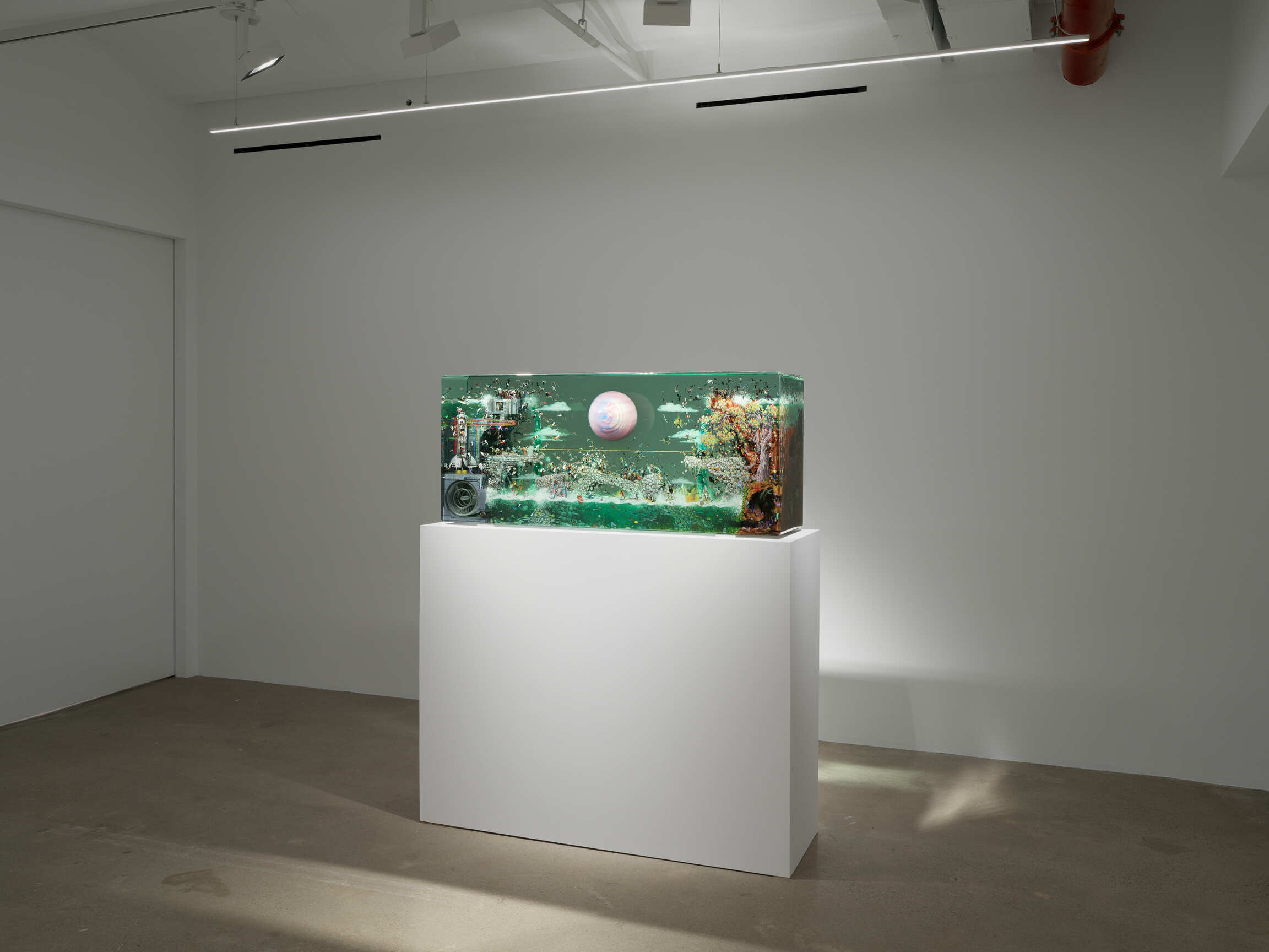 Yellin’s latest large-scale sculpture, The Consequential Nature of the Simultaneous (2025)—which premieres in 'If a bird’s nest is nature, what is a house?', his first solo exhibition with Almine Rech—continues and deepens this inquiry. Also structured around a mirrored narrative, the work juxtaposes a vision of alien astronauts assembling around a NASA spacecraft and a particle accelerator with a chaotic, speculative depiction of an ancient Etruscan scene. Suspended in layers of glass, these two poles suggest a continuity between ancient cosmology and scientific futurism, collapse and discovery. The sculpture reads as a time-bridge—an architectural container for converging belief systems, cultural ruins, and space-age imaginaries. It captures Yellin’s signature method of embedding found materials, painted gestures, and cultural detritus into a stratified structure that invites contemplation of what it means to exist—simultaneously—across epochs.