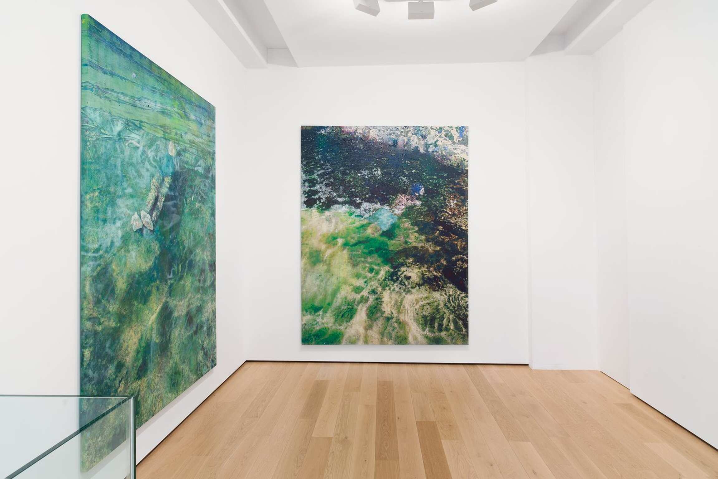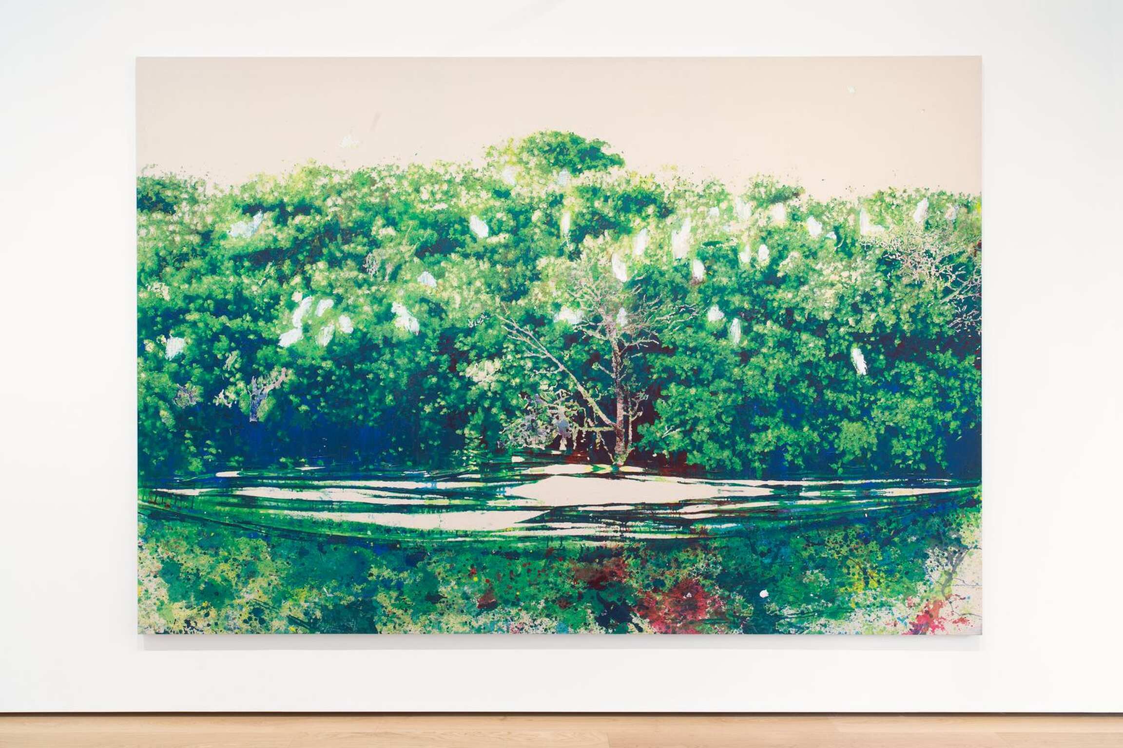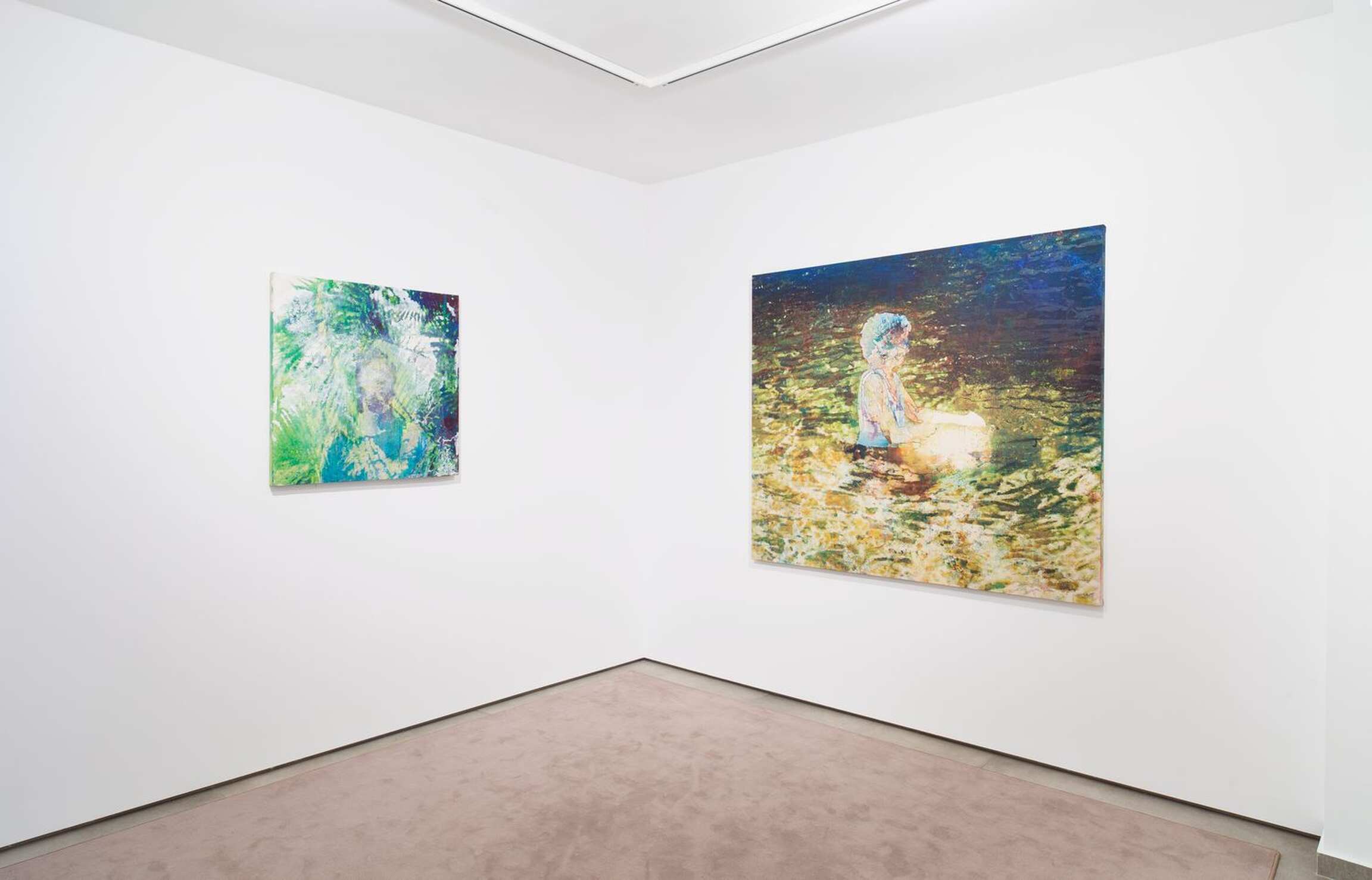 Dehors, je m’assieds, tu déplaces et me montres les toiles. Il serait facile de dire que la troisième scène est celle de l’évènement de l’image, celle de son apparition. C’est la scène de l’exposition (celle de tes tableaux devant moi, celle de ce texte, celle de l’exposition à la galerie). Après le stade géologique, l’image advient. Après les tremblements et les tressaillements, l’image sort comme un instantané, comme quelque chose qui rompt avec le passé. Ça, c’est Gaston Bachelard qui, au contraire de Bergson, pense le temps de l’instant comme une solitude, un discontinu, une rupture, coupure essentielle et non artificielle. Le temps de l’apparition de l’image (l’instant) est une nouveauté radicale qui doit être marquée d’ une attaque (j’imagine ça comme un coup d’état). Ça serait aussi le temps d’une synthèse, entre toi et le monde. Nous n’allons pas résoudre ça ici, cette idée de la création (en réalité très violente), celle d’un travail pour la fabrique d’une figure devenue reconnaissable même si nous ne l’identifions jamais comme dans Plage (2021), elle peut parfois disparaître dans un jeu de matières avec les reflets de l’eau par exemple, mais elle réussit à flotter. On peut à peine y accrocher une histoire, ça veut dire que le travail est fait. La figure était déja là dans le premier moment, celui de la photographie, mais elle trahissait une étrange proximité, une caricature (on connaît les scènes de vacances et les souvenirs d’enfance ou de famille, l’histoire a trop de fois été raconté, trop de films, trop de livres et scènes bourgeoises). Et puis la figure disparaissait totalement dans la nuit d’un atelier. Là enfin, une figure redevient reconnaissable, défie toutes les mauvaises histoires, et la peinture devient une scène d’affects, de sensations de couleurs, peut-être d’émotions, assurément de désirs. Comme cette forêt dans Mangrove (2021), on imaginerait l’entrée d’une mangrove et le mot seul suffit à nous renvoyer à un imaginaire infini. Il y a un souvenir du paysage, des paysages qu’ils disent « tropicaux ». Le souvenir d’une peau baignée dans gros-soleil, la sensation d’une lumière et d’hérons planant à l’entrée de la mangrove (là on poétise). C’est peut-être moi qui vais un peu vite en faisant de cette figure un lieu, mais sensations aussi gardent mémoire des lieux et des matières qui nous manquent en d’outre-mers — Coupez ! C’était parfait.