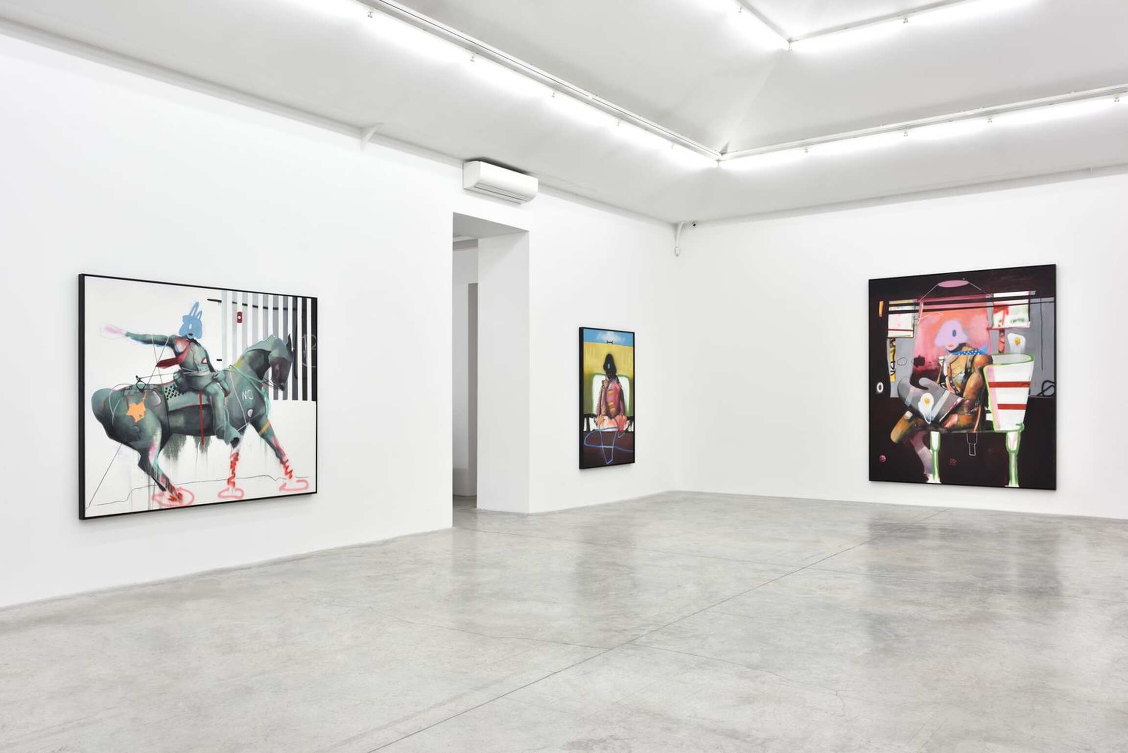 Furthermore, the attitude and importance of authorities are often undermined and shaken by the narrative built around them, most notably in David and Goliath, 2020, where a historic monument as a symbol for certain ideology dissolves into graffiti marks that set off its defacing and dismantling. Confederate or WWII regalia, armbands, or red, white, and blue ties are the main elements of the narrative that Jansen is conveying, clearly referencing the tension and dynamics of social and political changes in his homeland. Yet, in addition to that, the images of Polkadot balls, walls, graffiti scribbles, target-like symbols, inaccurate math equations, palettes, and an amalgam of different uniforms and insignia, are sparking a supplemental set of emotions which provide a more elaborate, insightful, and globally applicable overview of the themes in which the artist is interested in. Driven by personal, sometimes unconscious experiences, Jansen’s works are focused on giving a visual consciousness to global social struggles, with clear political undertones though without an explicit statement on defying good or bad figures.