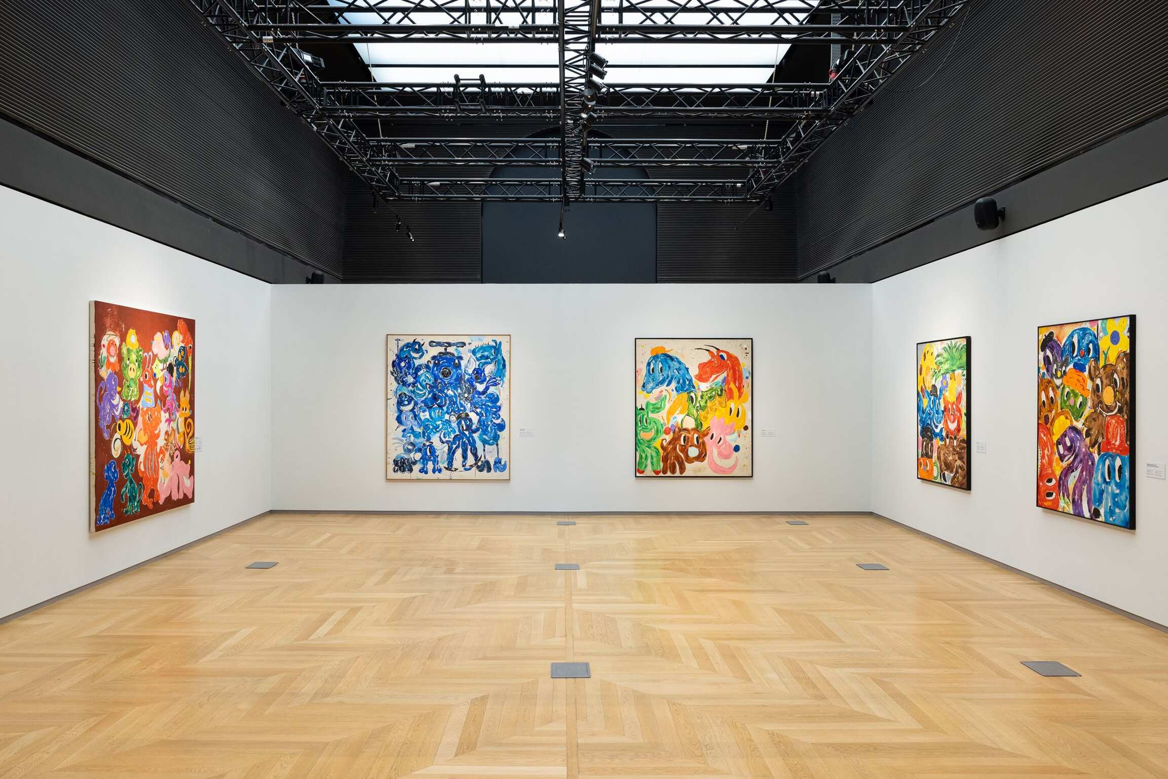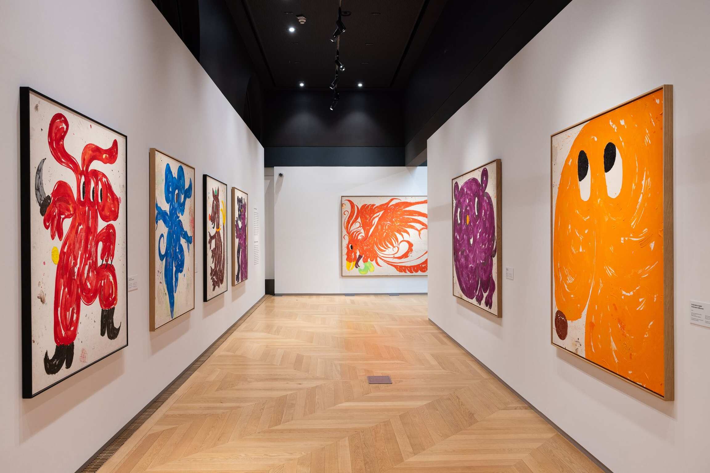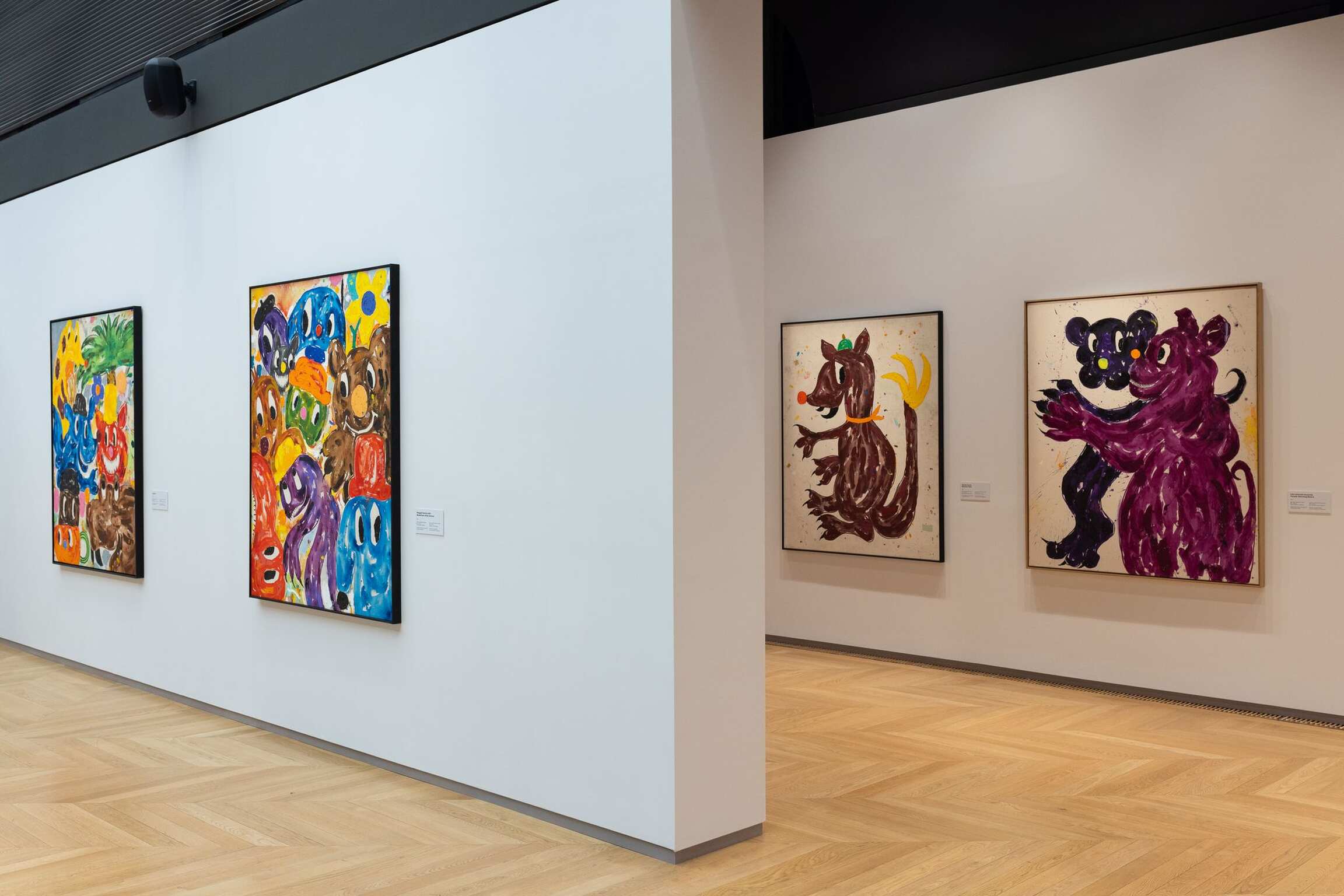 The cheerful facial expressions of the imaginary creatures thus became dramatically accentuated, as if it were some narrow window that allowed a view into the world where these figures – which resemble dogs, birds or some mixed creatures – live happily side by side. Their faces could be taken for quotes of imaginary animated films for children, but their size, composition and framing make them portraits that seem to provoke our world with their own; they seem to long to come over to our side, while their naive carefreeness entices us to join them in their realm.