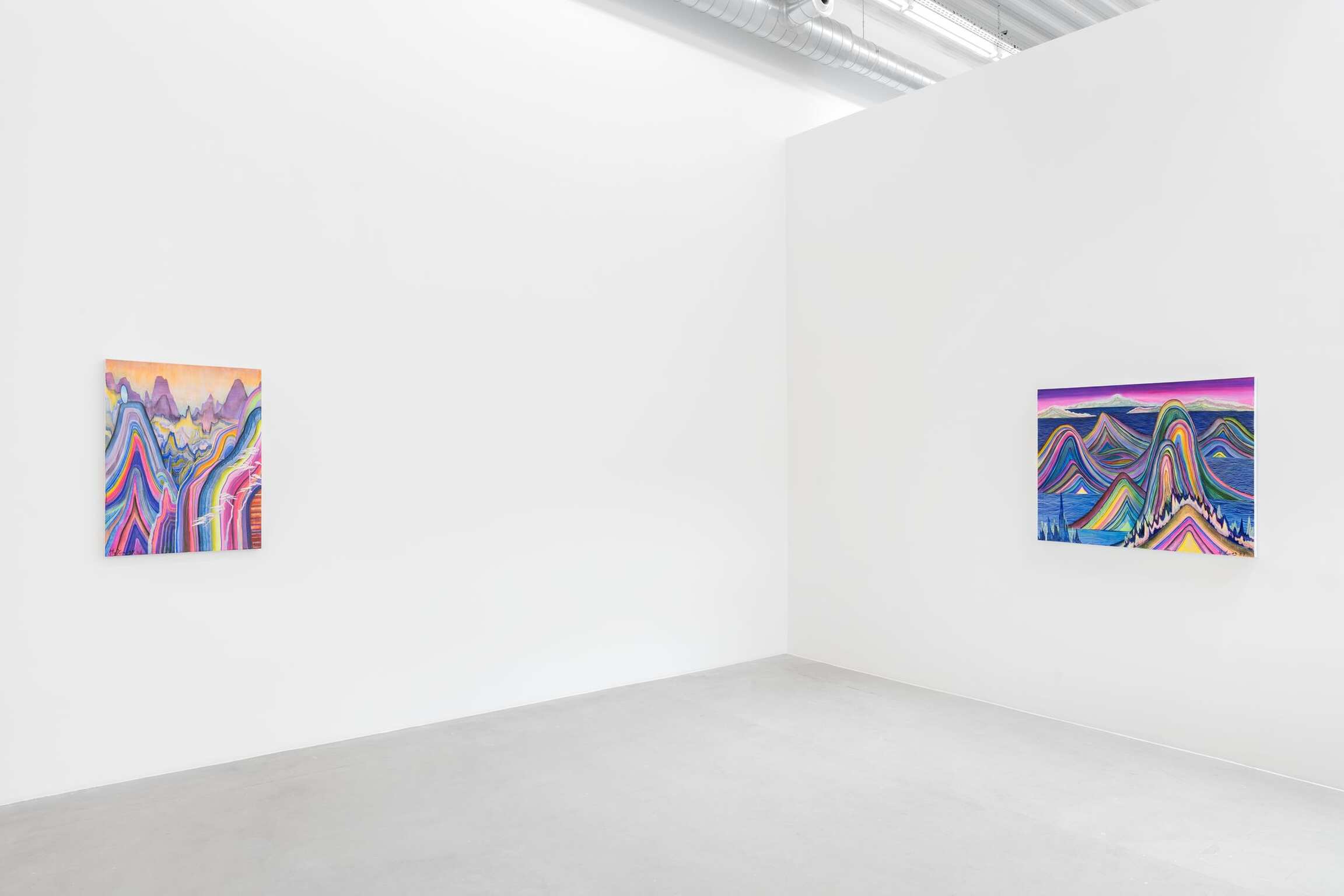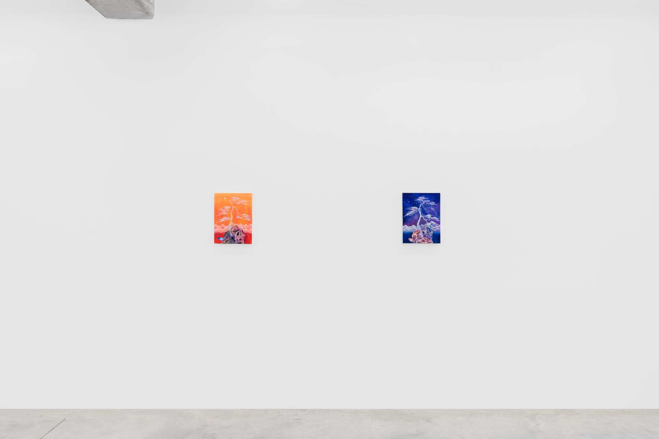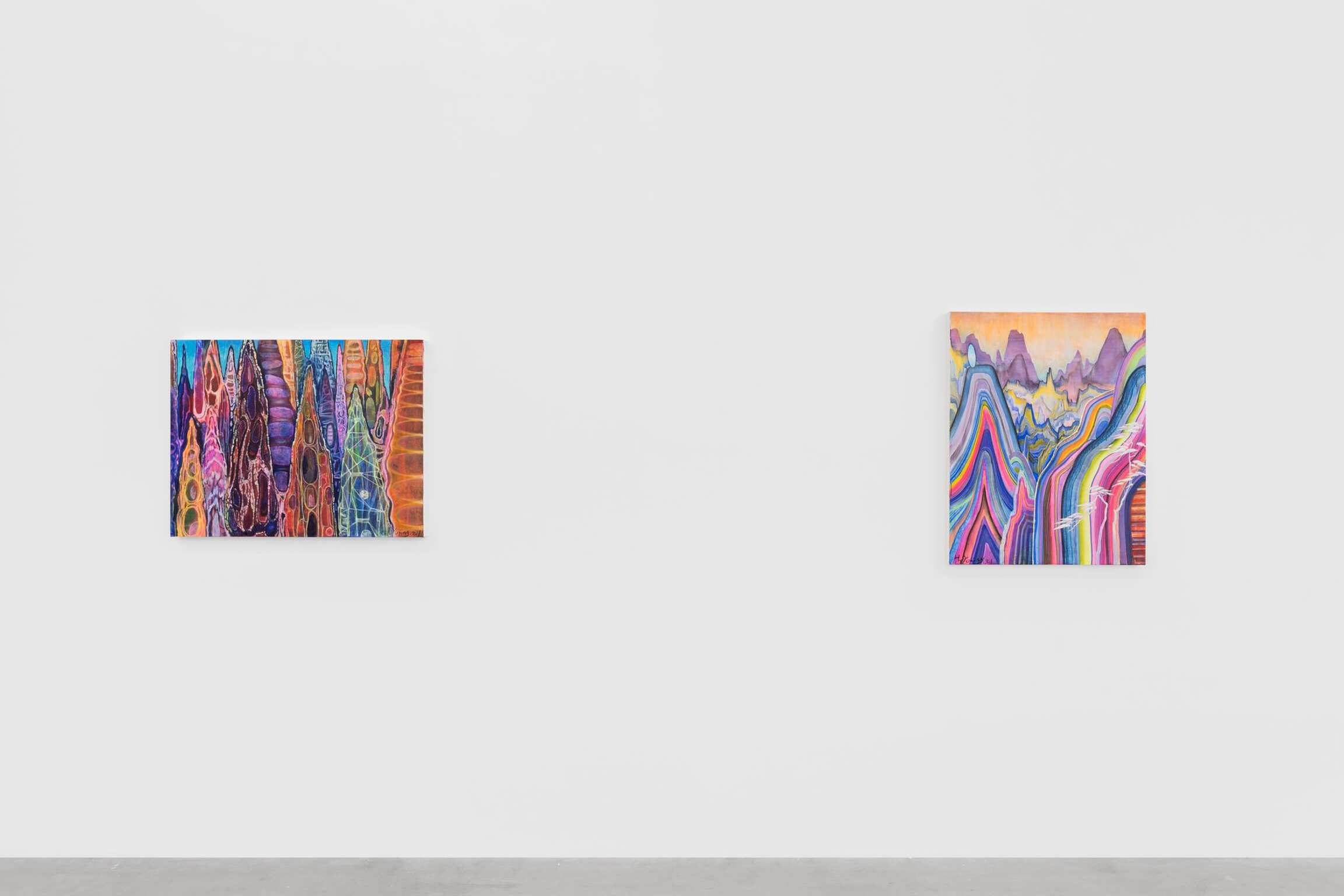 Le monde naturel occupe une place de choix dans presque toutes les œuvres de l’exposition, plus particulièrement les paysages de montagne. Certaines s’inspirent de lieux réels, comme les monts Jaunes - ou Huangshan - de l’est de la Chine ; d’autres sont mythologiques, comme Penglai, le paradis céleste des Huit Immortels de la mythologie chinoise. Faites de courbes ondulantes et de strates arc-en-ciel couronnées d’une ligne d’arbres abstraite et déchiquetée, certaines, comme ‘Pine by the Pink Sea’, font appel à la technique chinoise classique du gongbi, ou coup de pinceau méticuleux, revisitée par l’artiste.