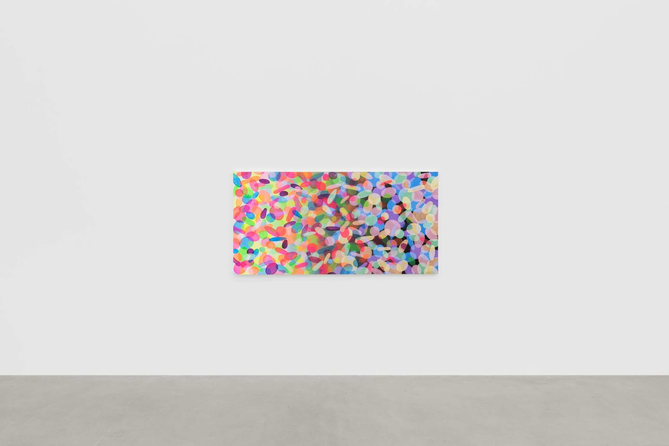 Là où les fleuves de Huang évoquent les couches, profondeurs et mouvements du temps, sa série Bubble parle de moments singuliers saisis dans l’instant. Dans l’exemple présenté ici - une toile de grand format, intitulée ‘The Fringe of Atmosphere’ - l’œuvre passe d’une palette lumineuse de rose, de jaune et de vert à une association de mauve pastel, de taupe et de bleu sarcelle, évoquant la transition du jour vers le soir. L’aspect est celui d’un champ rempli de bulles flottant les unes sur les autres, certaines prêtes à éclater ; à moins qu’il ne s’agisse de gouttelettes ou de cellules grouillant sous l’œil d’un microscope. L’effet est hypnotique. Tantôt ellipses ou ovales lisses, tantôt globules irréguliers, ces formes contenues sont un motif récurrent de l’œuvre de Huang, présent dans plusieurs de ses séries depuis une dizaine d’années.
