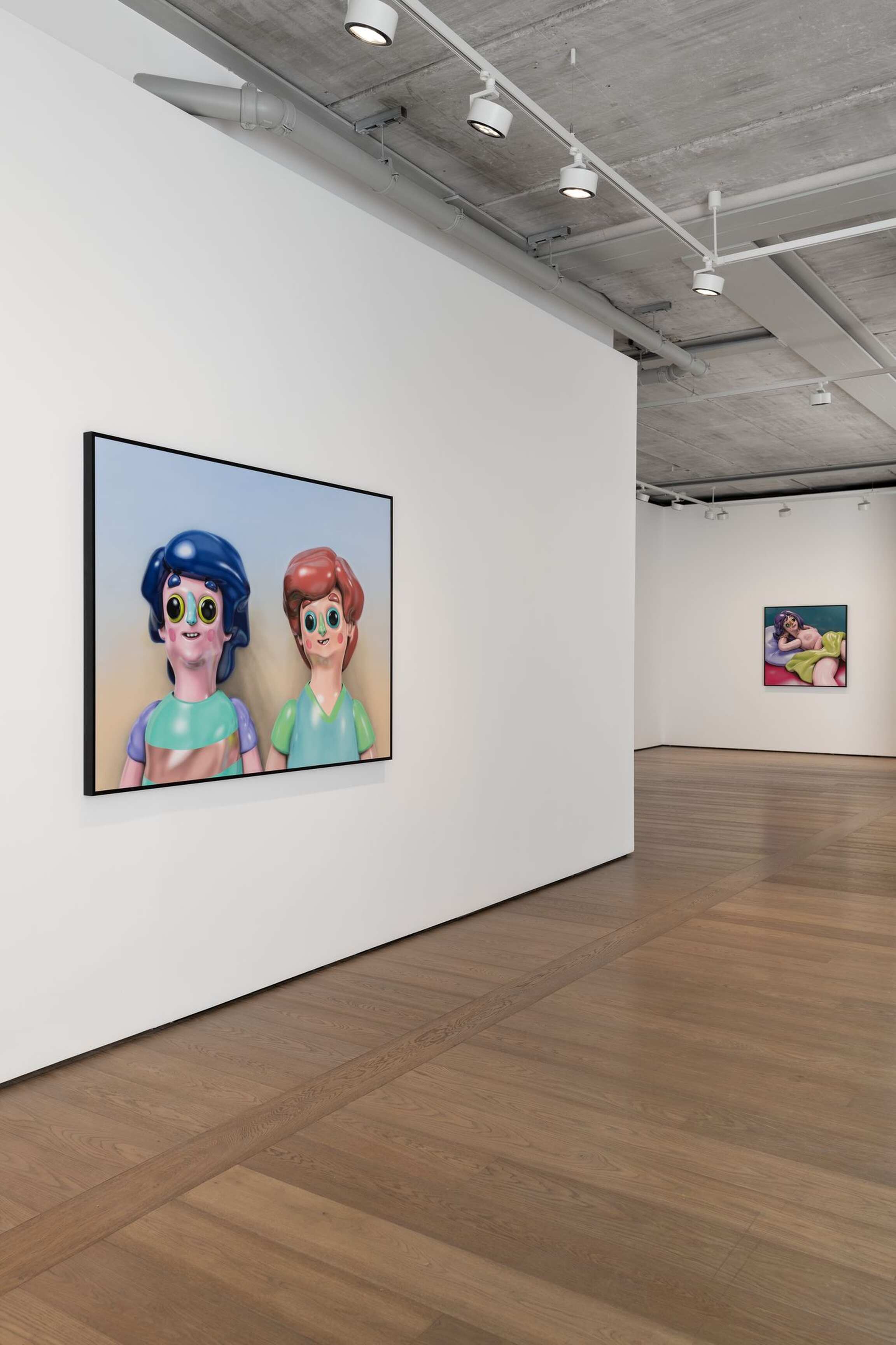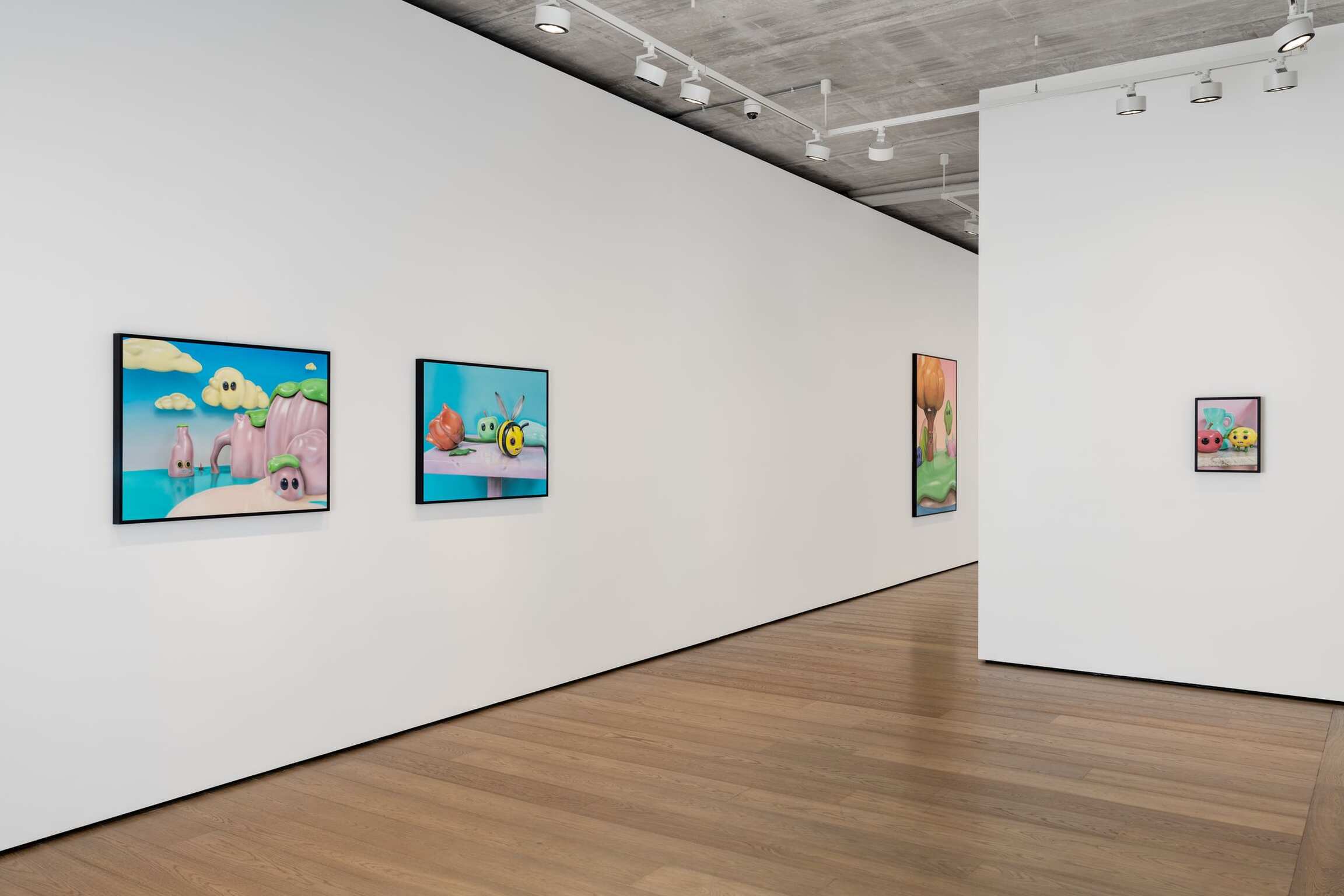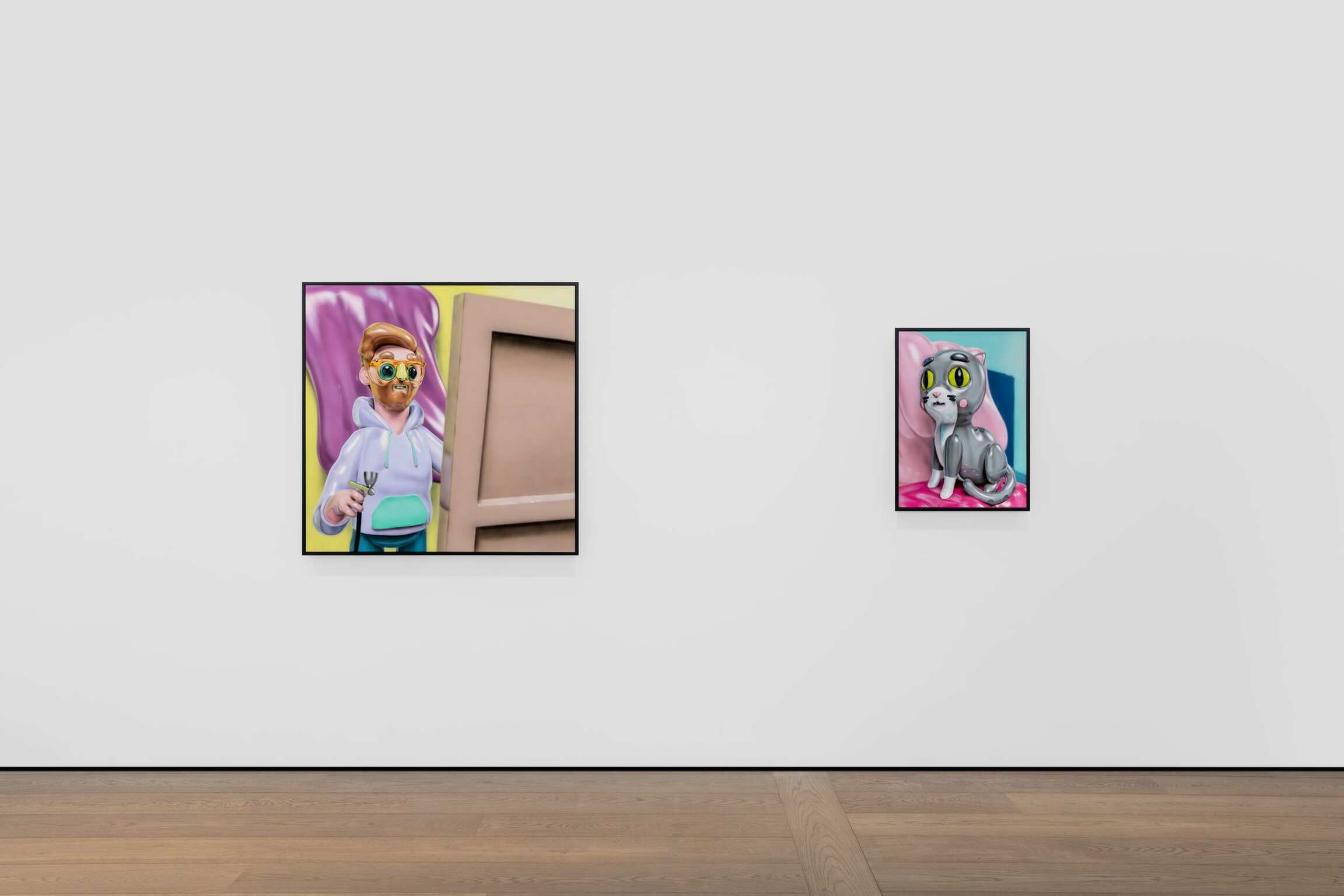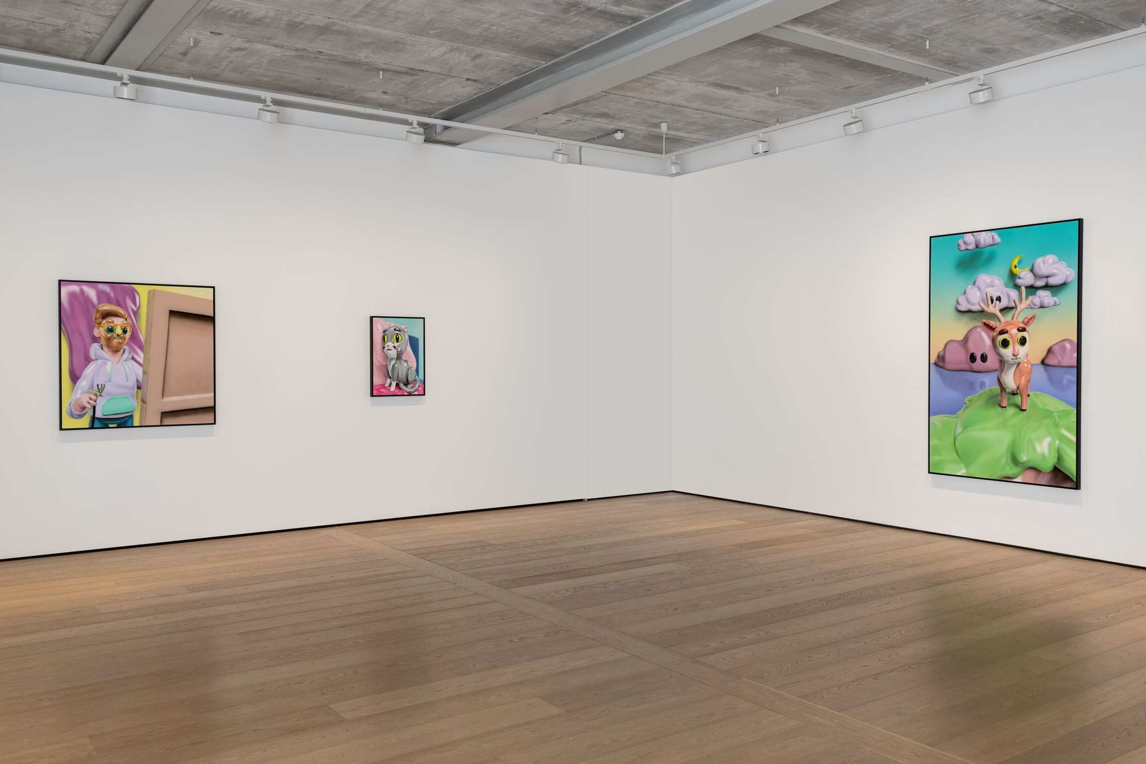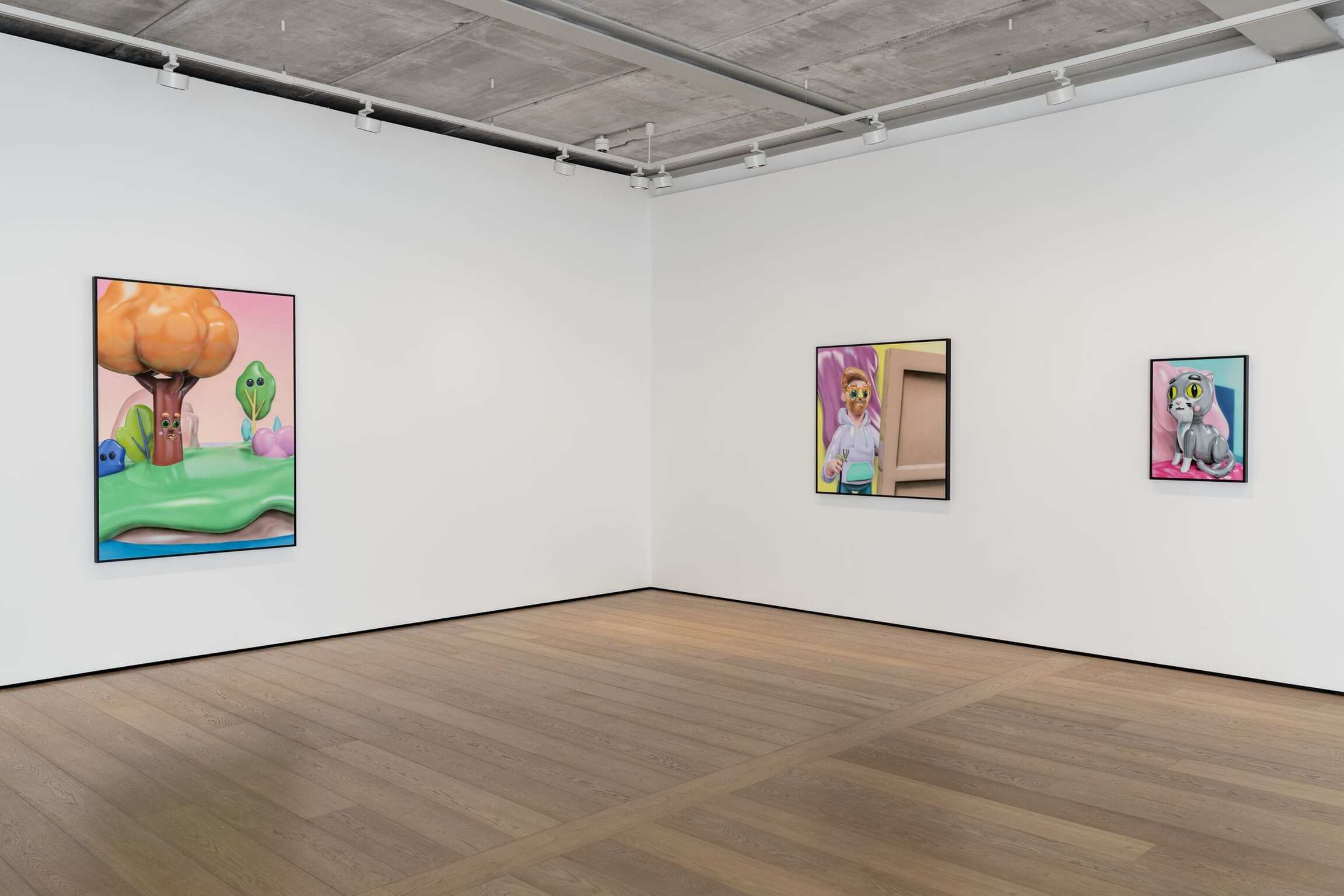 Working with 3D visuals is simultaneously allowing for not only working within the tradition of representation but being able to entirely construct the most visually exciting reality. Able to start his process from a literal ‘nothing’, a blank void, Piette is taking the position of a creator of his own universe and everything within it. Steered towards the aesthetics of heavily stylized, exaggerated cuteness, and favoring the maxim “the cuter, the better,” the bulbous, shiny, and vibrant characters along with their anthropomorphized surroundings are becoming a generic caricature of themselves, challenging the notions of what traditional painting should be.