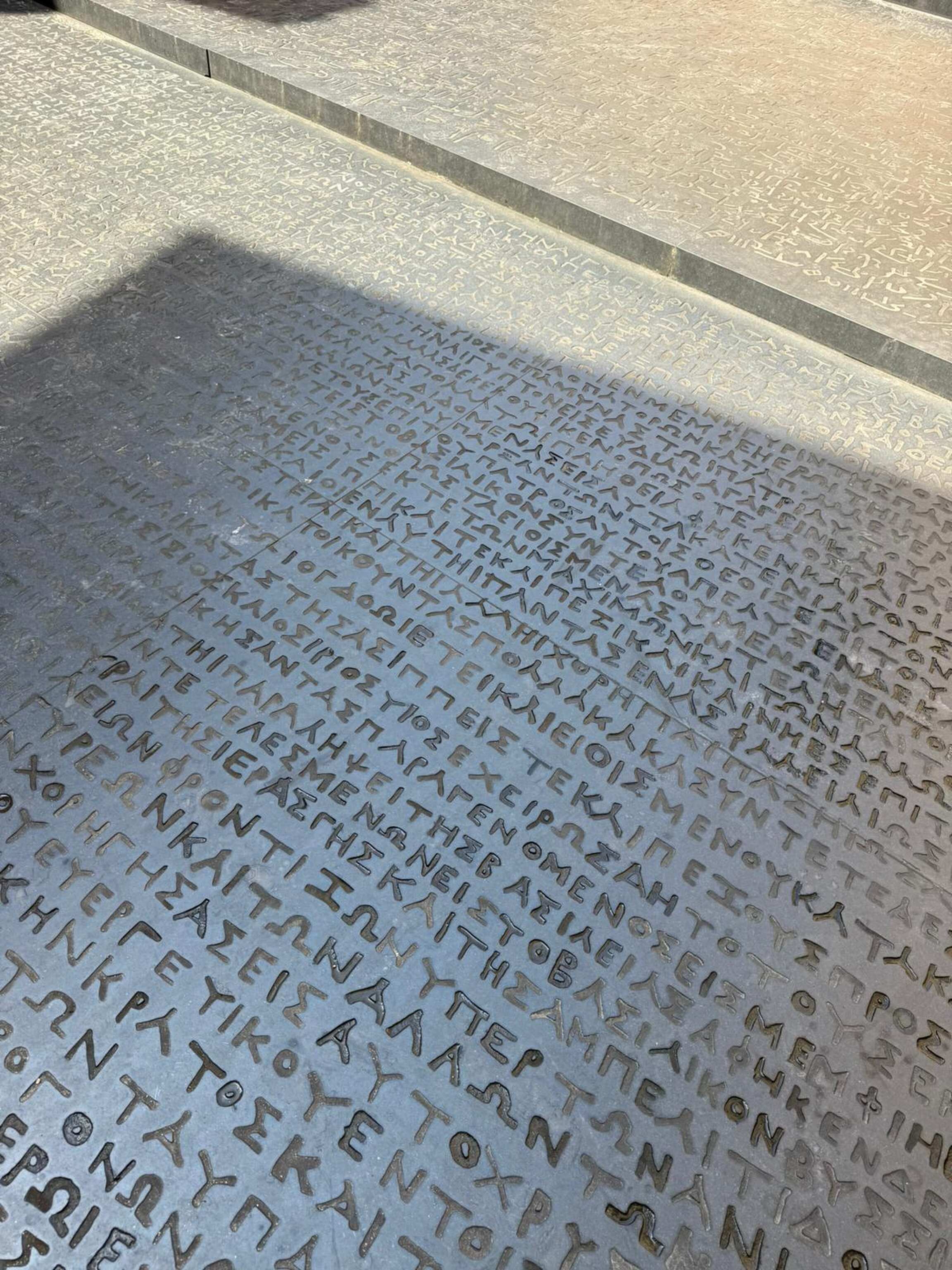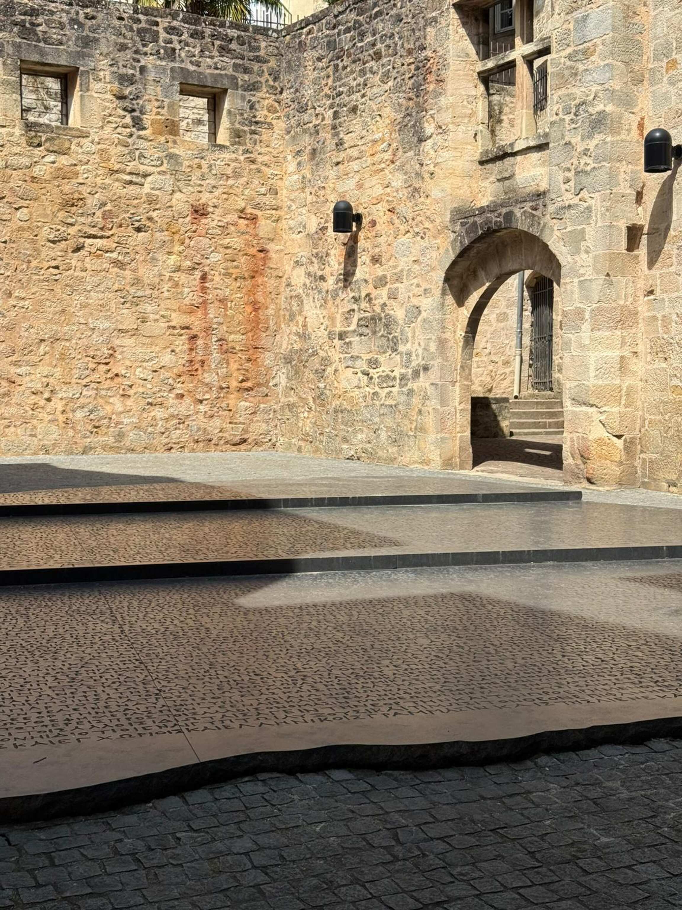 At the foot of the museum, Joseph Kosuth created the Place des Écritures, whose ground is covered by an immense reproduction of the Rosetta Stone. Kosuth integrates the Rosetta Stone into the city’s architecture in a way that evokes writing in its immediate relationship to a language, a city (Rosetta), and its natural environment (a terraced garden planted with papyrus, tamaris, and aromatic plants). This contextualization of language establishes a new relationship with words: here, three scripts — hieroglyphic, demotic, and Greek — and two languages are laid out on the ground, giving the text a strange and unprecedented presence through which Kosuth questions the meaning of words and language. A representation of writing in urban space becomes a true metaphor for Champollion’s work, who, in his time, dedicated his life to uncovering the hidden meaning of hieroglyphs and understanding their cultural and social context.