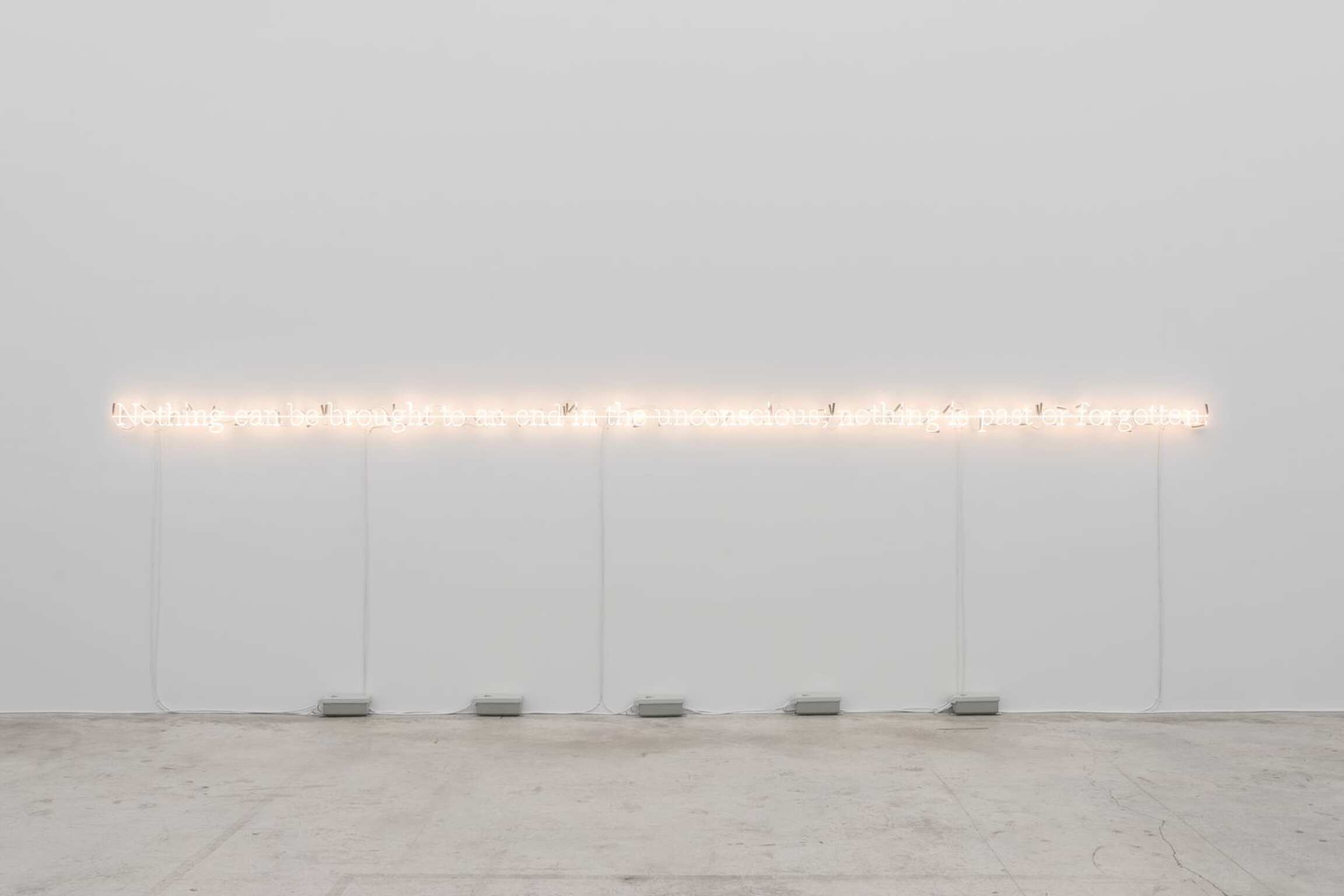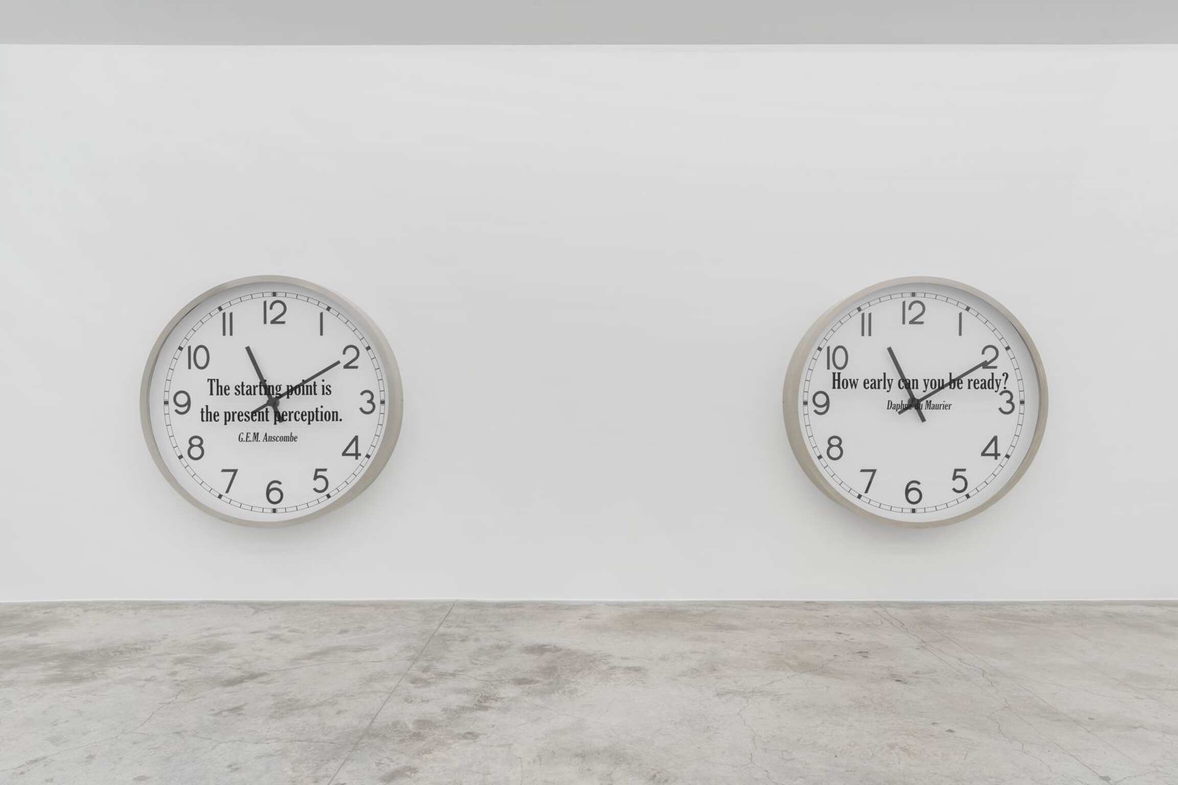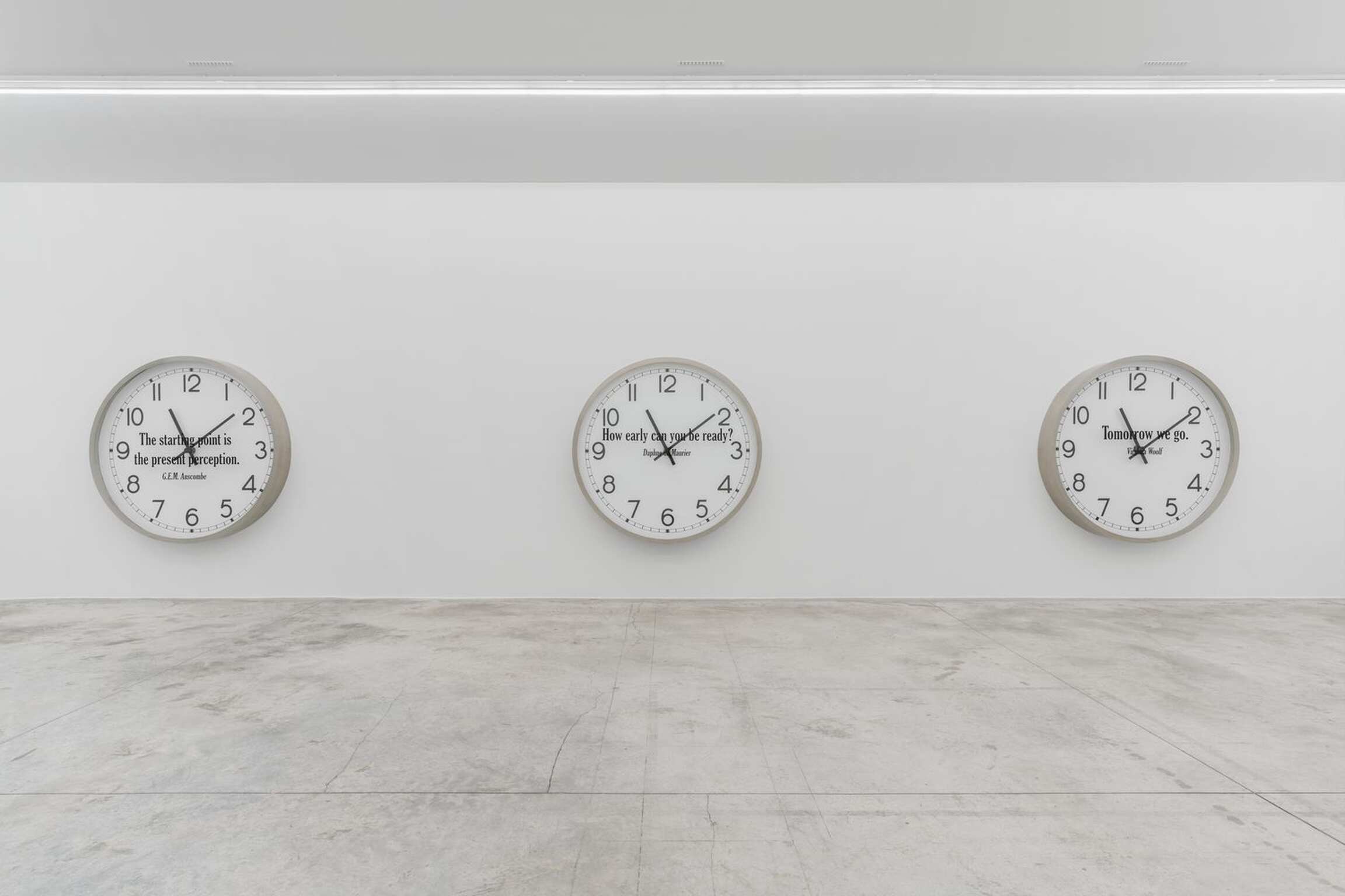 Ainsi, en un long néon d’un blanc chaud, je lis « Nothing can be brought to an end in the unconscious ; nothing is past or forgotten. » phrase créée au néon « en relation » avec la pensée de Sigmund Freud. Elle ouvre le présent, celui de nos existences comme élément déterminant de nos vies. Présent que l’inconscient renouvelle, sans cesse, portant la course du temps. Celui du réel comme celui du rêve, celui qui nourrit nos vies comme celui qui est à l’intérieur ou devant nous. Ce temps, dont on ne sait pas s’il existe bien que nous lui donnons substance par un principe de mesure induisant situations, positions et interprétations. Avec lui, ne sommes-nous pas, quotidiennement dans la comparaison, comme l’indique Joseph Kosuth, entre un début, un milieu et une fin travaillés par l’écart entre eux ? Any message ? La réponse est celle d’une mise en regard qui permet à chacun d’entre nous d’éprouver existentiellement, concrètement un concept qui est un acte. Joseph Kosuth dans ses travaux, utilisant des horloges, nous plonge physiquement, mentalement dans la rotation des aiguilles. Celle qui peut commencer par cette indication : « The starting point is the present perception », horloge imaginée en collaboration avec cette phrase de G.E.M Anscombe, l’une des trois exécutrices testamentaires de Wittgenstein. Les questions posées par les œuvres de cette exposition sont celles qu’un artiste éprouve quand la vue du monde autour de lui ne suffit plus pour nous être suffisante. L’intention de l’artiste n’est-elle pas de construire logiquement et, je crois, poétiquement une exposition qui nous offre le vif de cette expérience significative, traversée par le temps.