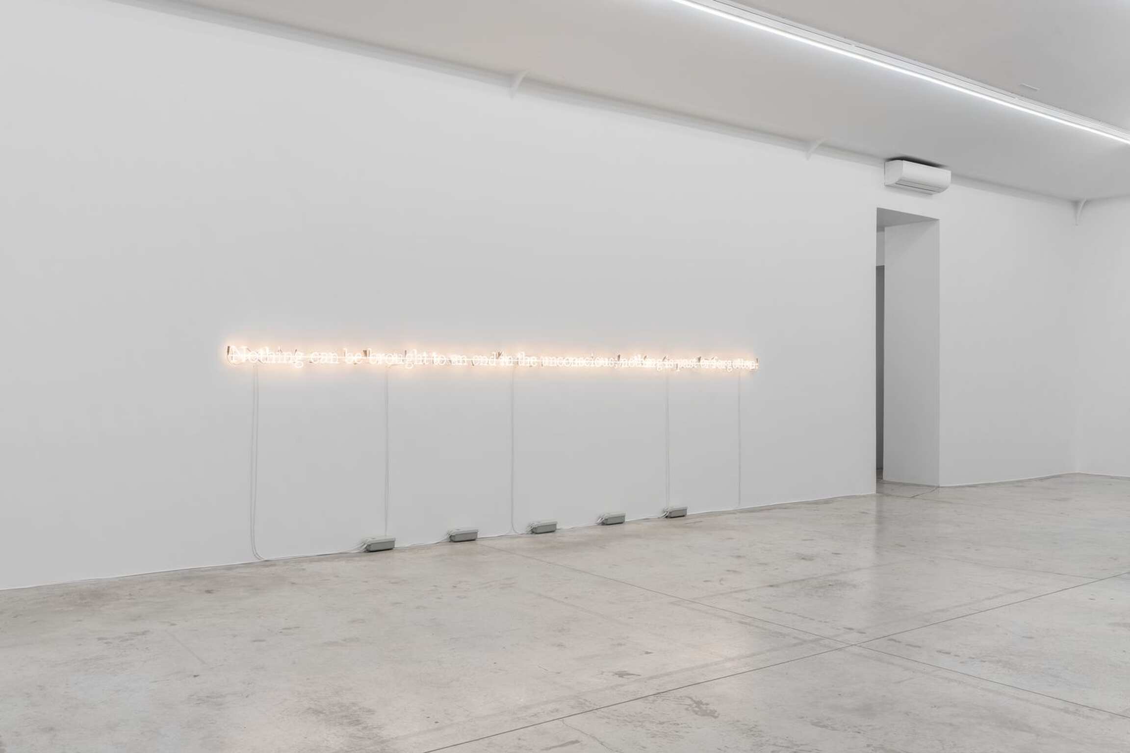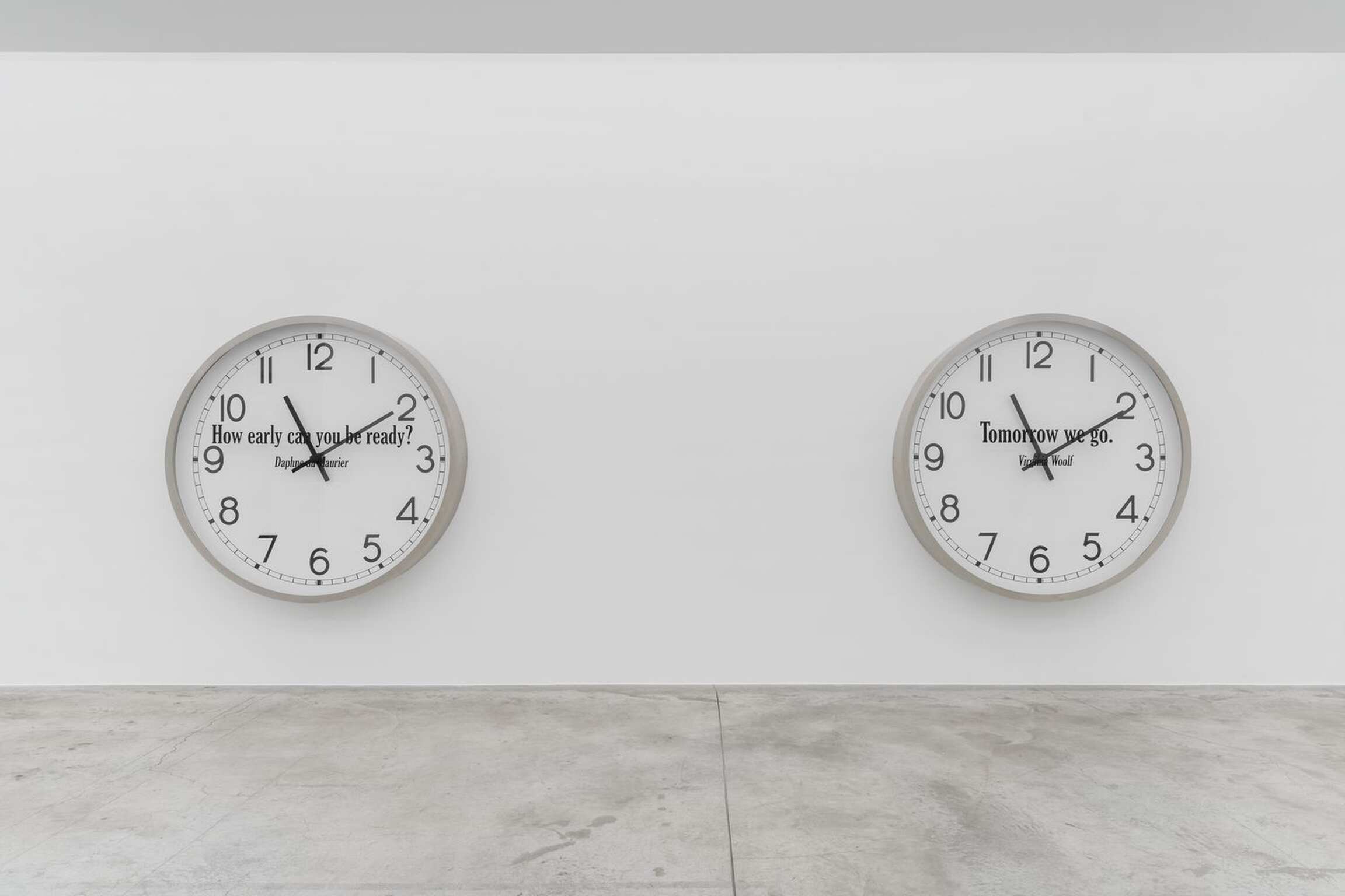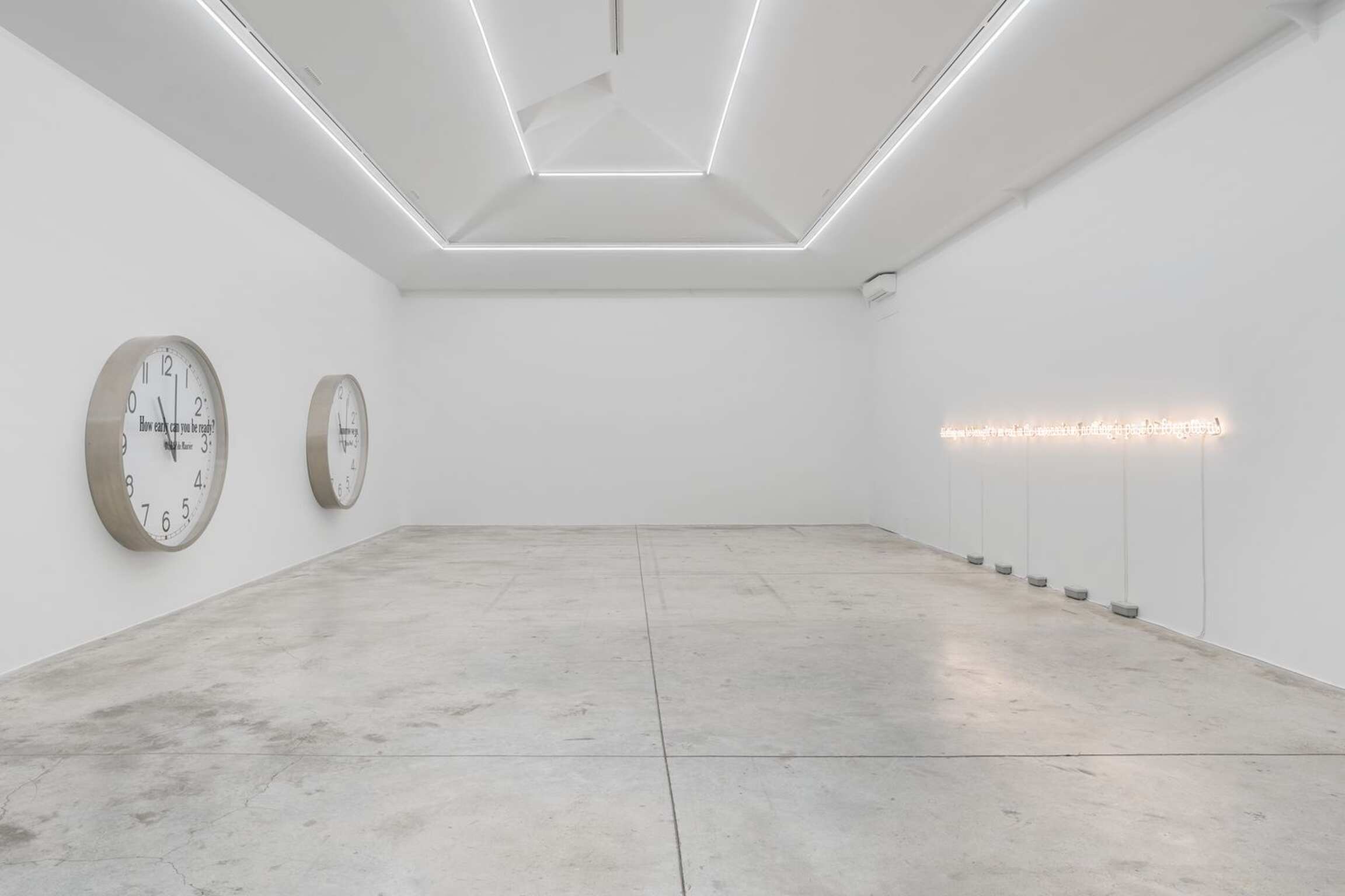 Ainsi, en un long néon d’un blanc chaud, je lis « Nothing can be brought to an end in the unconscious ; nothing is past or forgotten. » phrase créée au néon « en relation » avec la pensée de Sigmund Freud. Elle ouvre le présent, celui de nos existences comme élément déterminant de nos vies. Présent que l’inconscient renouvelle, sans cesse, portant la course du temps. Celui du réel comme celui du rêve, celui qui nourrit nos vies comme celui qui est à l’intérieur ou devant nous. Ce temps, dont on ne sait pas s’il existe bien que nous lui donnons substance par un principe de mesure induisant situations, positions et interprétations. Avec lui, ne sommes-nous pas, quotidiennement dans la comparaison, comme l’indique Joseph Kosuth, entre un début, un milieu et une fin travaillés par l’écart entre eux ? Any message ? La réponse est celle d’une mise en regard qui permet à chacun d’entre nous d’éprouver existentiellement, concrètement un concept qui est un acte. Joseph Kosuth dans ses travaux, utilisant des horloges, nous plonge physiquement, mentalement dans la rotation des aiguilles. Celle qui peut commencer par cette indication : « The starting point is the present perception », horloge imaginée en collaboration avec cette phrase de G.E.M Anscombe, l’une des trois exécutrices testamentaires de Wittgenstein. Les questions posées par les œuvres de cette exposition sont celles qu’un artiste éprouve quand la vue du monde autour de lui ne suffit plus pour nous être suffisante. L’intention de l’artiste n’est-elle pas de construire logiquement et, je crois, poétiquement une exposition qui nous offre le vif de cette expérience significative, traversée par le temps.