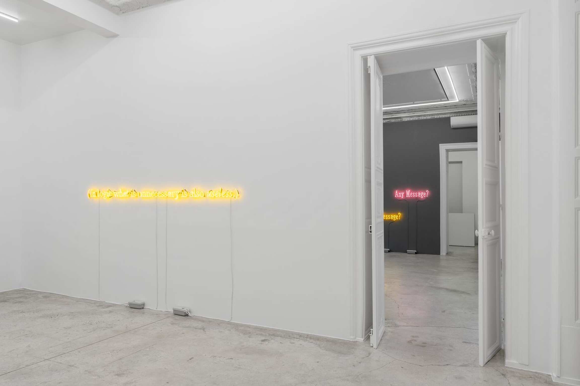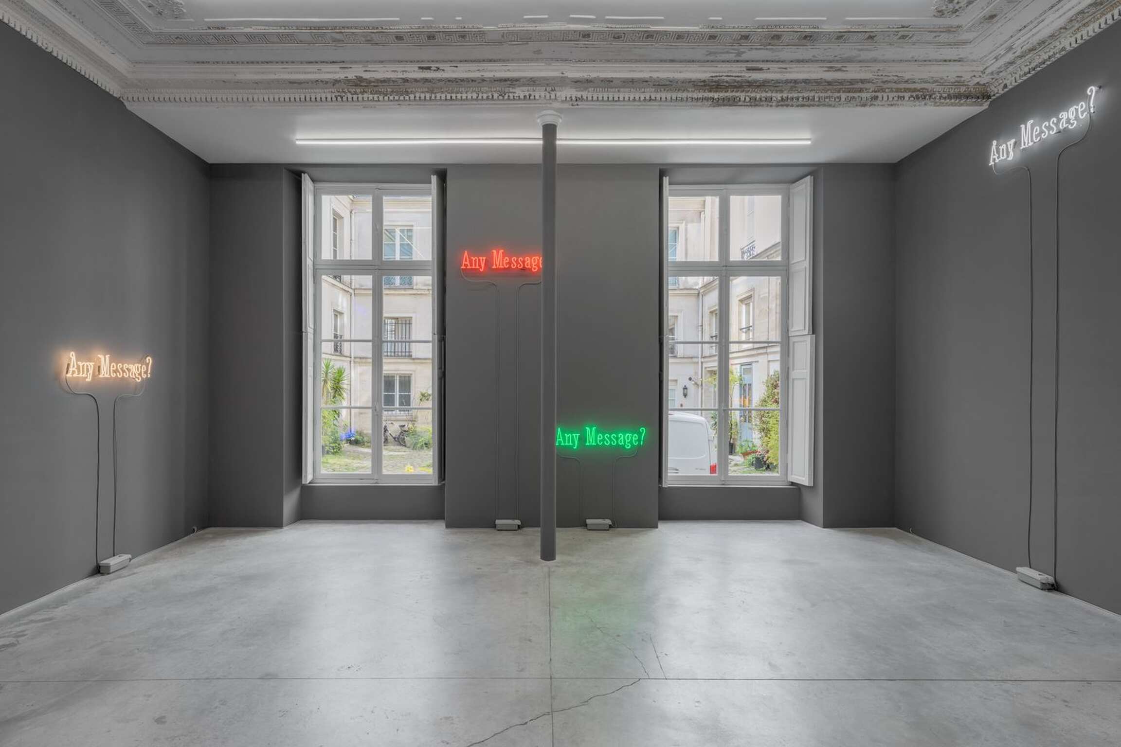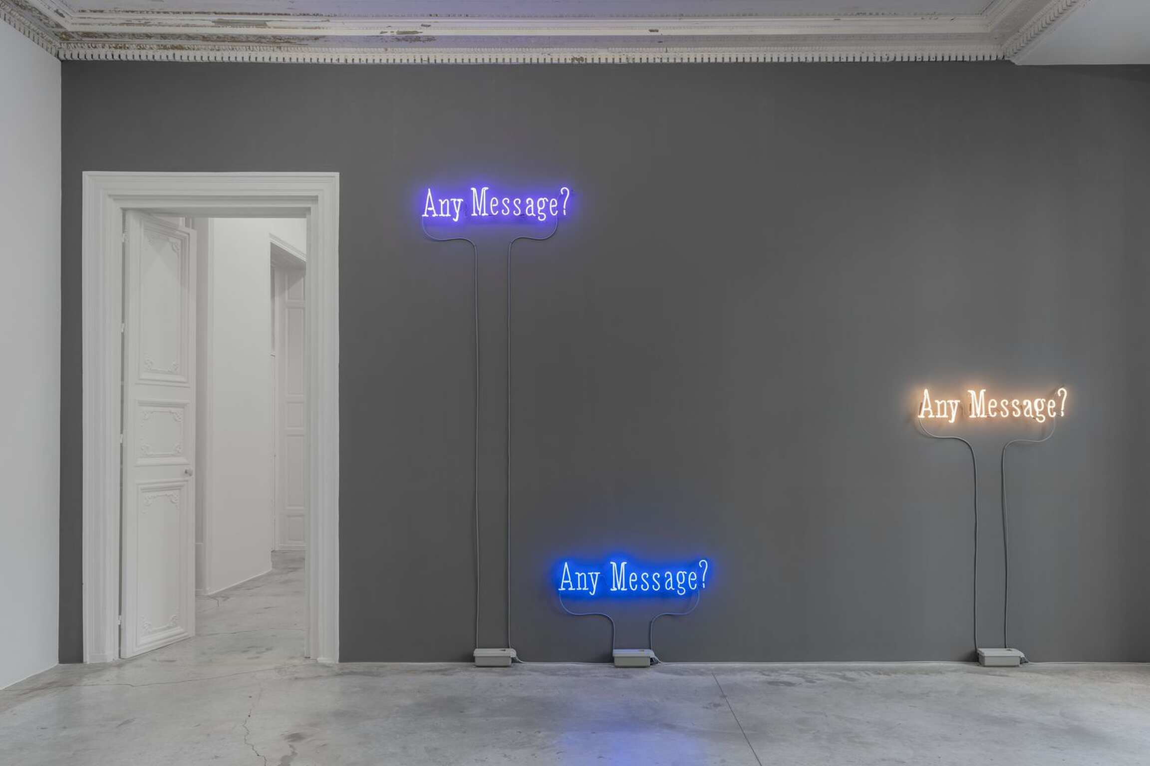 Bien sûr, ainsi qu’il en est dans les principes de sa création et de sa pensée, il n’y a ni rhétorique, ni discours mais, bien au contraire, répétée, cette question énigmatique, en néon blanc froid, blanc chaud, jaune, vert, bleu cobalt, orange, violet : Any message ? Y-a-t-il un message ? La réponse n’est pas formulée et cependant, à partir de la question, le sens se met en marche. Il nous projette dans l’expérience essentielle de Joseph Kosuth qui est de « travailler sur les relations entre les relations ».