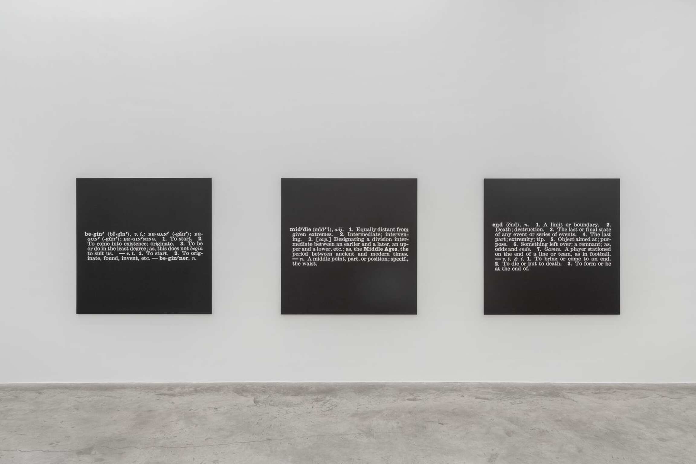 À Paris, l’exposition de Joseph Kosuth, chez Almine Rech est une exposition secrètement et profondément émouvante. Nous sommes en face d’œuvres anciennes (1968) comme d’œuvres récentes dont le choix, la composition dans l’espace sont d’une extrême actualité. Celle de l’artiste comme celle de la société, en péril, dans laquelle nous vivons.