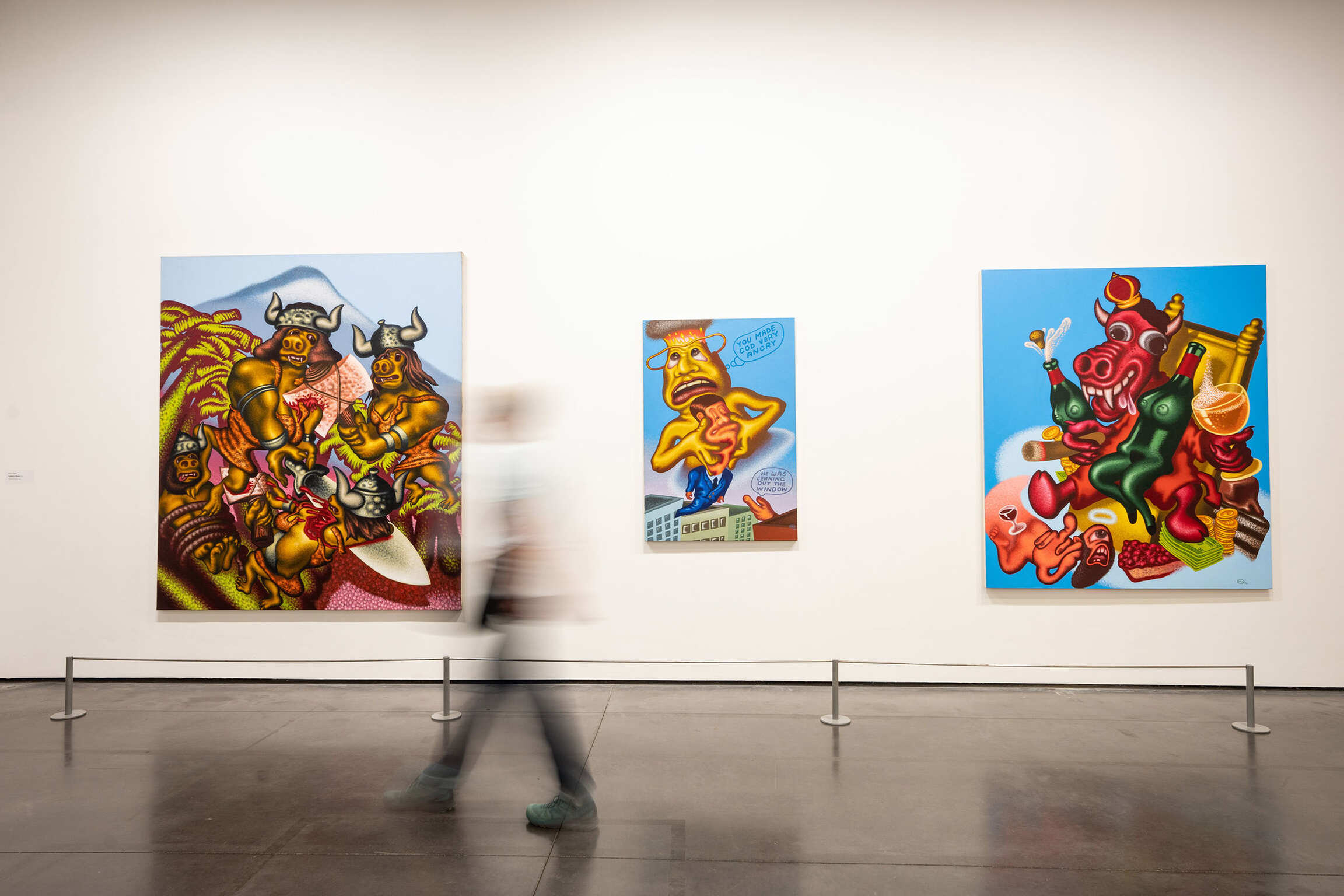 Surprisingly, his career began in Paris in the early 1960s. This was where the artist created his first artworks reproducing superheroes, comics, and everyday objects from the “American Way of Life”. Peter Saul’s work expresses the quintessence of American art. Thousands of kilometres from the epicentre of Pop Art, a movement he affirms he does not belong to, while sharing its themes, Saul offers a more critical dimension of it, questioning both the consumerist and imperialist models. Upon his return to the United States in 1964, he moved to California, the home of “Funk” art, with which his pictorial, pop, and surrealist work found an echo. The work of Peter Saul proved at once unique and groundbreaking, anticipating some of the major movements in painting. Pop in a different vein, dazzling Funk, his art is a new way of making historical painting with the colours and clashes of today, just as his way of rewriting the masterpieces of painting prefigures Bad Painting and its success in the 1980s. Consistently attentive to the chaos of the world, the America of “celebrity” presidents from Reagan to Trump, but also the environment, junk food, cigarettes, etc.