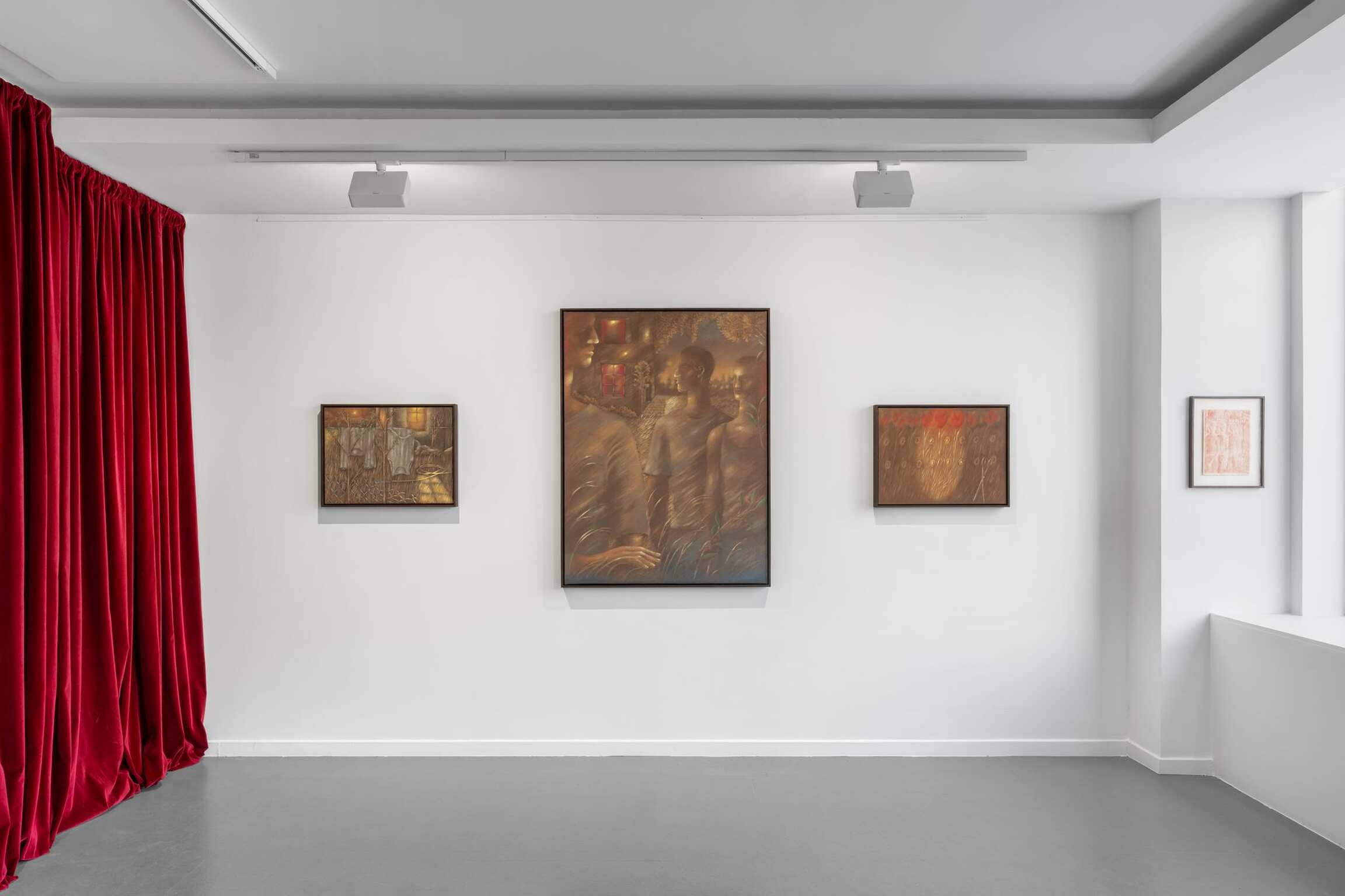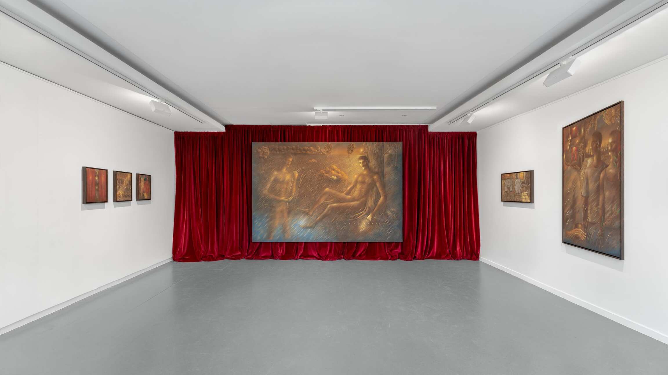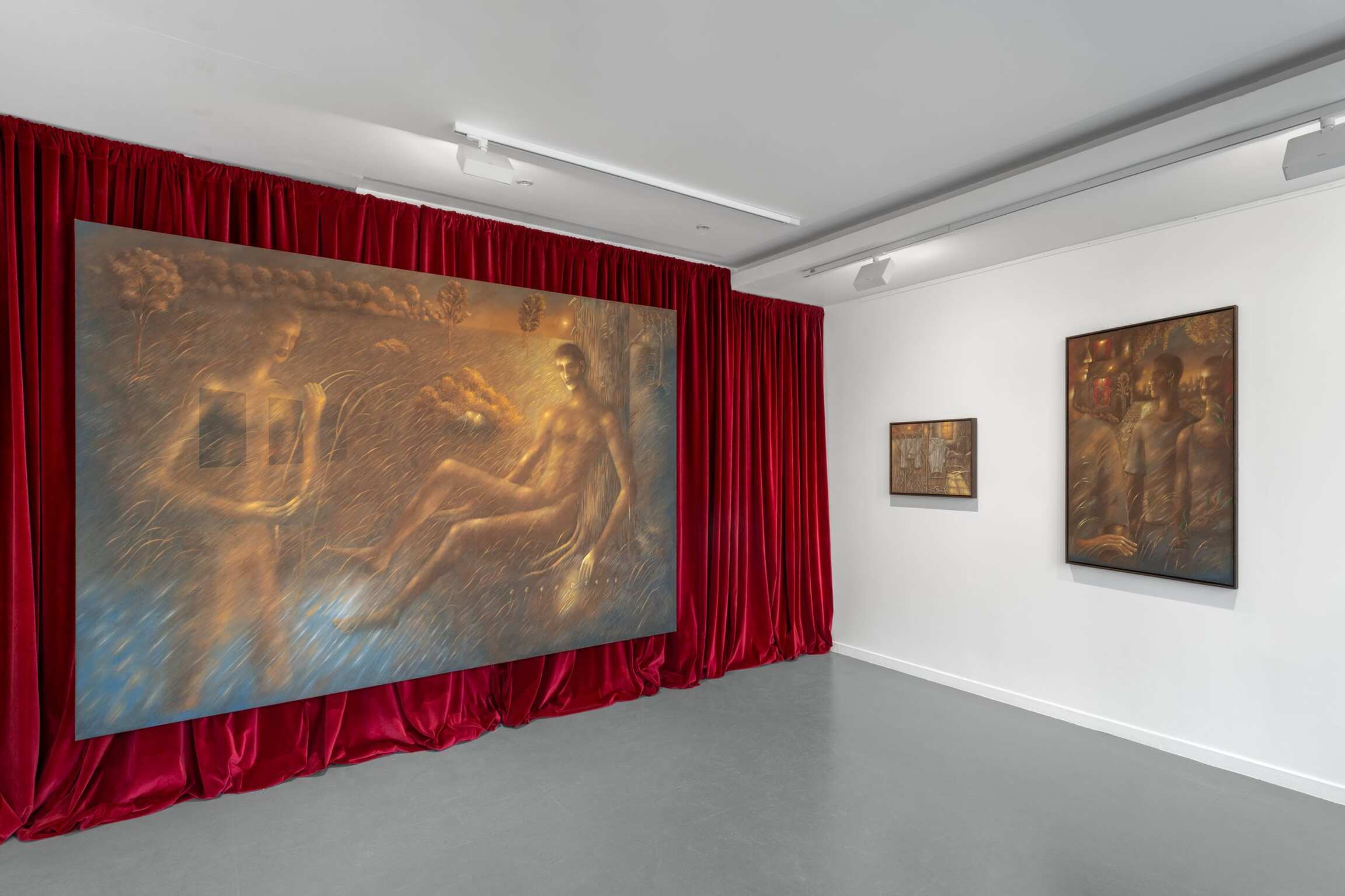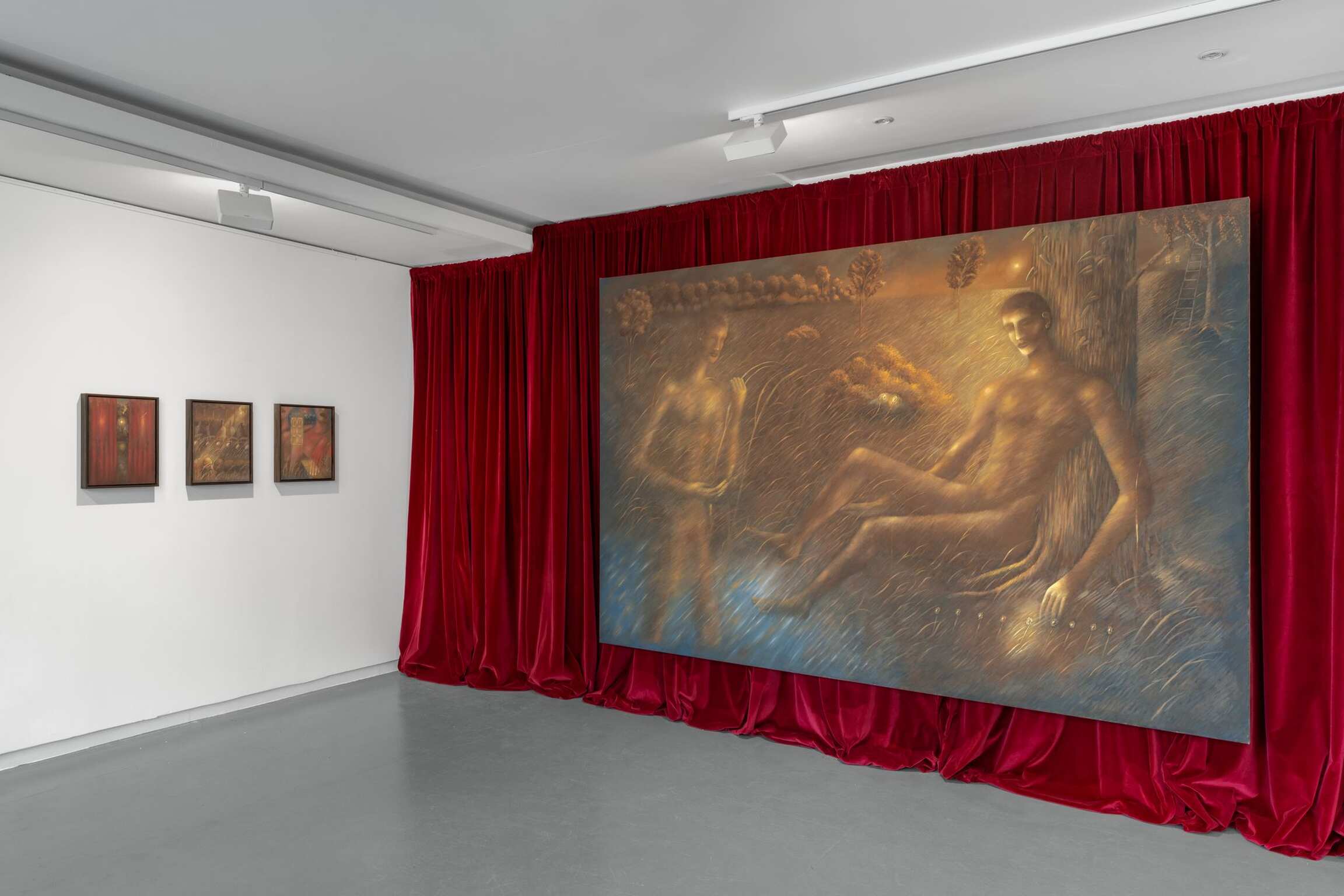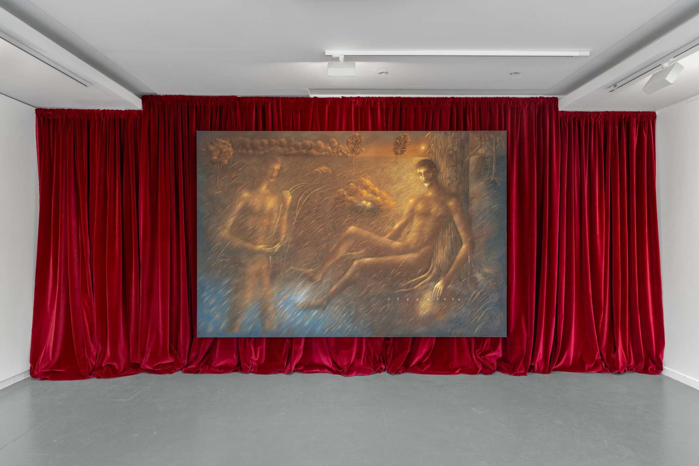 So, for example, in one of his new paintings we see three rows of flowers, two daisy-like, one tulip-like, popping up between blades of grass at regular intervals. Too regular to be natural; not precise enough to be machine-made. Each rendition of each flower-type the same, but a little different. Different in tone, in angle, and in a central passage that appears to be rather theatrically spotlit. As if to remind us that there is nothing natural about this scene, that it belongs as much to the stage and the screen as it does to the great outdoors, however natural the gold-tinged flora and fauna may appear. A pair of scissors, blades akimbo, seems to have danced into the lowest row of daisy-type flowers, its shears mirroring their stalks, its finger-holes their heads. At a first glance it might seem another part of a regular whole, rather than a sinister surreal form. The painting is innocently titled: Dans le jardin (2025). Which makes it seem more sinister still. The spotlight now perhaps a searchlight, patrolling for who knows what. A psychoanalyst would, literally, have a field day. And the artist too is open about the way in which his work is the product of both conscious and unconscious thought.