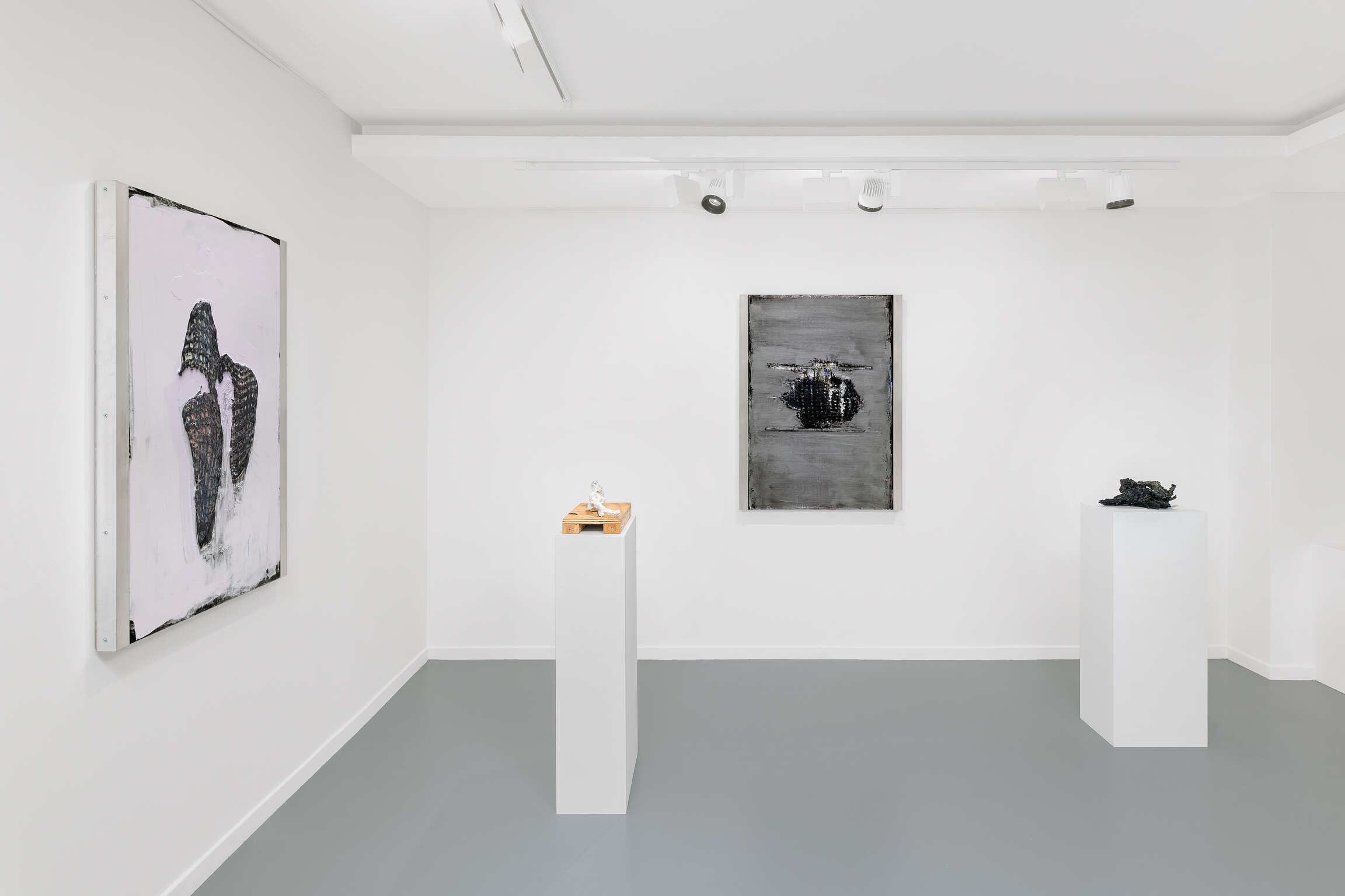 Ce qui nous amène aux œuvres récentes, avec leurs zones de relief caractéristiques, composées de résine époxyde perforée rappelant le mastic et collées au centre de la toile. Ces formes évoquent d’étranges fragments de matière organique, déchets chirurgicaux ou prélevés dans la gueule d’un animal – une autre espèce de trophée (c’est d’ailleurs le sens original de la spolia, butin de guerre) à laquelle Lindman confère une touche de noblesse par un encadrement extérieur en barres d’aluminium et un encadrement intérieur en bandelettes de tissu.