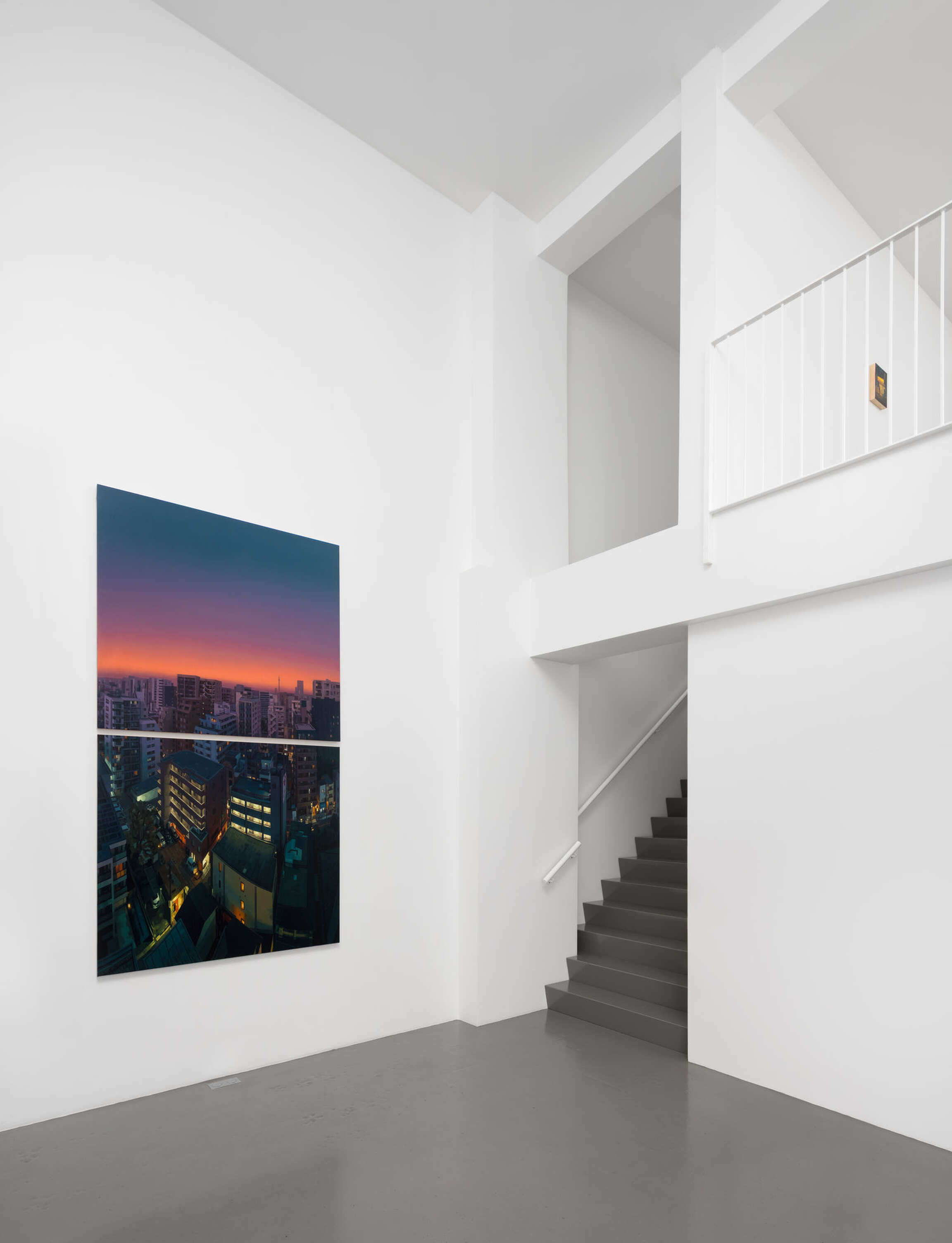 Morimoto’s cityscapes are painted with countless tiny strokes, dissolving into abstract chaos when viewed up close, yet settling into an almost perfectly photographic stillness when seen from a distance. A mysterious effect that suspends time. In a single breath, something emerges and something disappears. Dissolved into the surroundings. Nearly erased. Yet enough is left behind for us to navigate. For absence lingers as a presence within us. As an atmosphere. As portraits of loneliness. Our loneliness.