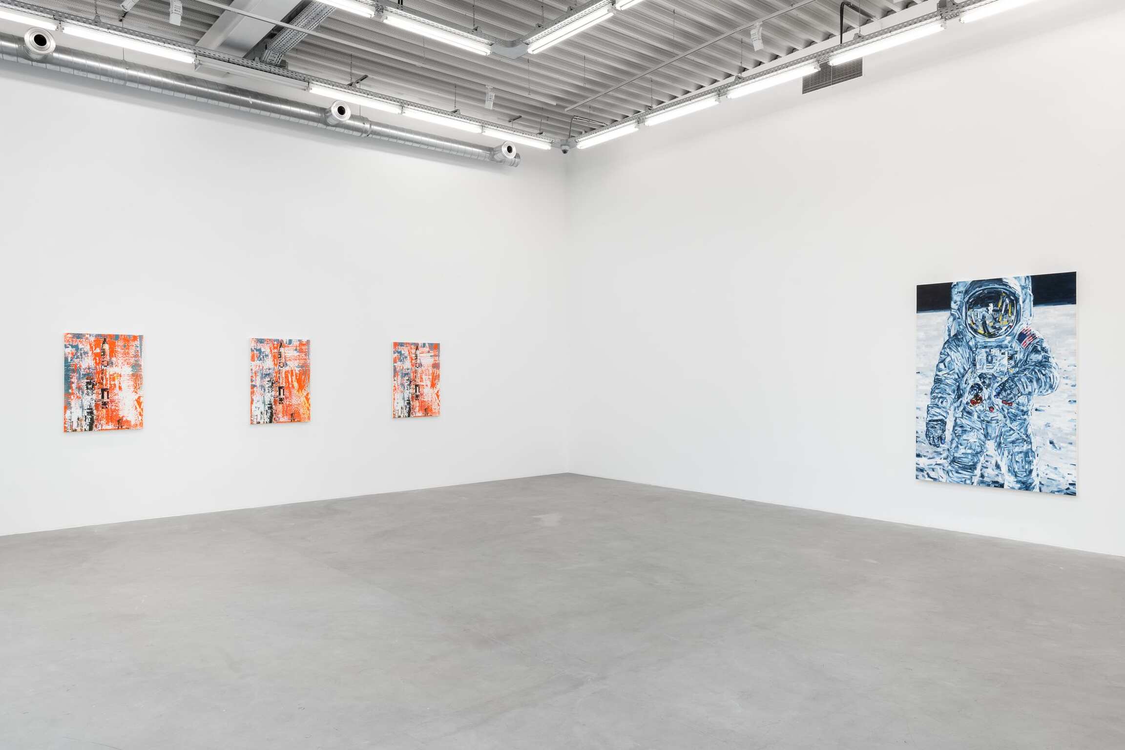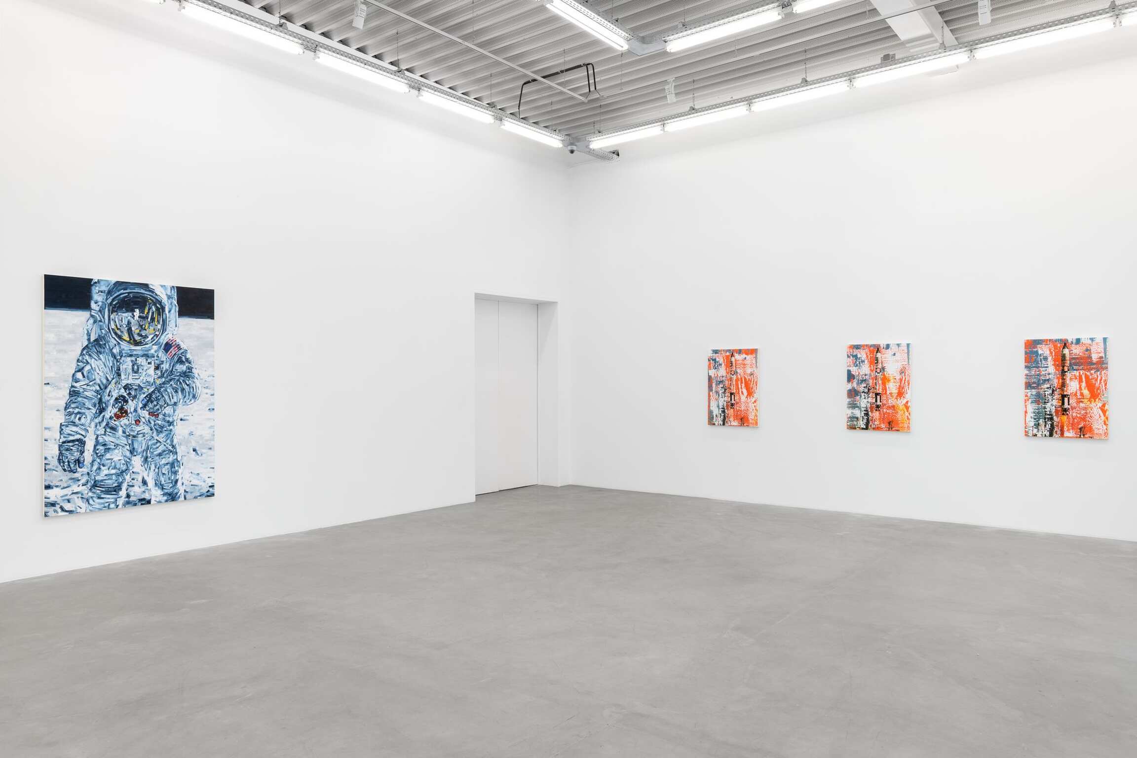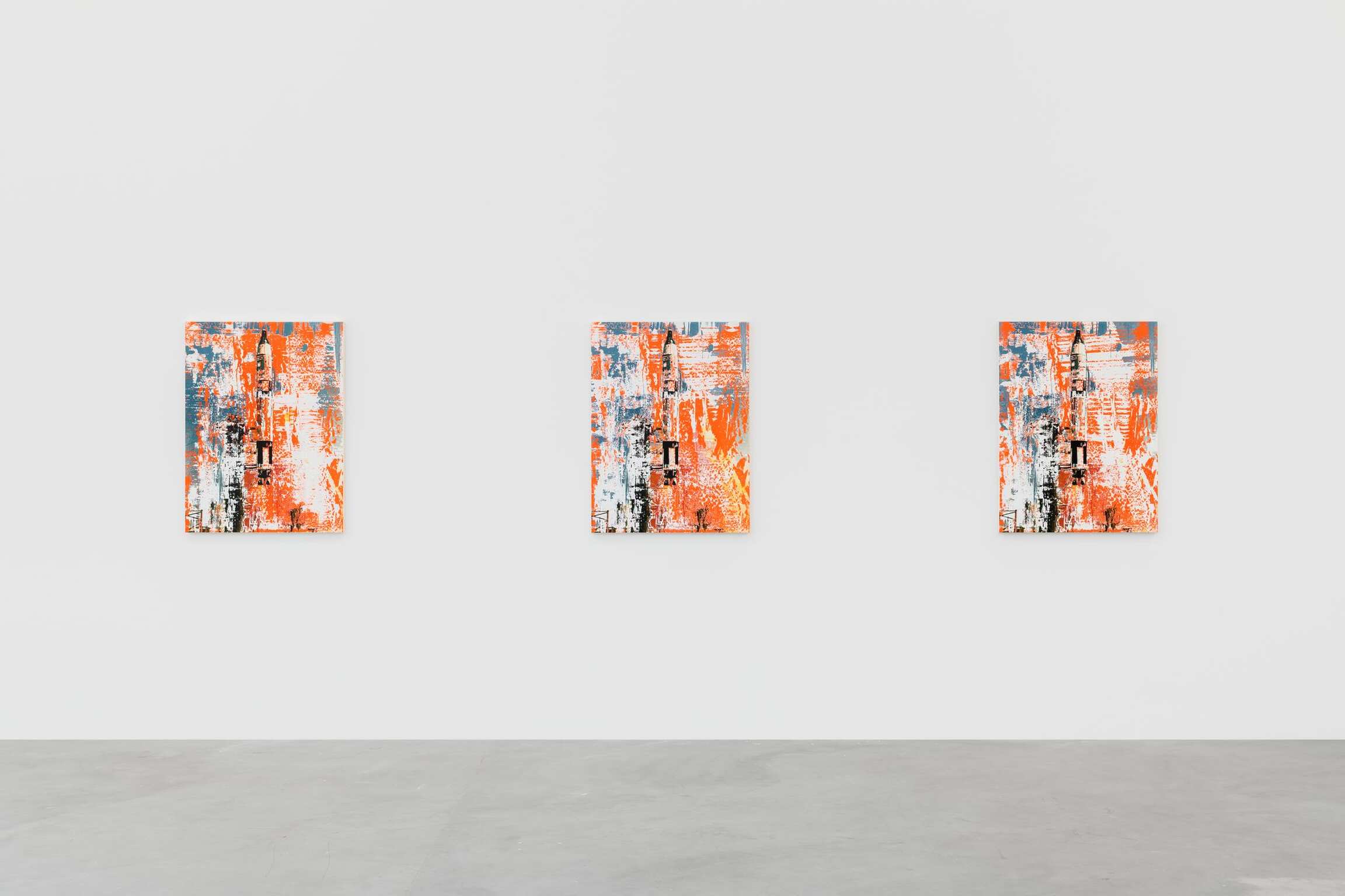 The fact that Michael Kagan’s exhibition, “How We Remember,” is hung as though in a place of worship speaks to the reverence from which this body of work was conceived. Six Titan rockets are displayed in trio across from each other. With anticipatory thrust, they begin with the Gemini mission. This depiction arises from enamel silk screen on linen with oil paint on top. A sextet of identical images all squeegeed differently. Fragmented by the happenstance of mark-making, signifying the astonishment of their creation. A famous NASA saying goes let’s light this candle in preparation for the immanence of a launch. Words given flight. The rockets themselves represent candles - six rockets in a confluence - one for each of the Apollo missions that landed on the moon. Almost like a Yarhzeit candle that is lit on the anniversary of someone’s death in Judaism. Godspeed Ed White. Godspeed Gus Grissom.