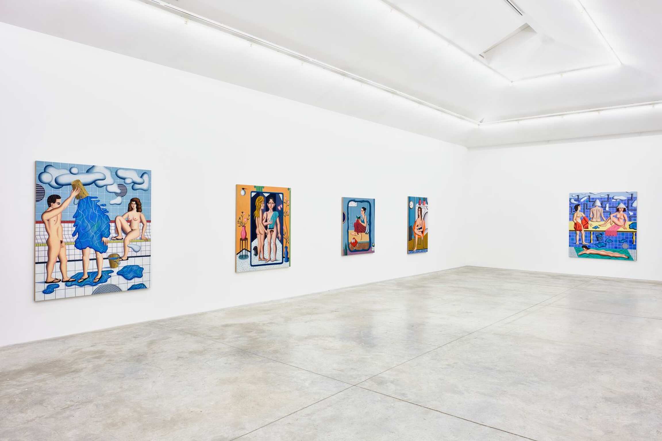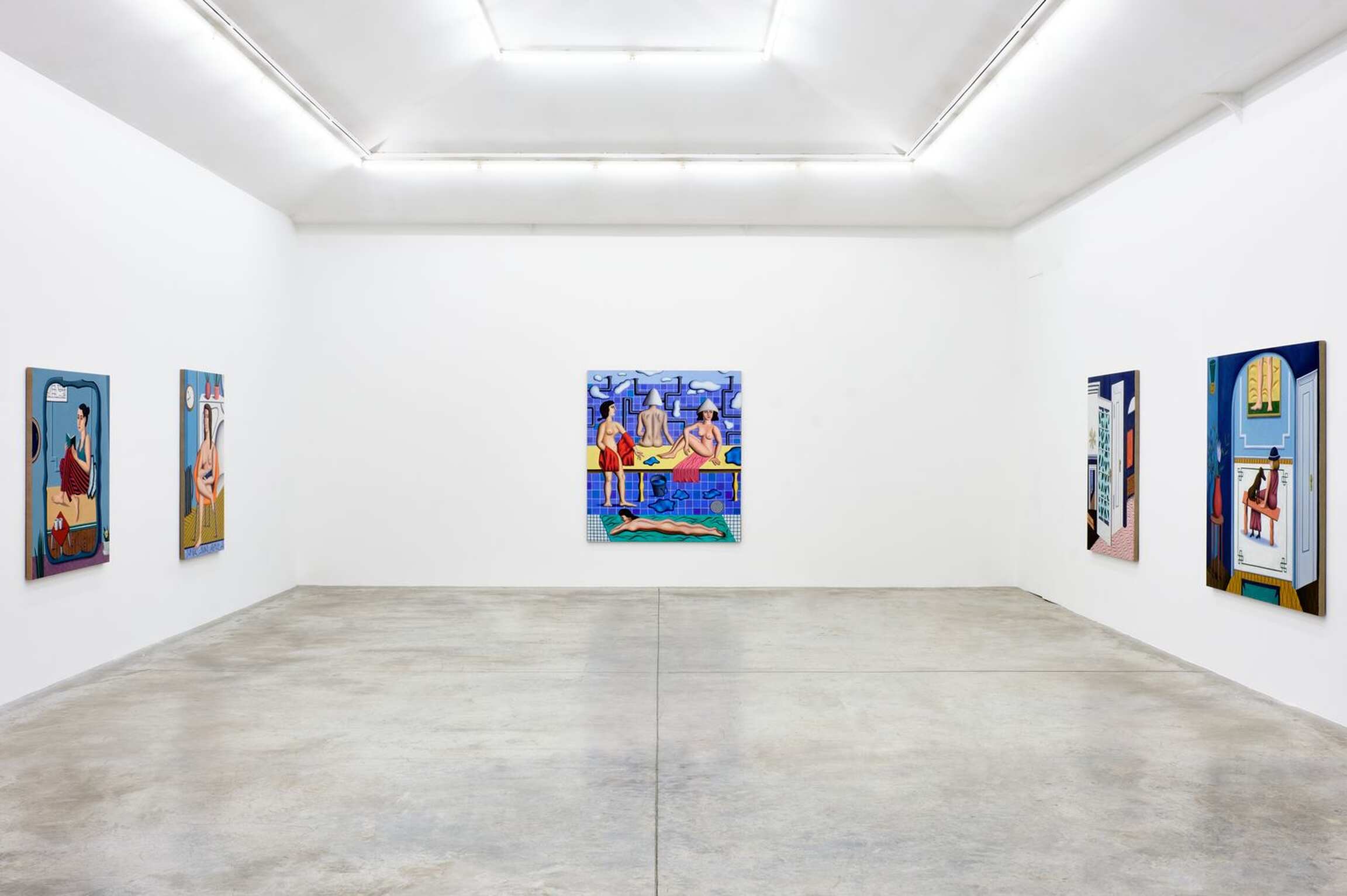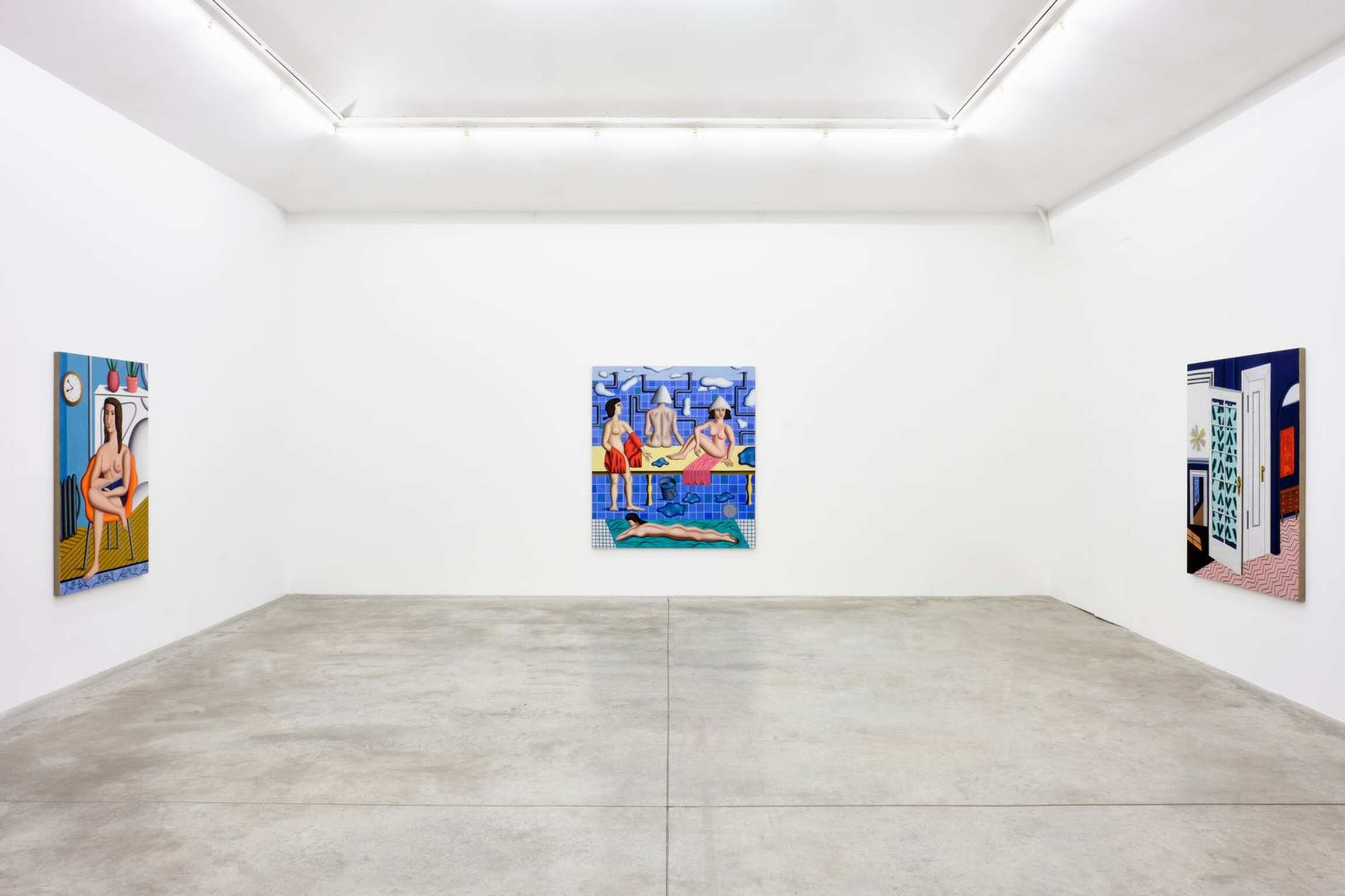 Comme cela a souvent été noté, il n’y a pas de système de hiérarchie entre les éléments qui composent le tableau et un tuyau est traité avec une même intensité qu’un personnage ou un élément de mobilier ou de décoration. Chaque élément est amené à un niveau d’équivalence qui invite à regarder ces peintures dans leur dimension abstraite. Invitation que Gardner souligne en faisant usage d’aplats, parfois de grilles ou de lignes qui font prévaloir la composition sur la narration. Quelques-unes des toiles exposées dépeignent des scènes de bains publics, et Jonathan Gardner raconte que ces scènes sont nées du souvenir d’une après-midi à la Russian Bath House