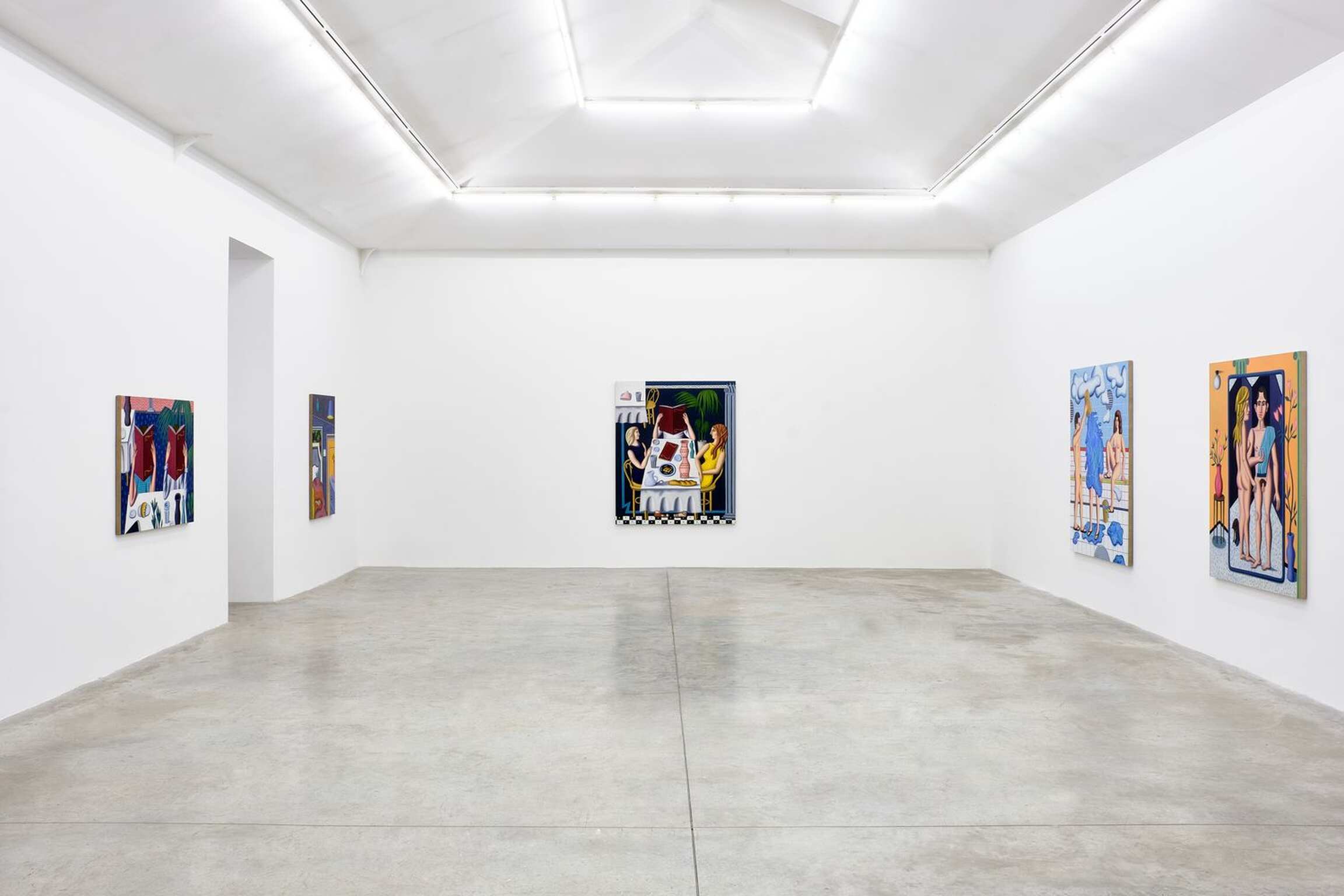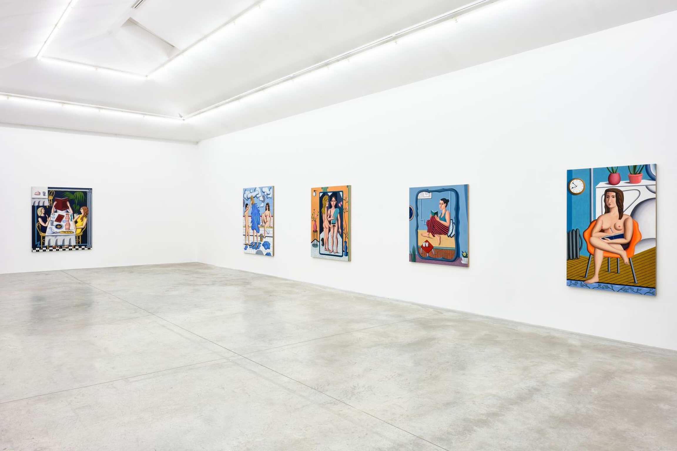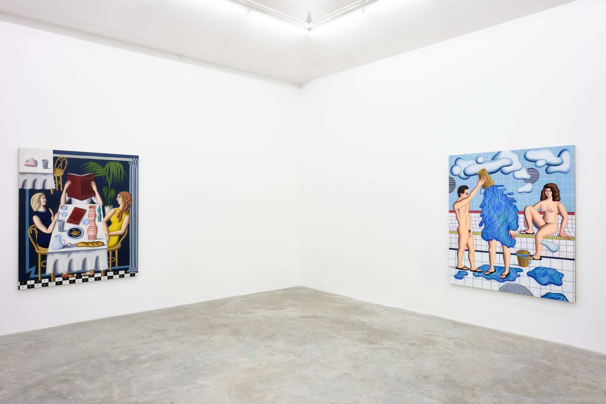 Comme cela a souvent été noté, il n’y a pas de système de hiérarchie entre les éléments qui composent le tableau et un tuyau est traité avec une même intensité qu’un personnage ou un élément de mobilier ou de décoration. Chaque élément est amené à un niveau d’équivalence qui invite à regarder ces peintures dans leur dimension abstraite. Invitation que Gardner souligne en faisant usage d’aplats, parfois de grilles ou de lignes qui font prévaloir la composition sur la narration. Quelques-unes des toiles exposées dépeignent des scènes de bains publics, et Jonathan Gardner raconte que ces scènes sont nées du souvenir d’une après-midi à la Russian Bath House