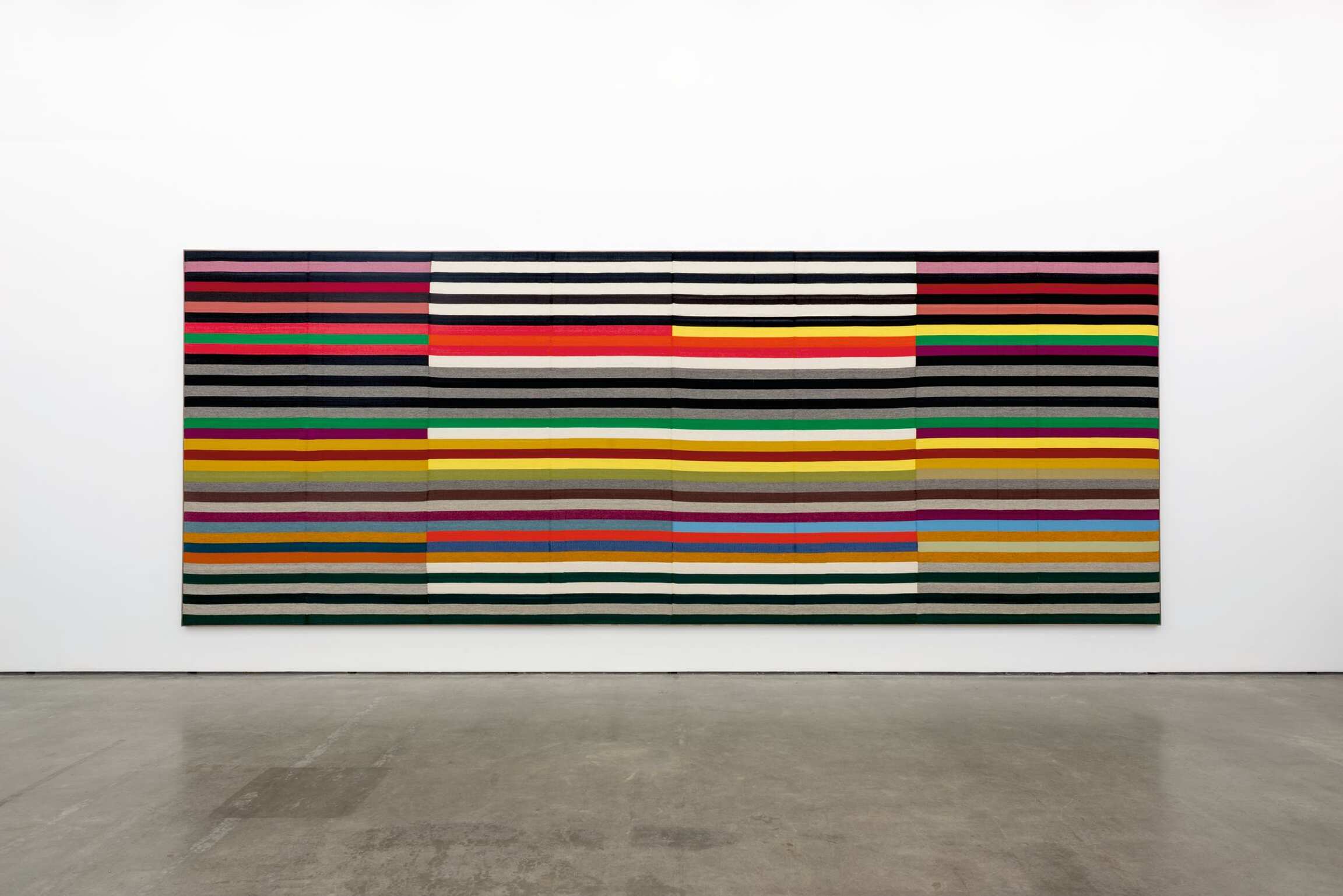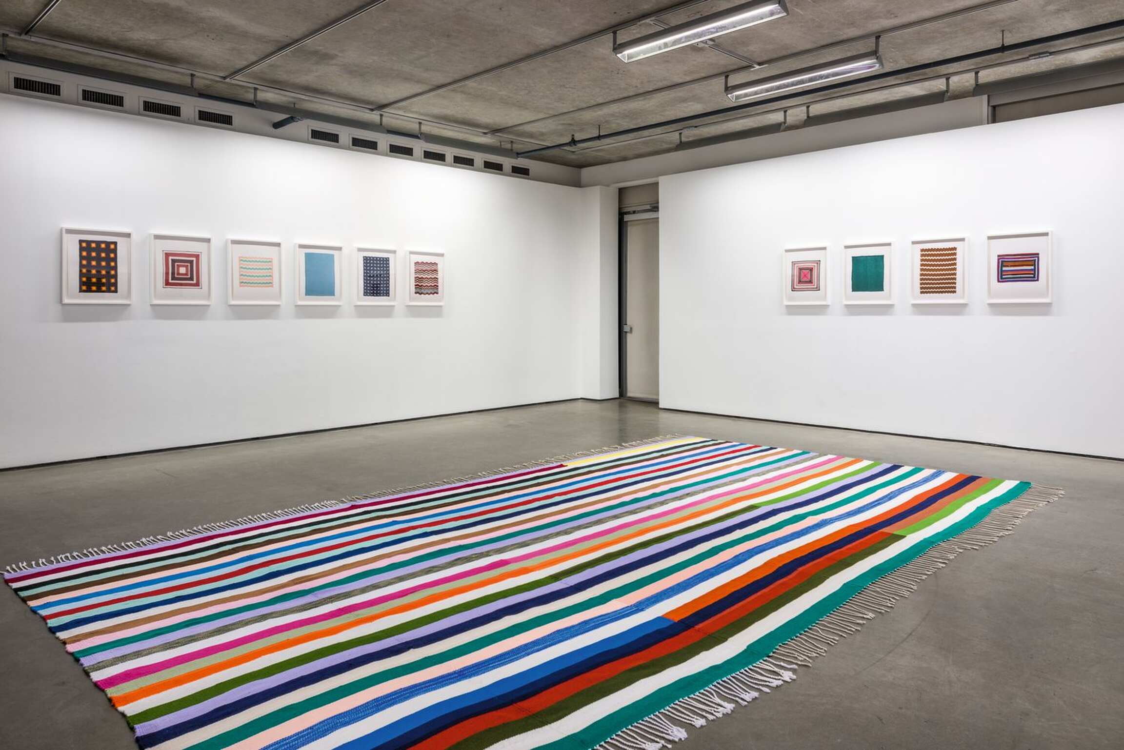 Two Scores is a solo exhibition of ambitious new work by Vancouver-based artist Brent Wadden, his first in a public institution. Presented across both spaces, Two Scores is dominated by singular woven statements upon the floor and walls. In their dramatic scale and graphic simplicity, they mark a point of departure for the artist, but might also be said to reveal both an unseen structure and a complex set of tensions that quietly anchor Wadden’s ongoing practice as a whole.
