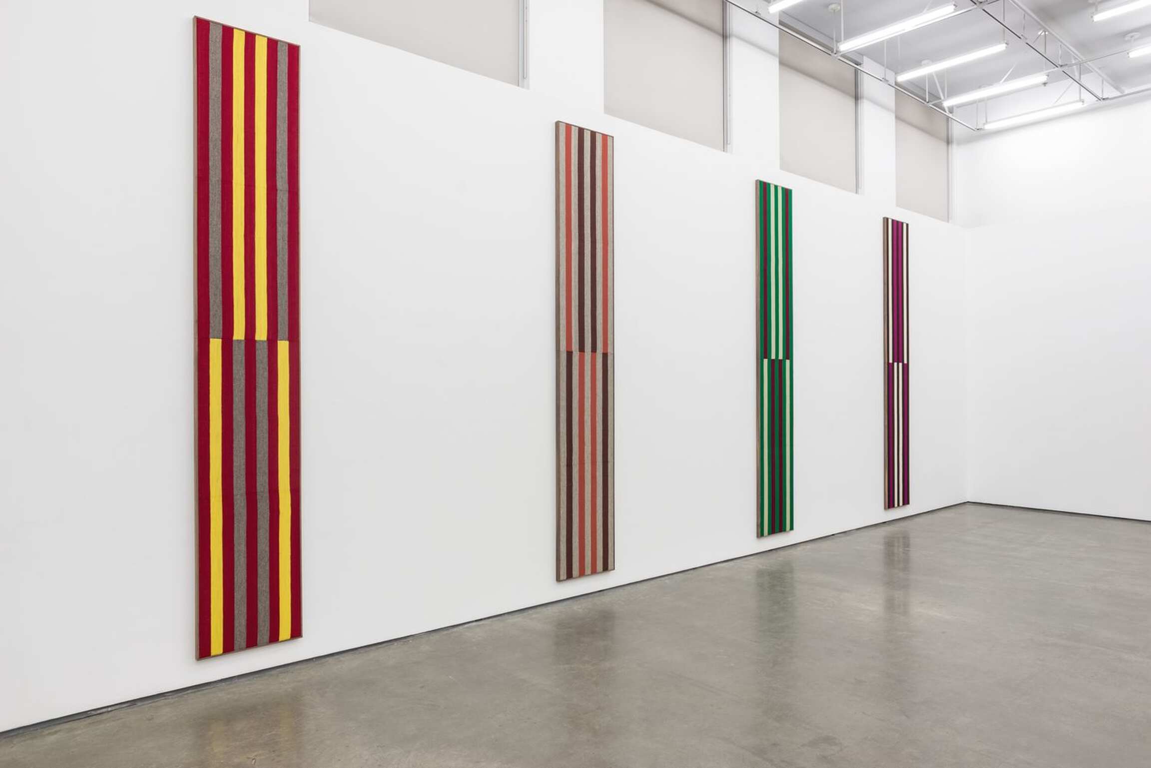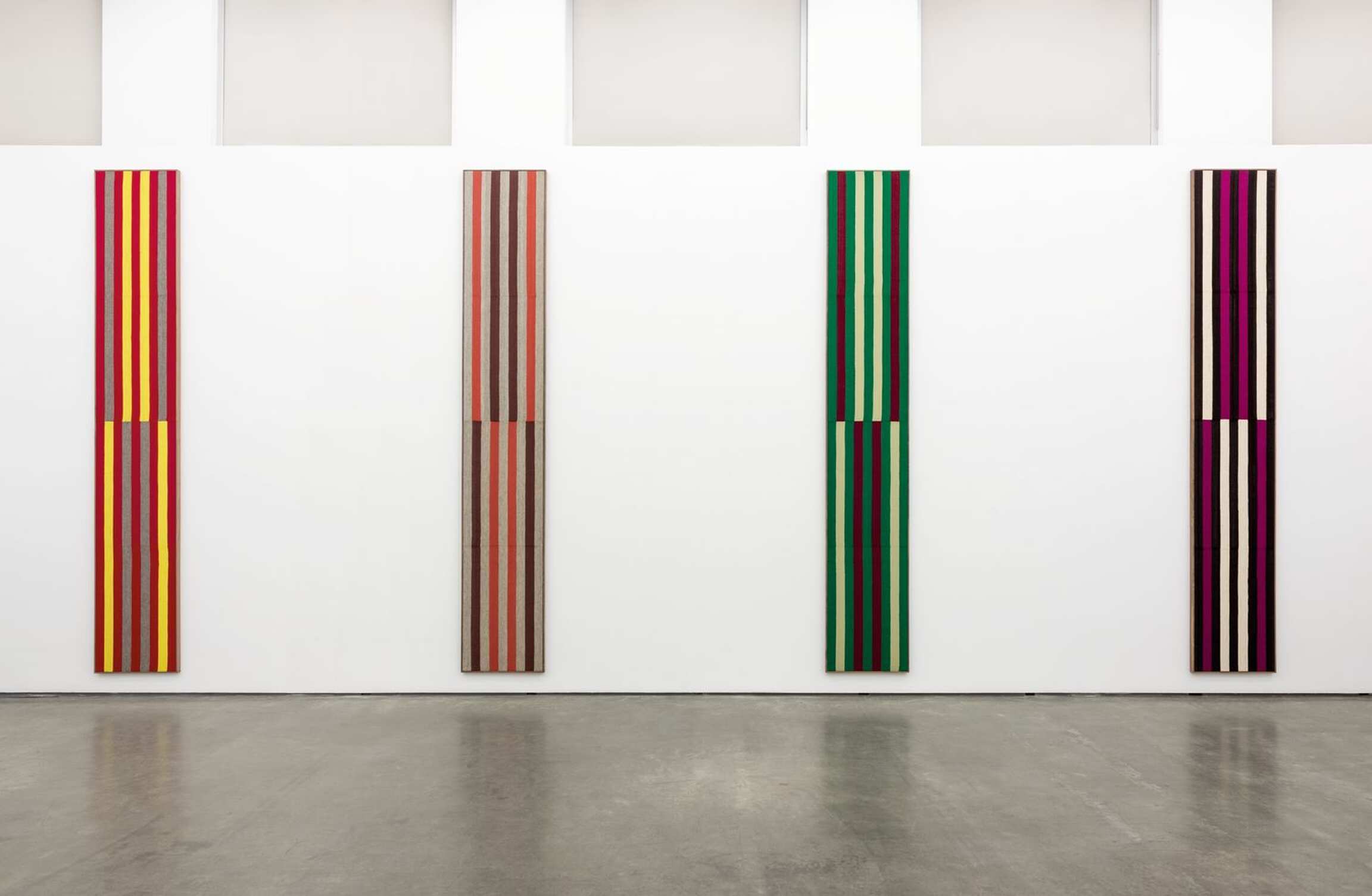 As a self-taught weaver, Wadden’s process is exploratory, laborious and purposefully naïve. His solutions are often inefficient – they would confound a traditionally-trained practitioner – and his technique frequently fails to take advantage of the loom’s economy of means. Unlike in painting, where an artist is able to apprehend the entirety of the canvas at once, weaving on a loom involves rolling the textile as it is produced, such that the weaver is only able to see the full panel once it has been cut from the device. In weaving, as Wadden notes, one can only move forward. His textile panels are thus riddled with inconsistencies deliberately left uncorrected. These subtle disruptions create a complex material surface that insistently reveals the presence of the artist’s hand (albeit paradoxically) through the mechanical nature of the weaving process itself. Furthermore, as the works in Two Scores make clear, Wadden’s paintings are very rarely produced from a single panel of cloth, but more often assembled from multiple panels stitched together at the selvedges. Thus the pictures themselves are not composed until the near end-point of production and reject, as textile historian T’ai Smith has remarked, ”a preconceived masterplan.” In this way too, the artist purposefully undermines the optical rigour of his compositions – along the panels’ seams, the forms do not always line up, producing visual glitches that force, to quote Smith again, “the threads of that moment to meet head on, to form a clash, a resonating buzz of terms.”