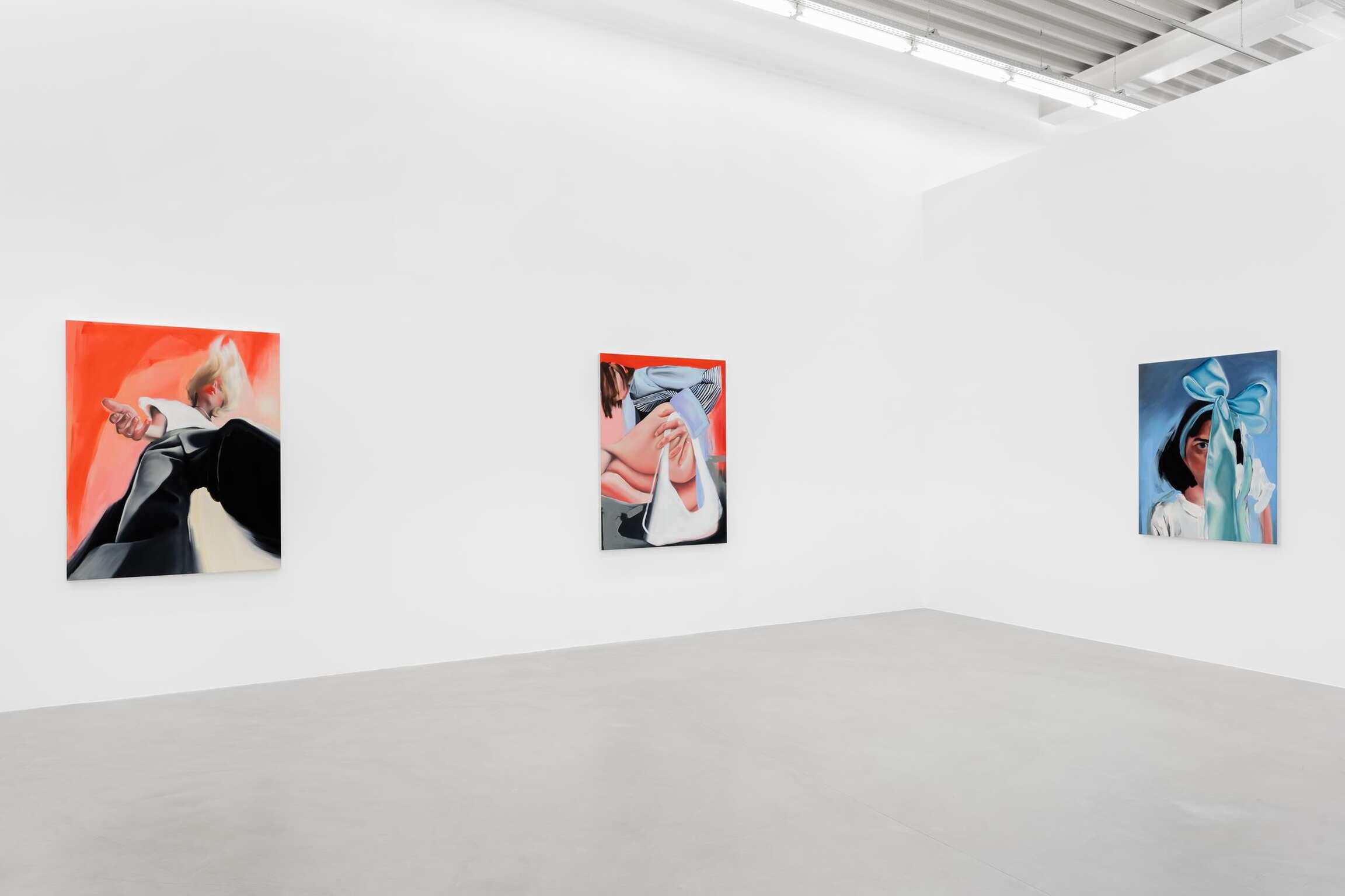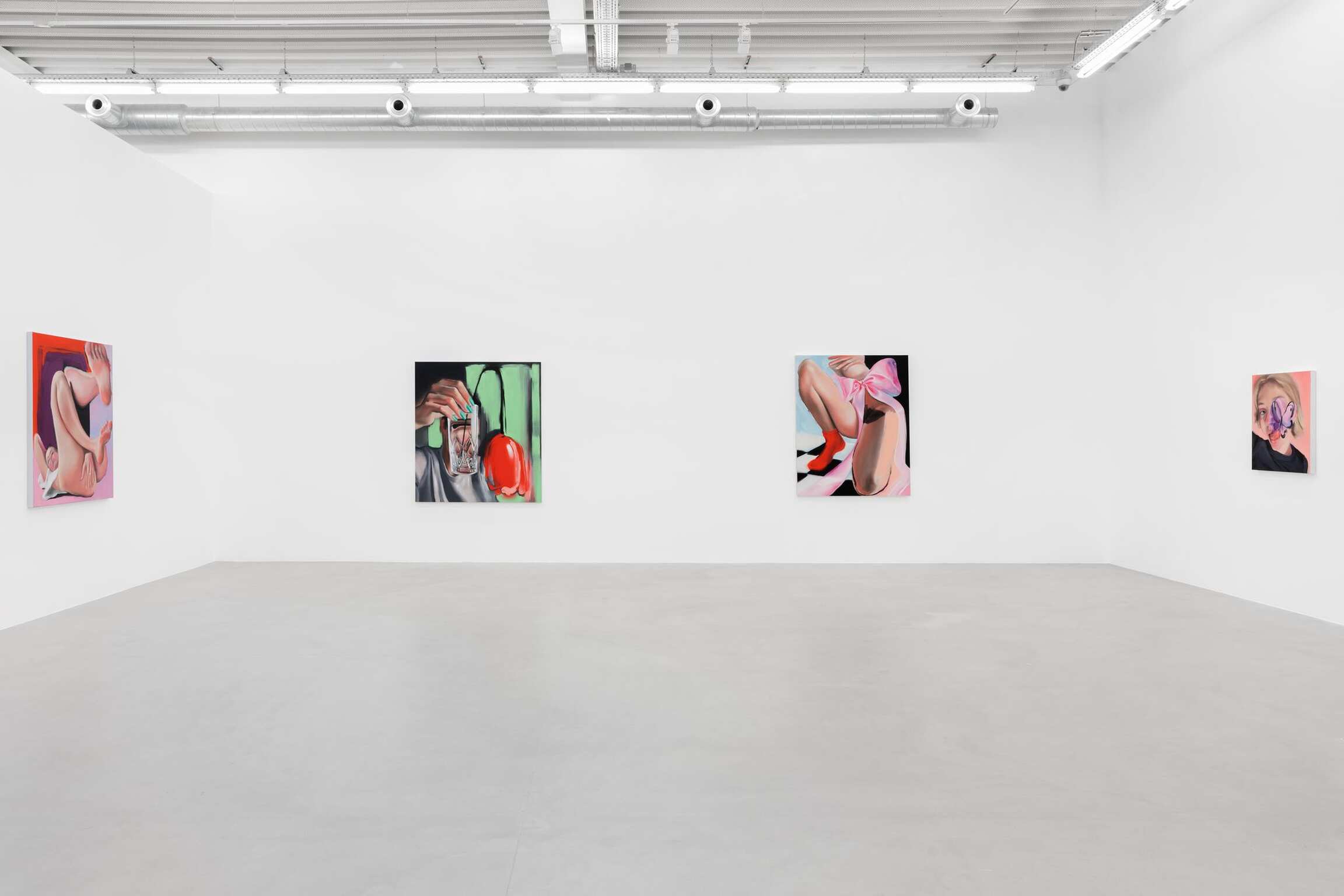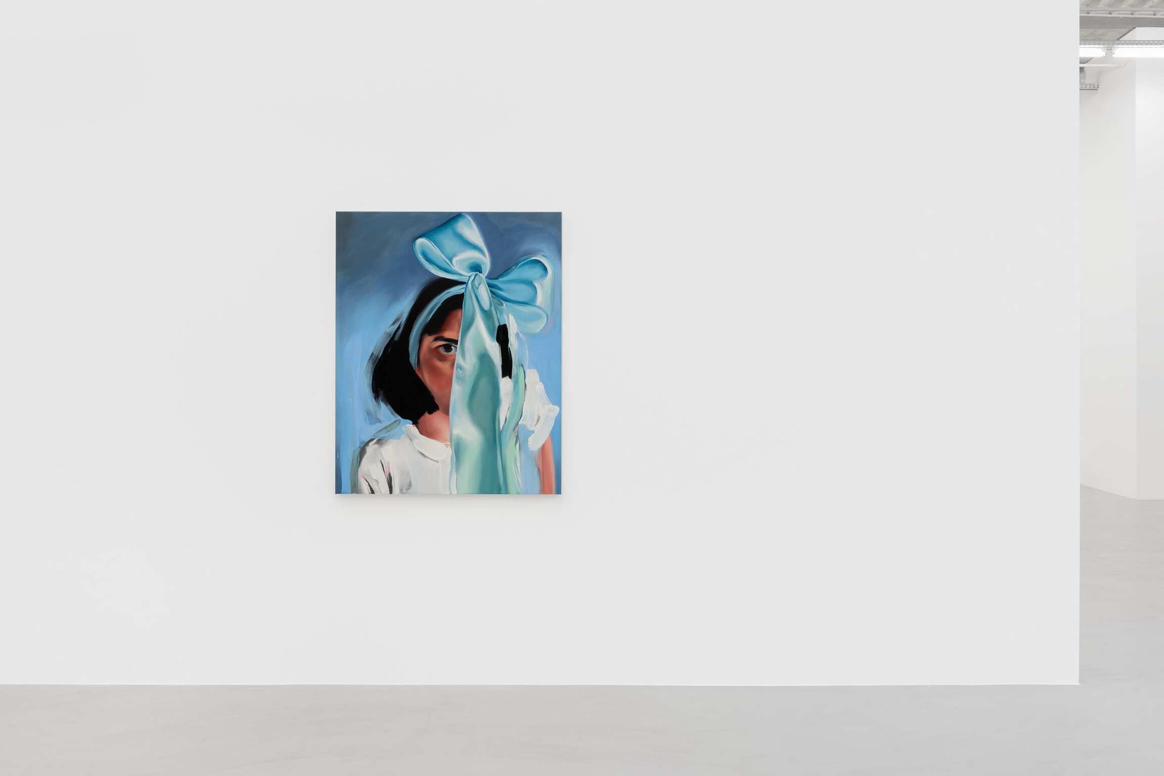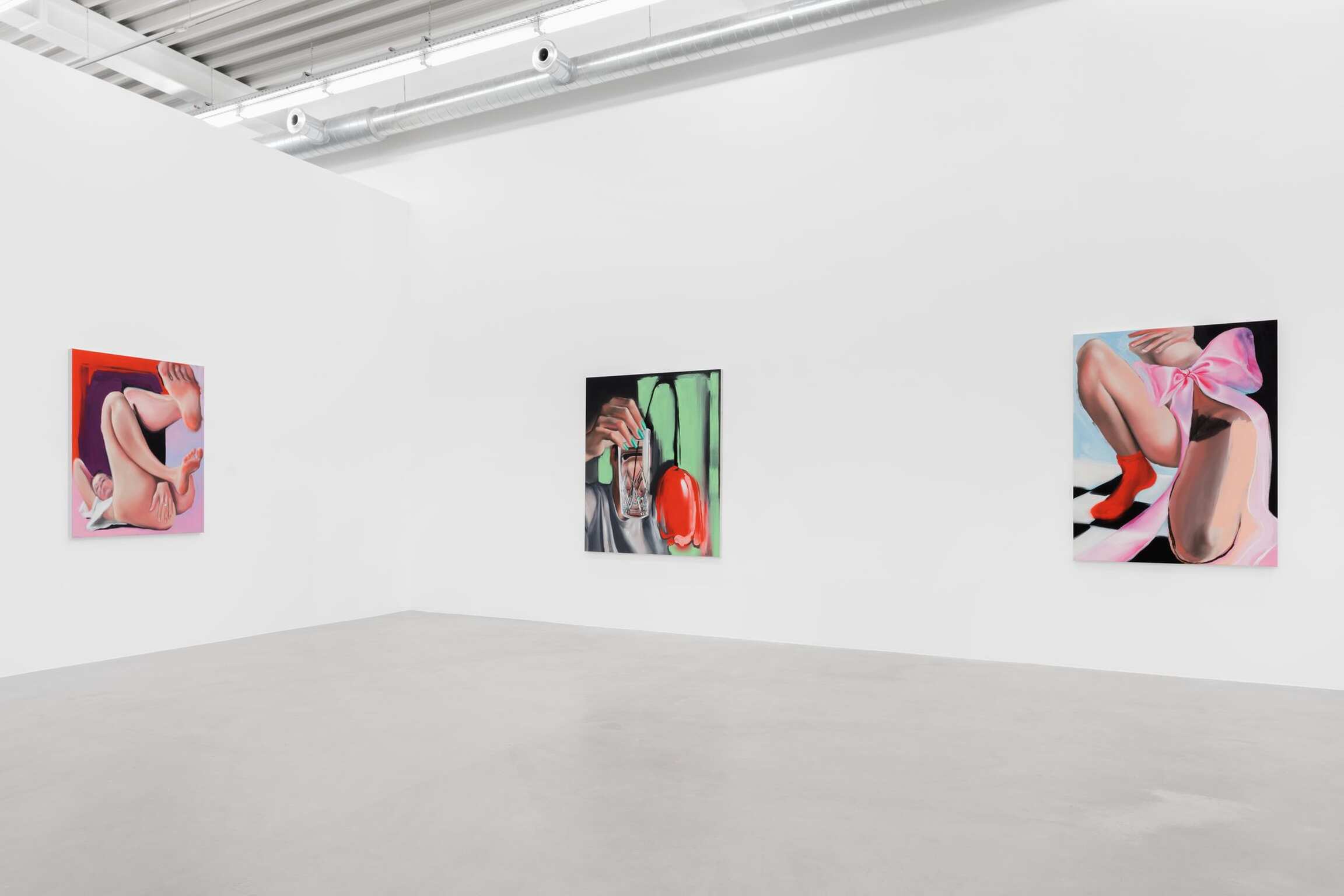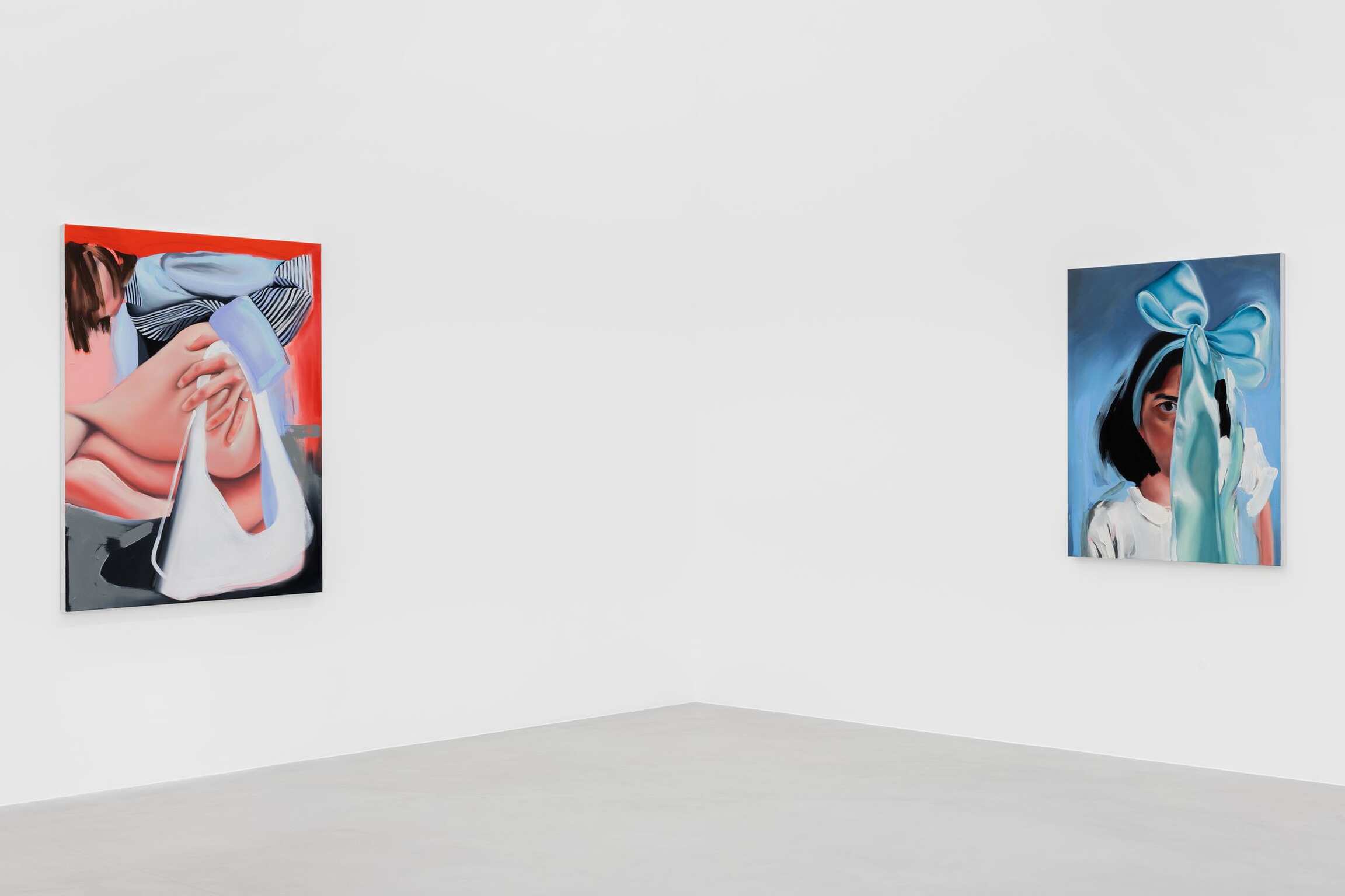 Une silhouette étendue, main derrière la tête, tête tournée de côté comme pour vous regarder, le cou tordu. Longues jambes maigres, puis grands pieds, déployés face au spectateur, sur un fond de couleur brumeux, avec cette dynamique de la perspective déformée pour laquelle Wall s’est fait connaître. Pieds qui s’avancent vers vous, directement, orteils qui tiendraient dans votre bouche. « Il y a évidemment un aspect fétichiste dans mon travail. C’est une esthétique que j’aime vraiment, elle interroge les limites de l’intimité », explique Amanda Wall. La peau, les mains, les pieds sont lisses, avec une qualité quasi-caoutchouteuse, mais pas comme la chair troublante des robots sexuels réalistes. On a ici un être vivant et respirant, ça se voit. Les peintures de Wall ont une esthétique humide qui les situe quelque part dans le domaine du gloss. Le lustre de son travail lui donne de la profondeur. C’est l’idée. Il y a cette profondeur luisante dans le portrait qu’elle fait d’un visage. Il y a cette profondeur luisante dans la manière dont Wall peint ses arrière-plans, champs de couleurs où flottent les personnages. Dans un autre tableau, la figure aux longues jambes s’étend encore, cette fois-ci dans une bouée gonflable. Rouge et rose, le jouet n’est ni donut ni flamant rose. D’un côté de la toile, un effet de clair-obscur : les ombres créent une impression d’espace tridimensionnel, la figure est plutôt réaliste ; de l’autre côté, moins de contraste, c’est plus pictural. Wall explore cette idée de mondes divisés, bifurcation du temps ou de l’espace, avec pour seuls témoins ce visage au ruban qui vous fixe d’un seul œil pénétrant, et ce corps accroupi. Avec cette profondeur luisante, une main, les ongles vernis d’un vert écume patiné, tient un verre d’eau. Le verre est réaliste, presque hyperréaliste, mais contient une tulipe rouge bien trop grosse pour lui. Une tulipe rouge qui s’affaisse, telle une énorme cerise sur sa tige noire et flasque, rouge sang, accrochée là sur un fond de couleur vert menthe. Le réel cède à l’irréel. Quelque chose de fictif, d’imaginé, à côté de quelque chose que je crois avoir pu voir. Ici, il y a la place pour les deux… et on ne sait jamais exactement où se situer.