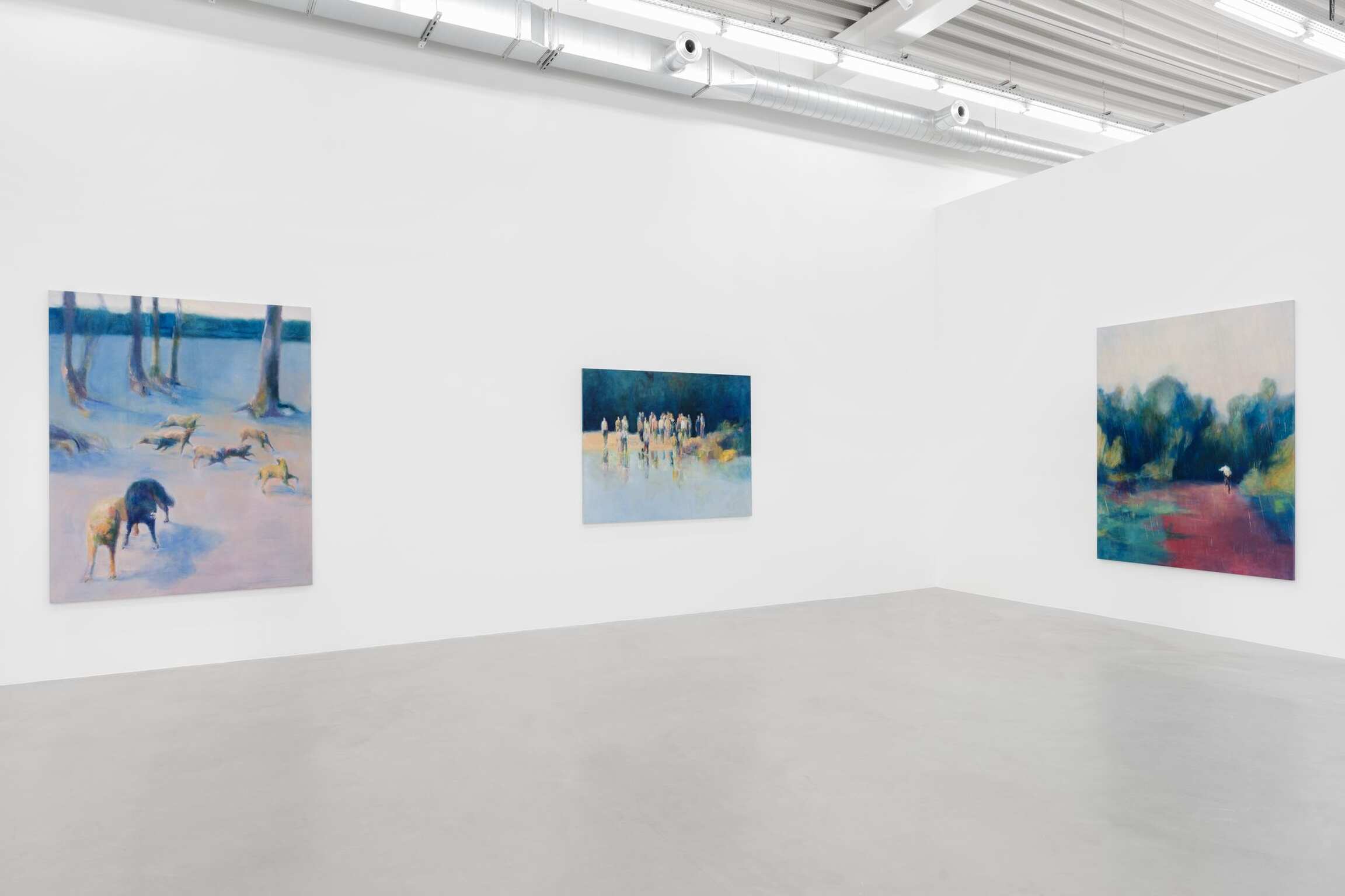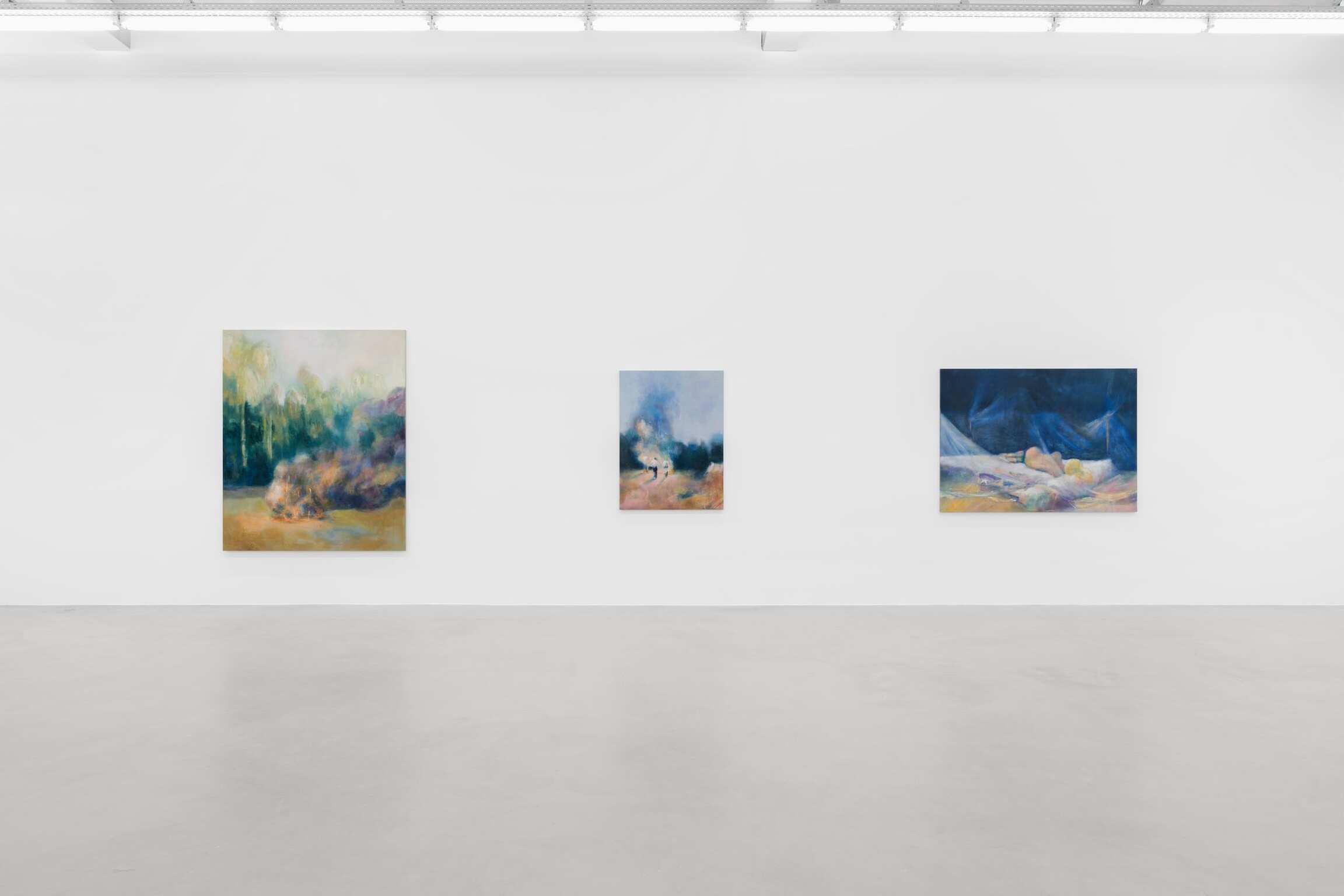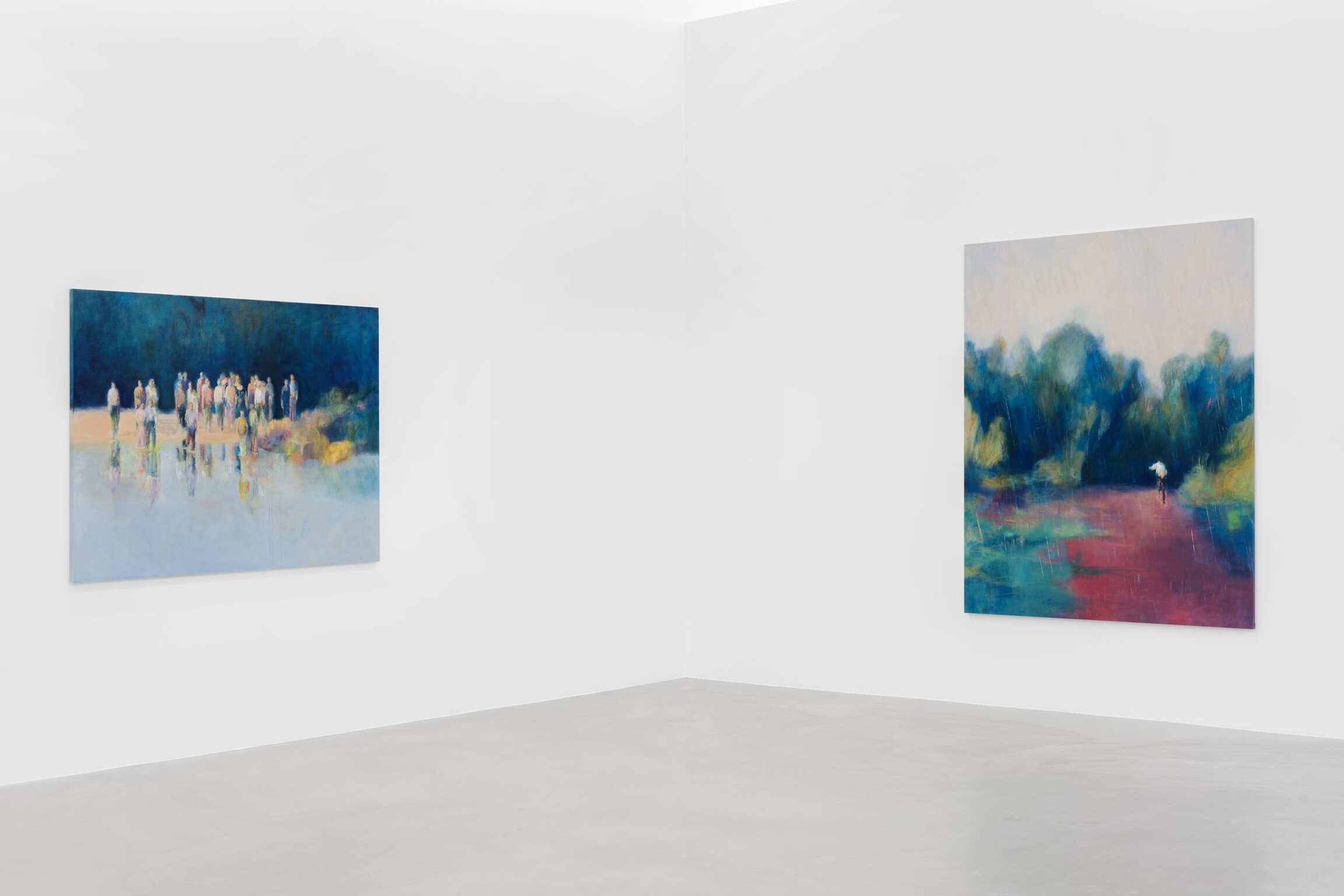 Take Shelter, paroles de mauvais augure, est le titre choisi par Paul de Flers (né en 1988) pour décrire ses œuvres récentes, peintes à Bruxelles en 2021, alors qu’une neige tardive recouvre les fleurs du printemps à peine épanouies et que la pluie battante emporte avec elle toute perspective d’un été plus clément. Le sous-titre There’s a Storm Coming attribué aux neuf toiles offre une grille de lecture pour appréhender cette deuxième exposition personnelle de l’artiste chez Almine Rech. Inspirée par le travail d’artistes allant d’Hiroshige à Mamma Andersson, en passant par Delacroix, choisis pour leur capacité poétique à décrire et célébrer le drame de la nature, la pratique de Paul de Flers n’est pas sans évoquer un certain néoromantisme. Fait intéressant, nombre de chefs-d’œuvre de l’art et de la littérature du XIXe siècle – on pense aux Ténèbres de Lord Byron, au Frankenstein de Mary Shelley ou aux ciels et marines les plus tourmentés de J.M.W. Turner - ont été produits dans le climat tout aussi extrême créé en 1815 par l’éruption du mont Tambora en Indonésie. Cette explosion volcanique, l’une des plus violentes de mémoire d’homme, a fait jaillir dans l’atmosphère depuis les entrailles de la terre tant de cendres et de soufre qu’elle a refroidi les températures mondiales et obscurci le ciel jusqu’au nord-est de l’Amérique et à l’Europe – à tel point que 1816 fût surnommée « l’année sans été ». Les ténèbres physiques de cette époque nous sont parvenues à travers l’imaginaire des artistes et des écrivains qui l’ont vécue. À l’instar de Byron, Shelley ou Turner, pour de Flers, la météorologie constitue simplement l’arrière-plan d’une histoire où se déploient des émotions humaines changeantes et contrastées, des histoires qui ne parlent jamais seulement du temps qu’il fait.