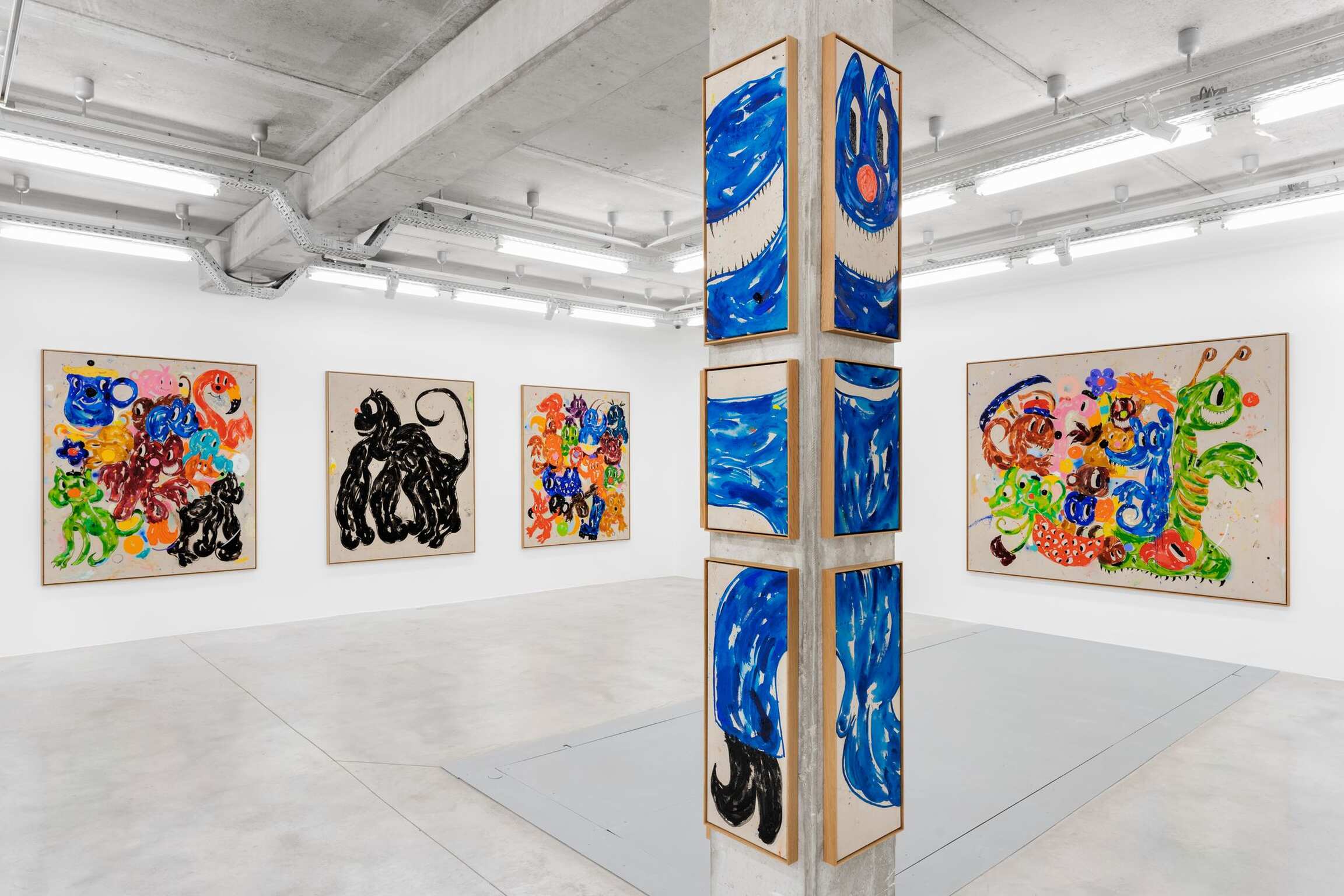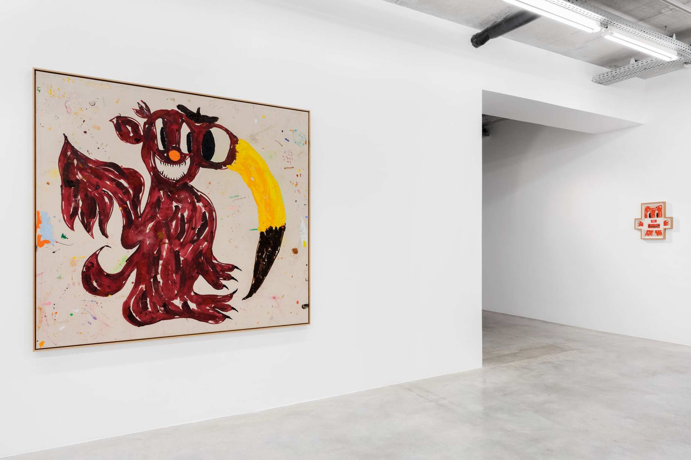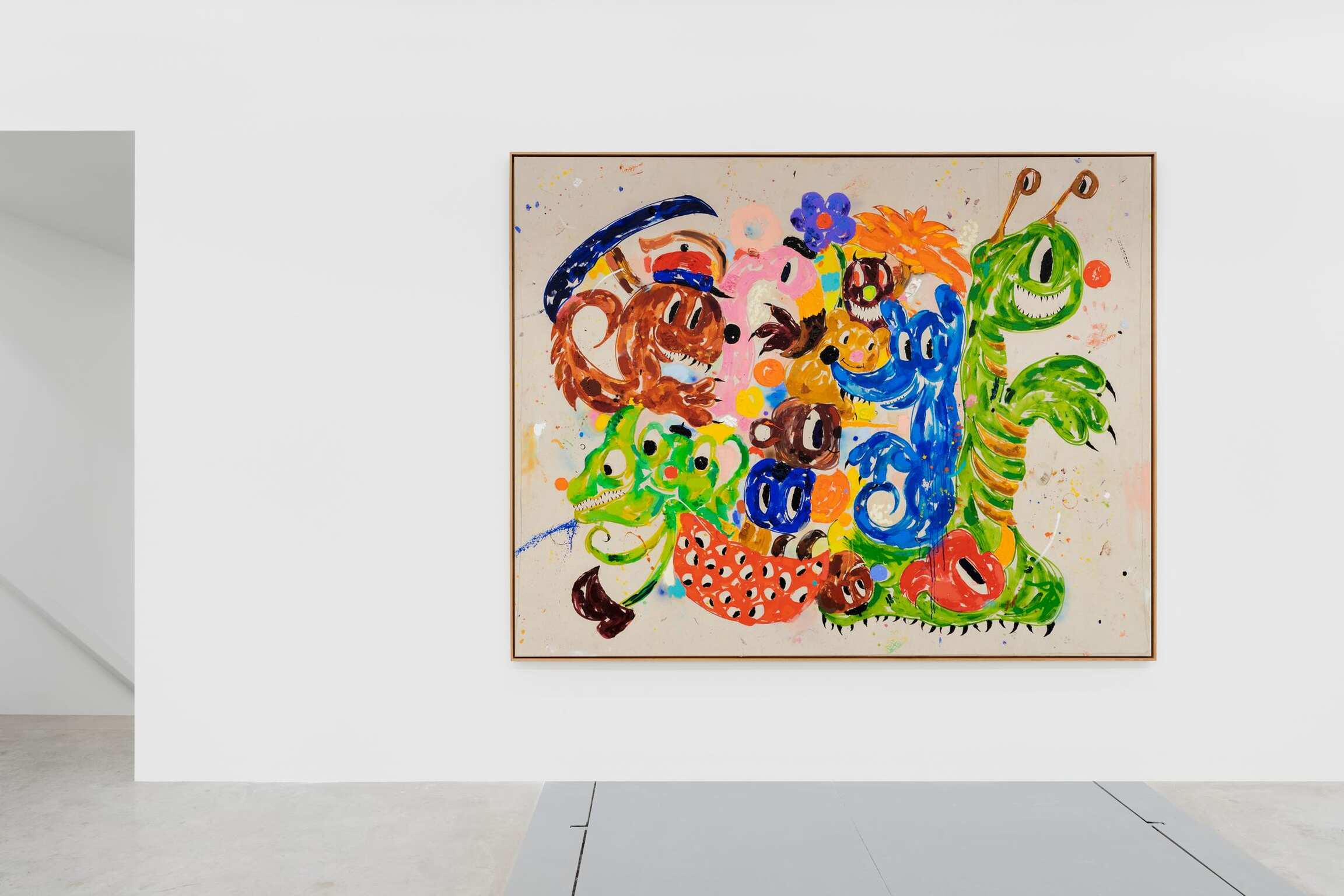 Also on view is A Csigák Istene (The God of Snails) (2021), one of several canvases that breaks the format of depicting a single creature, and instead portrays a crowd of cartoon animals who seem to move together in that spirit of carnivalesque procession. Heading up this tangled cast is the outsize snail of the title. Bozó has given him a bulbous red nose, sharp talons and that distinguishing grin as he carries on his back—instead of a shell—an array of wildlife that are almost, but not quite, recognizable. Along with others, a two-headed mouse and a flamingo with worried expression reside alongside a blue, foxlike creature and a many-eyed beast of indeterminate nature—a teeming, fantastical jungle that fills the canvas as much as it does the viewer’s imagination.