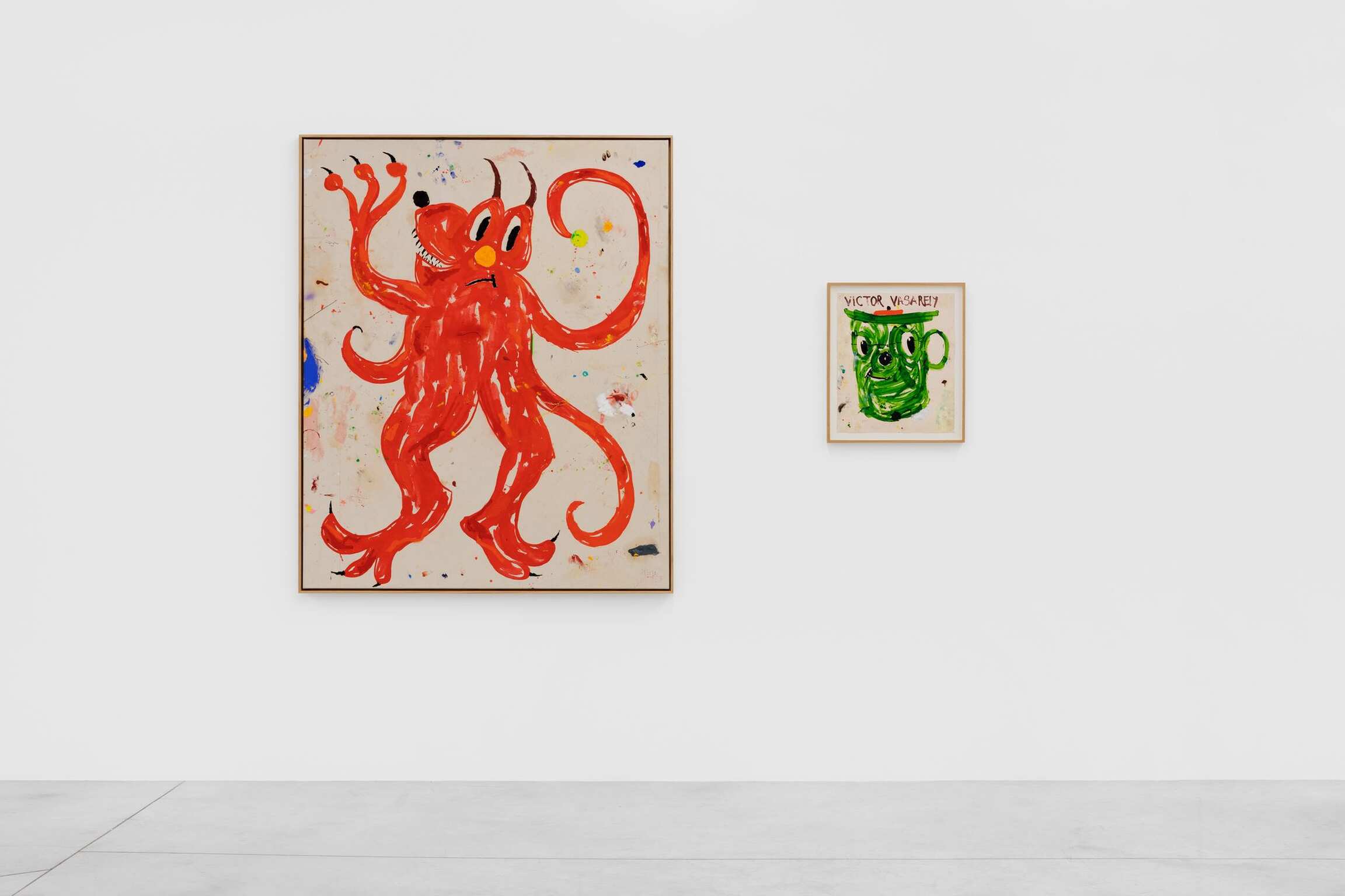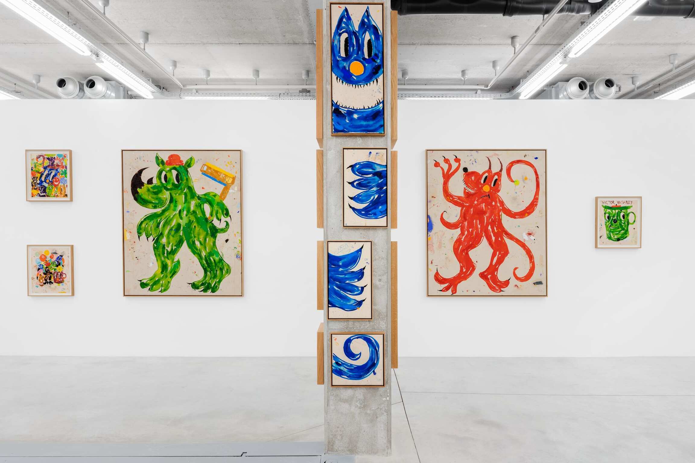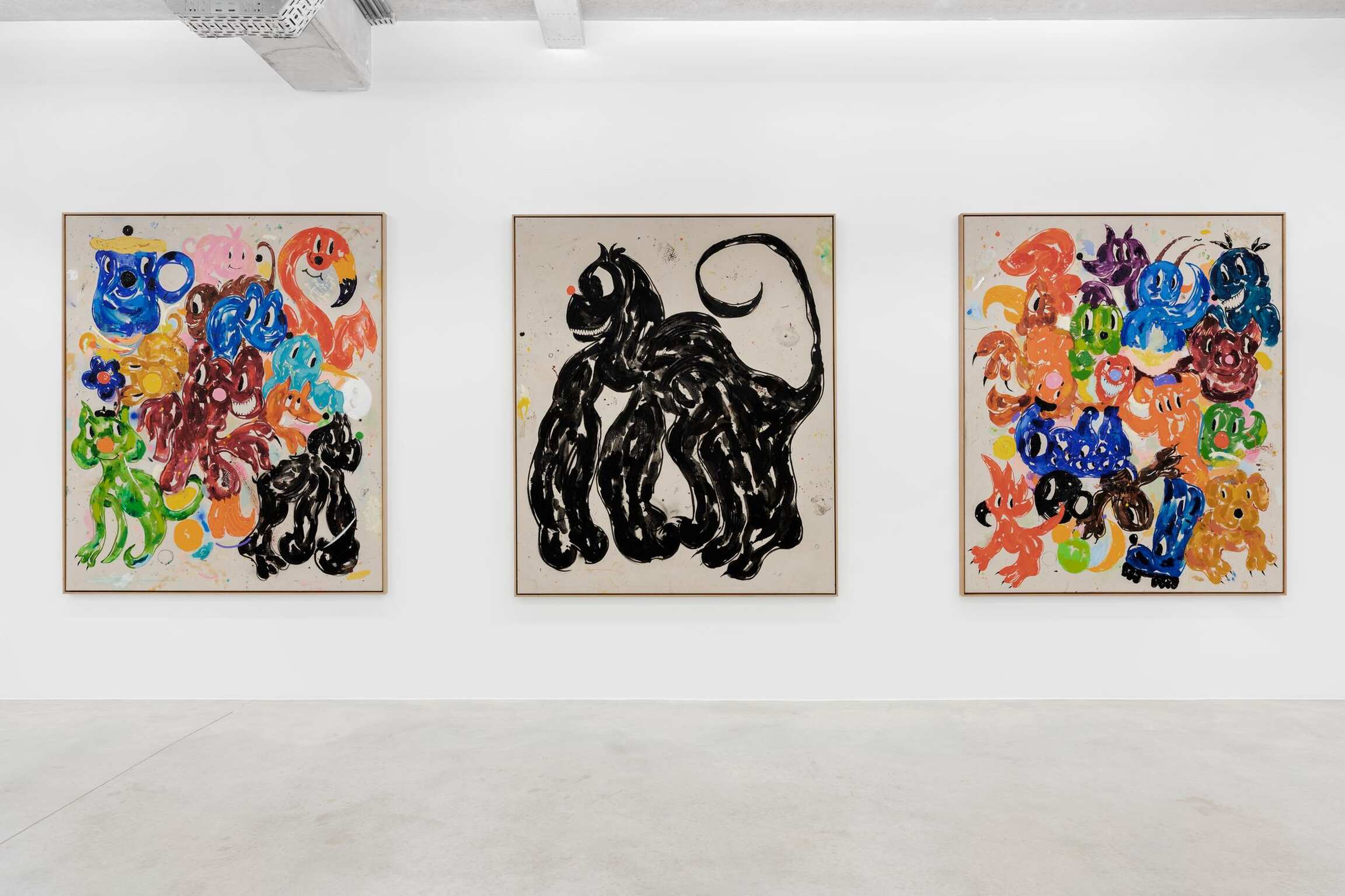 Also on view is A Csigák Istene (The God of Snails) (2021), one of several canvases that breaks the format of depicting a single creature, and instead portrays a crowd of cartoon animals who seem to move together in that spirit of carnivalesque procession. Heading up this tangled cast is the outsize snail of the title. Bozó has given him a bulbous red nose, sharp talons and that distinguishing grin as he carries on his back—instead of a shell—an array of wildlife that are almost, but not quite, recognizable. Along with others, a two-headed mouse and a flamingo with worried expression reside alongside a blue, foxlike creature and a many-eyed beast of indeterminate nature—a teeming, fantastical jungle that fills the canvas as much as it does the viewer’s imagination.